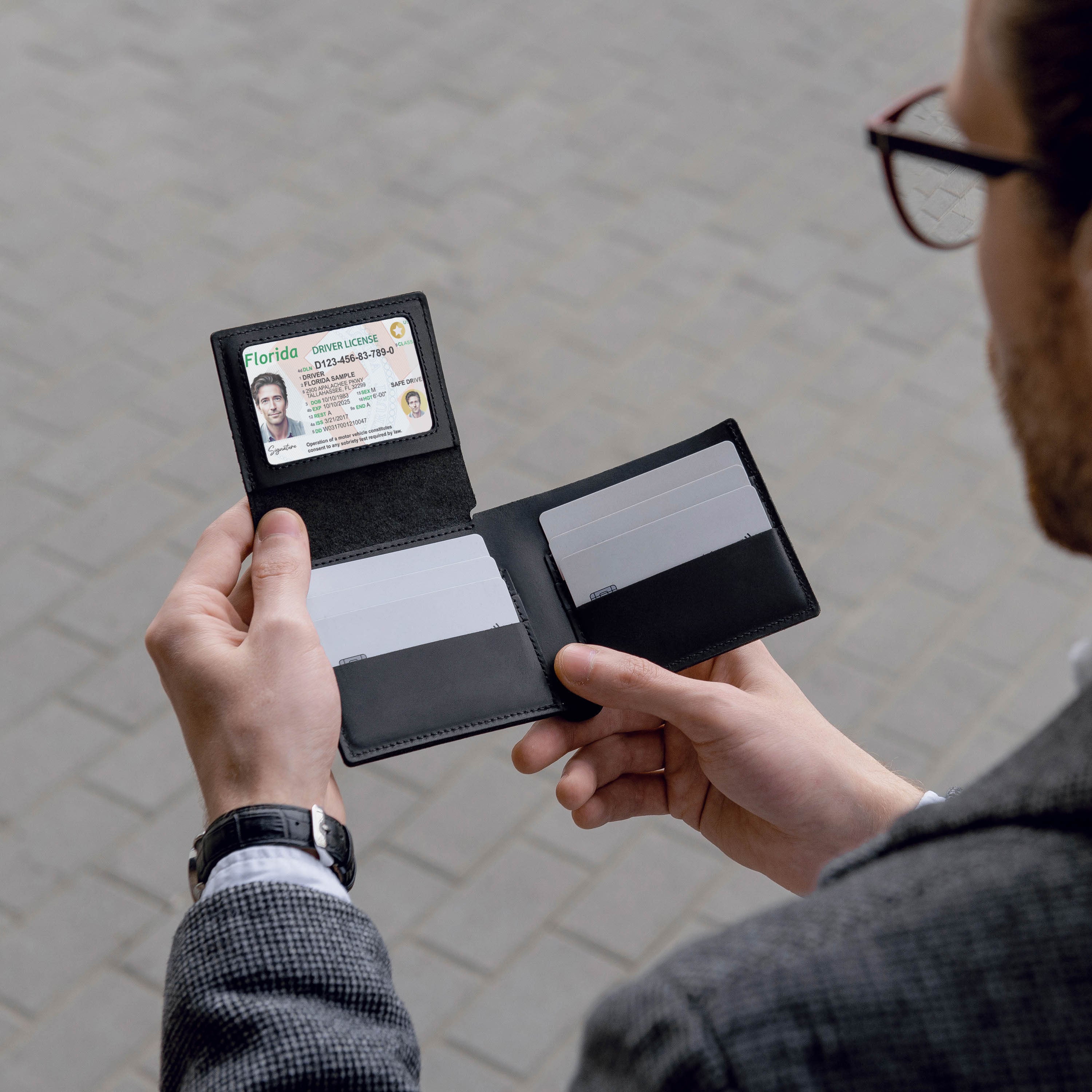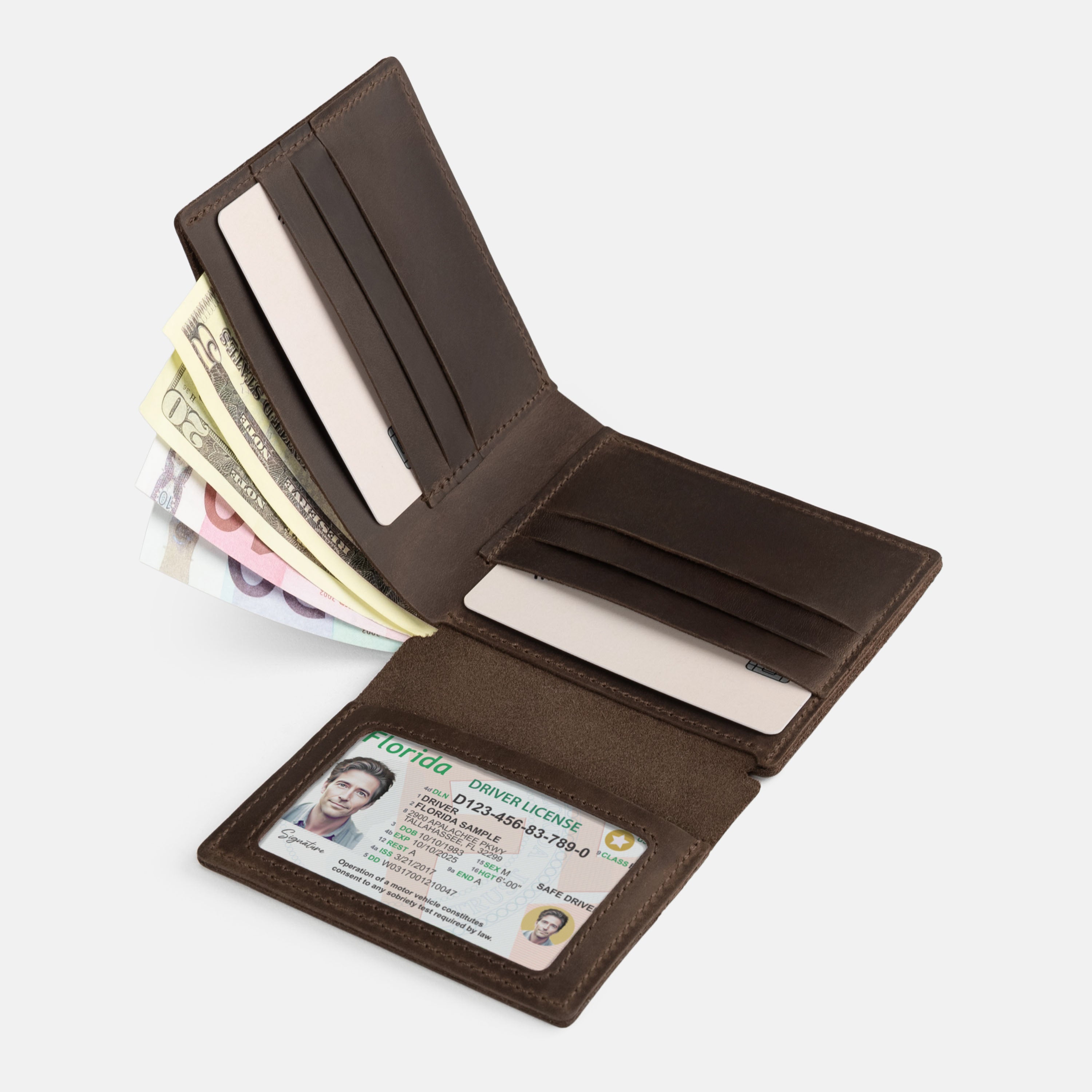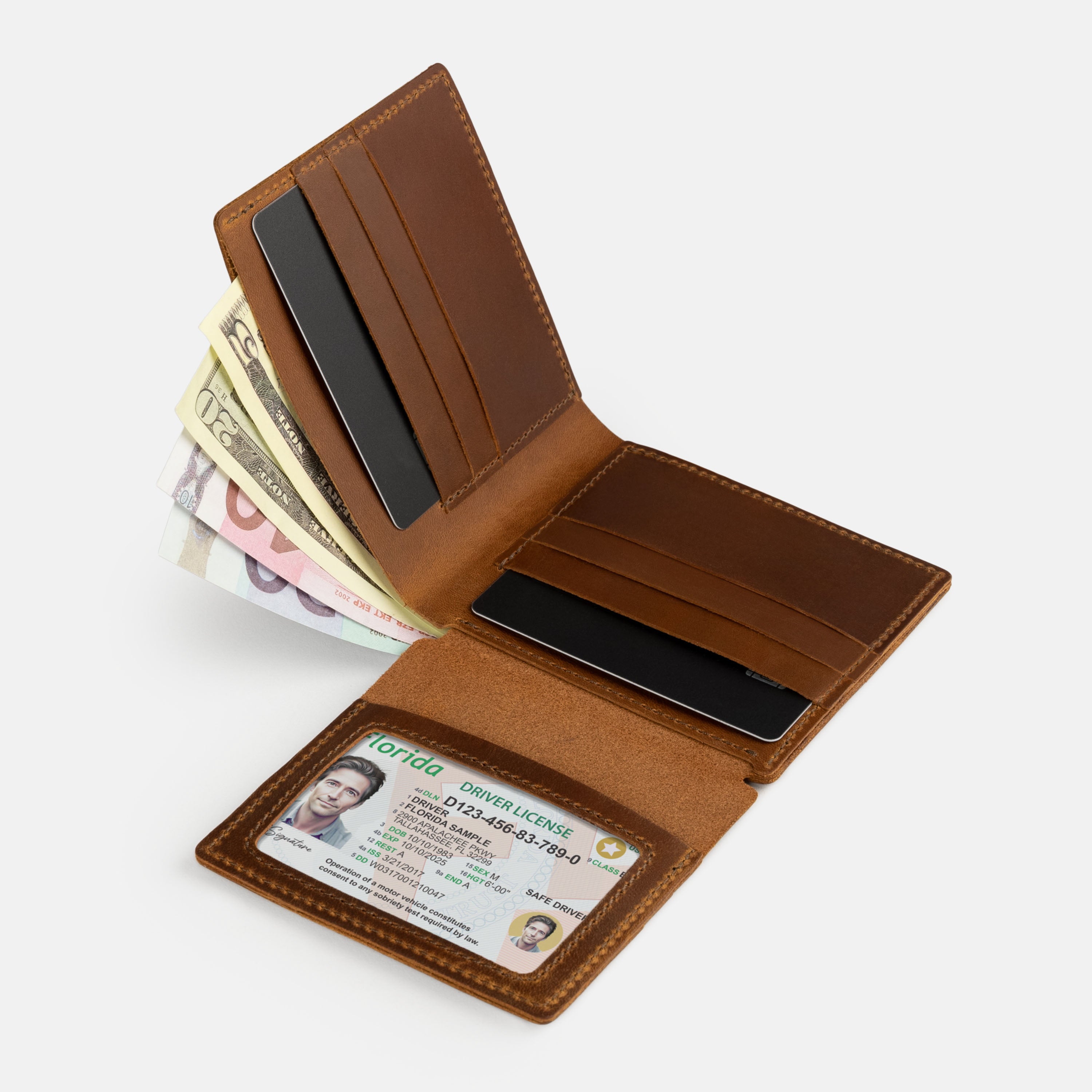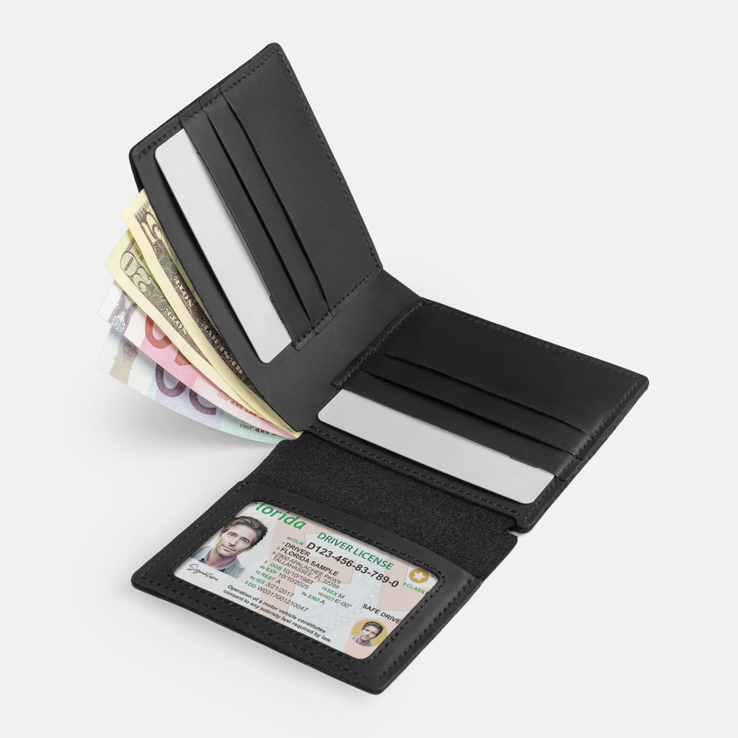 - Includes a bill compartment, nine card slots, clear ID window, and a hidden pocket