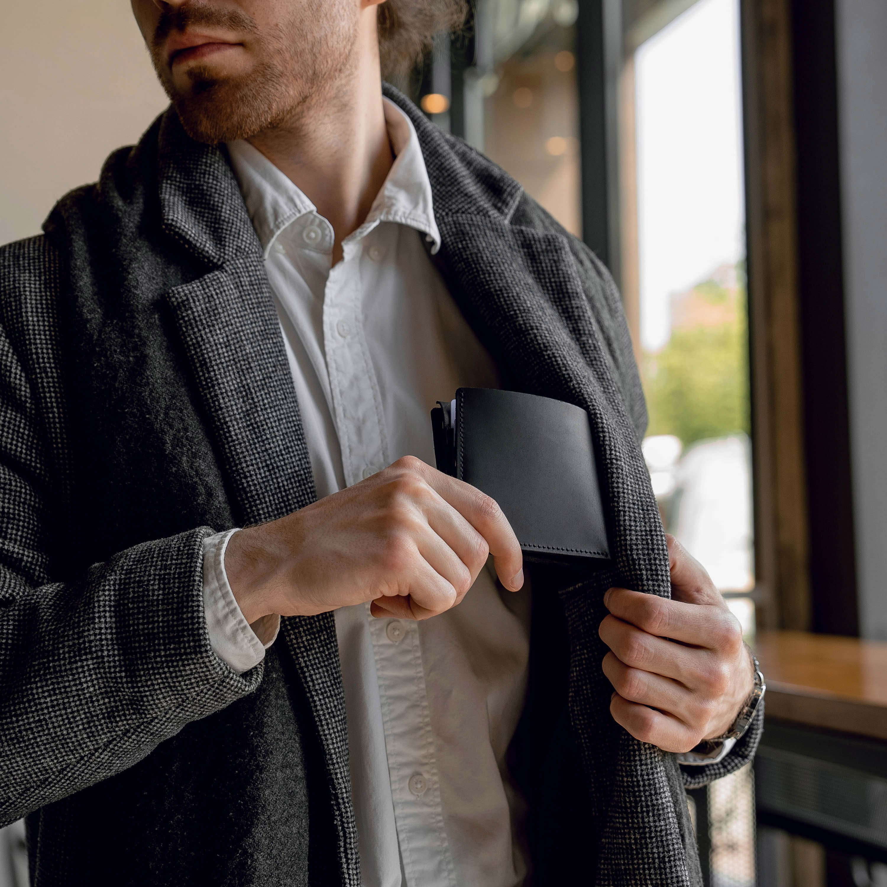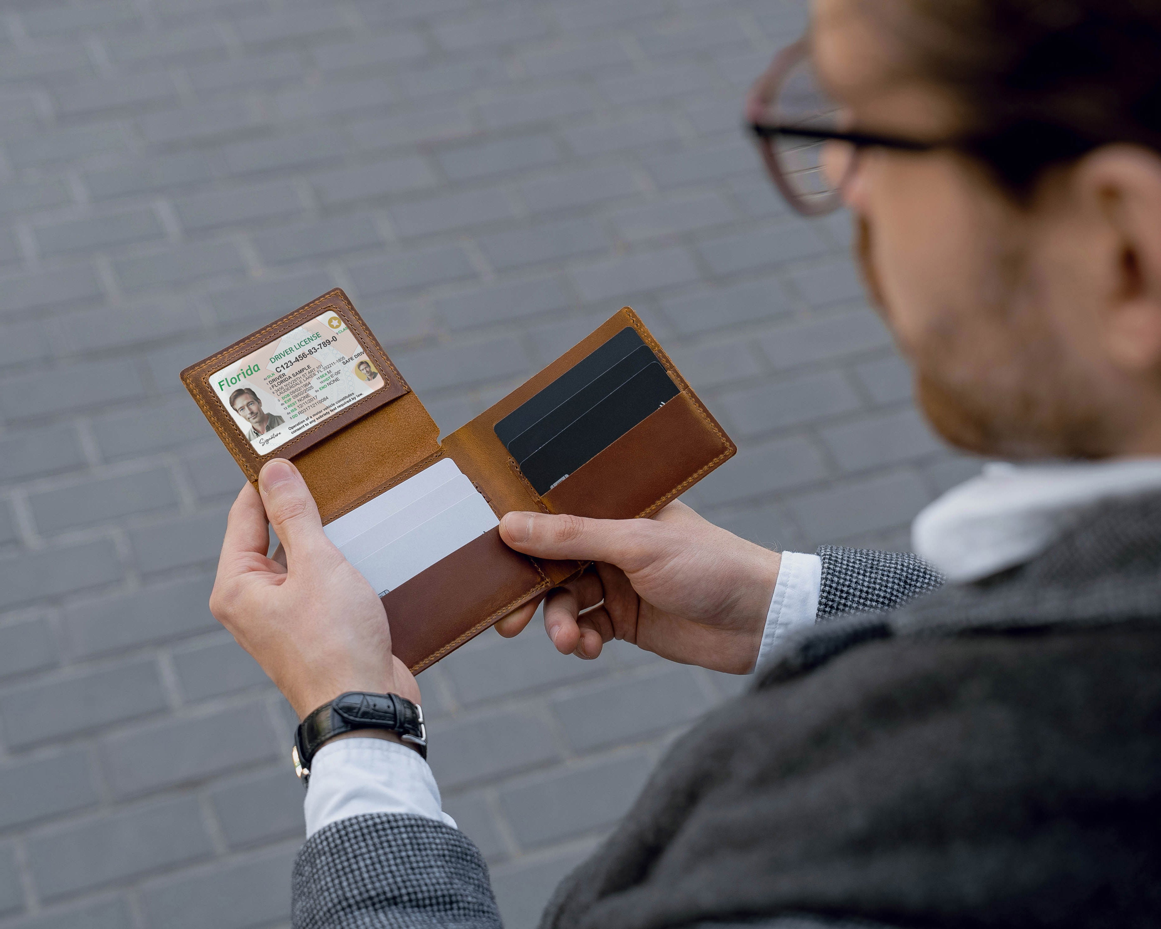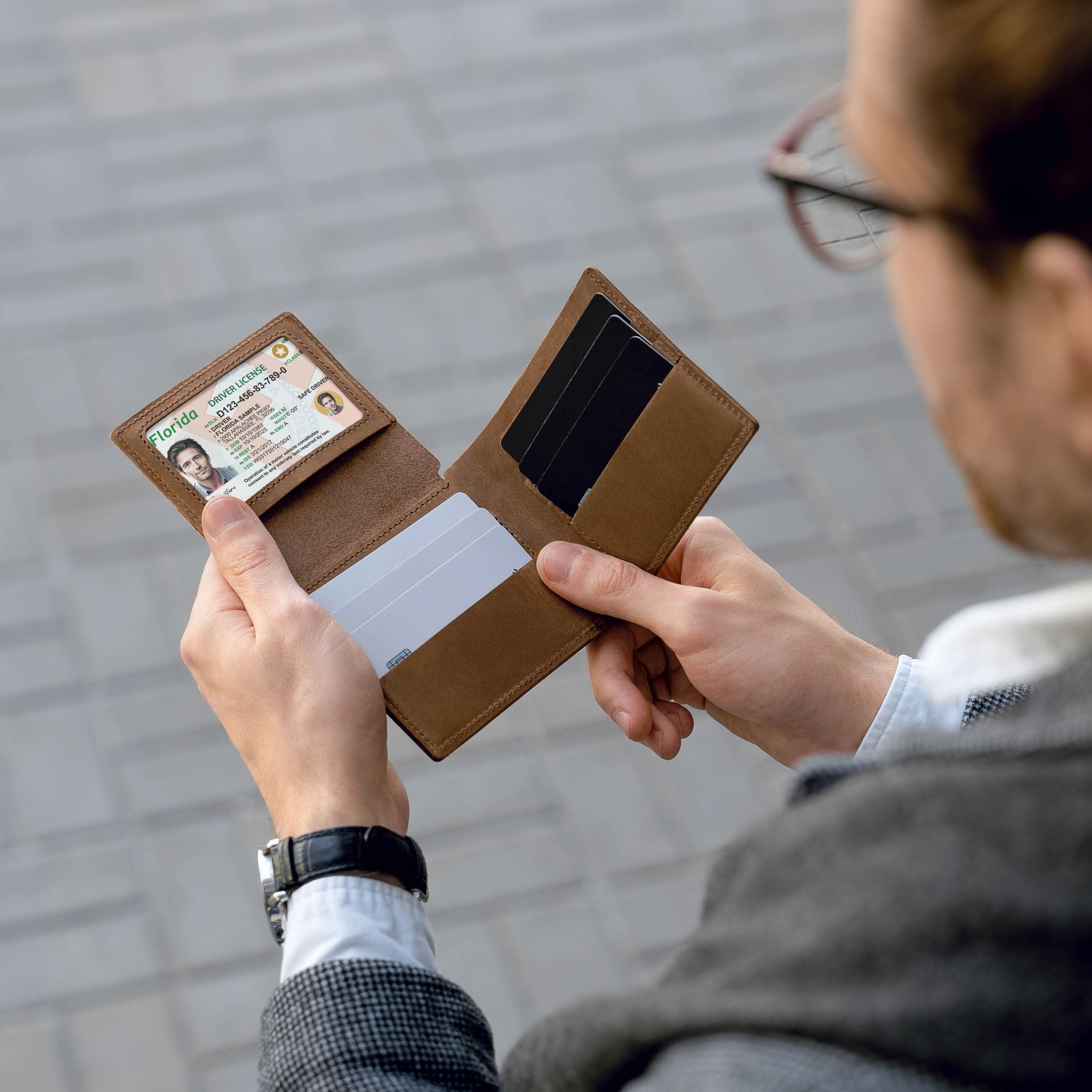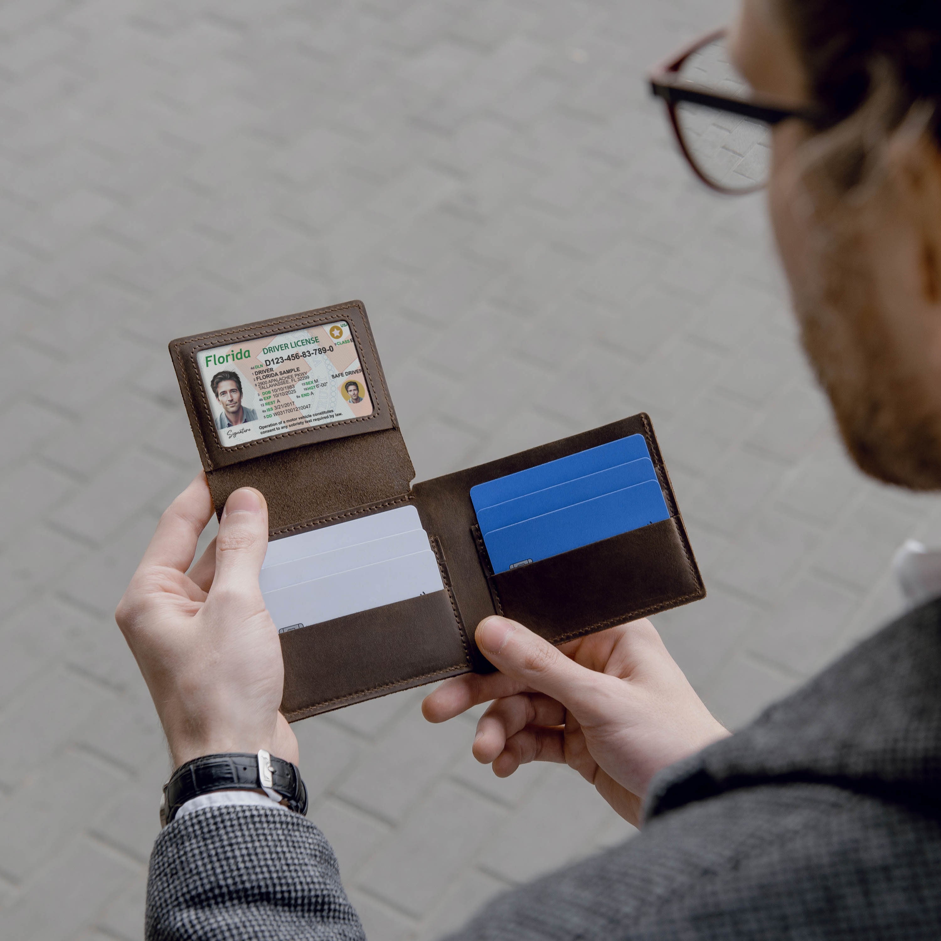 - Includes a bill compartment, nine card slots, clear ID window, and a hidden pocket