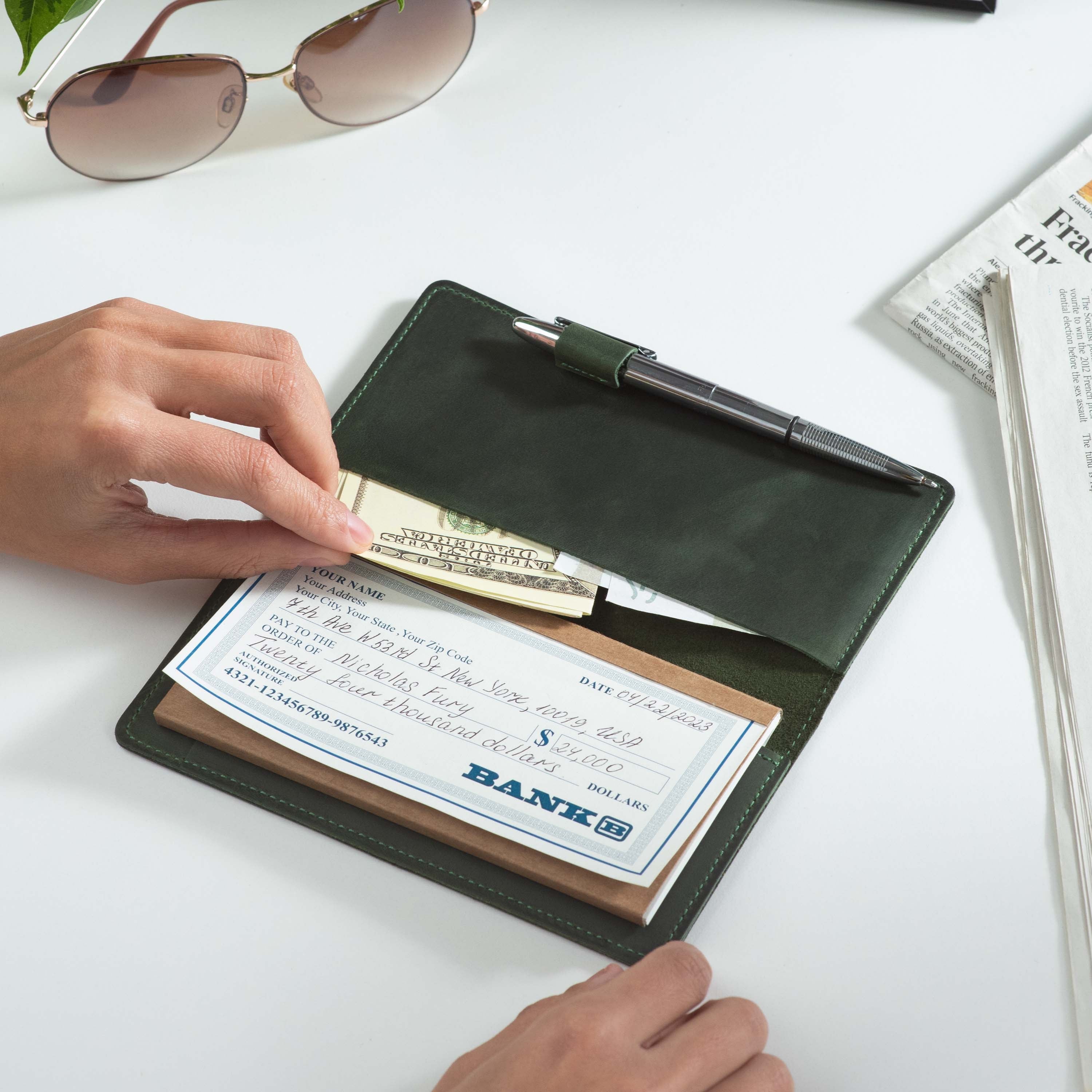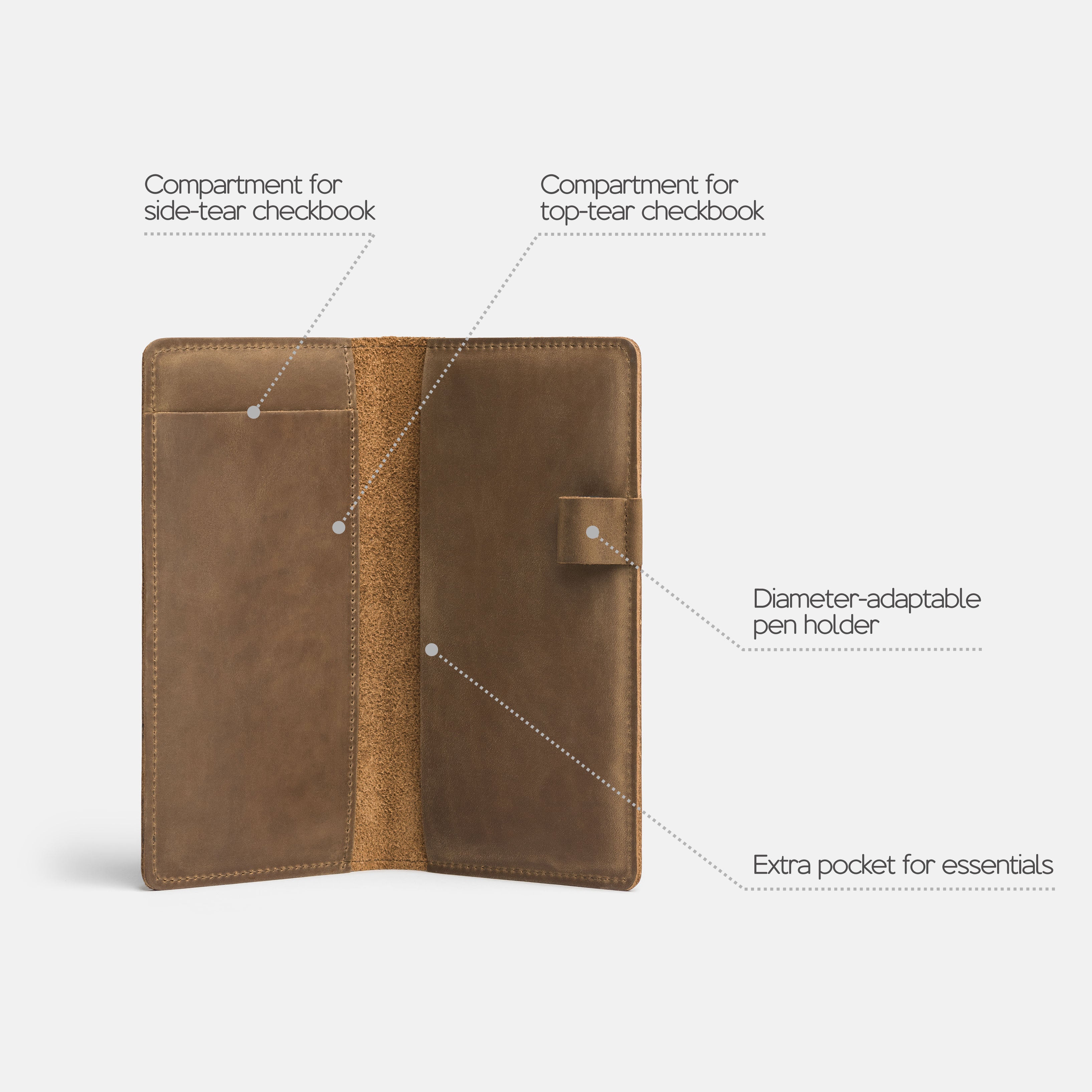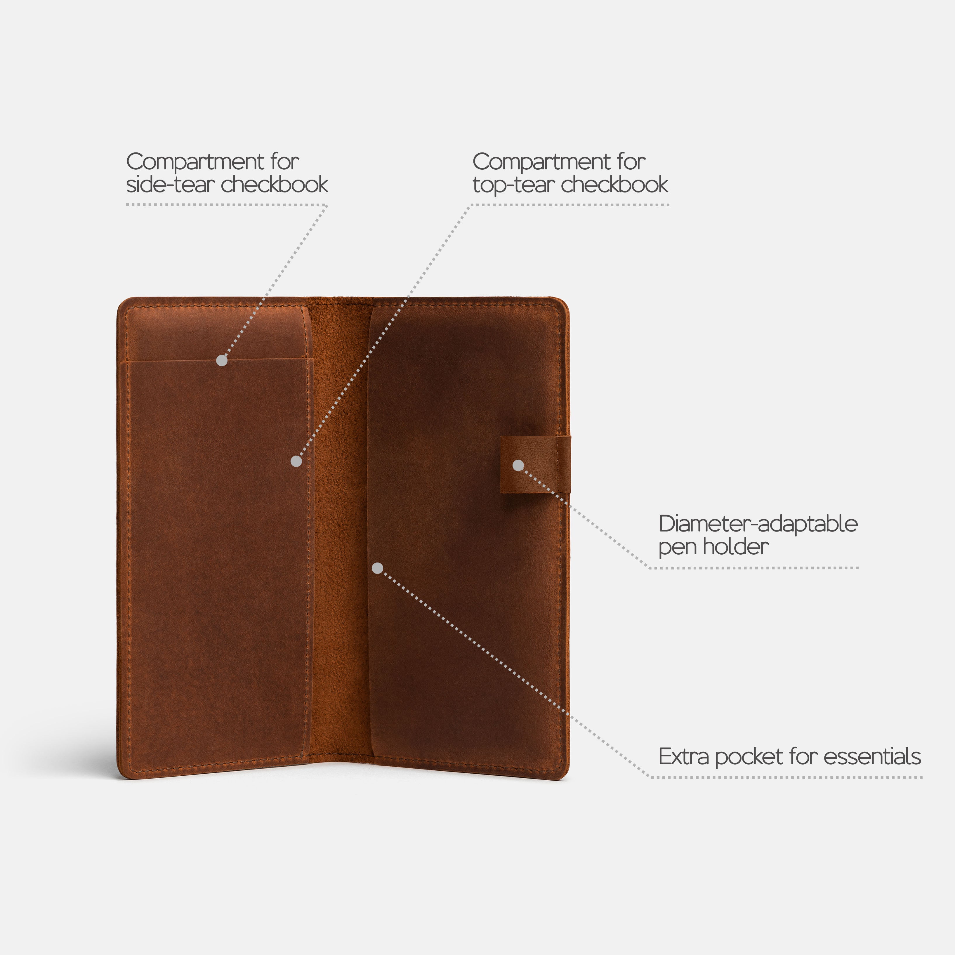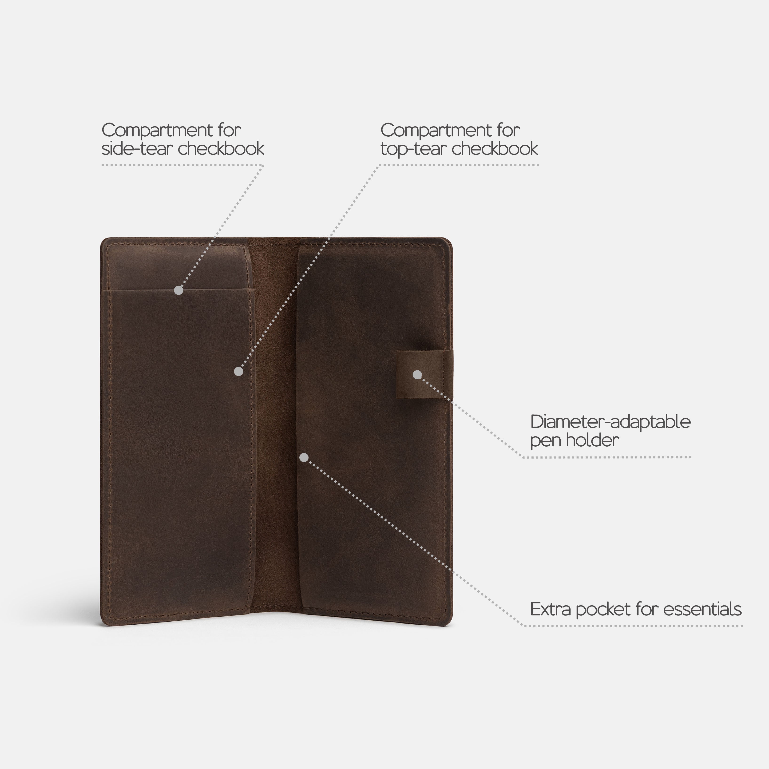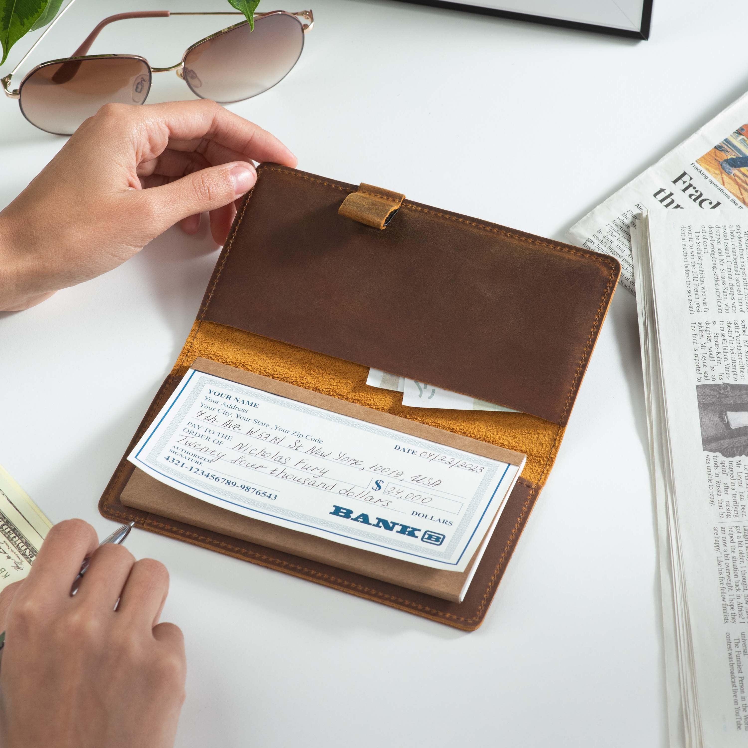 Handcrafted for both style and function, this leather checkbook cover offers a timeless way to keep your checks neatly protected. Designed to accommodate both side- and top-tear checks, it features an expandable pen holder for added convenience. Slim, durable, and customizable, it's a practical companion that easily fits into your daily routine or makes a thoughtful gift.