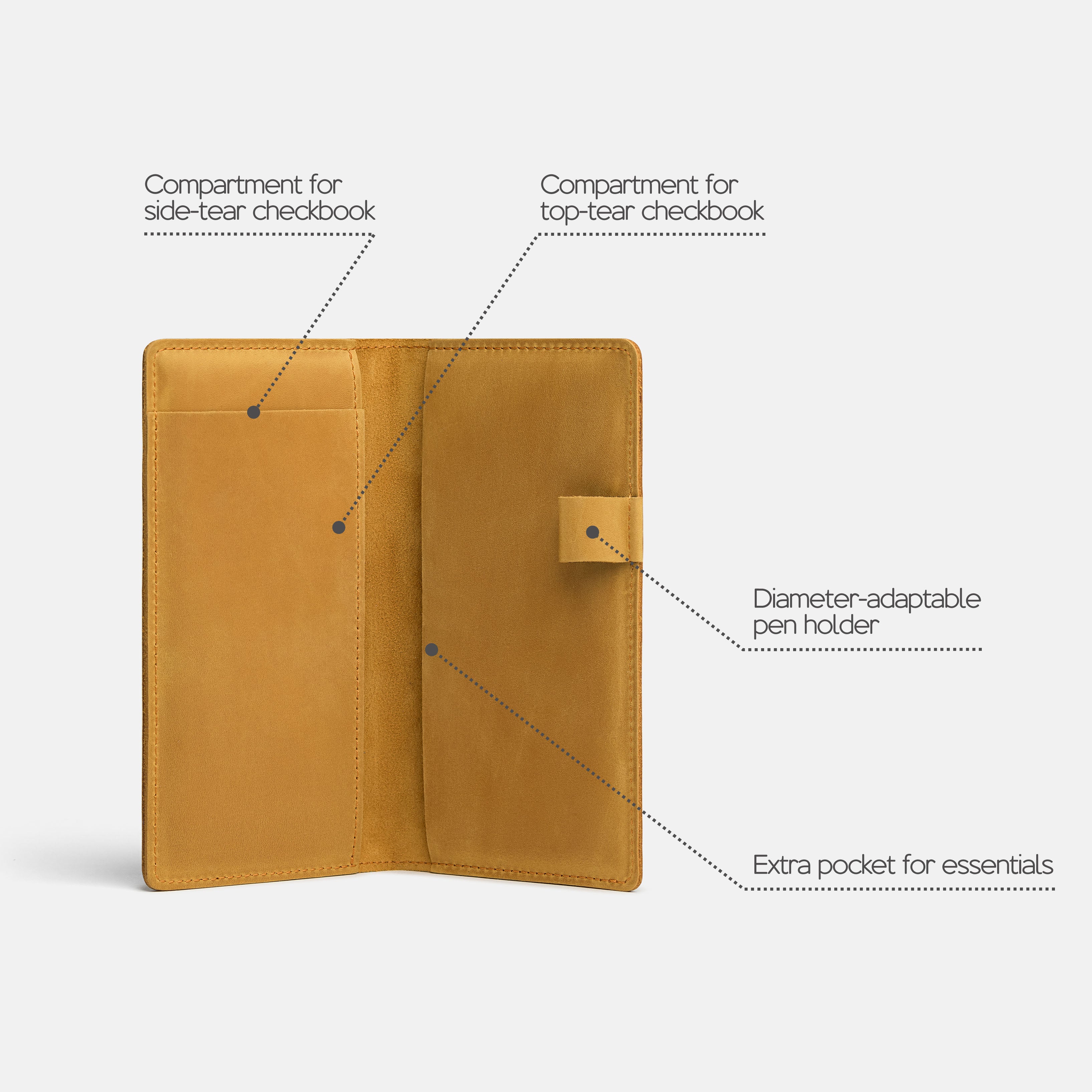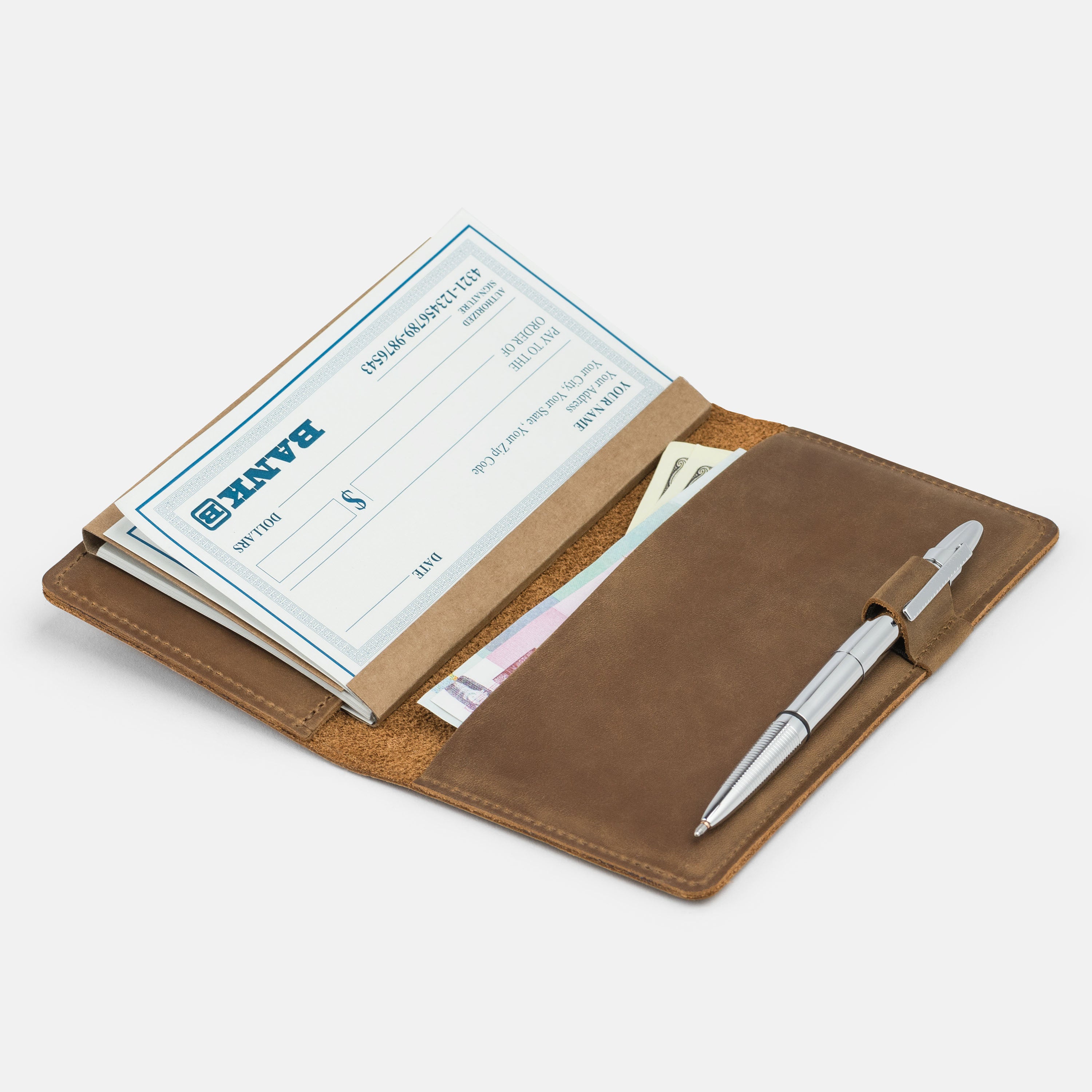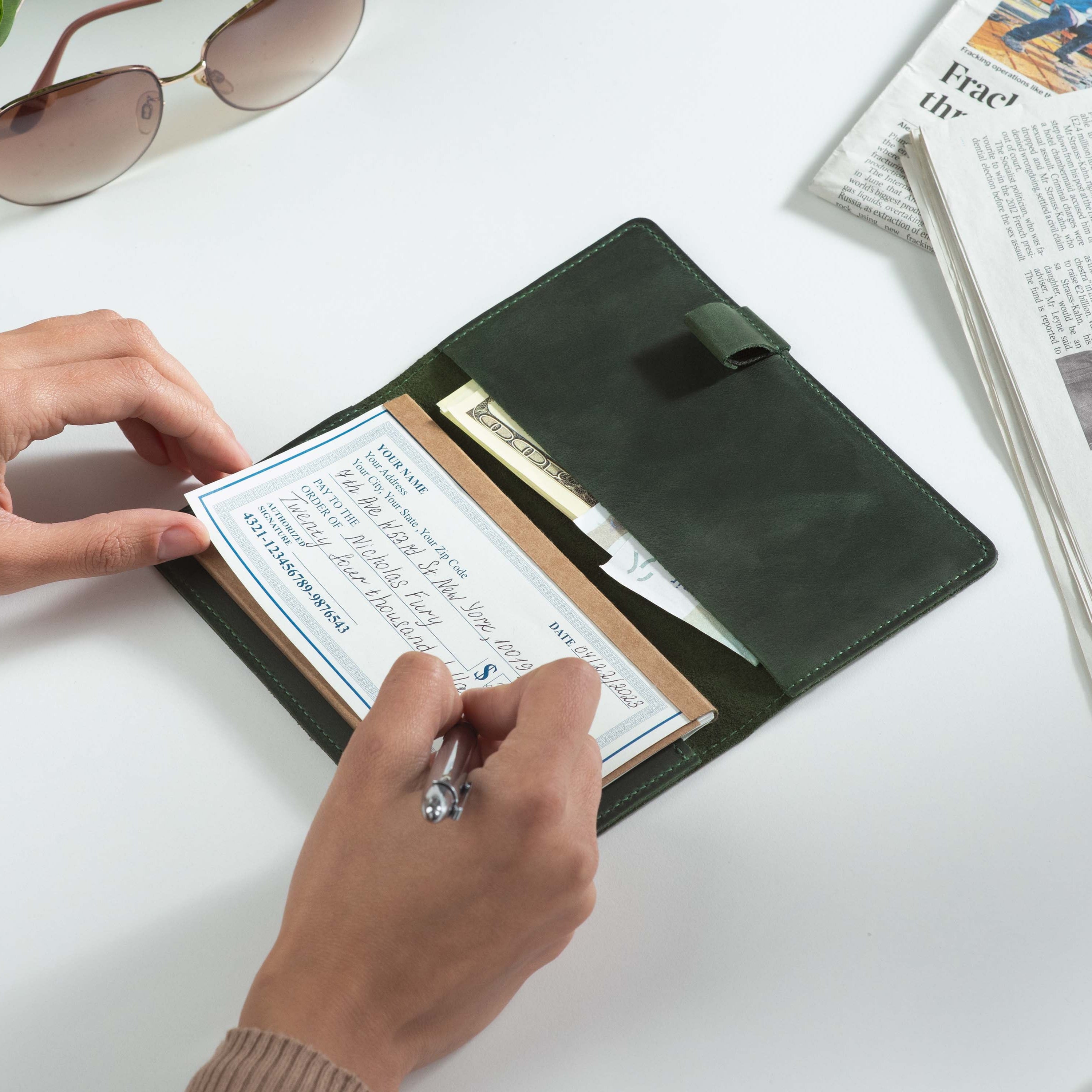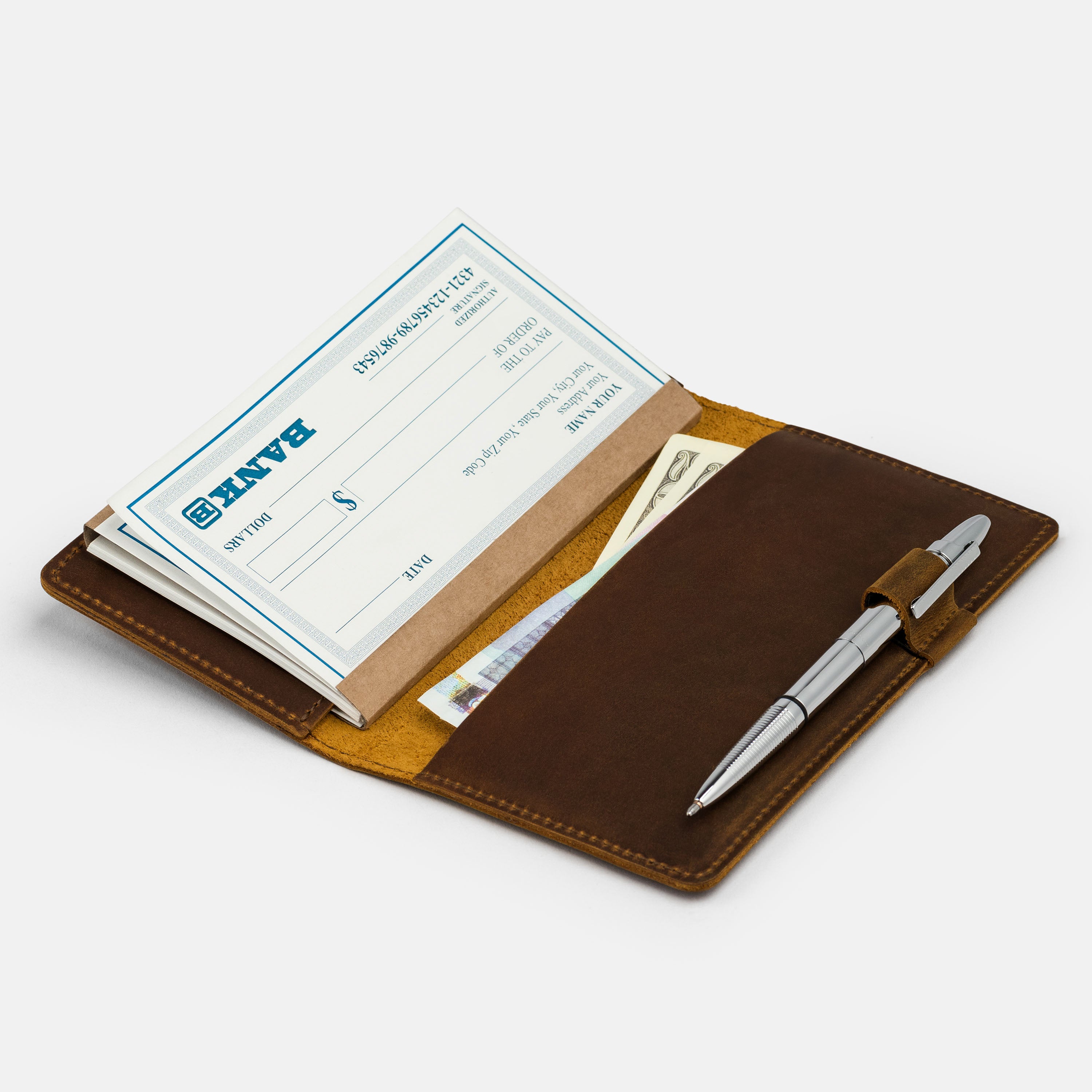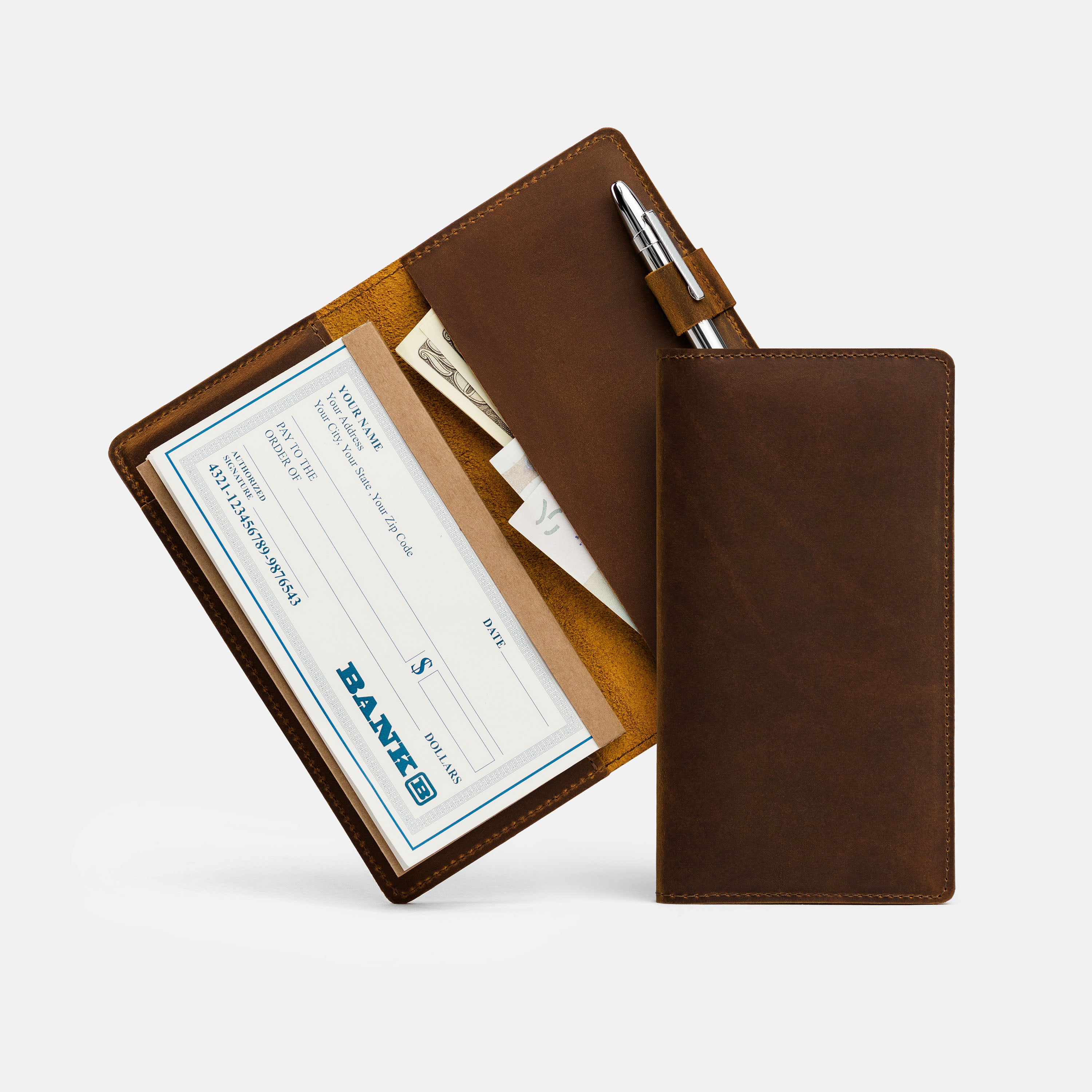 Handcrafted for both style and function, this leather checkbook cover offers a timeless way to keep your checks neatly protected. Designed to accommodate both side- and top-tear checks, it features an expandable pen holder for added convenience. Slim, durable, and customizable, it's a practical companion that easily fits into your daily routine or makes a thoughtful gift.