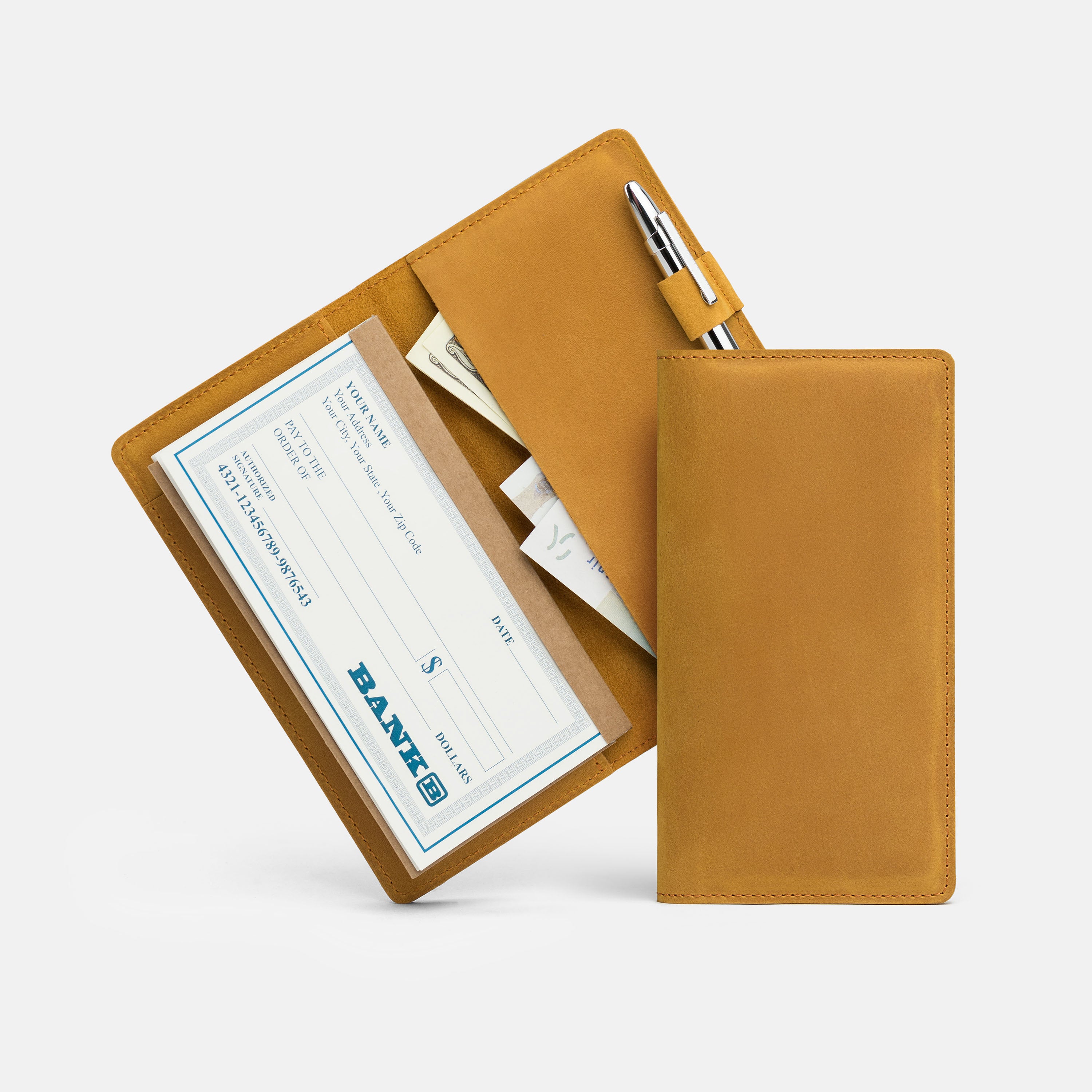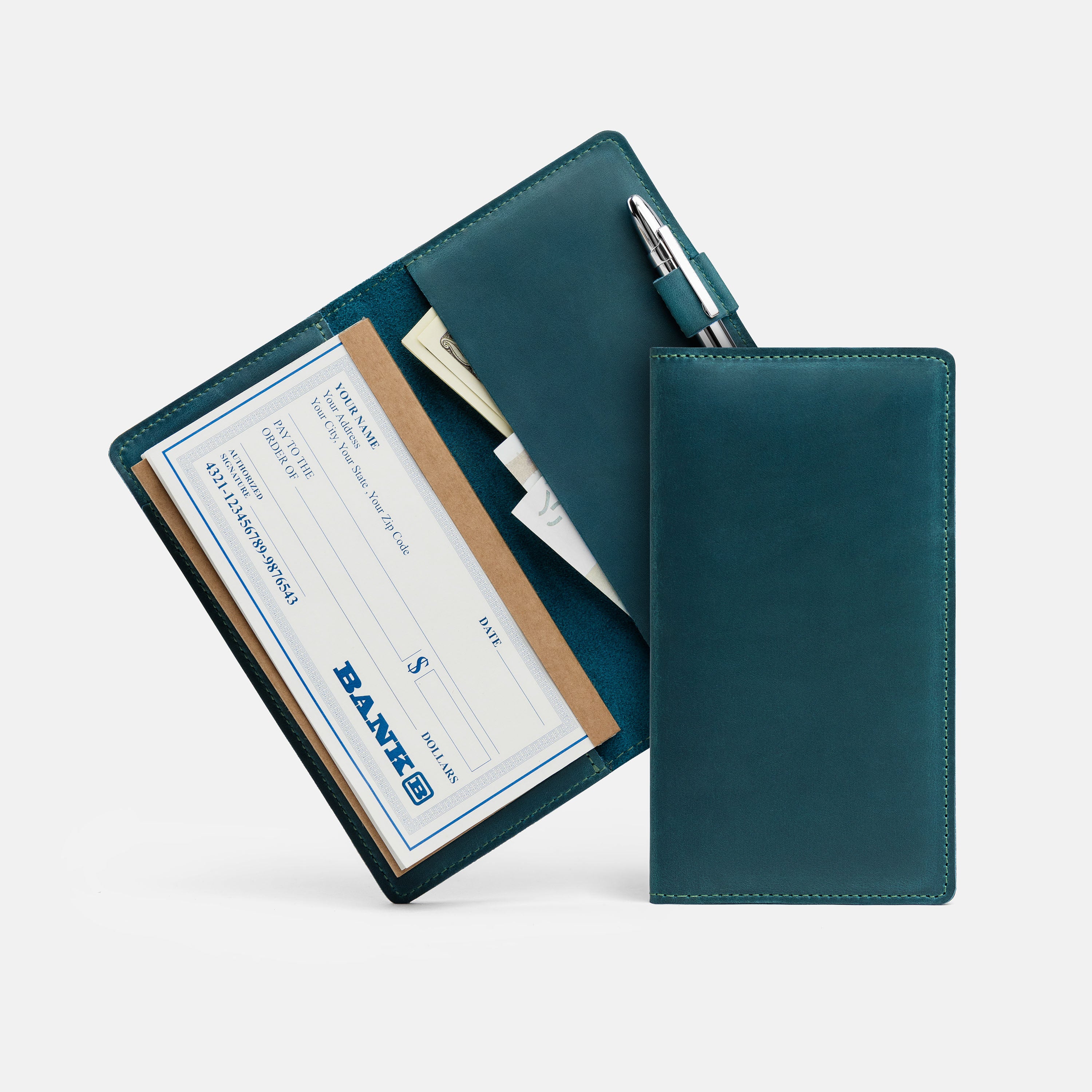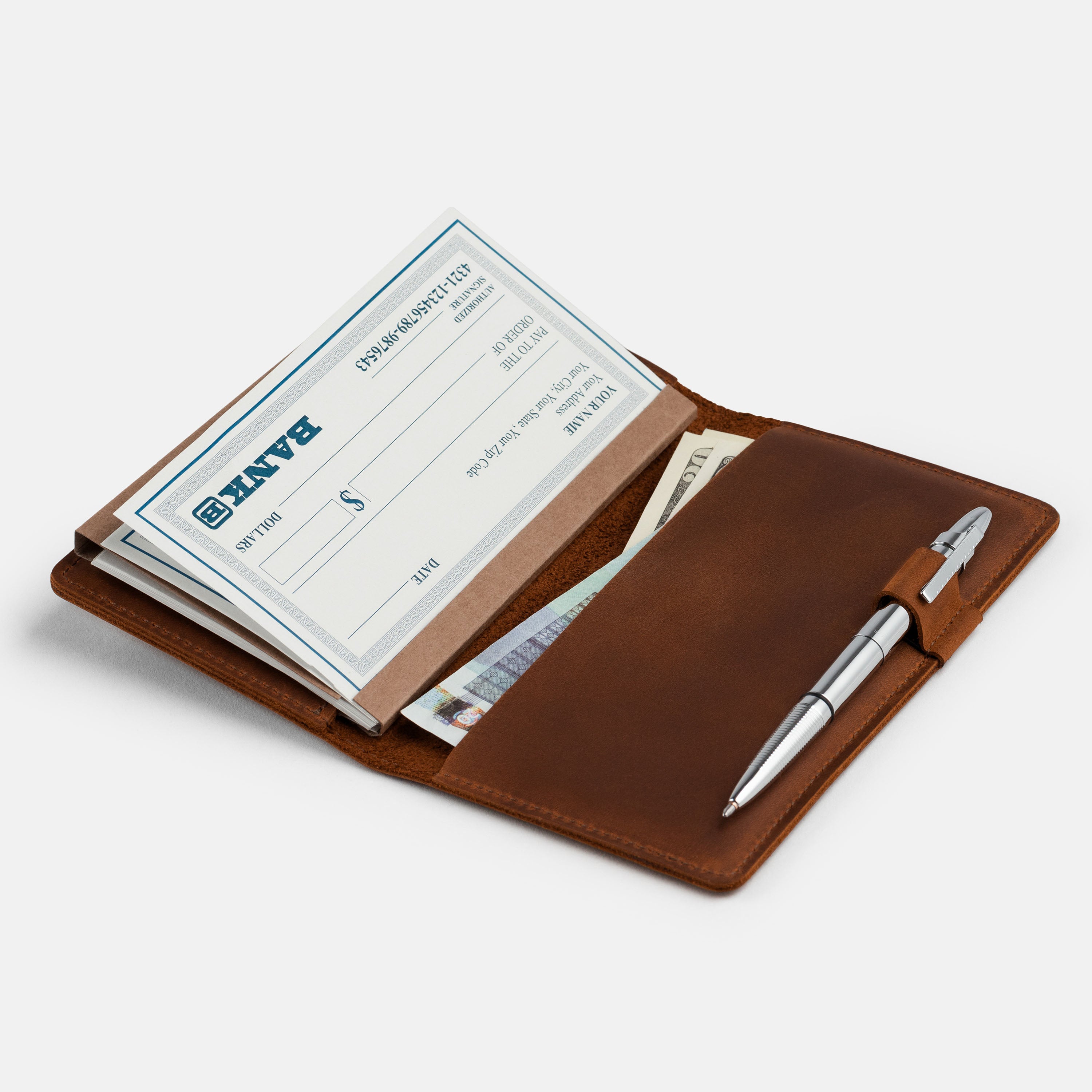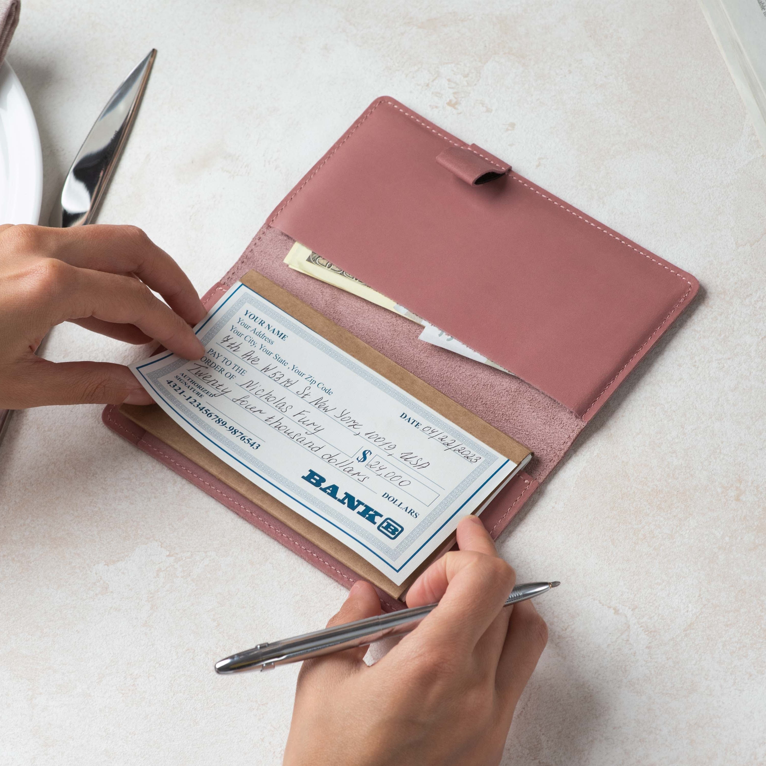 Handcrafted for both style and function, this leather checkbook cover offers a timeless way to keep your checks neatly protected. Designed to accommodate both side- and top-tear checks, it features an expandable pen holder for added convenience. Slim, durable, and customizable, it's a practical companion that easily fits into your daily routine or makes a thoughtful gift.