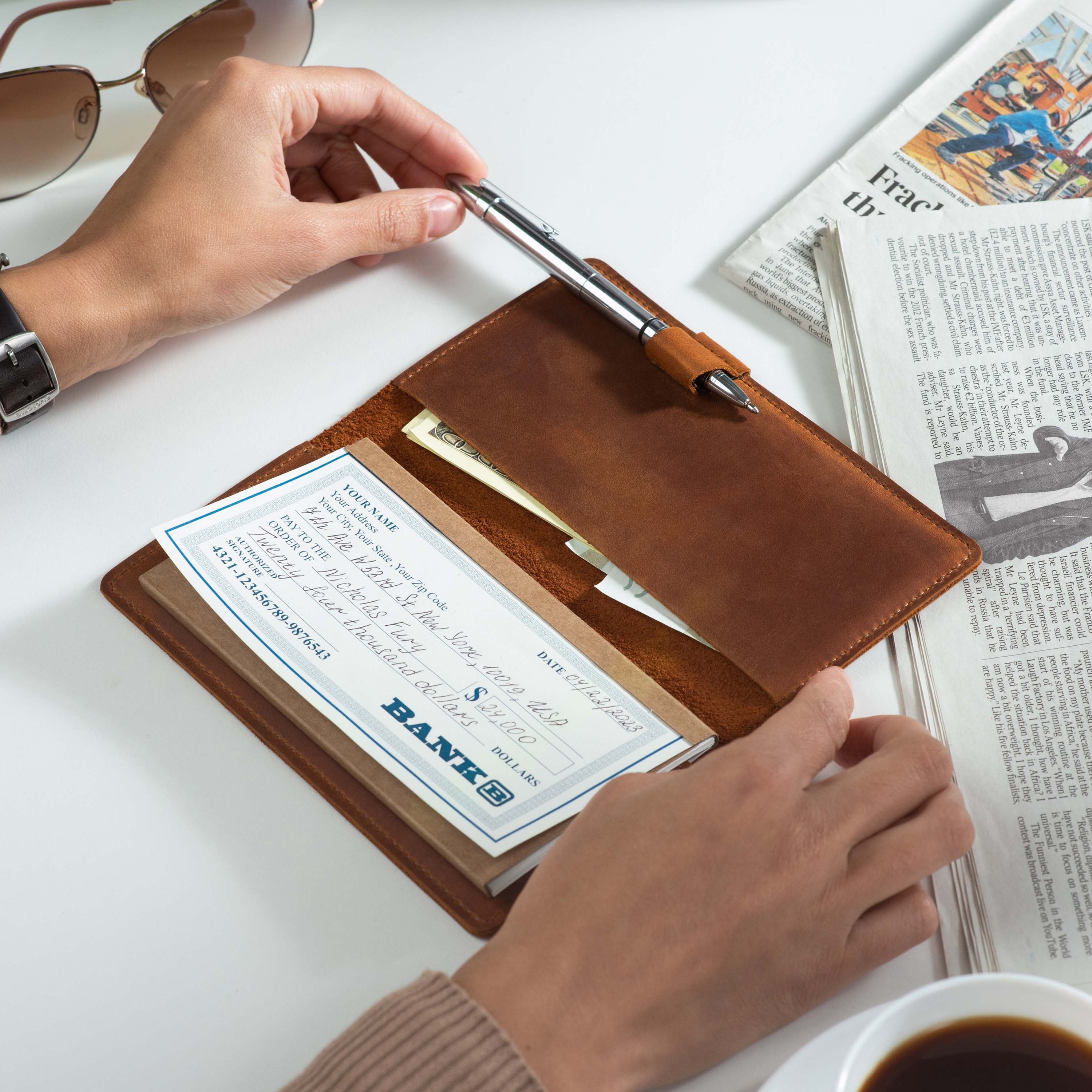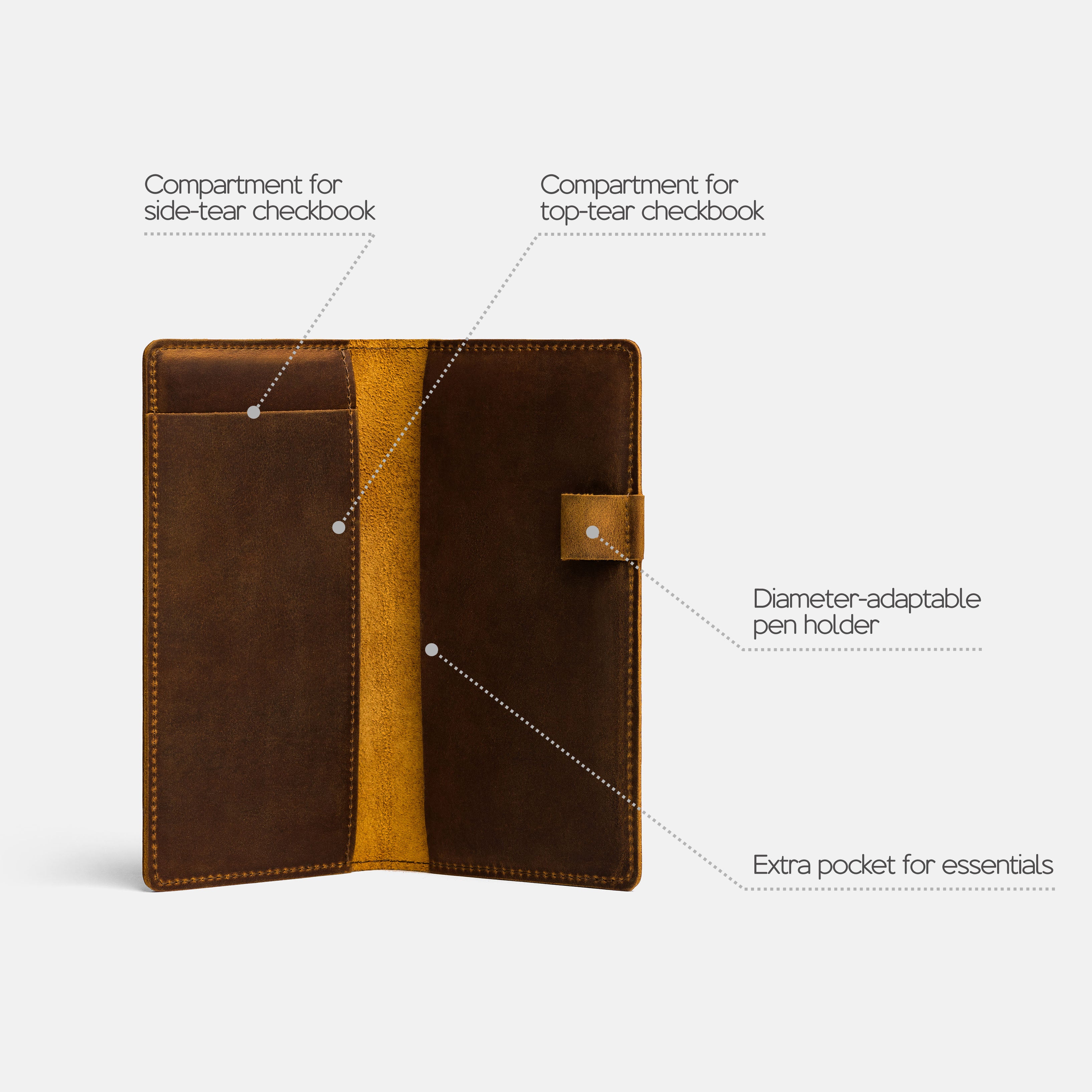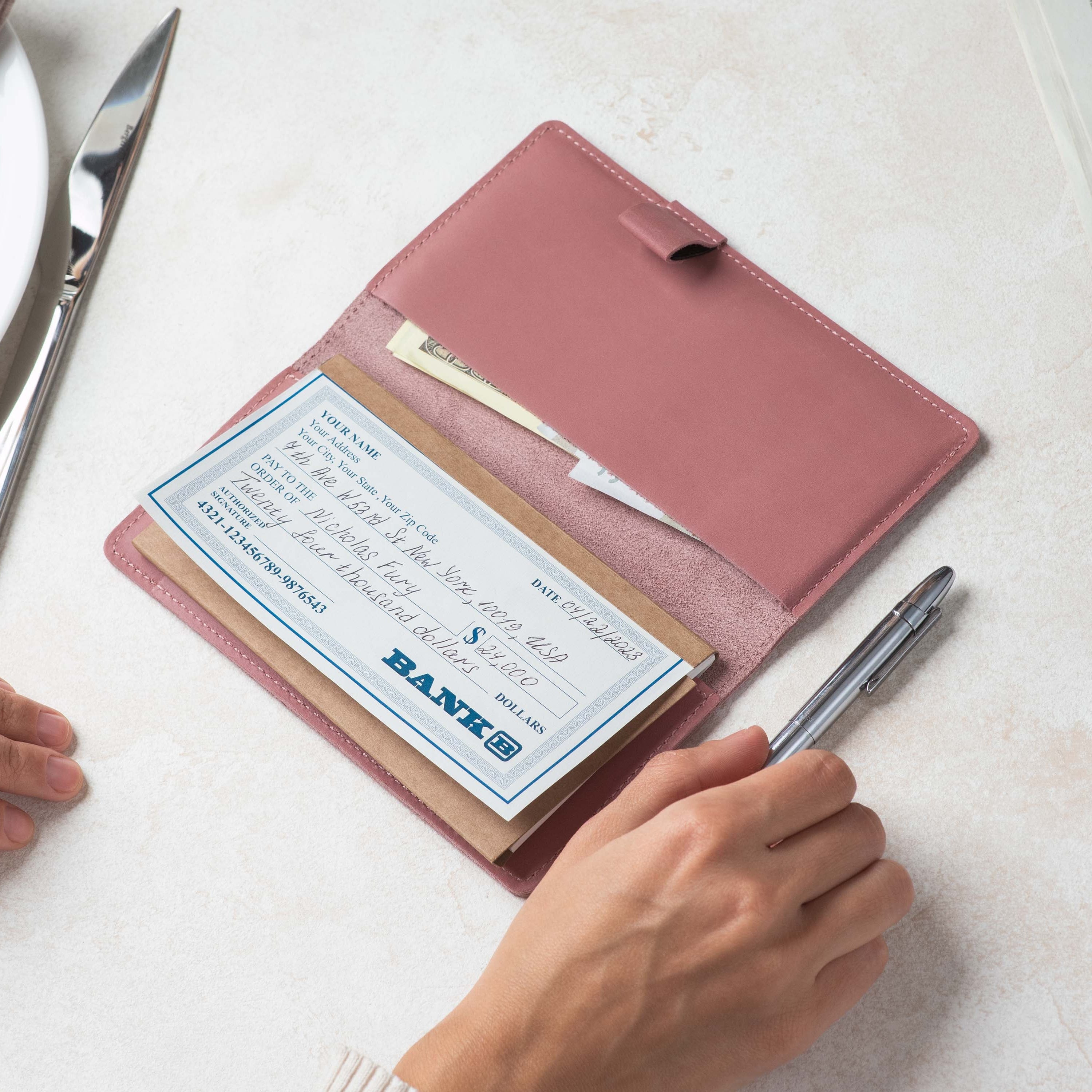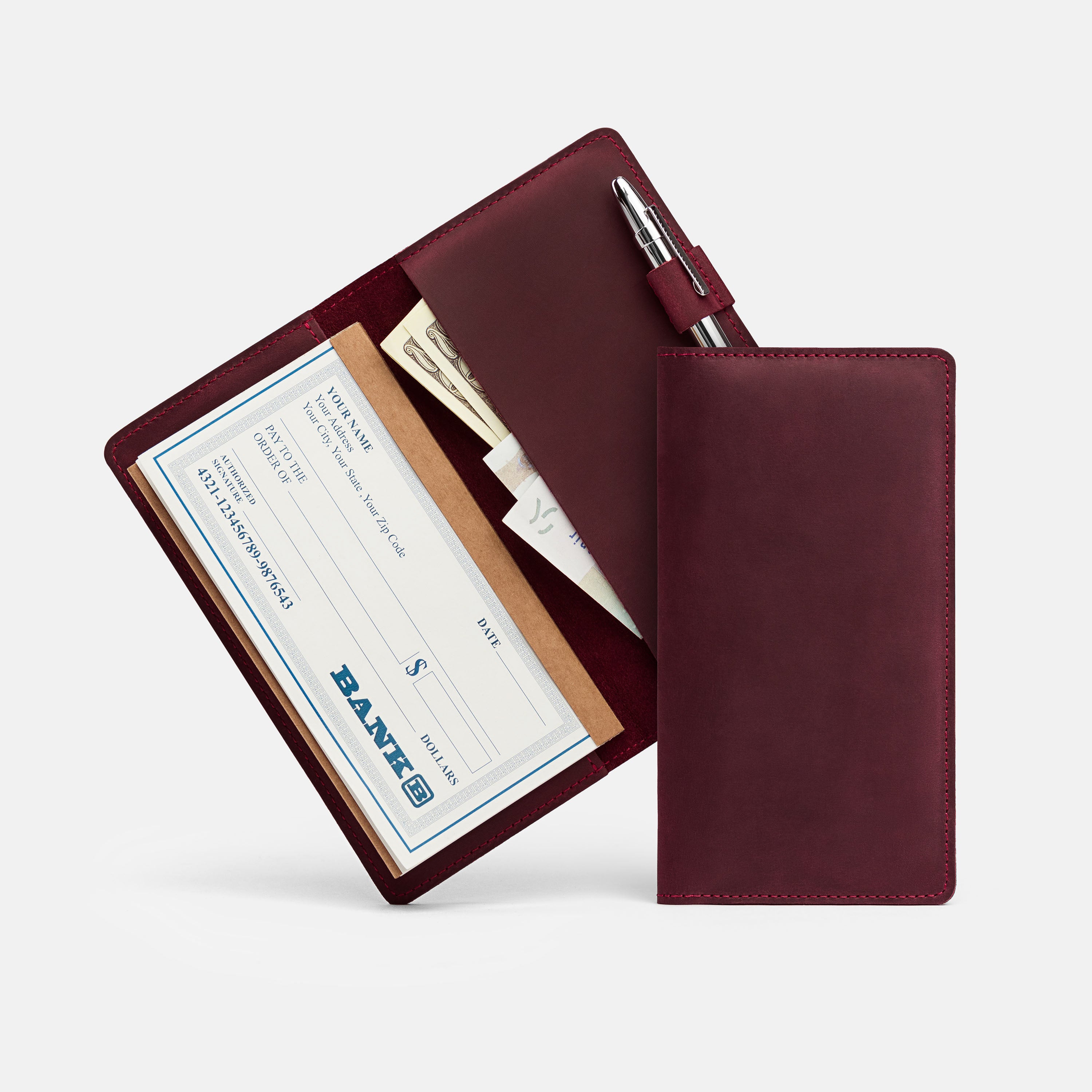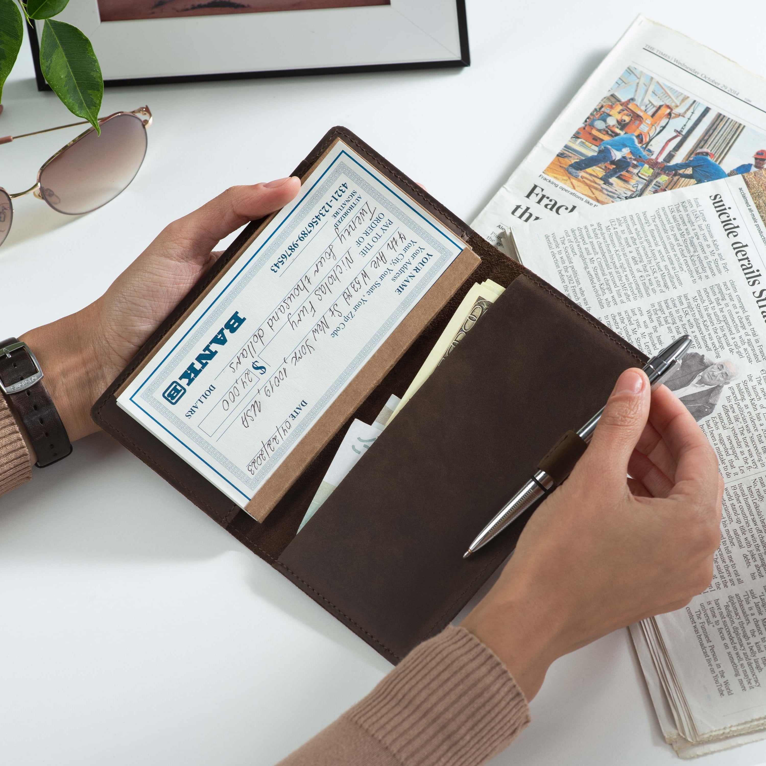 Handcrafted for both style and function, this leather checkbook cover offers a timeless way to keep your checks neatly protected. Designed to accommodate both side- and top-tear checks, it features an expandable pen holder for added convenience. Slim, durable, and customizable, it's a practical companion that easily fits into your daily routine or makes a thoughtful gift.
