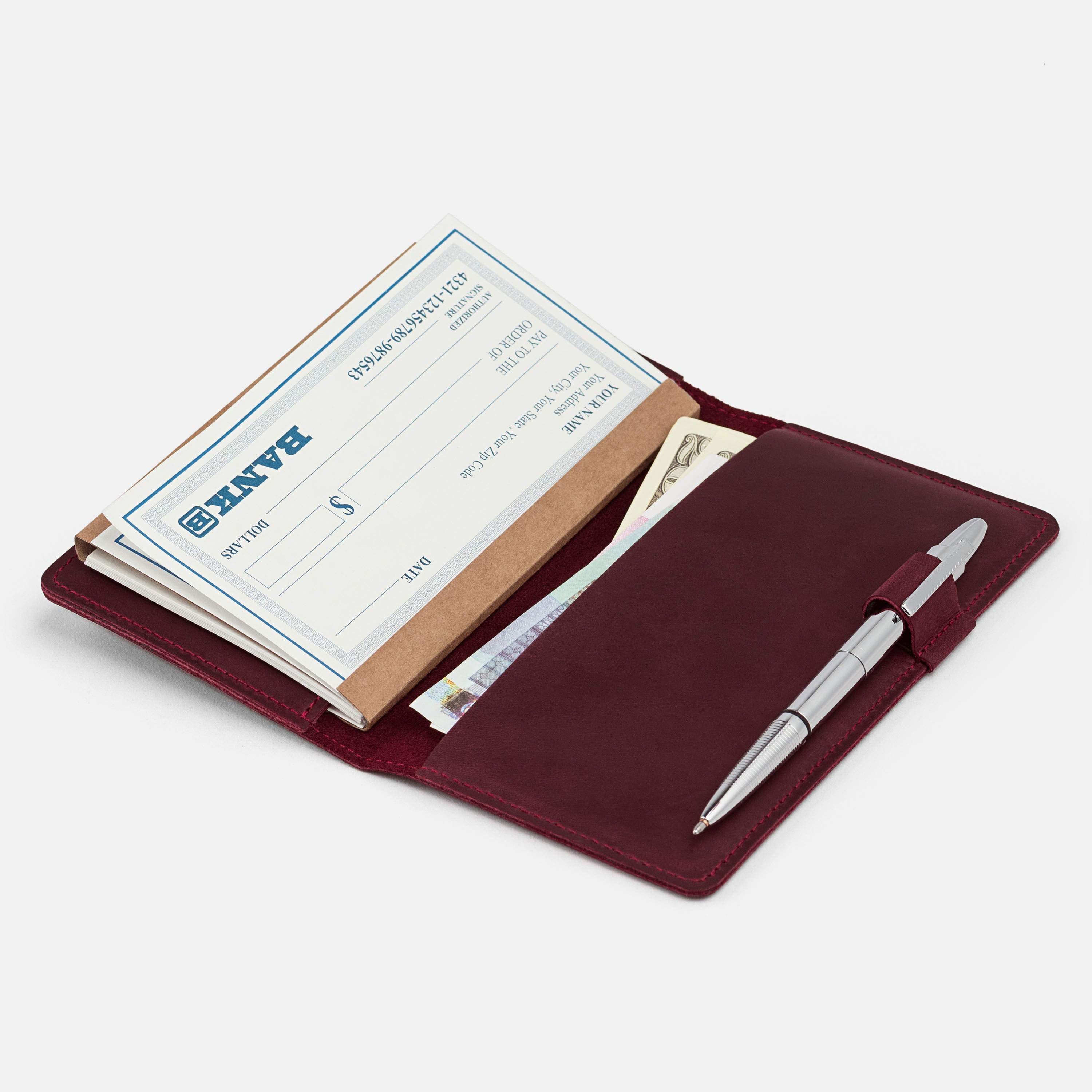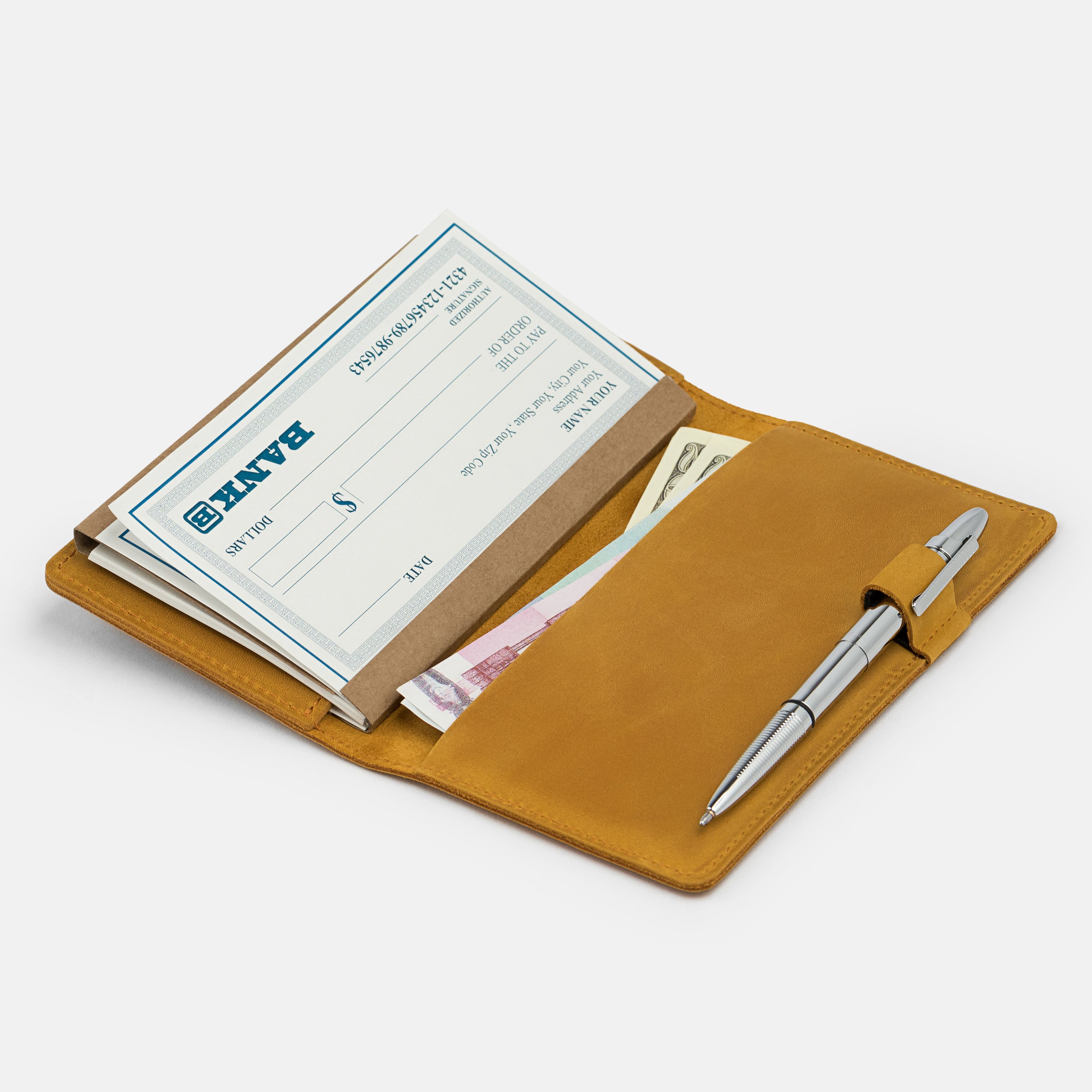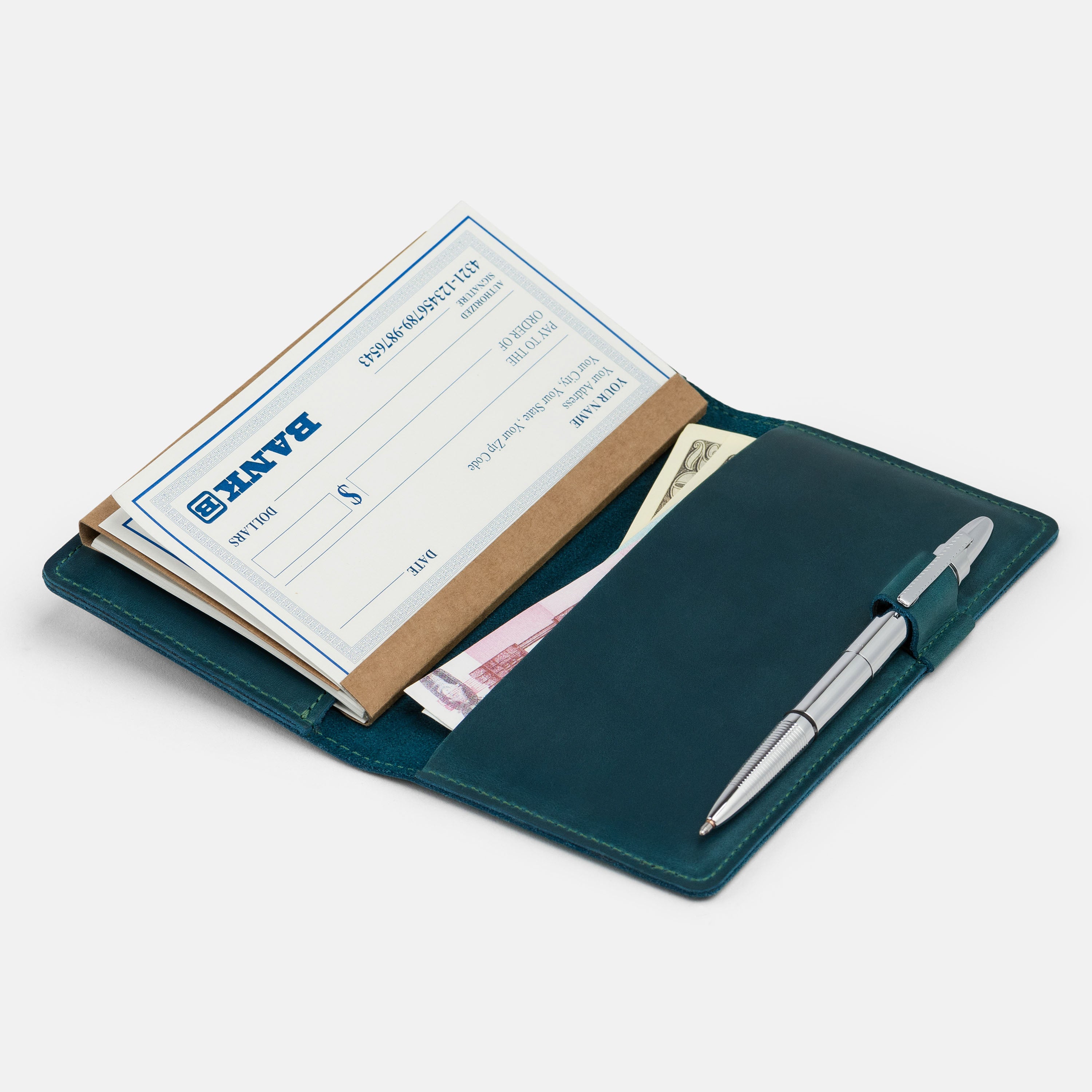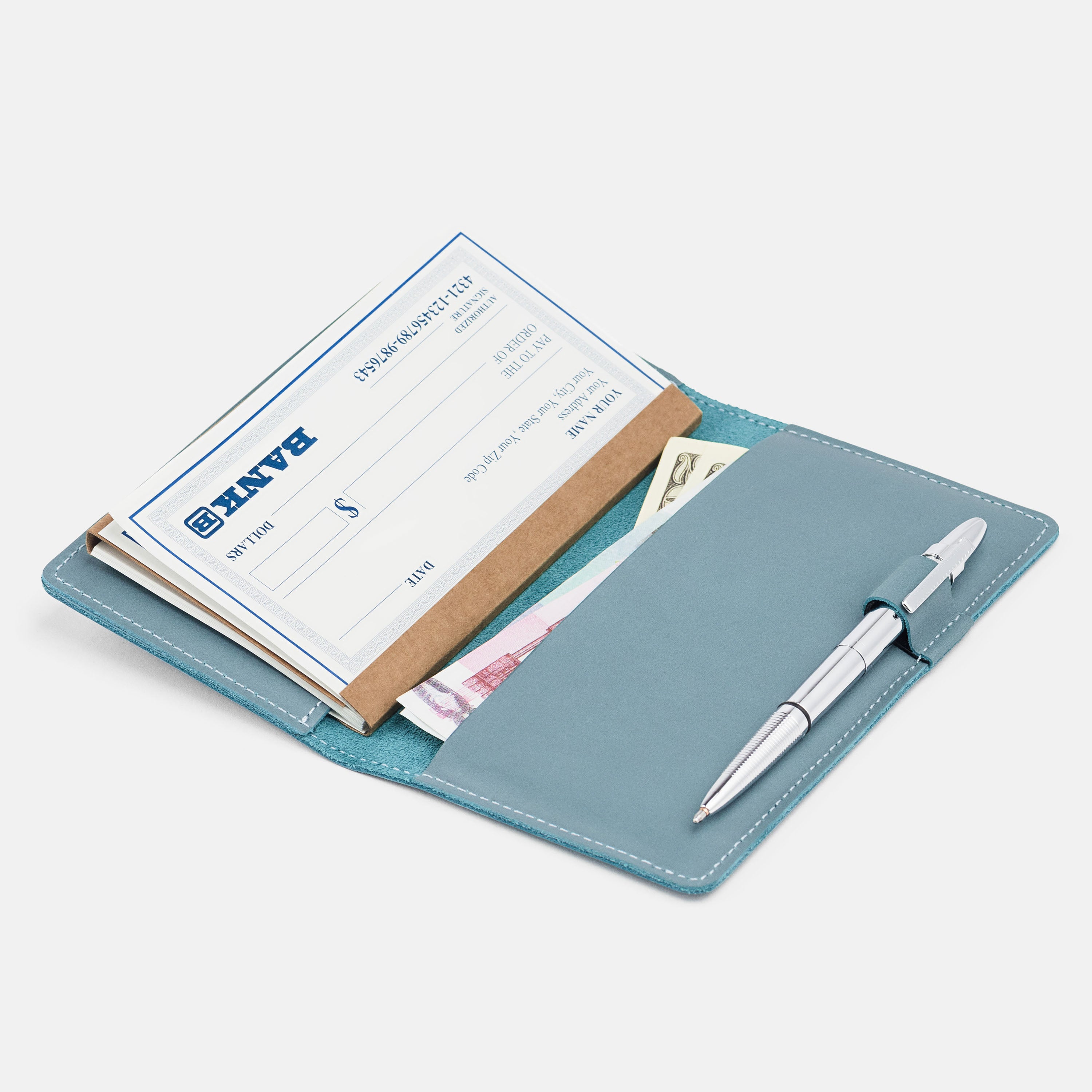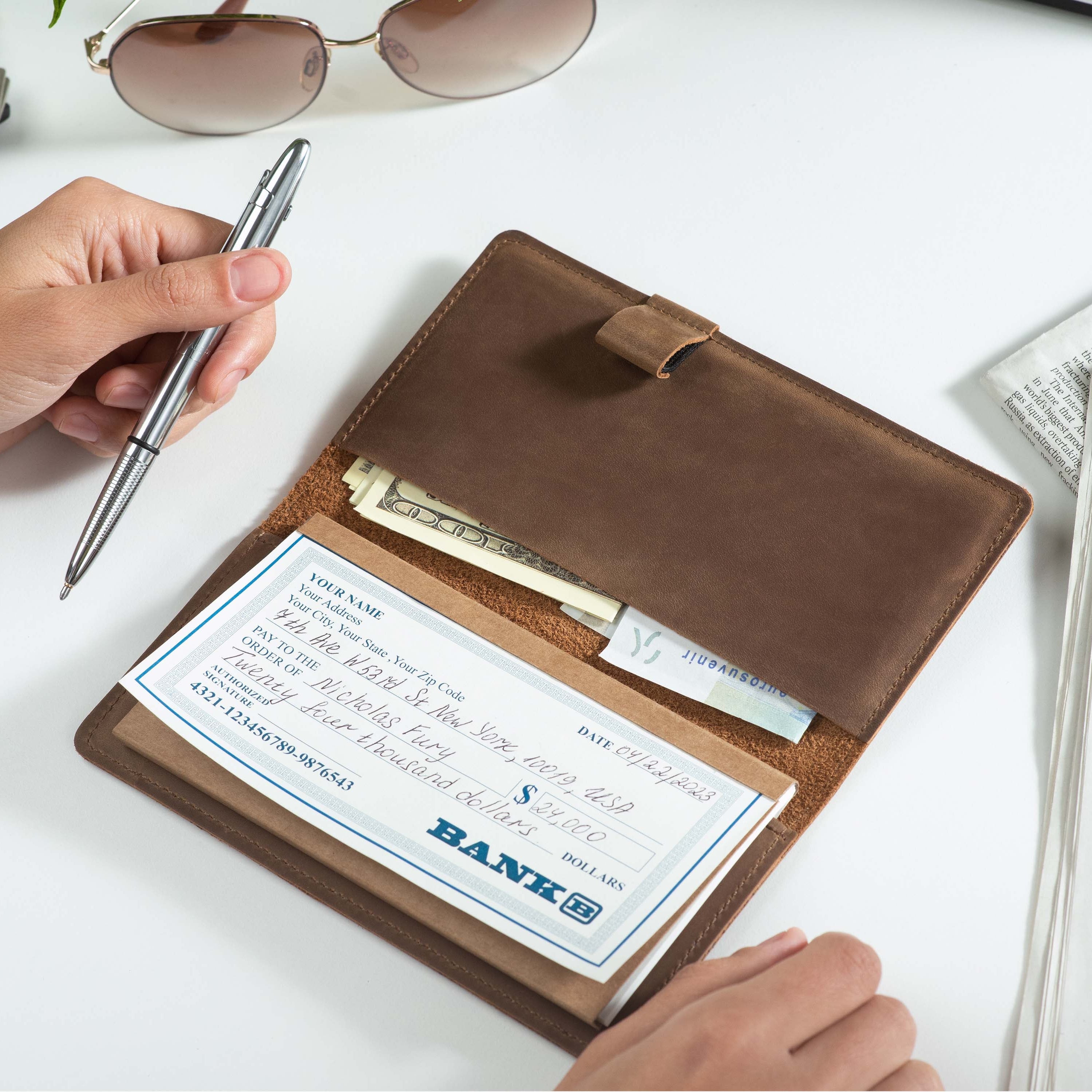 Handcrafted for both style and function, this leather checkbook cover offers a timeless way to keep your checks neatly protected. Designed to accommodate both side- and top-tear checks, it features an expandable pen holder for added convenience. Slim, durable, and customizable, it's a practical companion that easily fits into your daily routine or makes a thoughtful gift.