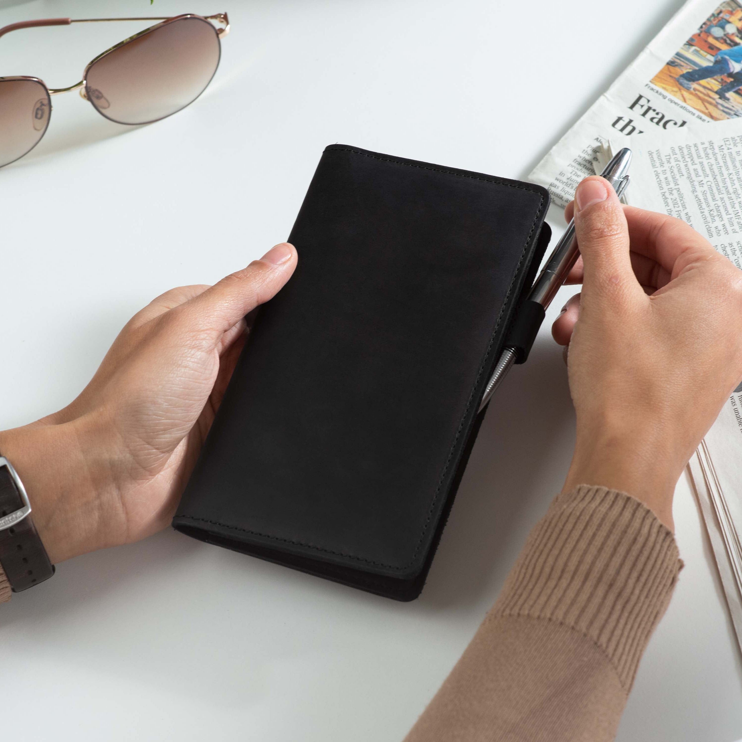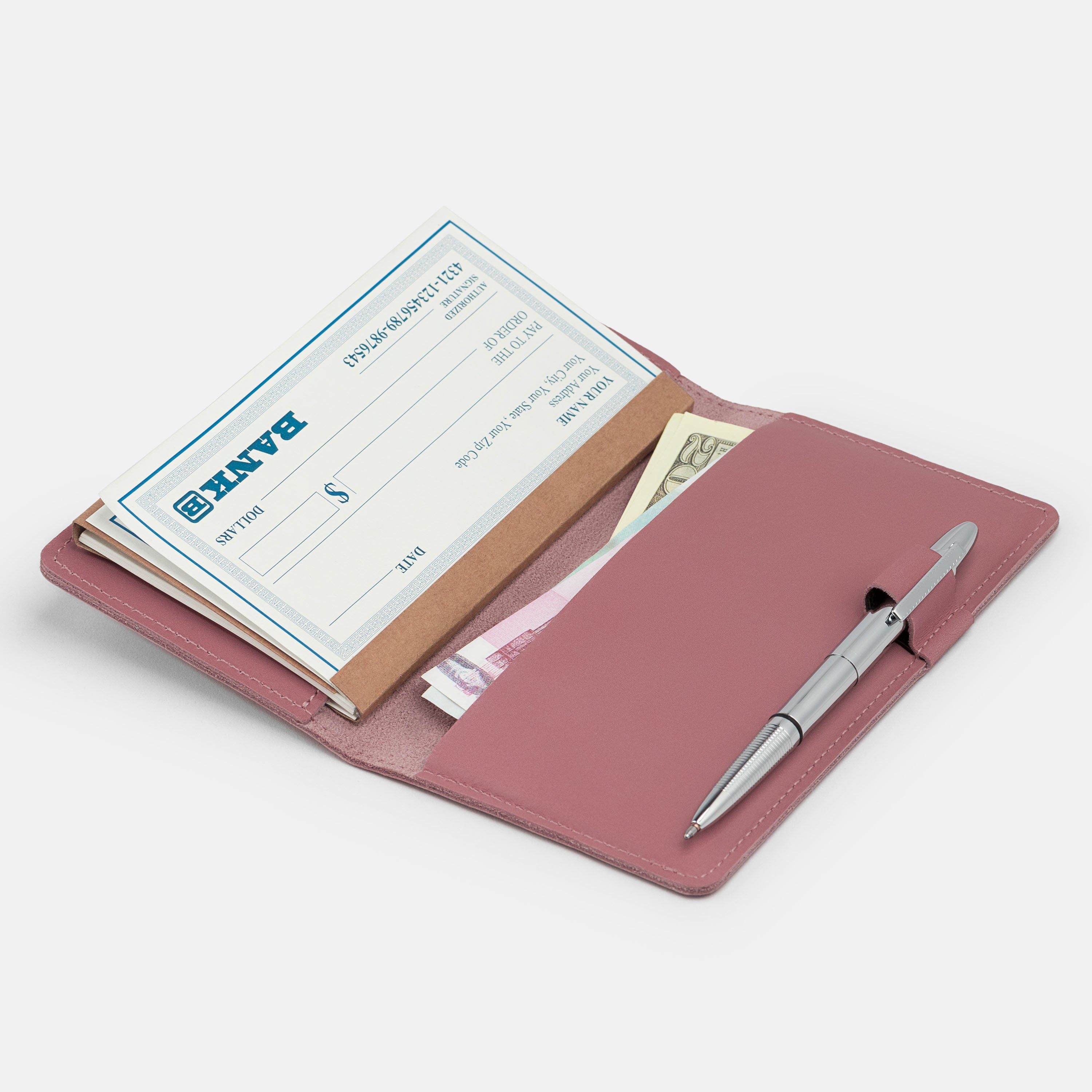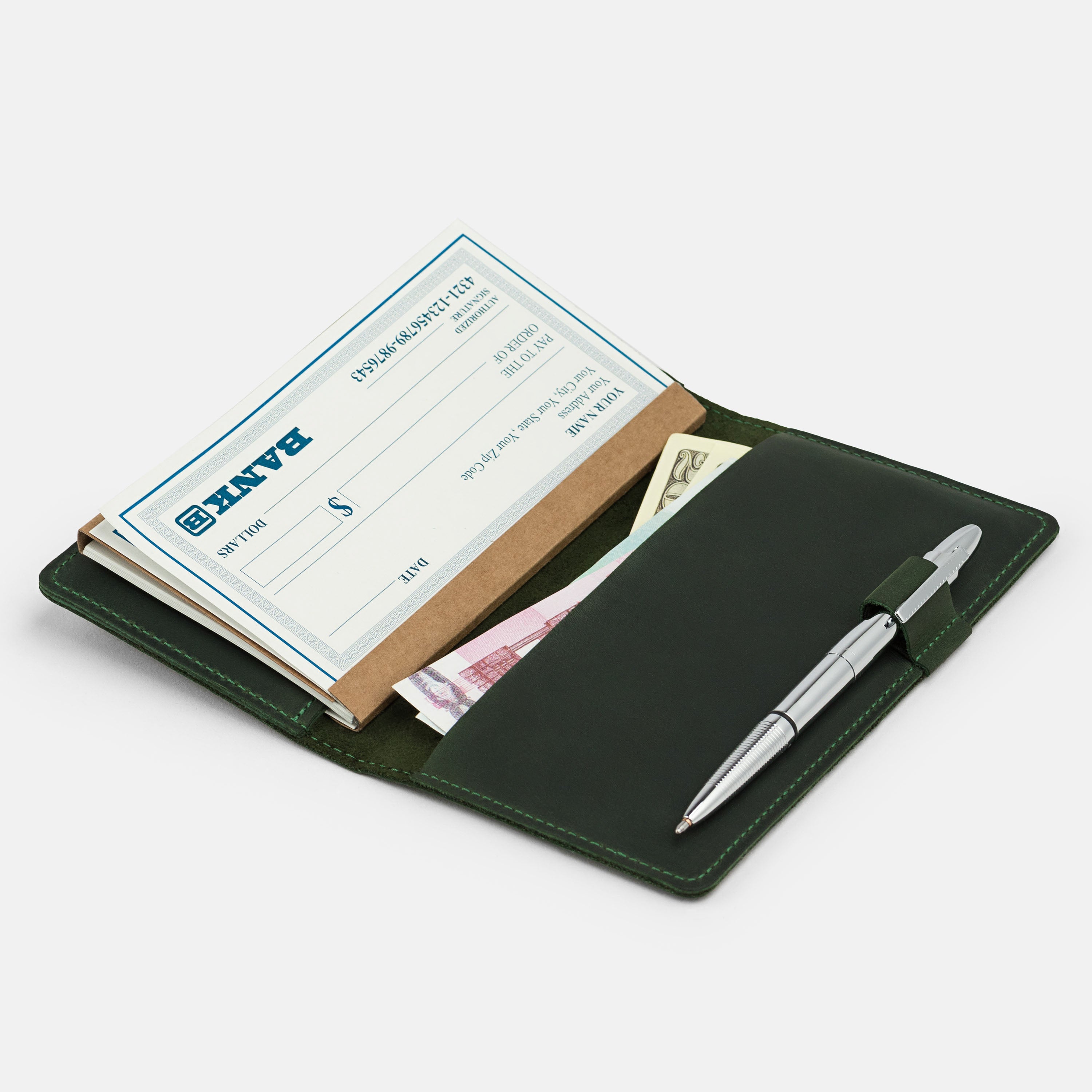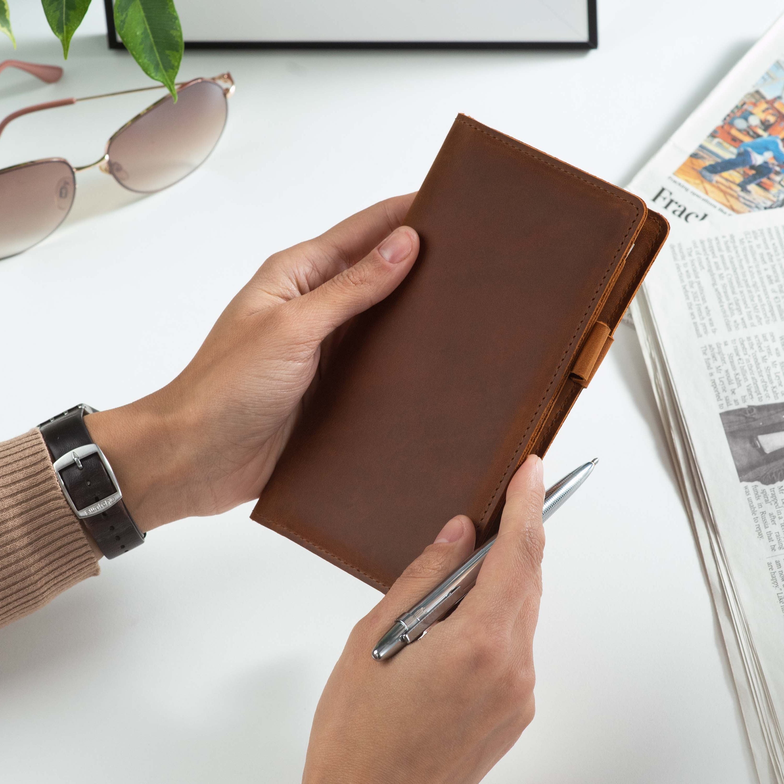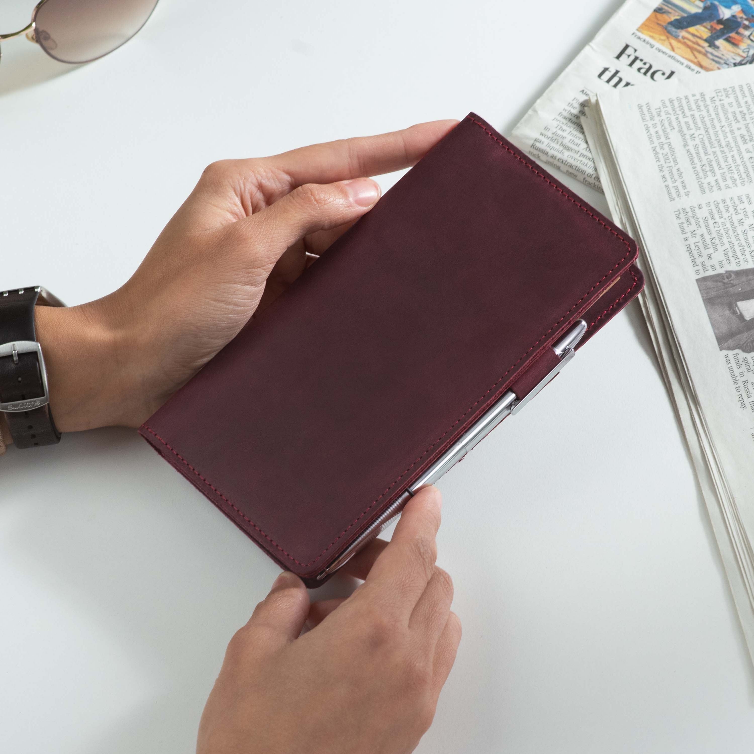 Handcrafted for both style and function, this leather checkbook cover offers a timeless way to keep your checks neatly protected. Designed to accommodate both side- and top-tear checks, it features an expandable pen holder for added convenience. Slim, durable, and customizable, it's a practical companion that easily fits into your daily routine or makes a thoughtful gift.