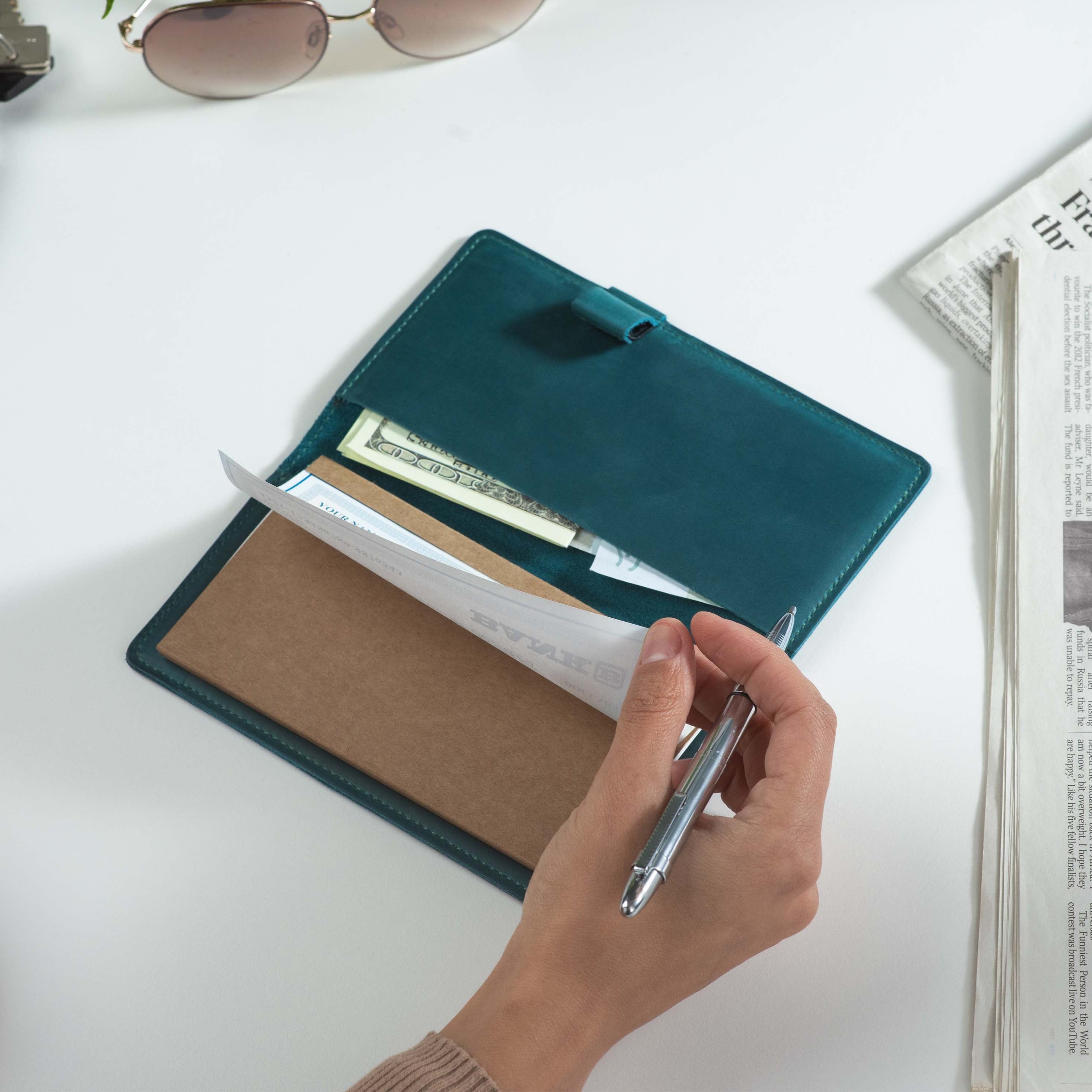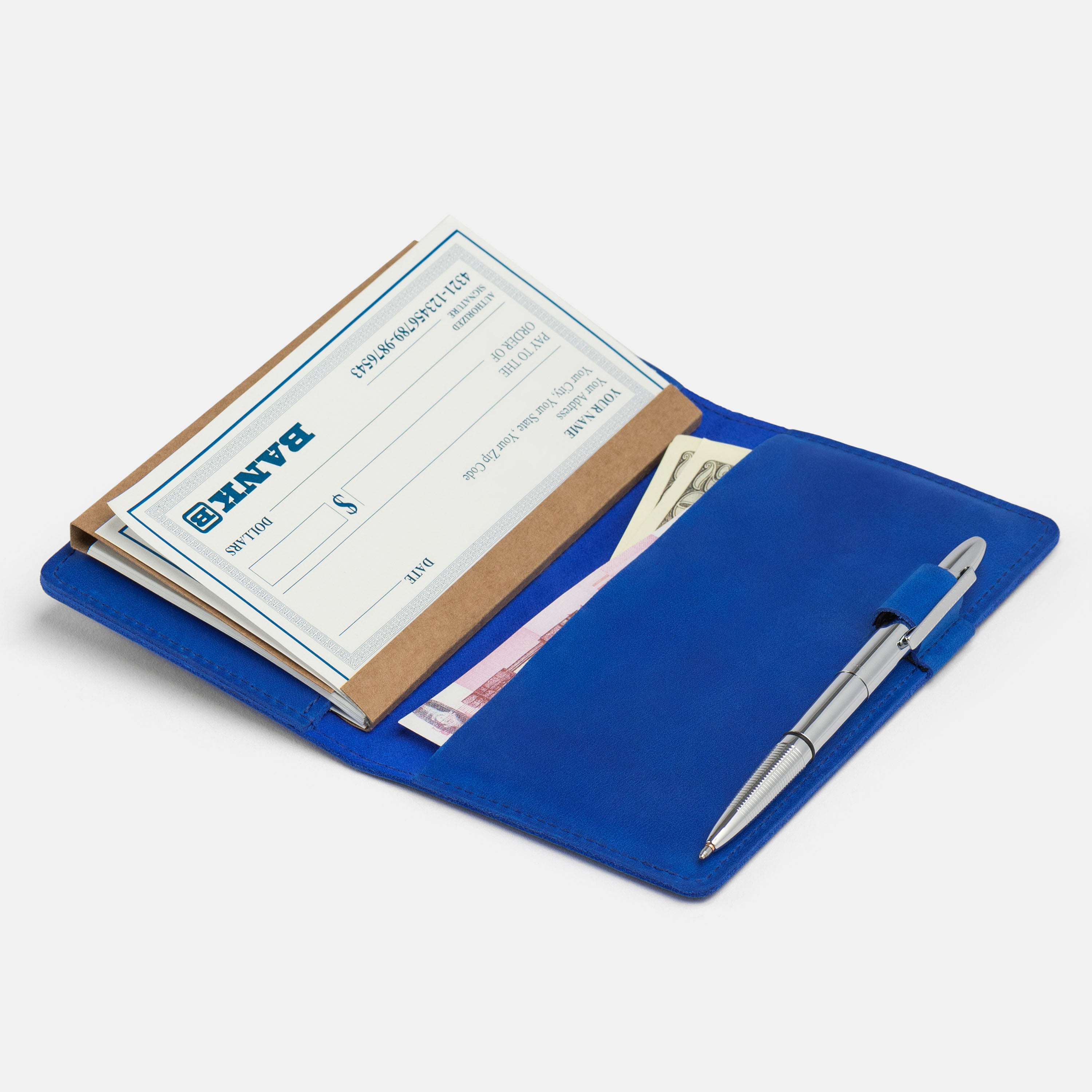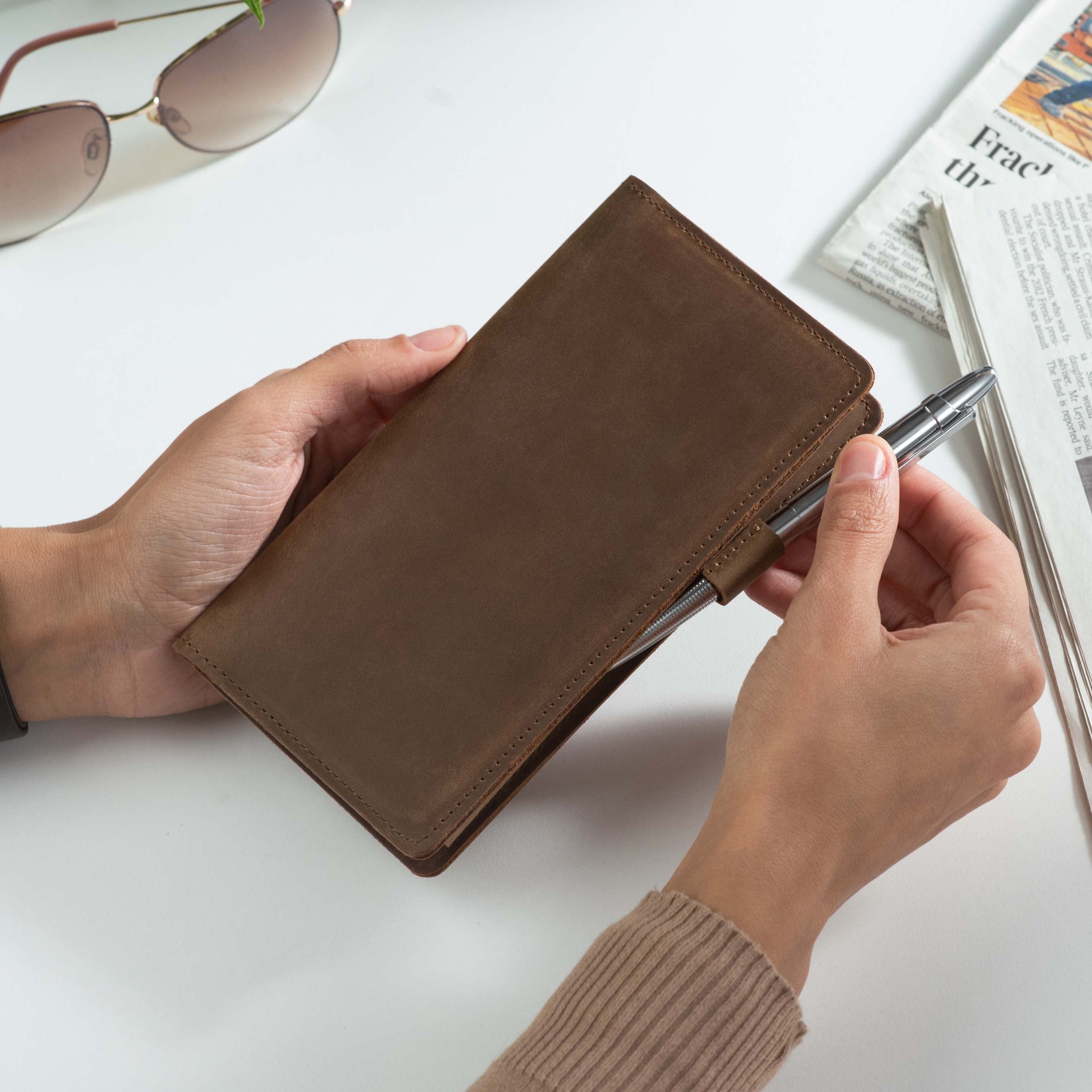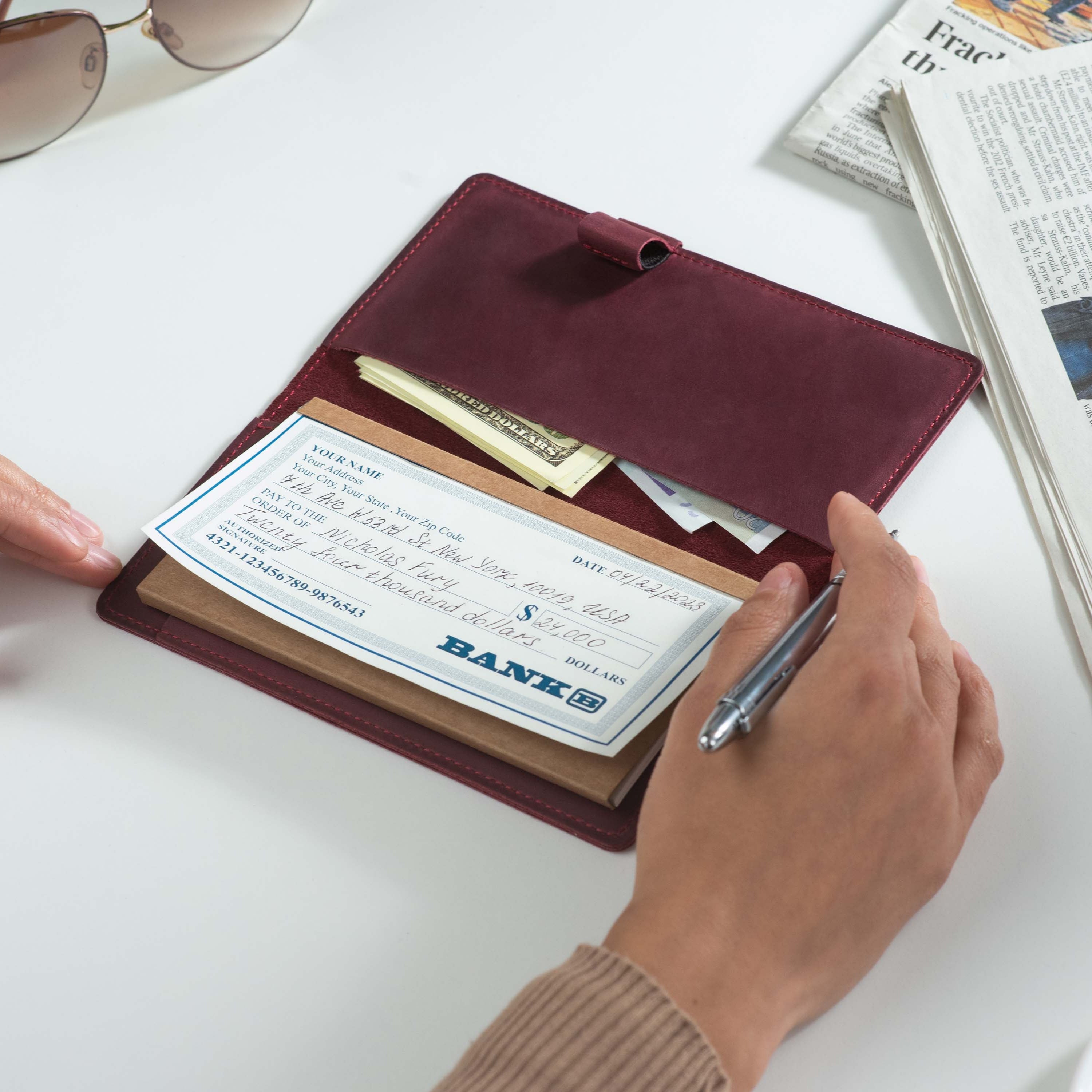 Handcrafted for both style and function, this leather checkbook cover offers a timeless way to keep your checks neatly protected. Designed to accommodate both side- and top-tear checks, it features an expandable pen holder for added convenience. Slim, durable, and customizable, it's a practical companion that easily fits into your daily routine or makes a thoughtful gift.