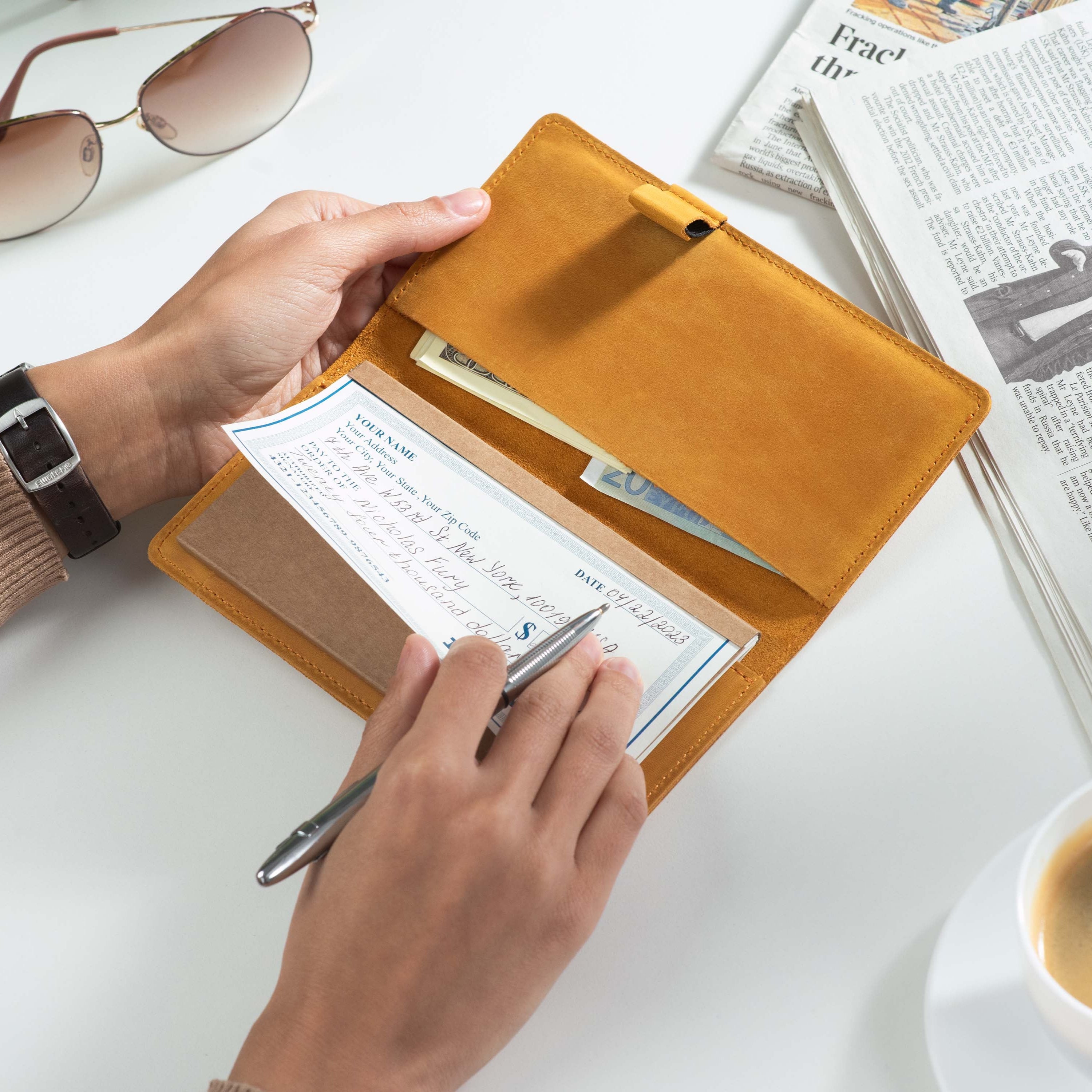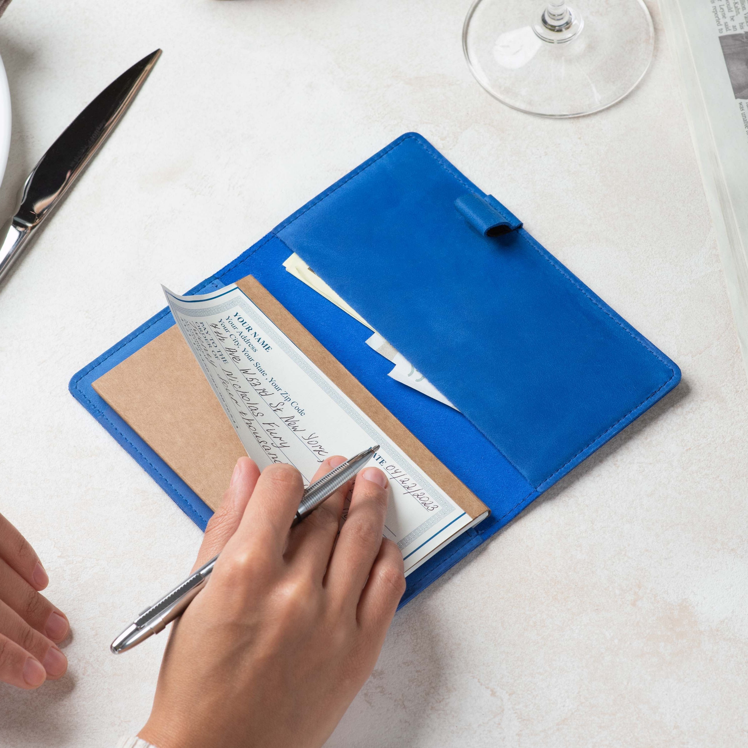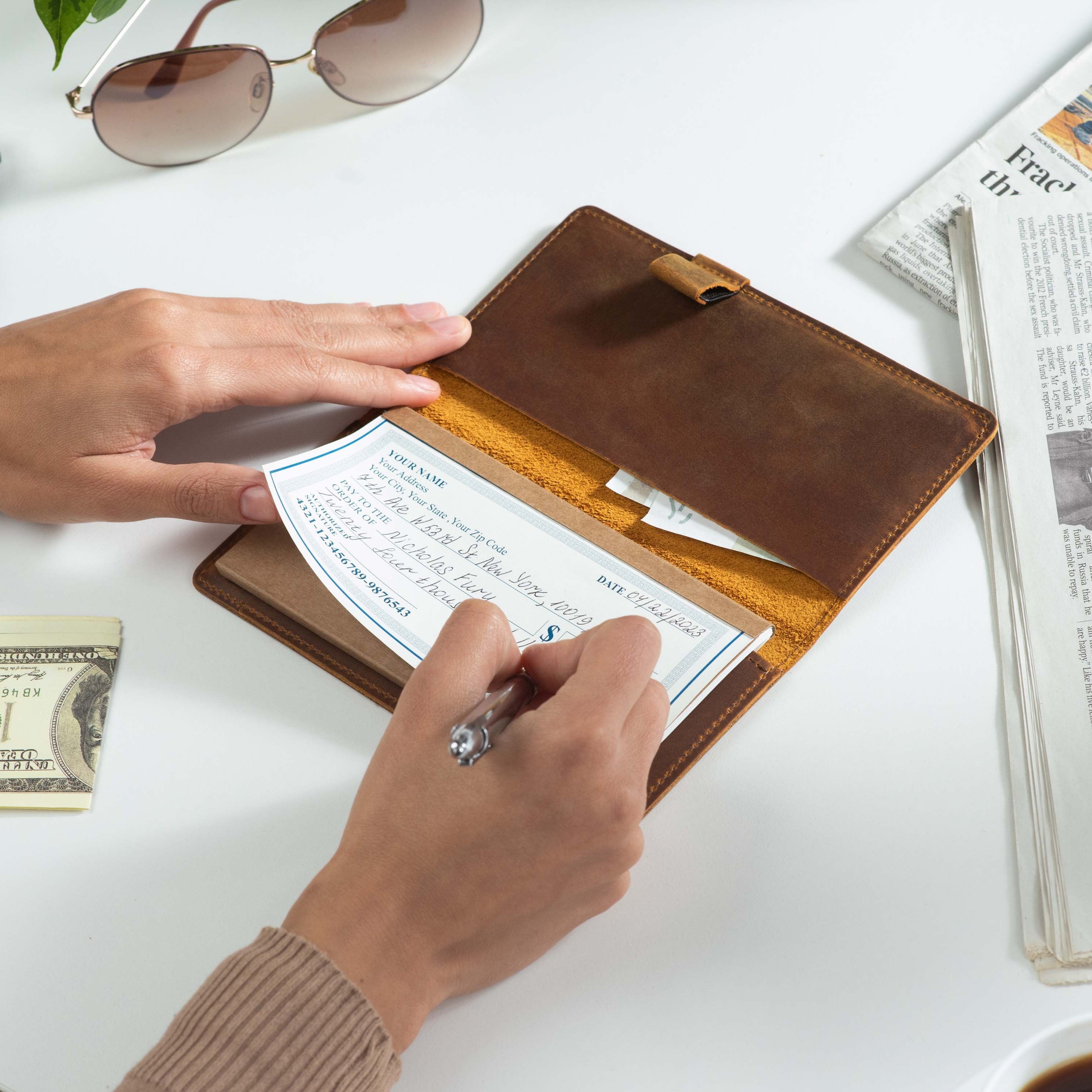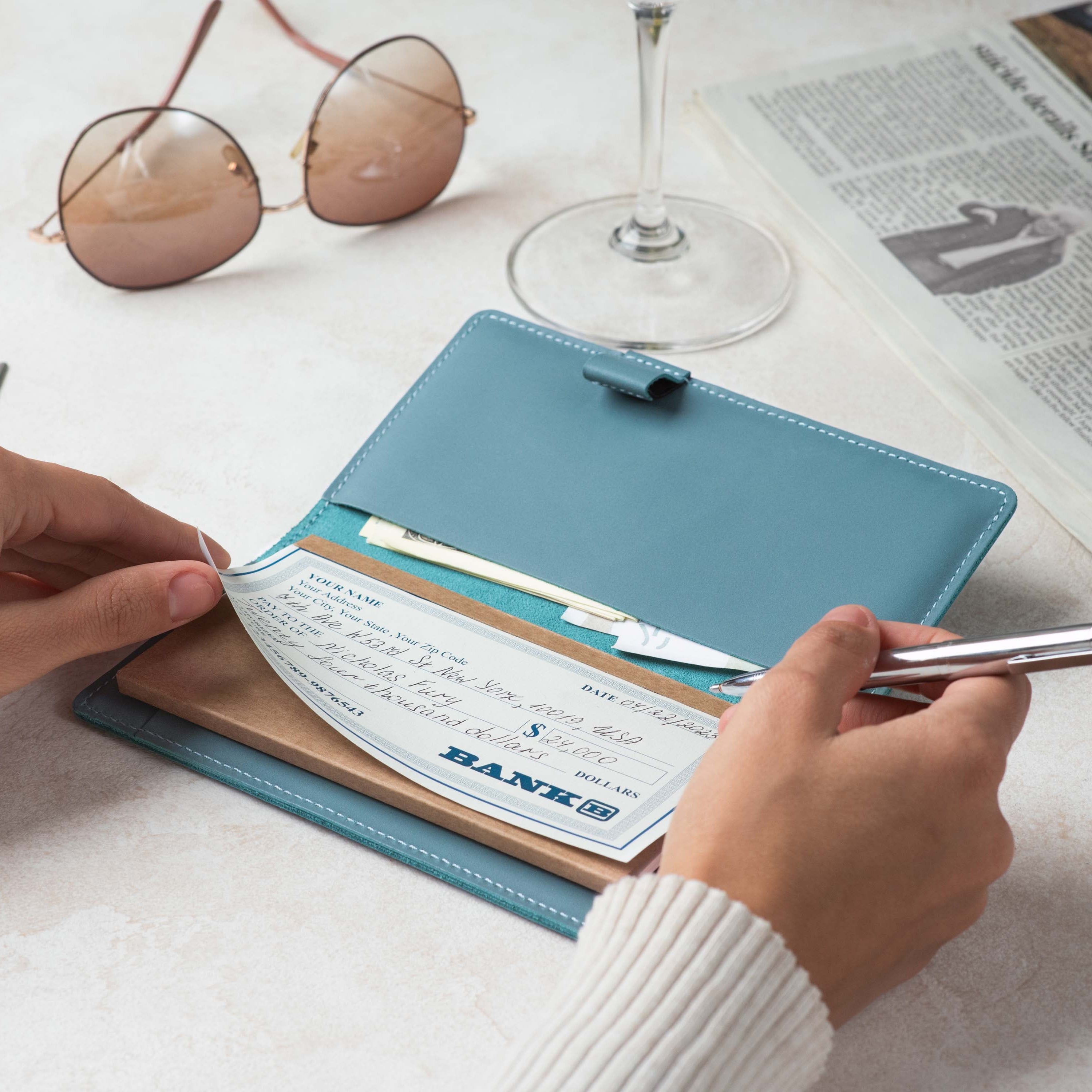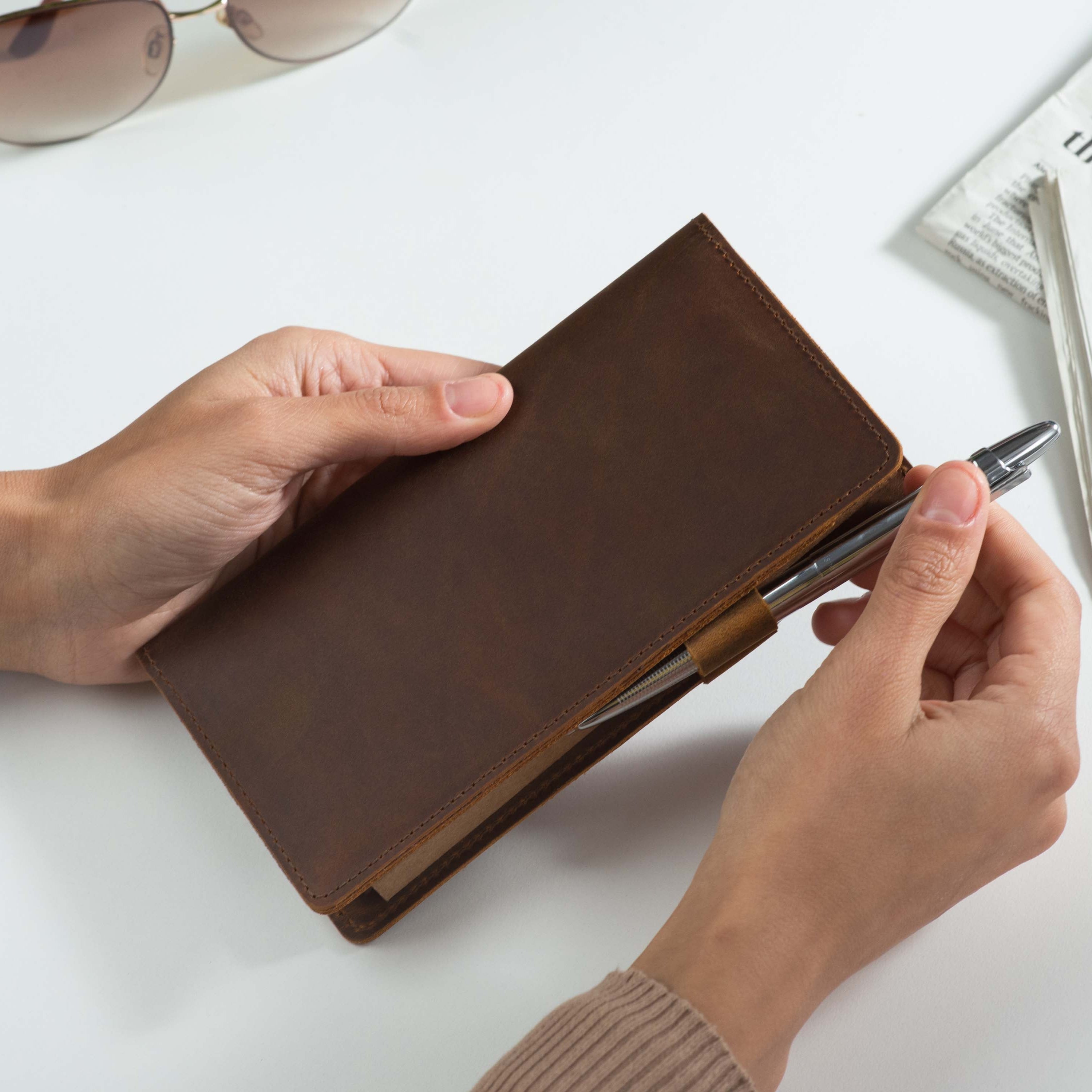 Handcrafted for both style and function, this leather checkbook cover offers a timeless way to keep your checks neatly protected. Designed to accommodate both side- and top-tear checks, it features an expandable pen holder for added convenience. Slim, durable, and customizable, it's a practical companion that easily fits into your daily routine or makes a thoughtful gift.