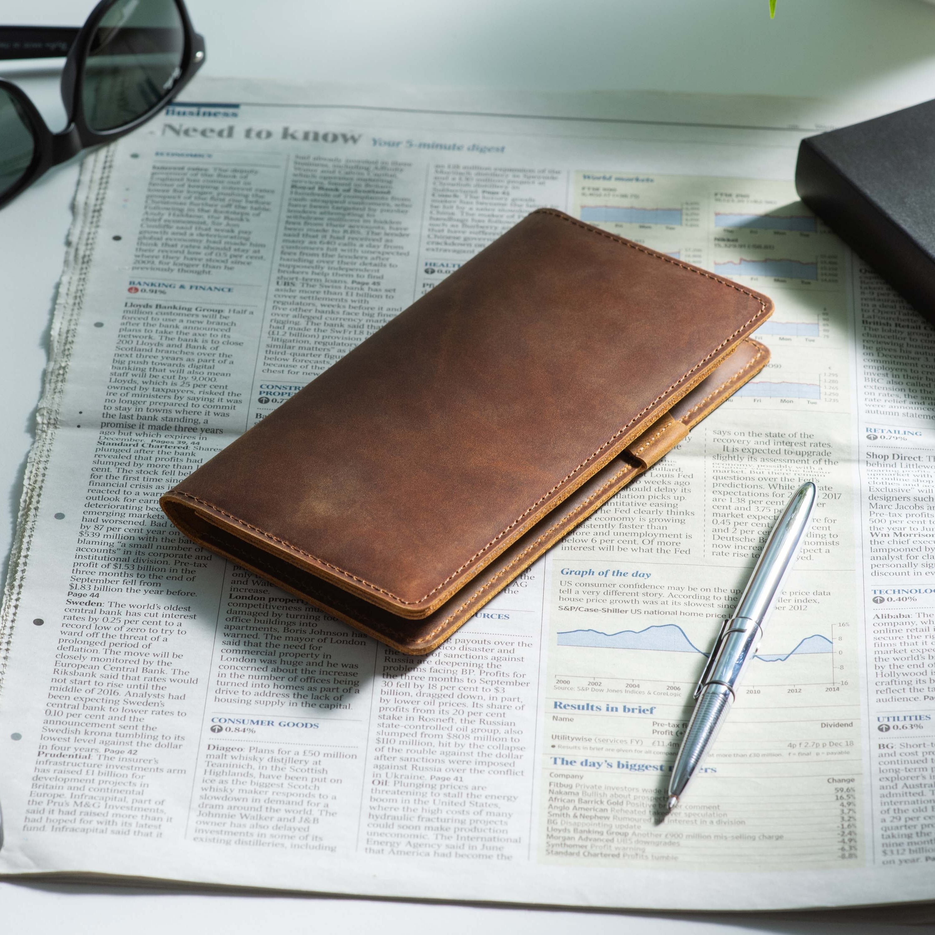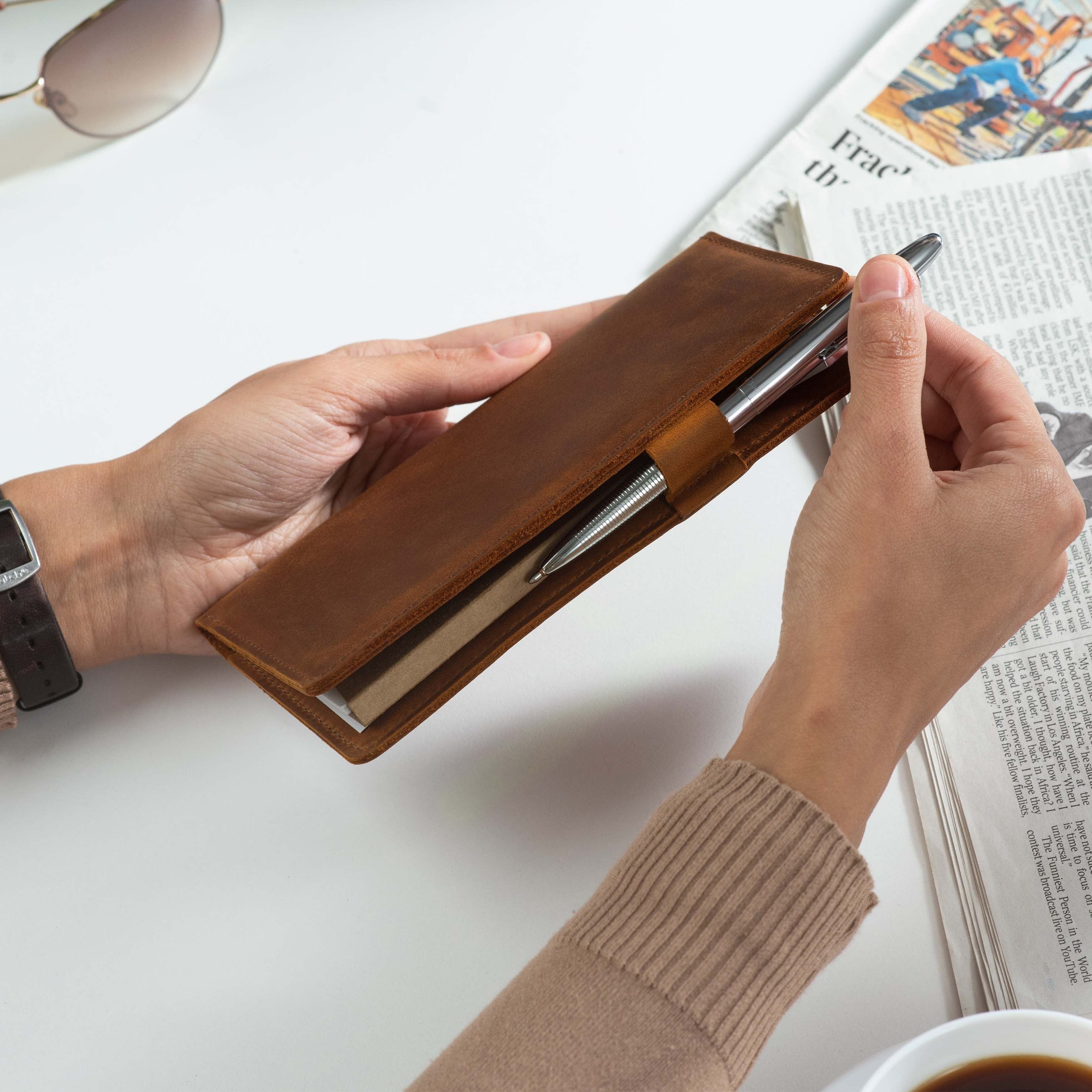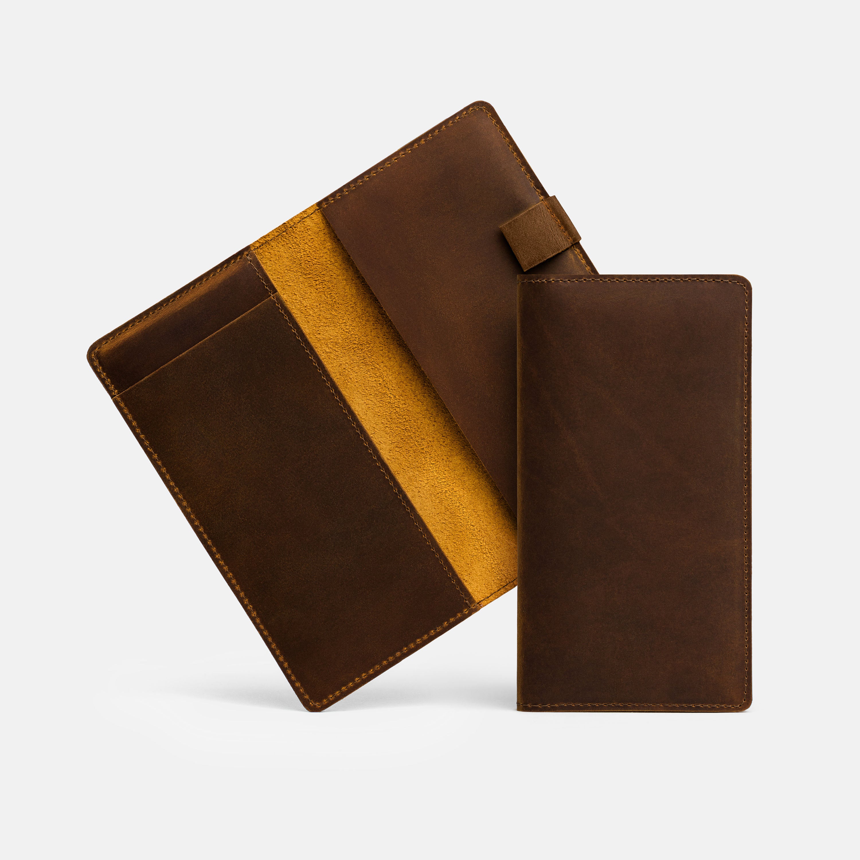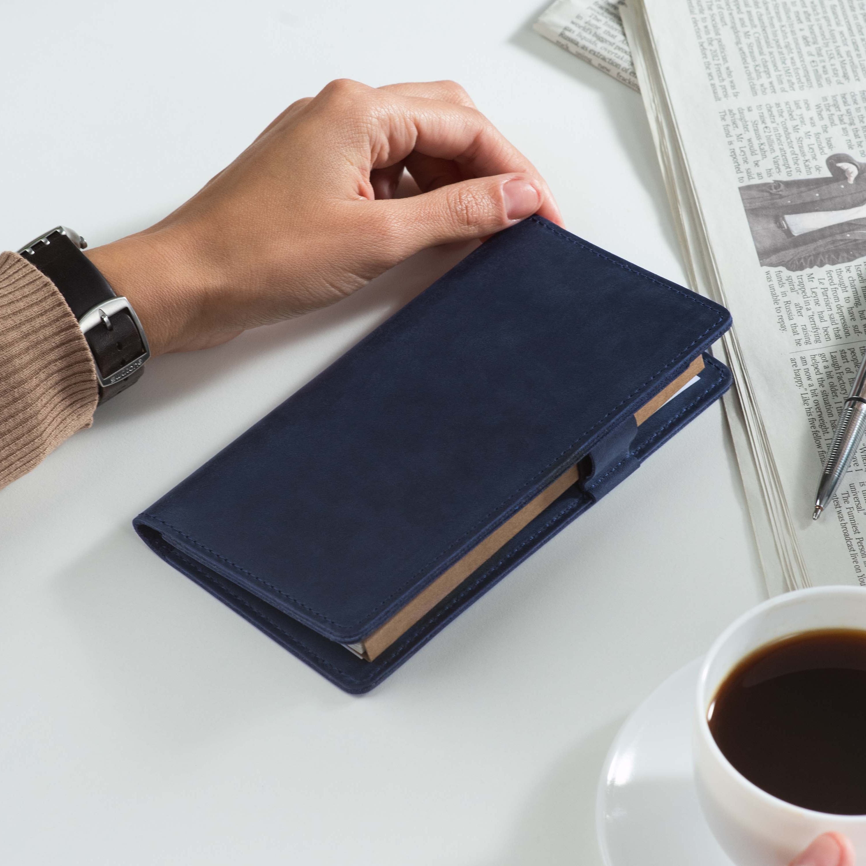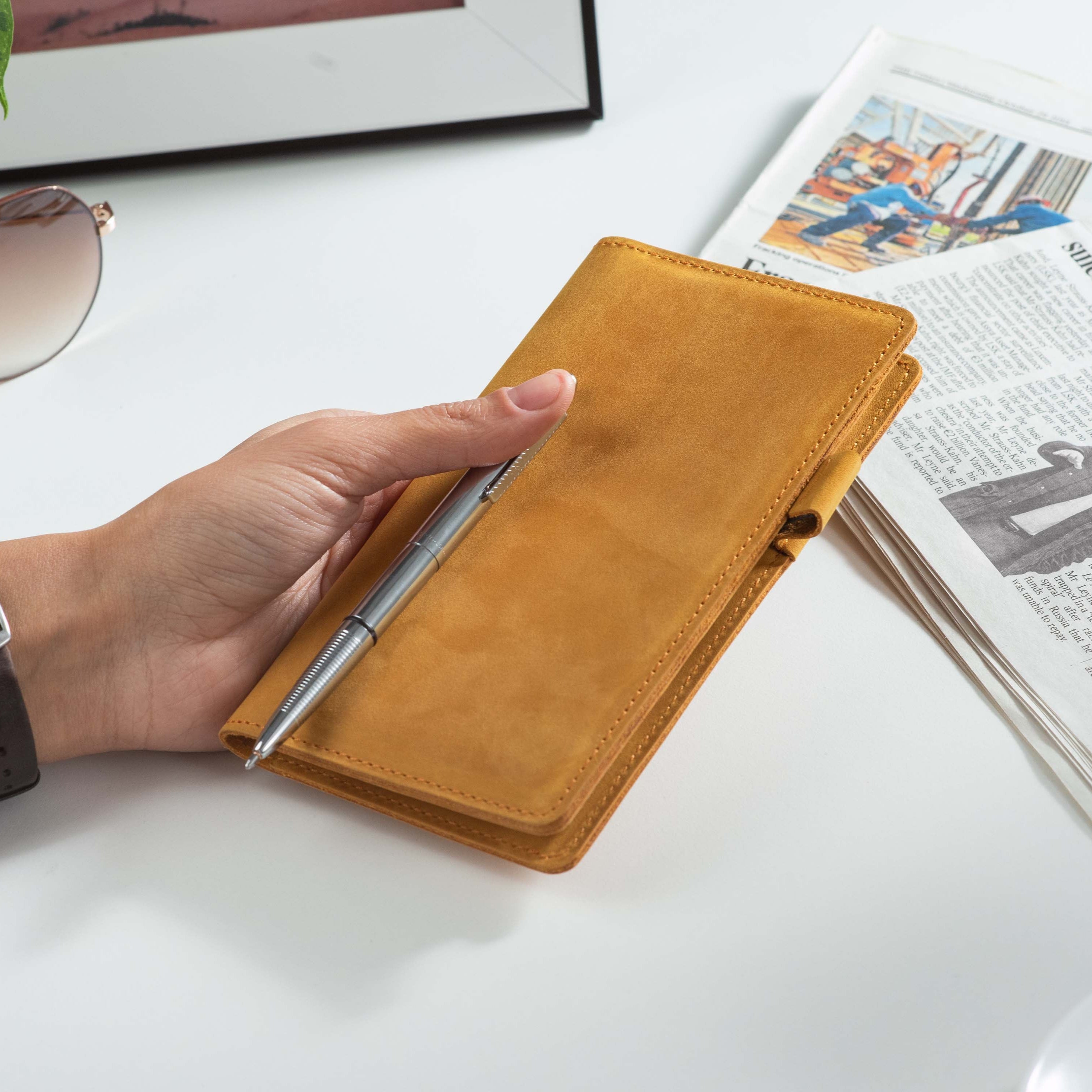 Handcrafted for both style and function, this leather checkbook cover offers a timeless way to keep your checks neatly protected. Designed to accommodate both side- and top-tear checks, it features an expandable pen holder for added convenience. Slim, durable, and customizable, it's a practical companion that easily fits into your daily routine or makes a thoughtful gift.