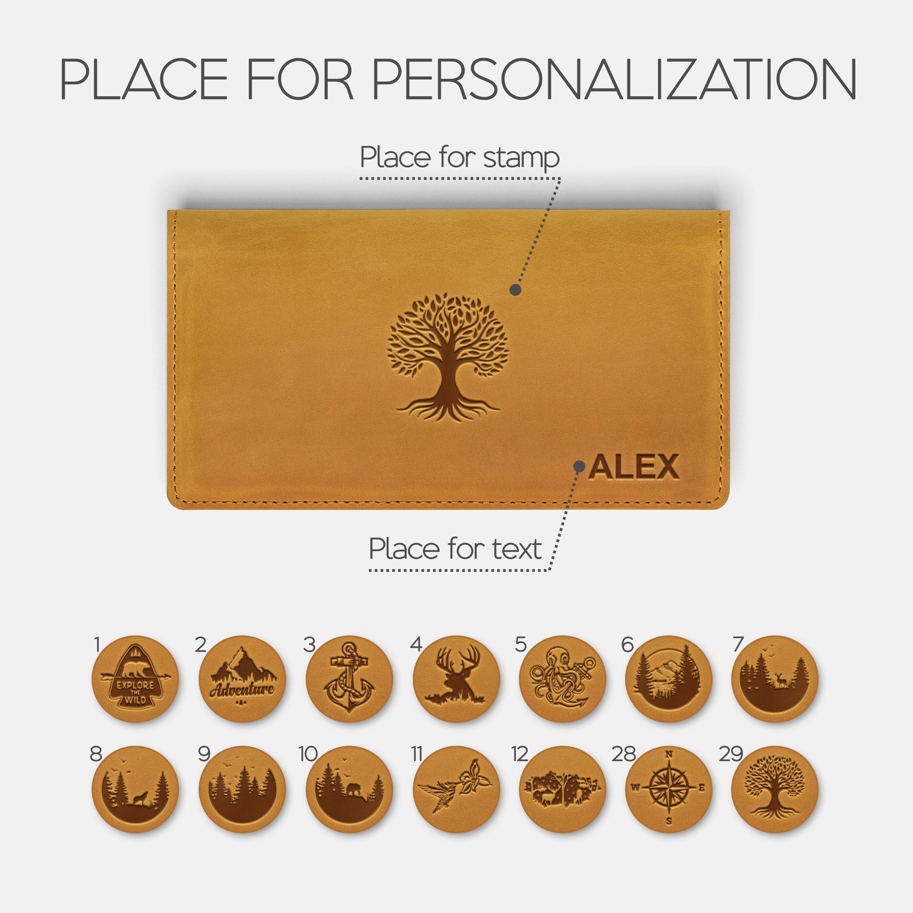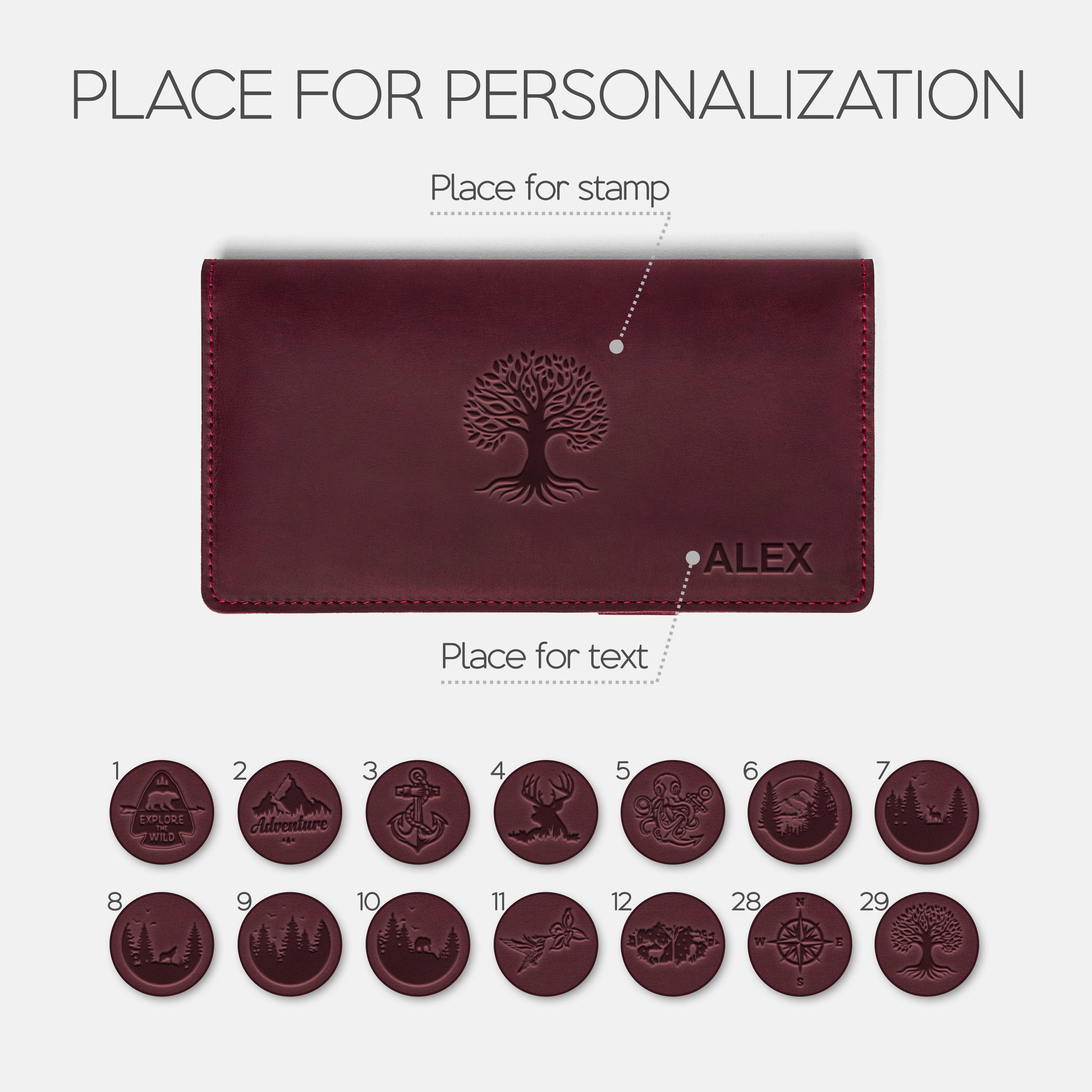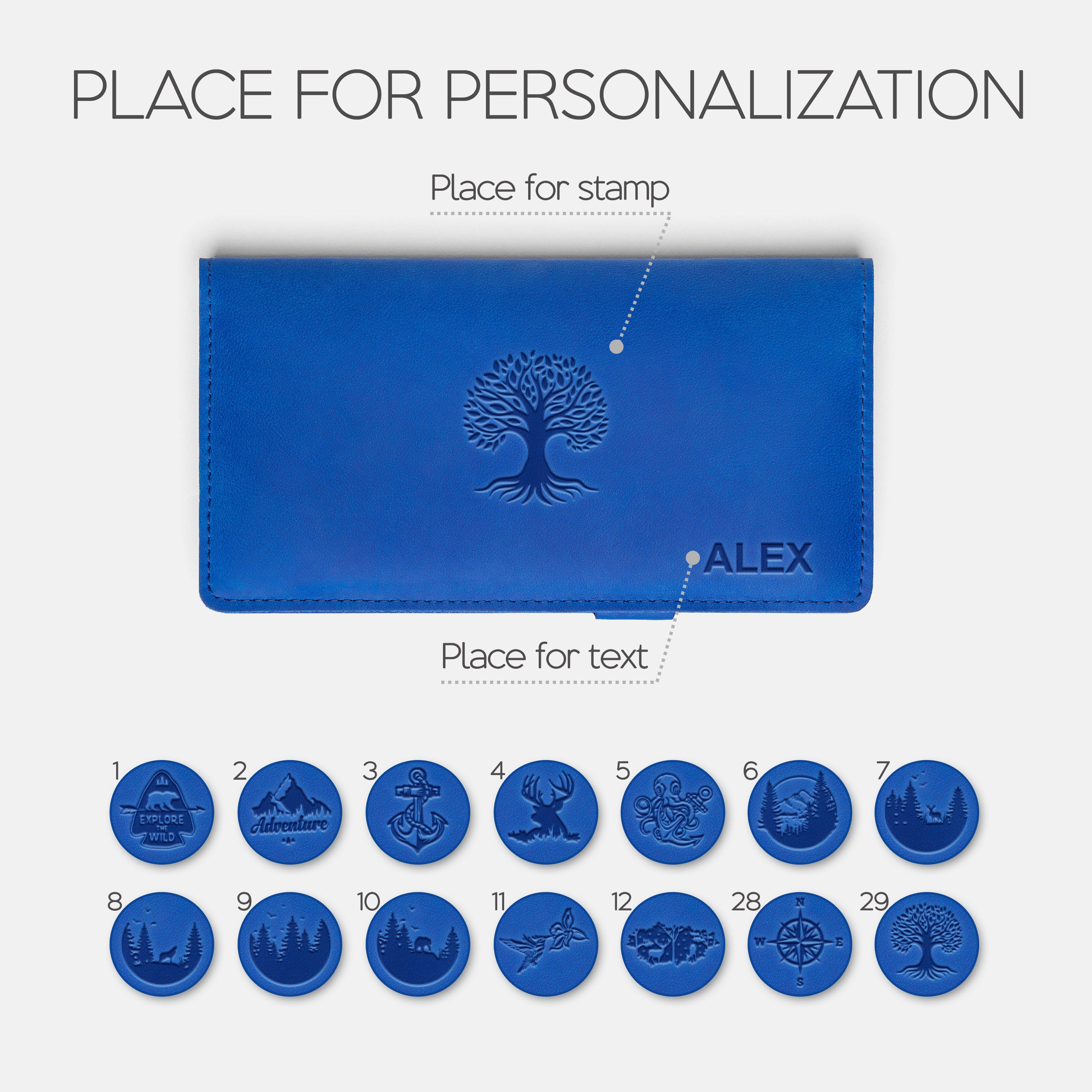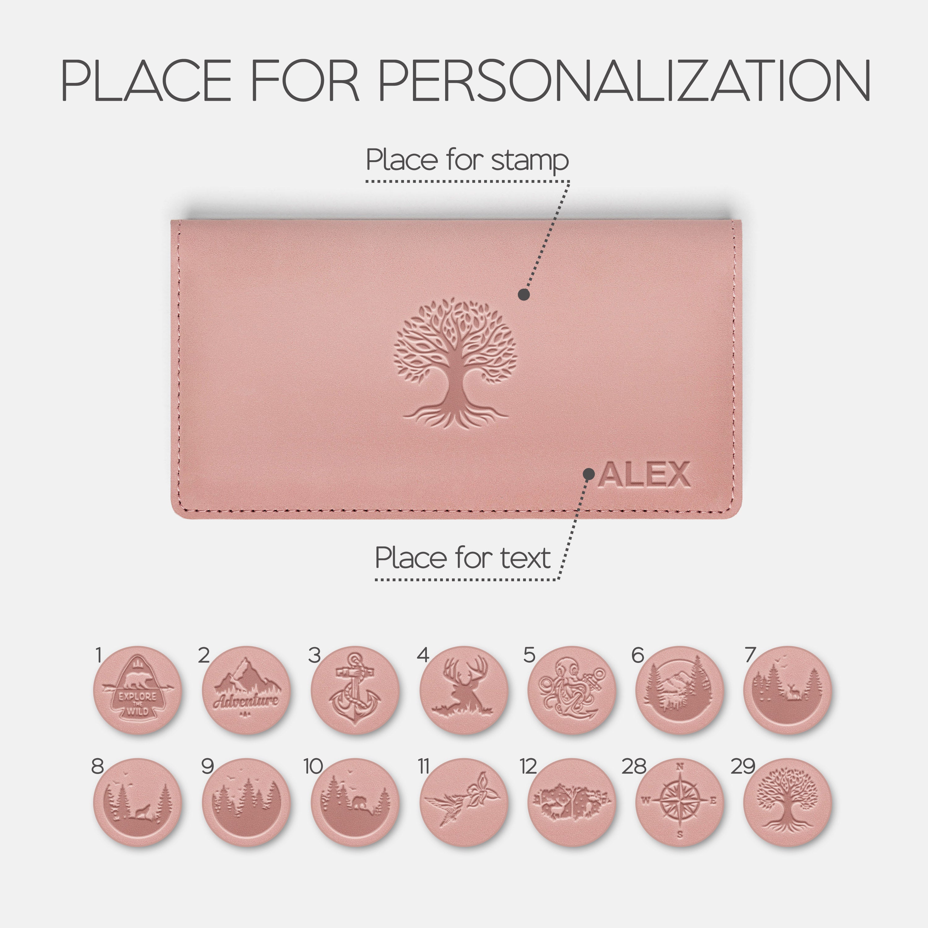 Personalization options: text and/or stamp.