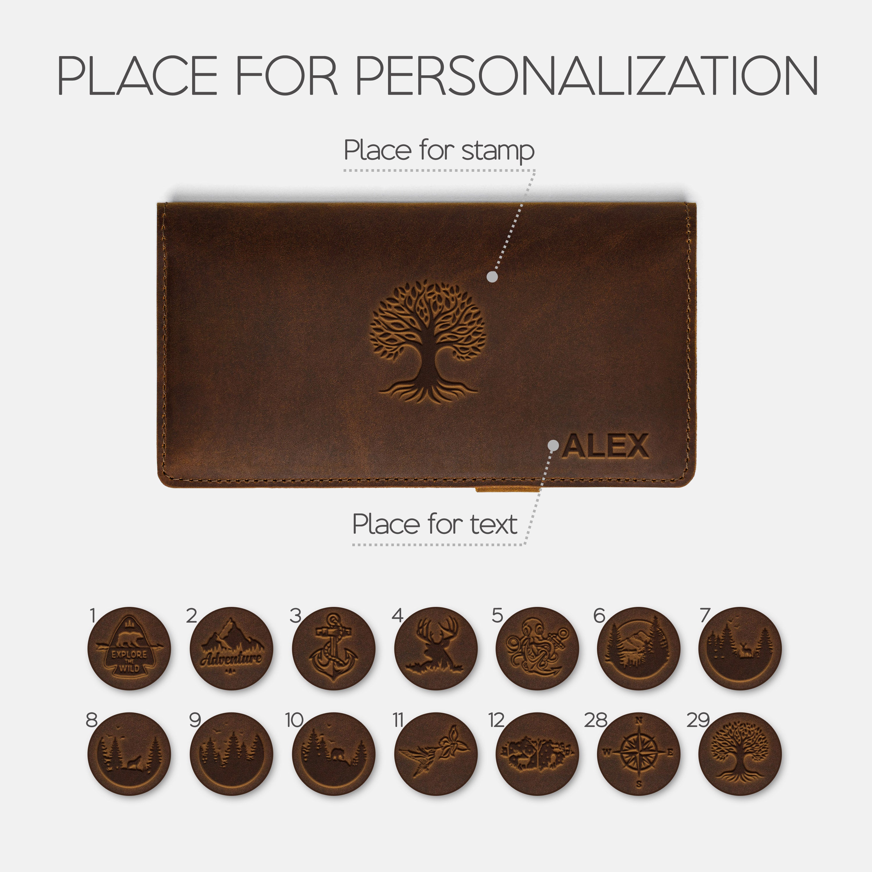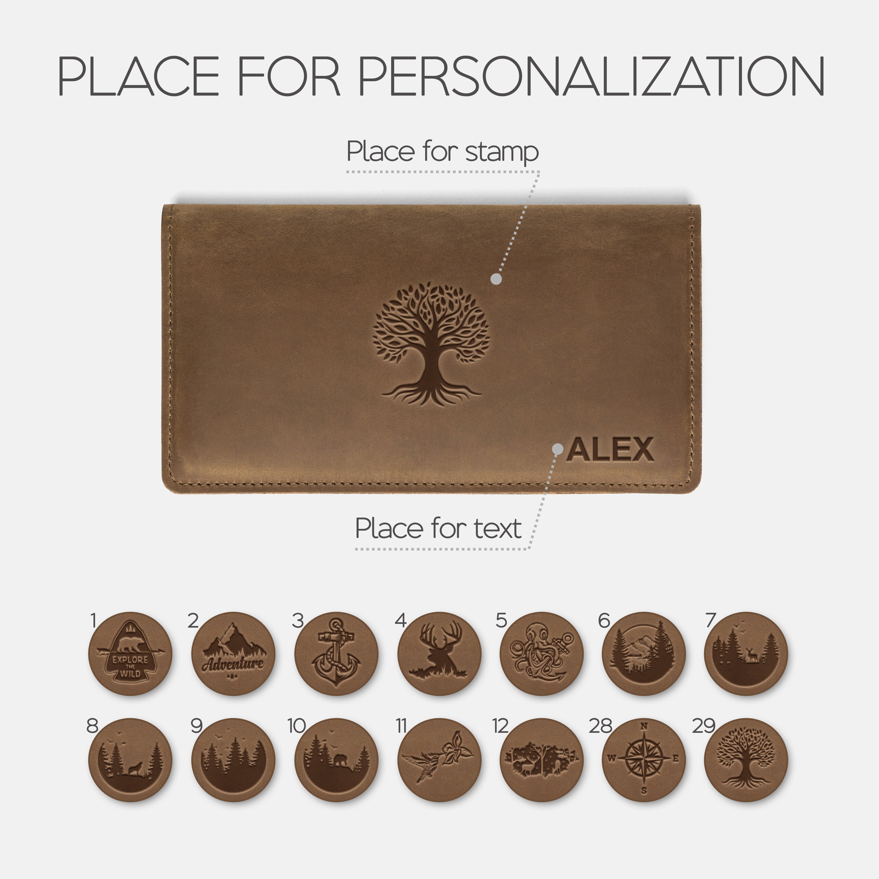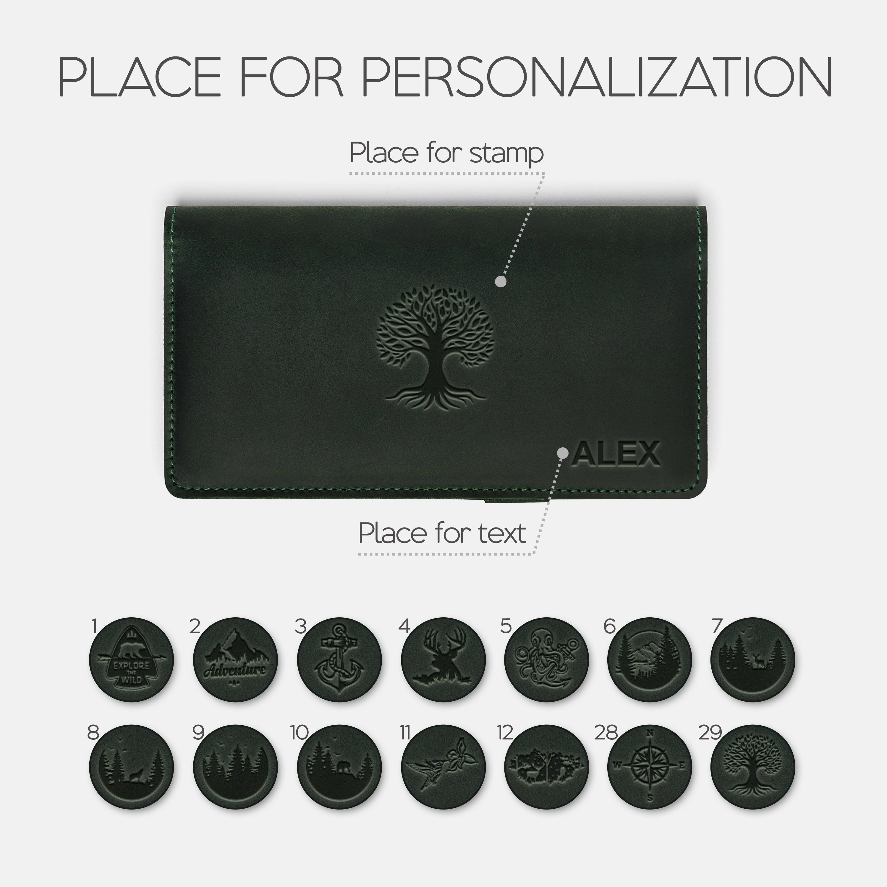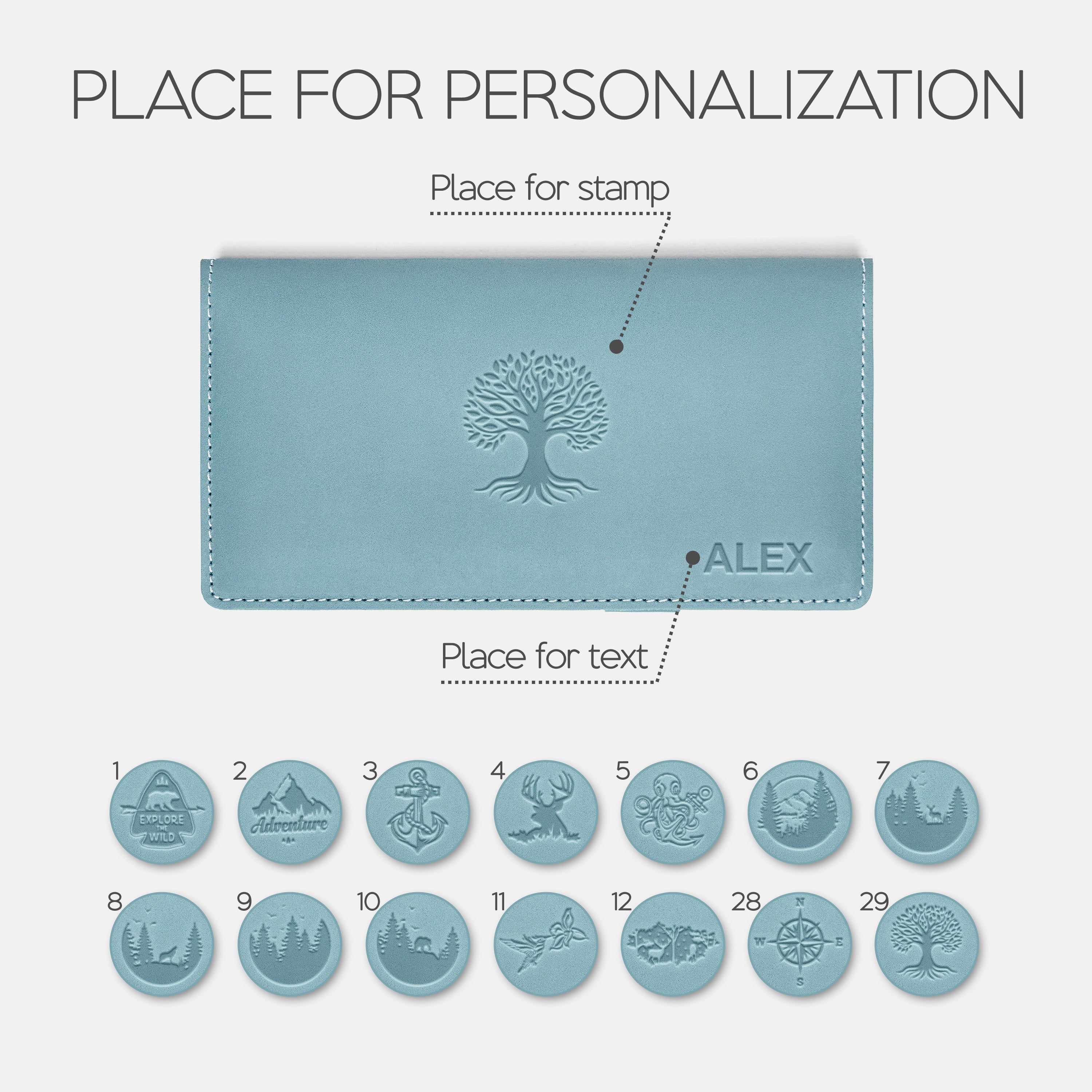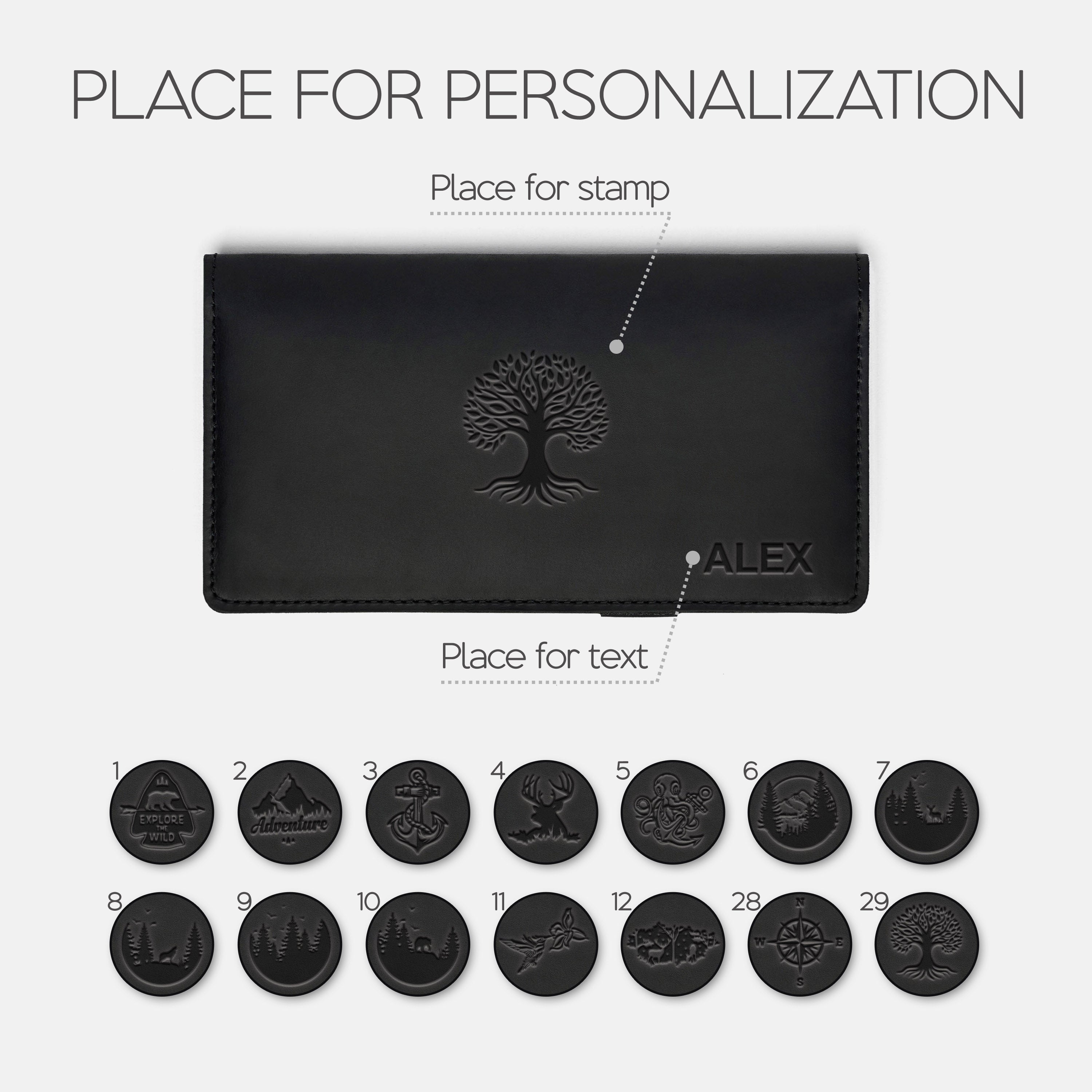 Personalization options: text and/or stamp.