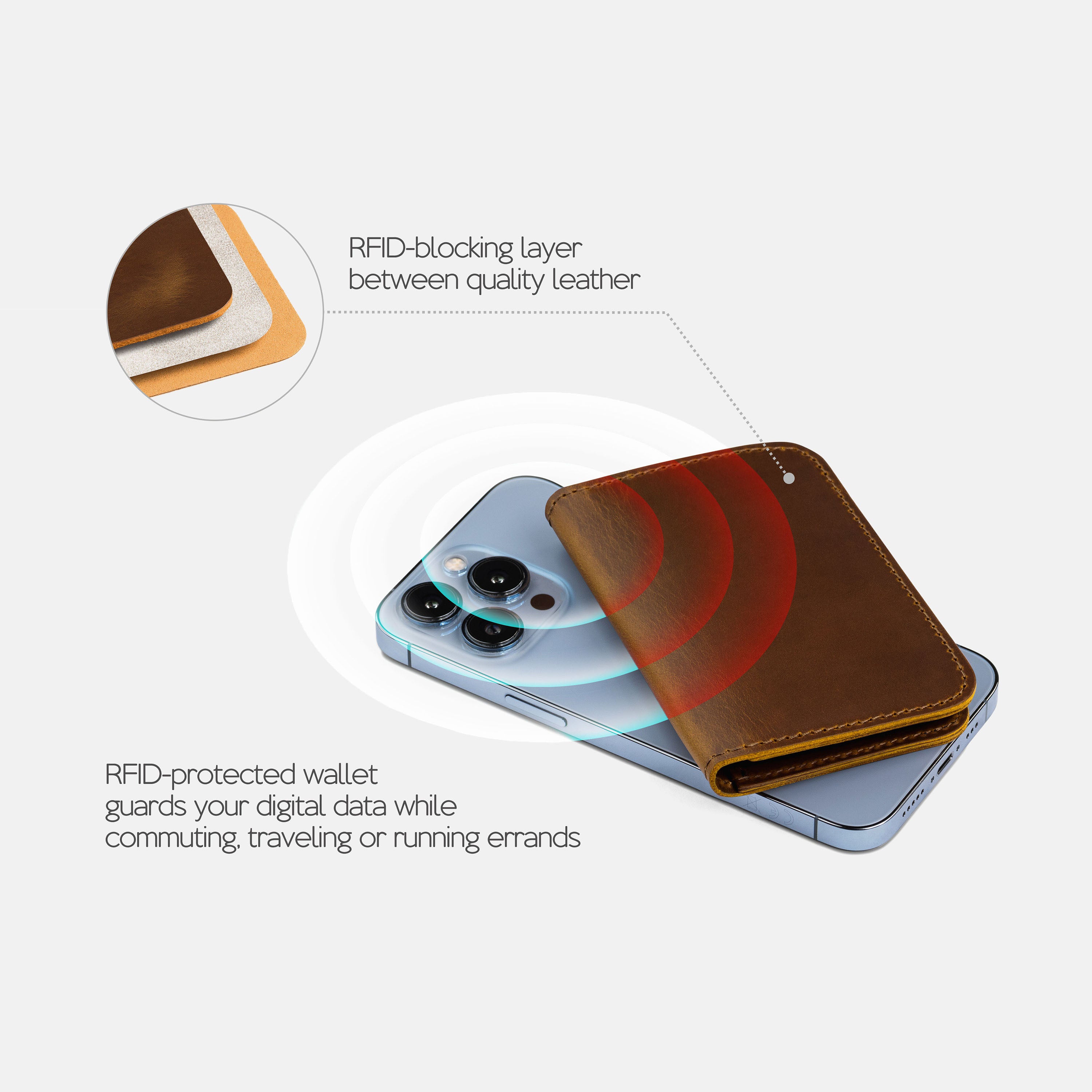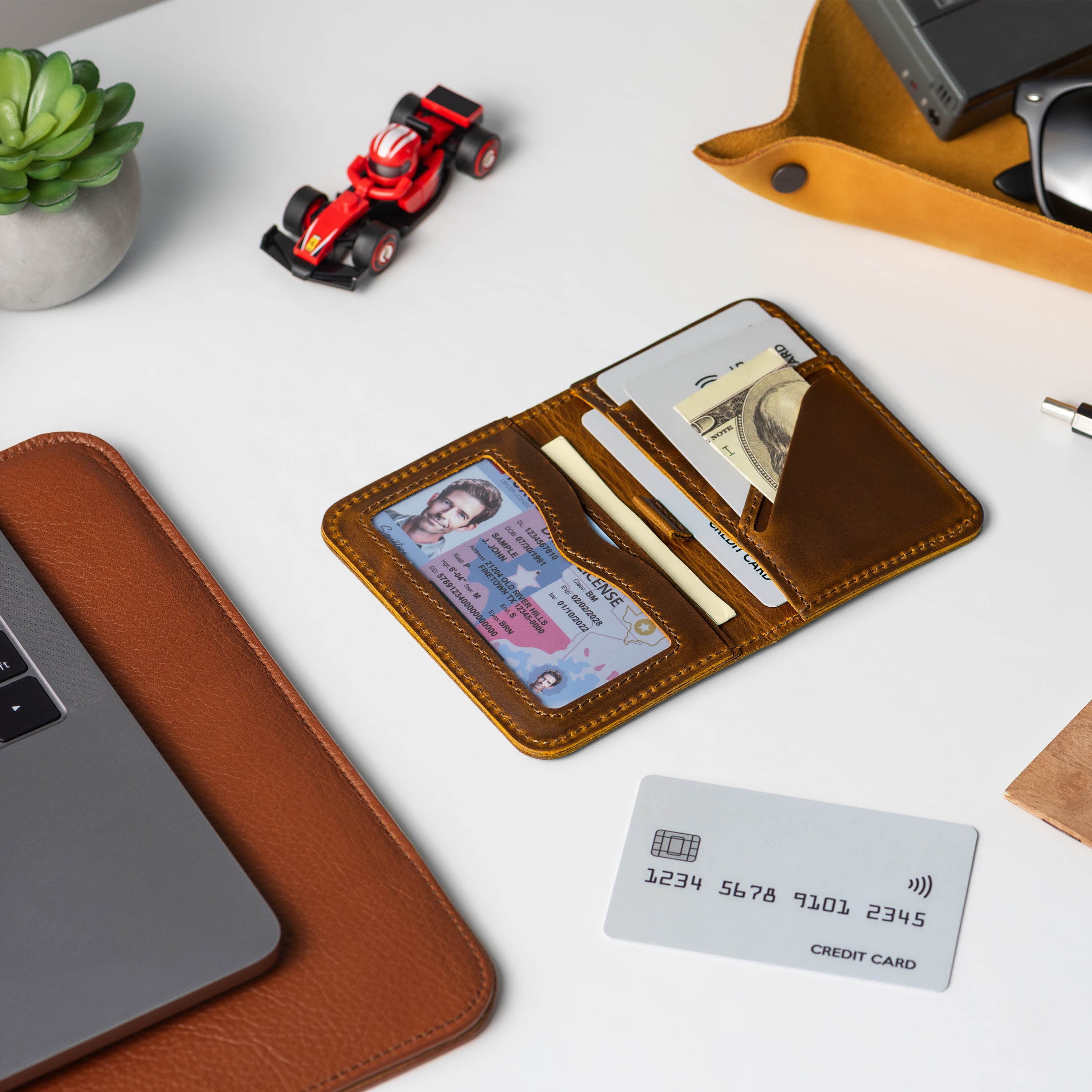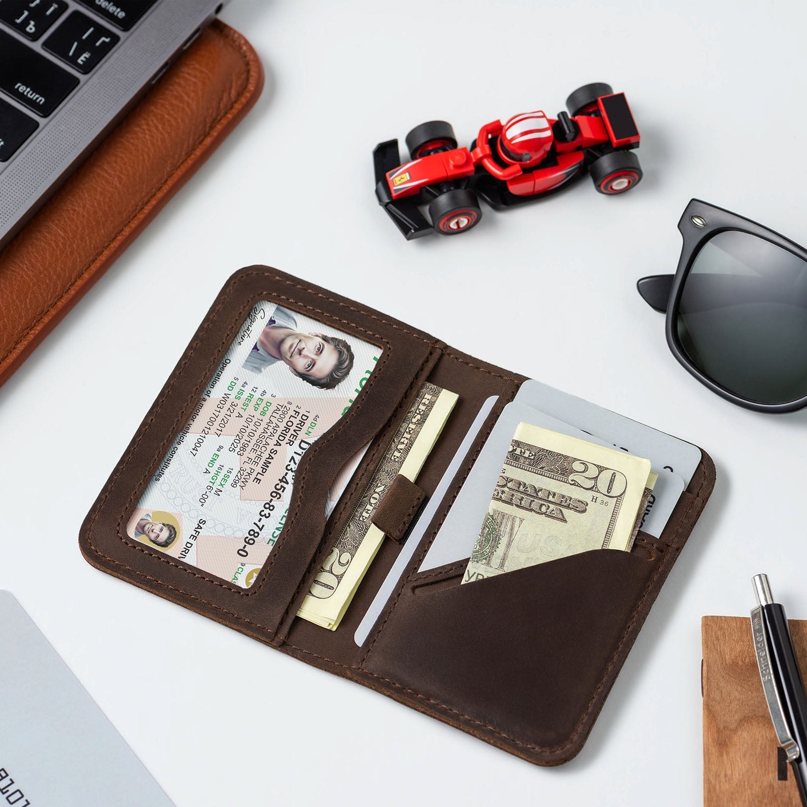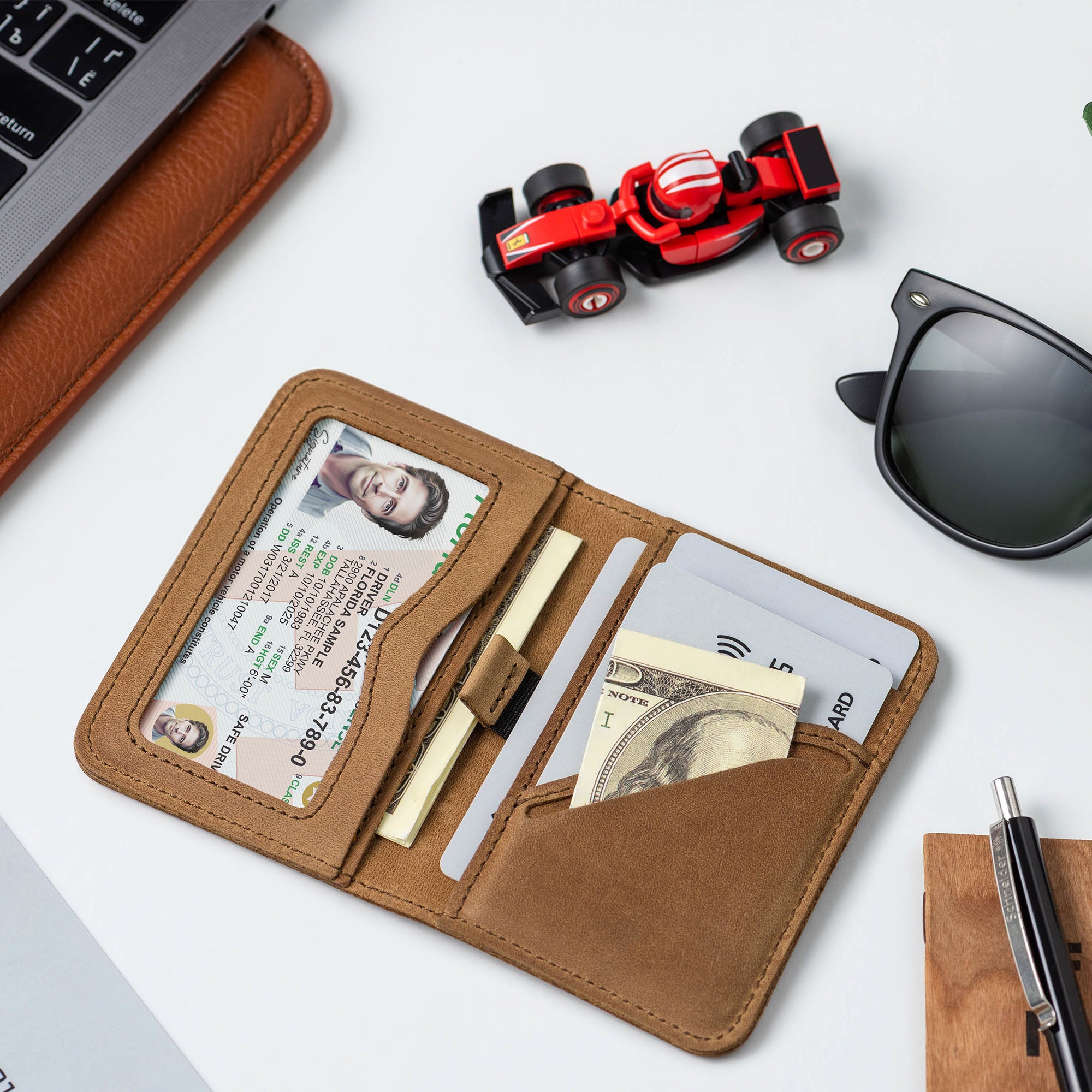 This slim RFID leather wallet is designed to carry just what you need – cards, ID, and emergency cash – without unnecessary bulk. Built-in RFID protection helps safeguard your personal and financial data from unauthorized scanning, making it a reliable everyday choice.