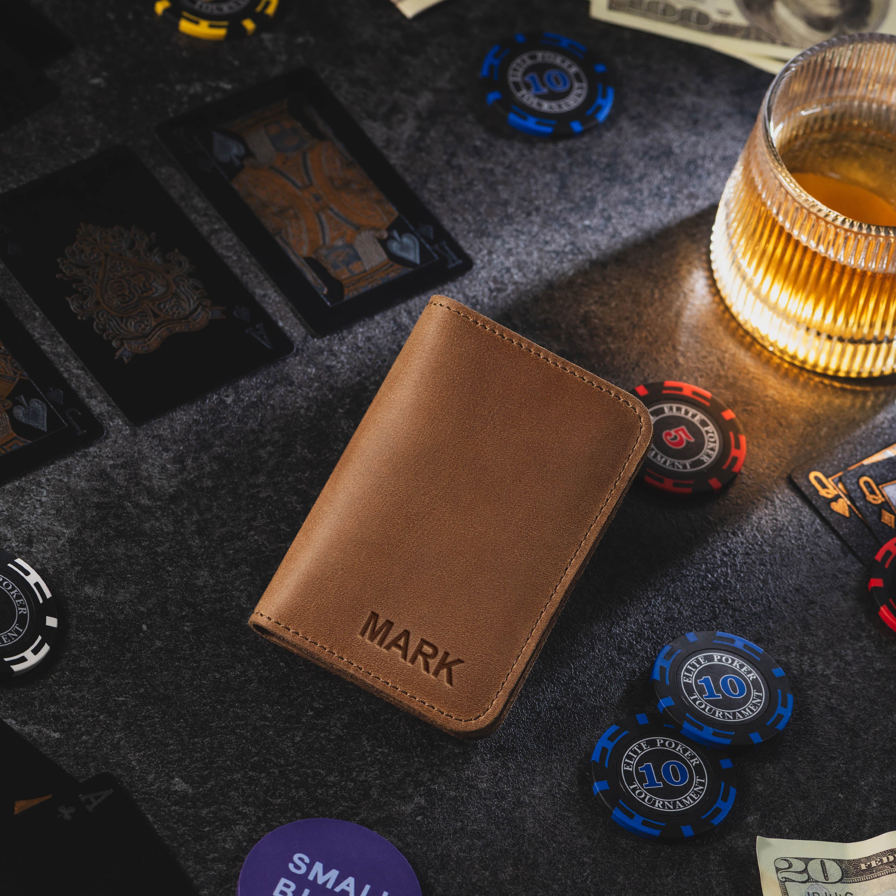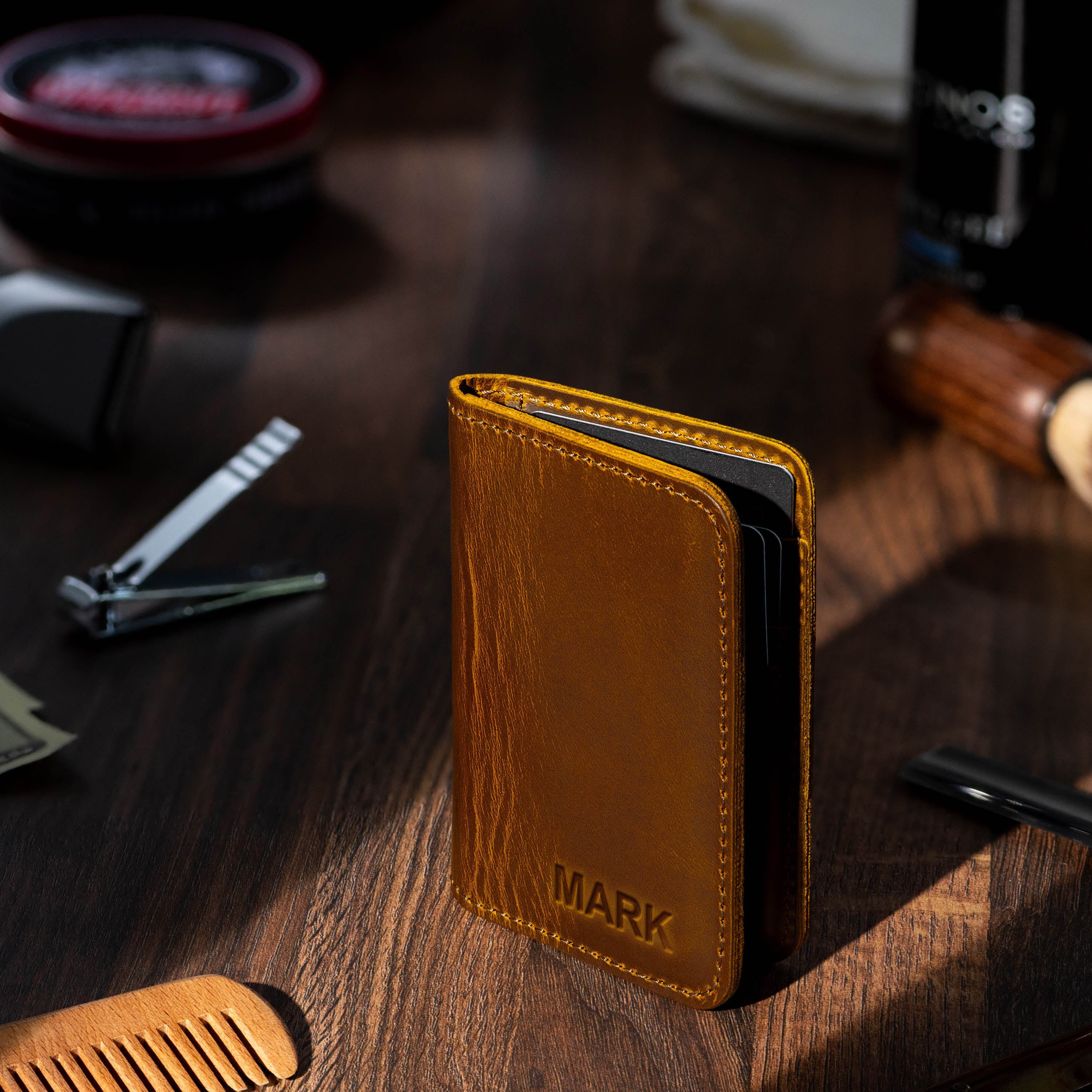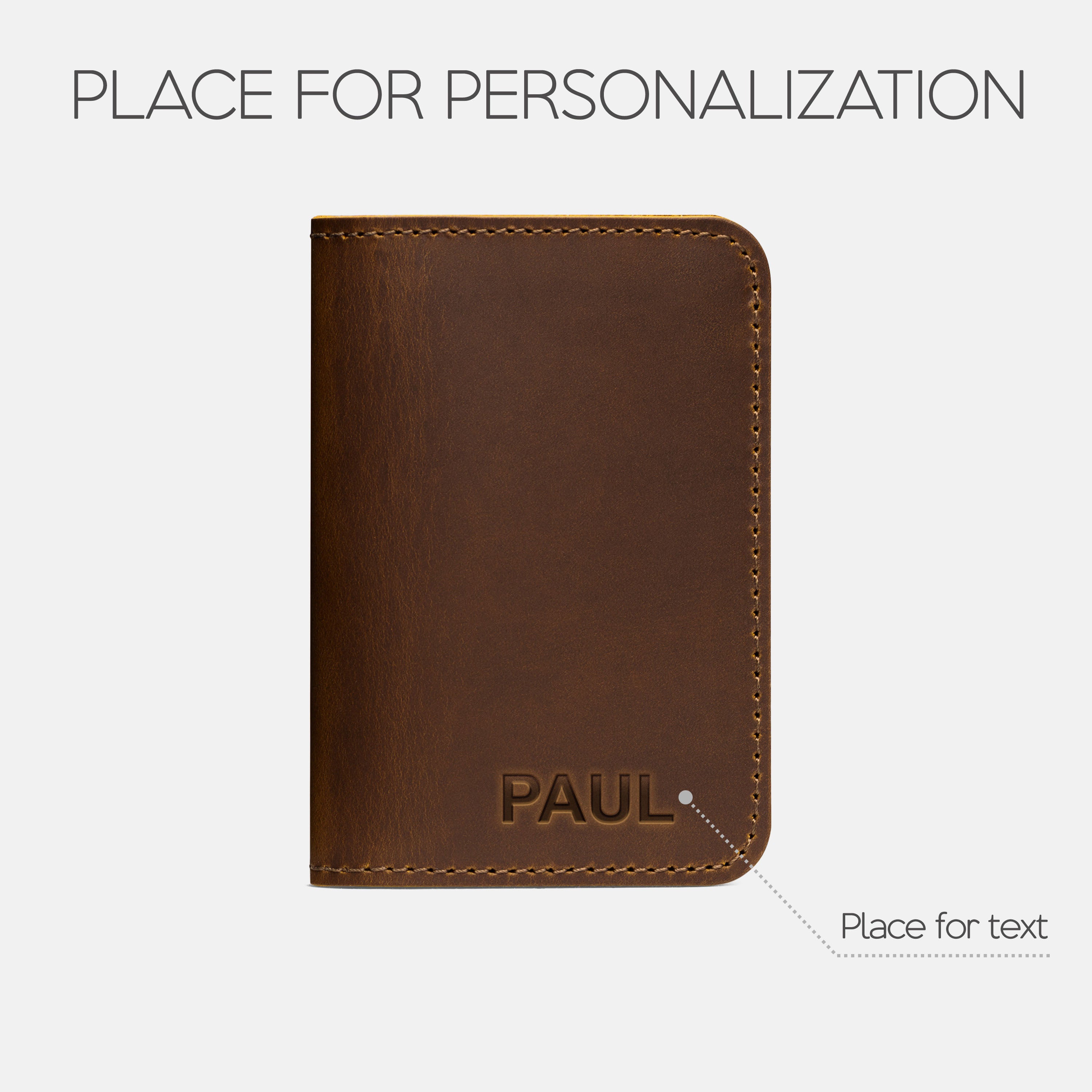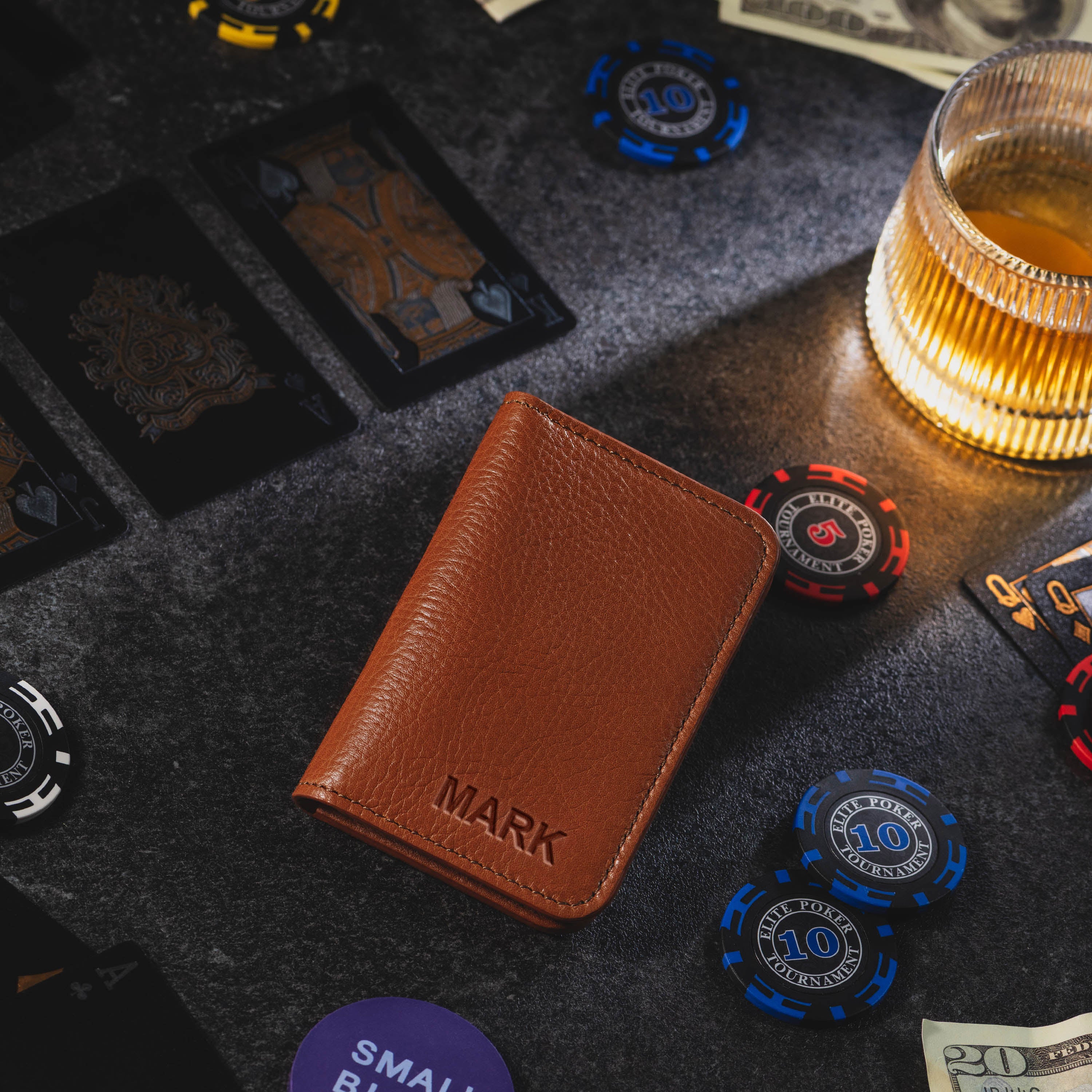 Its minimalist profile sits comfortably in a front pocket, even when seated, and allows easy access in busy environments. A pull-tab design helps organize cards efficiently, keeping frequently used cards within quick reach. Crafted from smooth yet durable leather and finished with subtle debossed personalization, it’s a practical everyday wallet and a thoughtful keepsake.