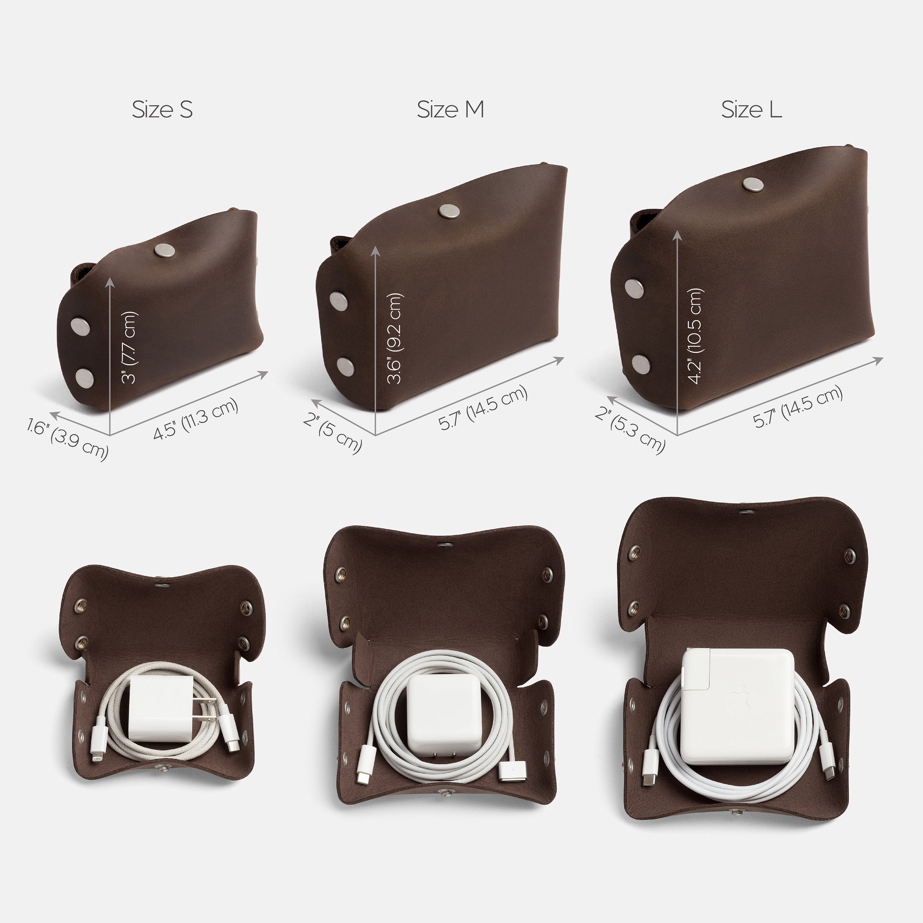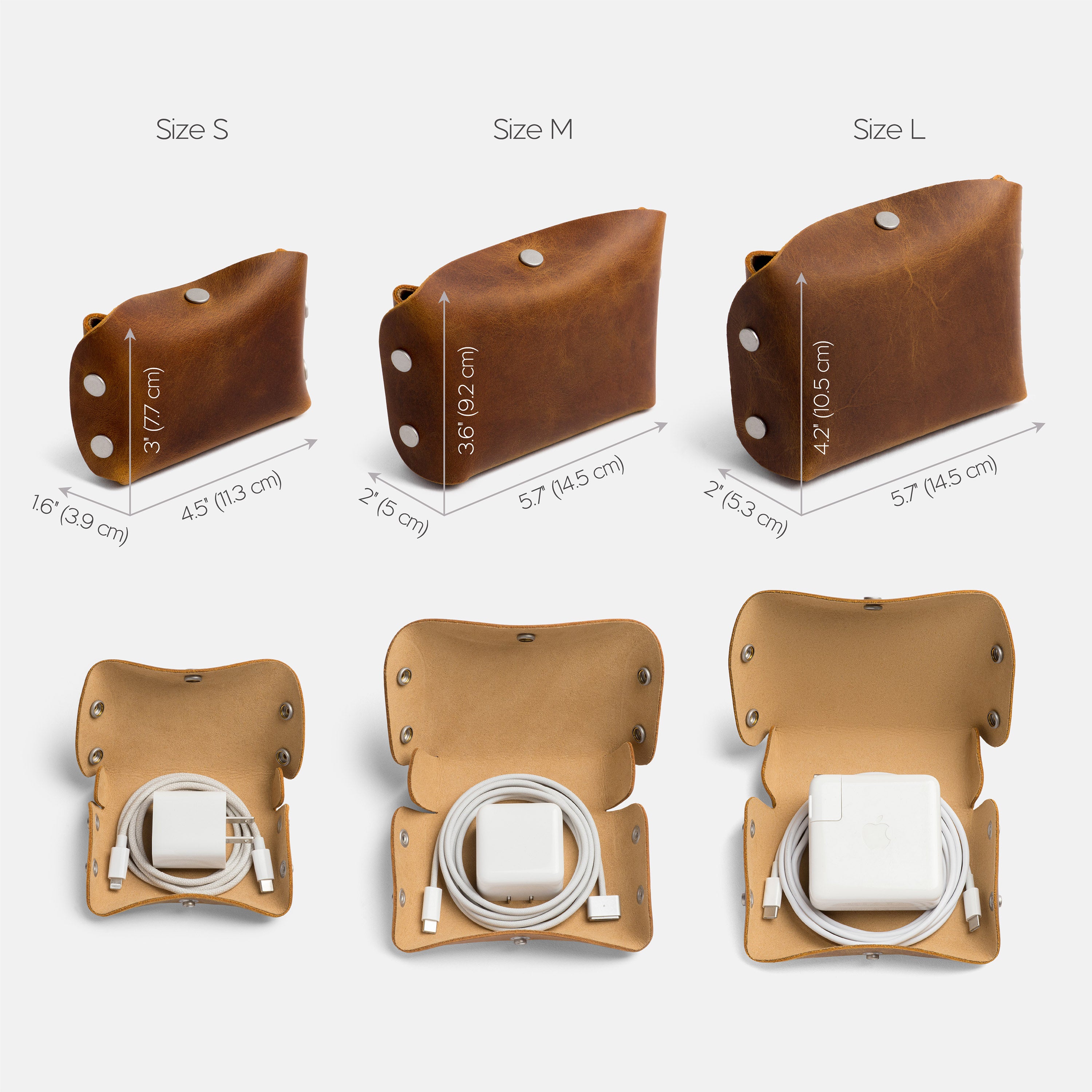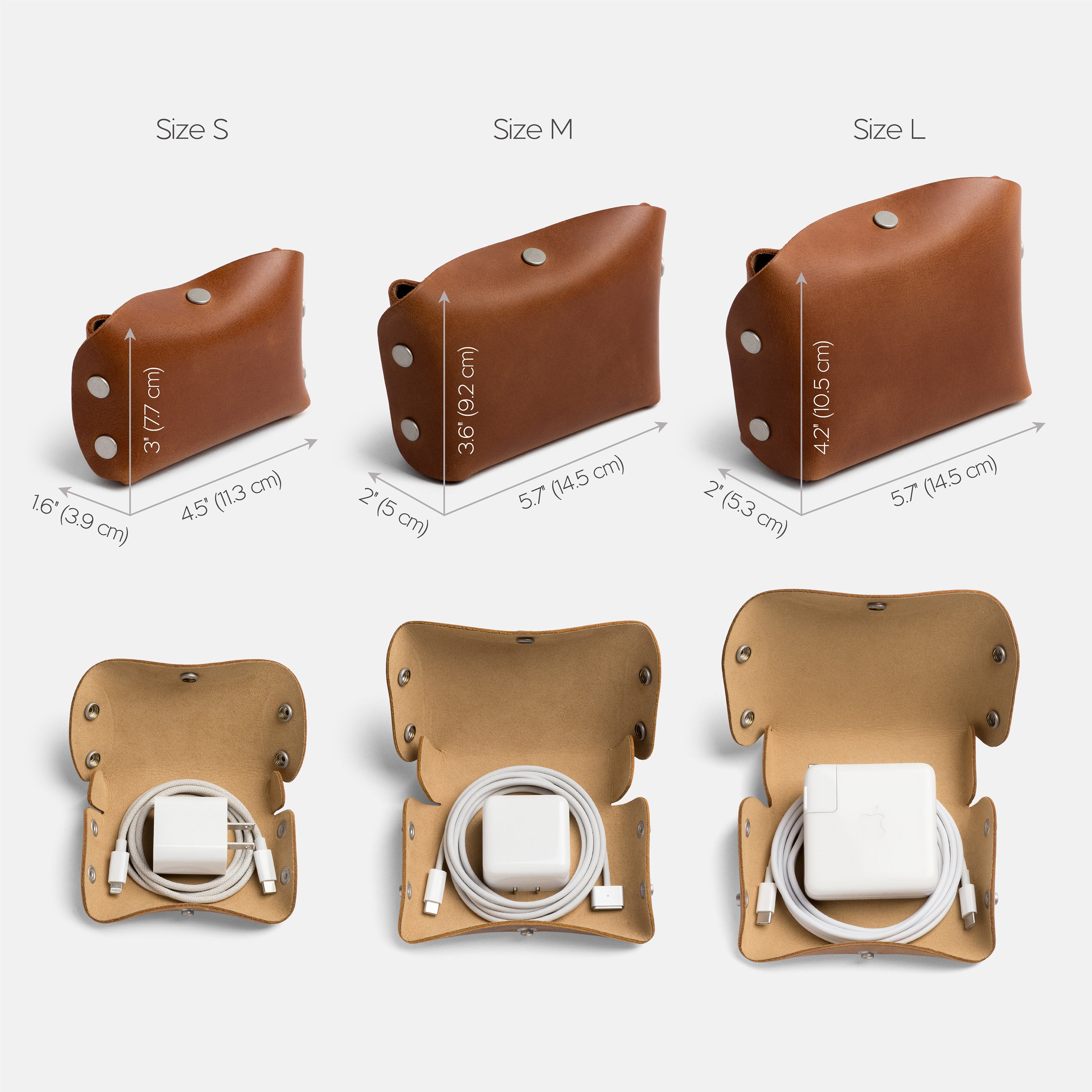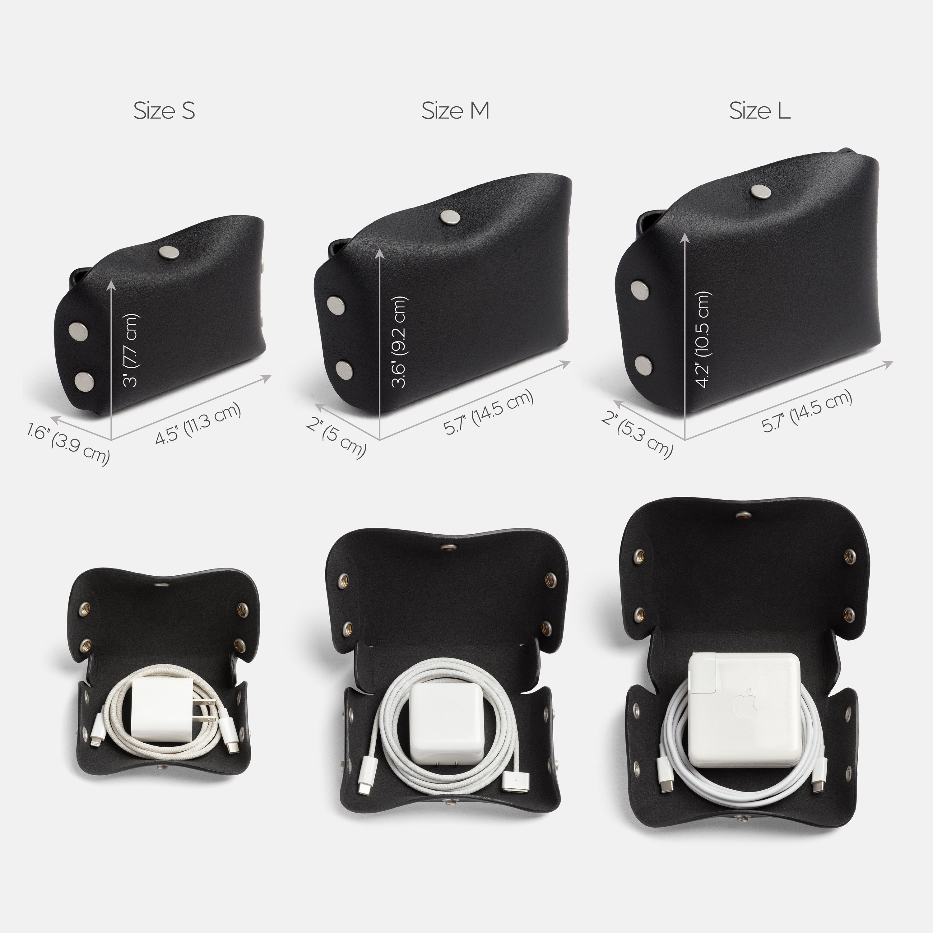 Size S: 4.5”W x 3”H x 1.6”D (11.3 x 7.7 x 3.9 cm). Fits power adapter (max. 20 W) and a rolled cord.