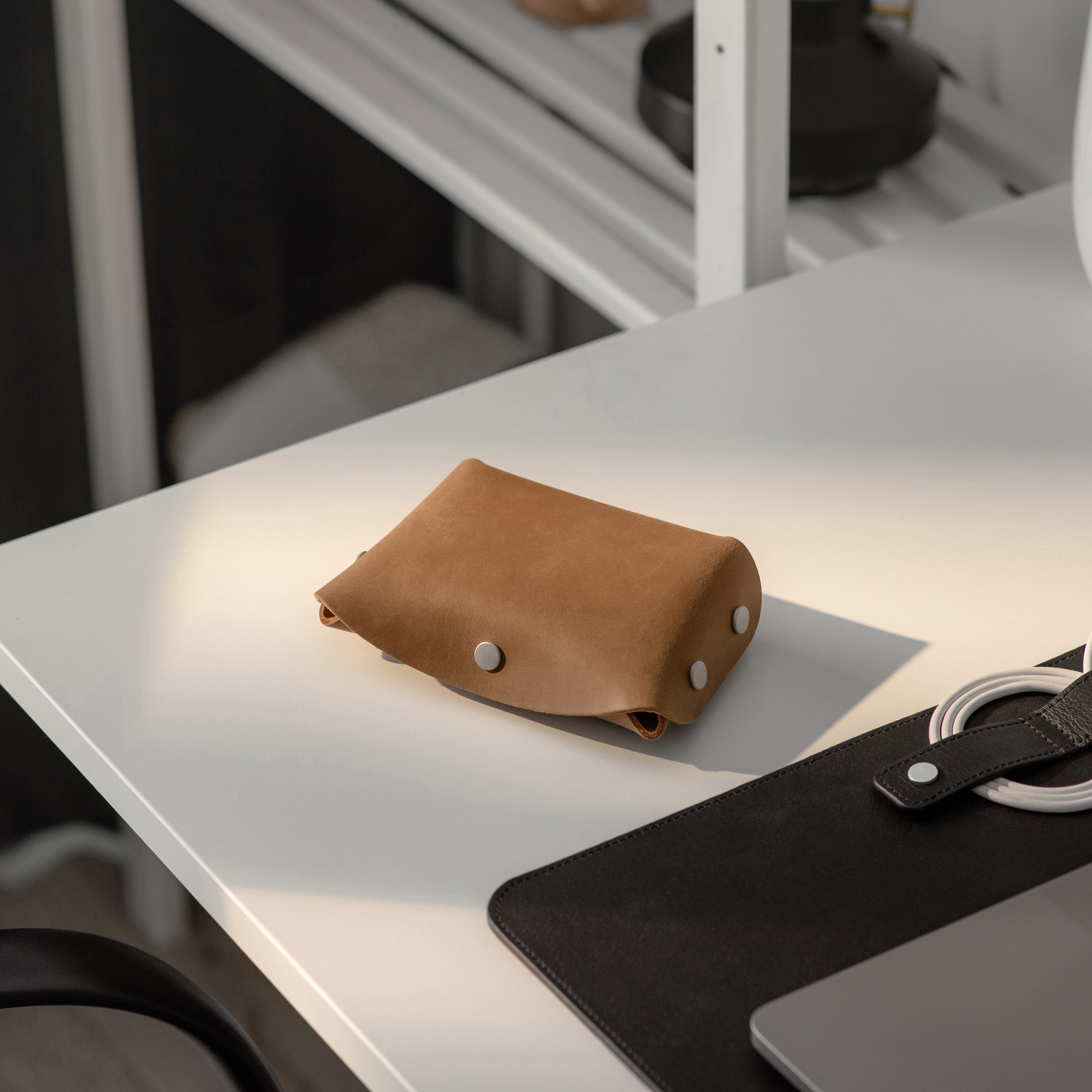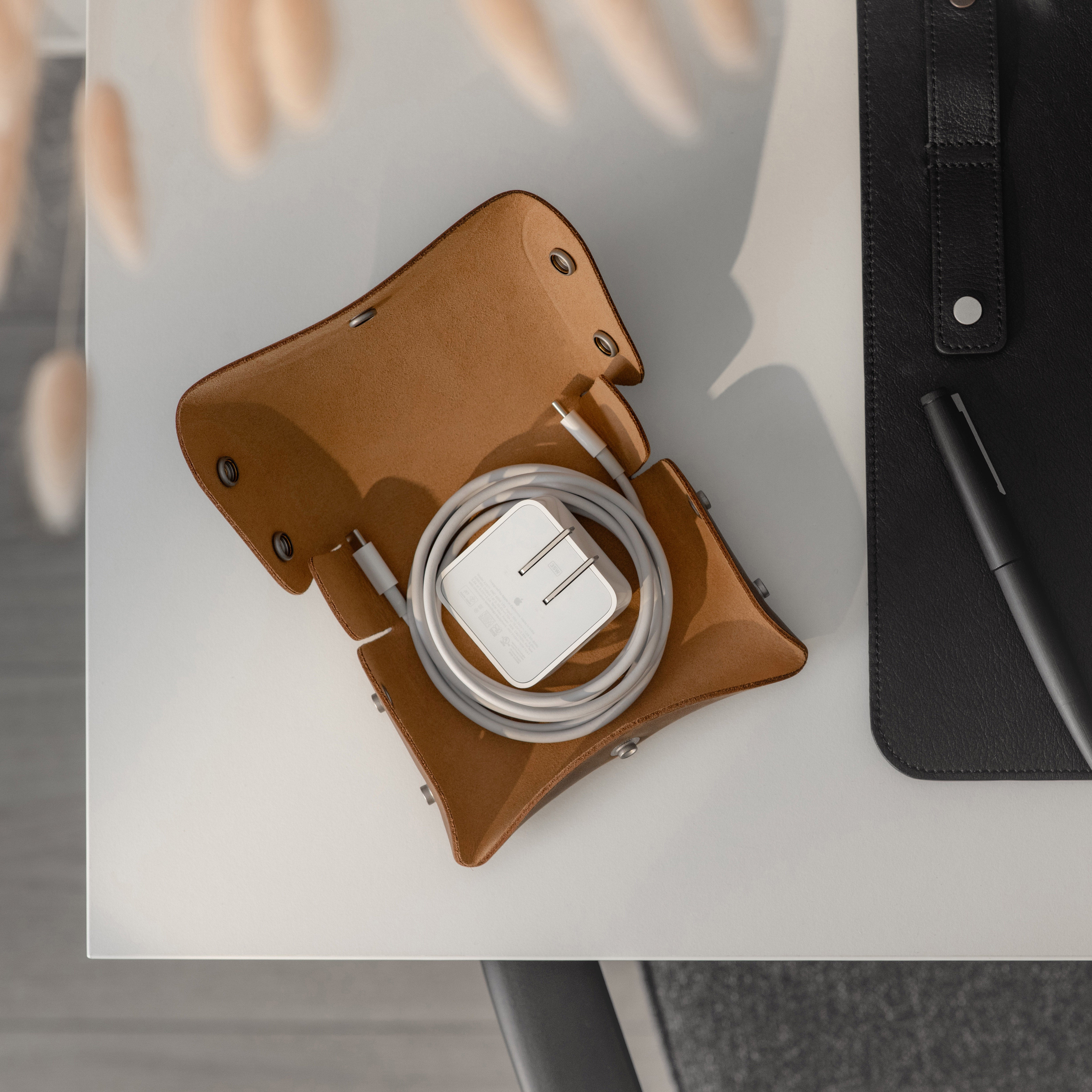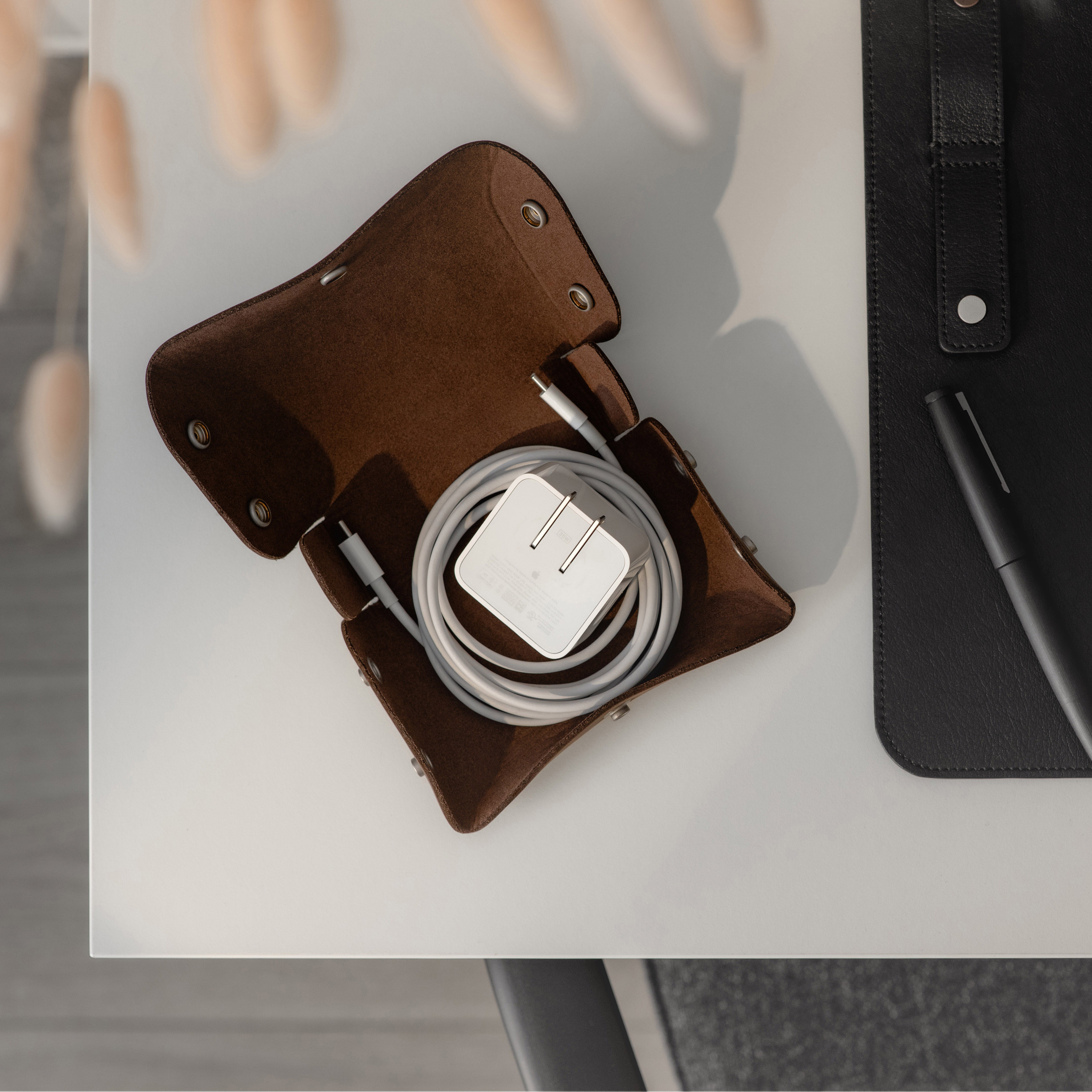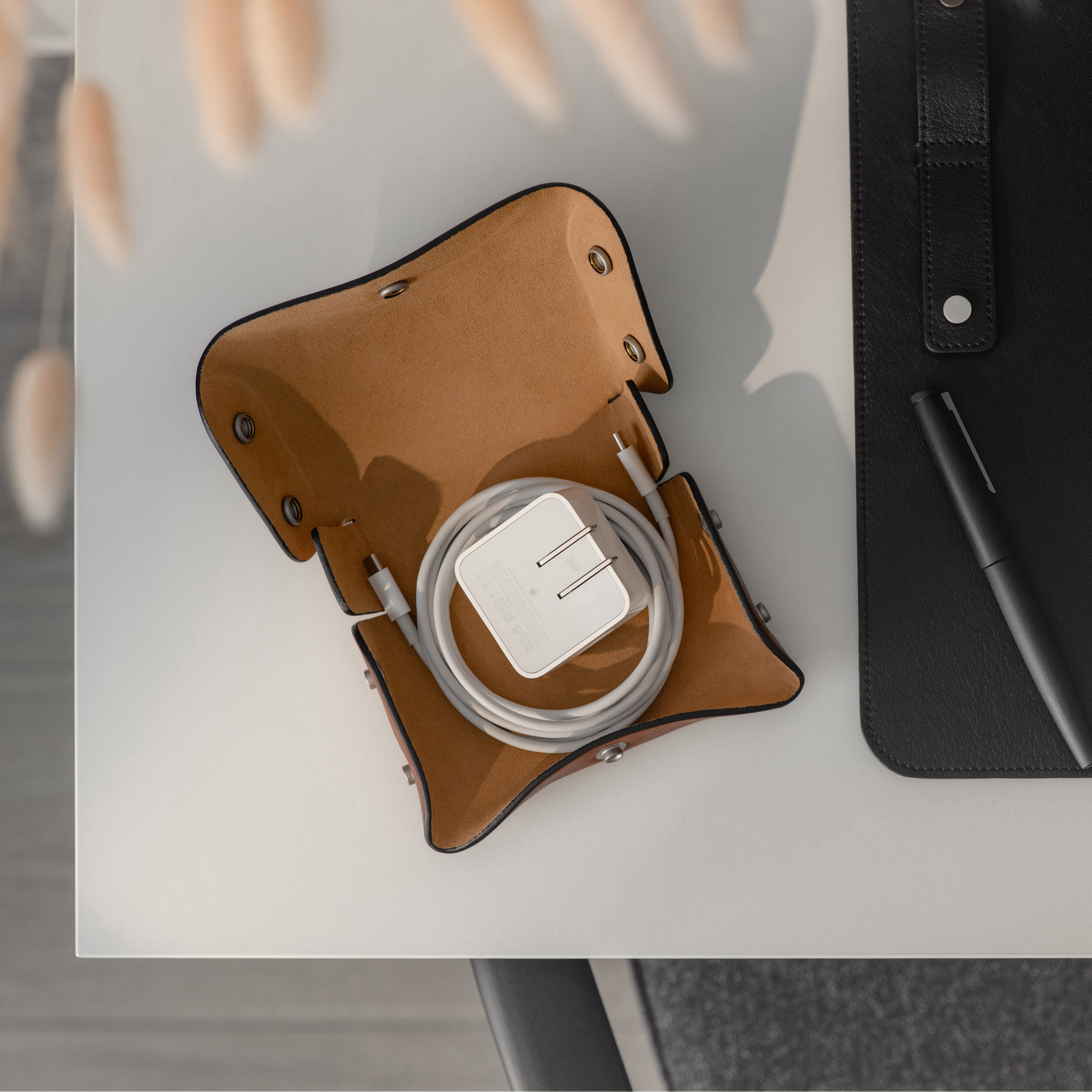 Designed for Apple chargers and cables, this compact leather tech case offers practical protection for your essentials. The fully unsnapping design allows easy access to contents, while the soft microfiber lining keeps devices scratch-free, making it a reliable companion for travel and daily use.