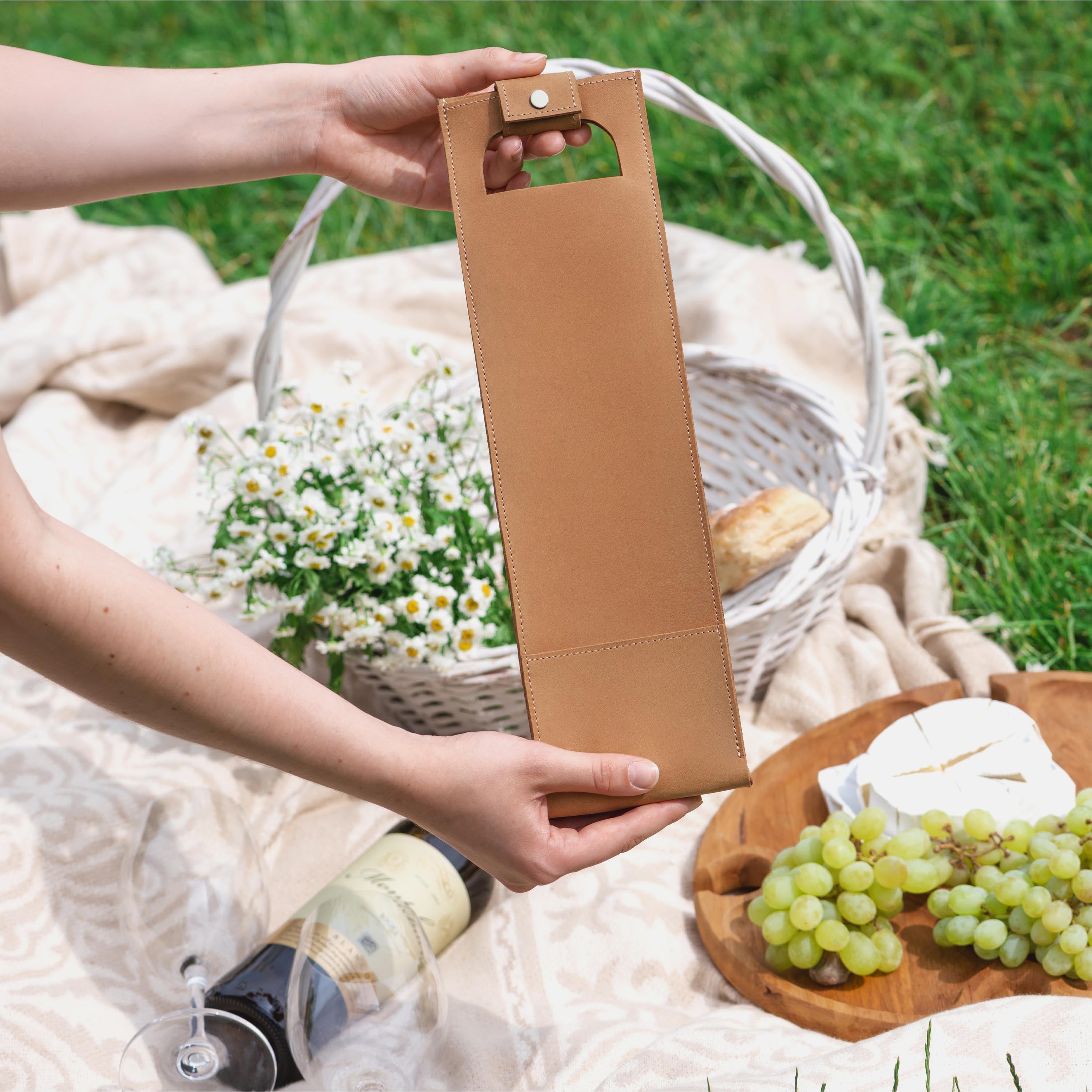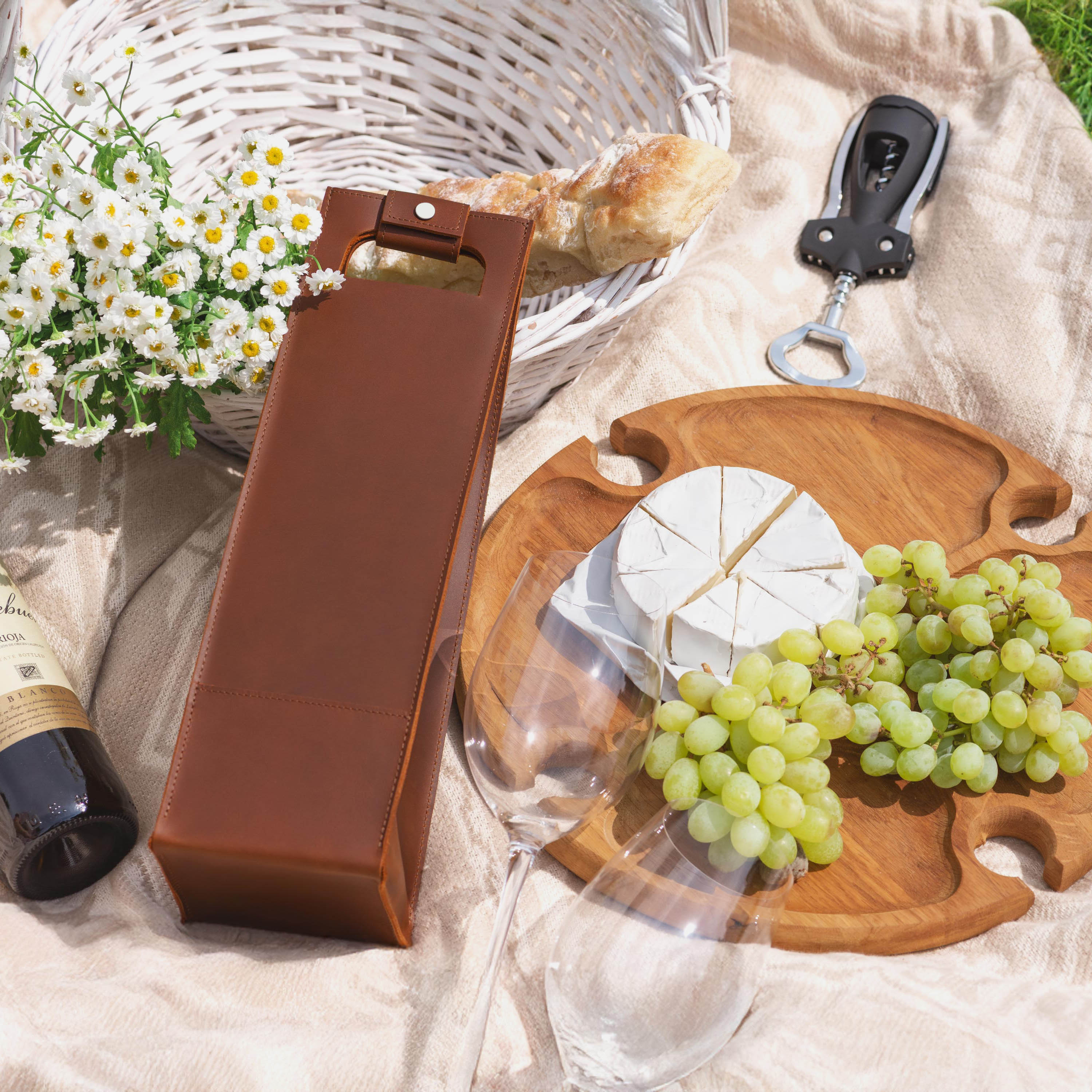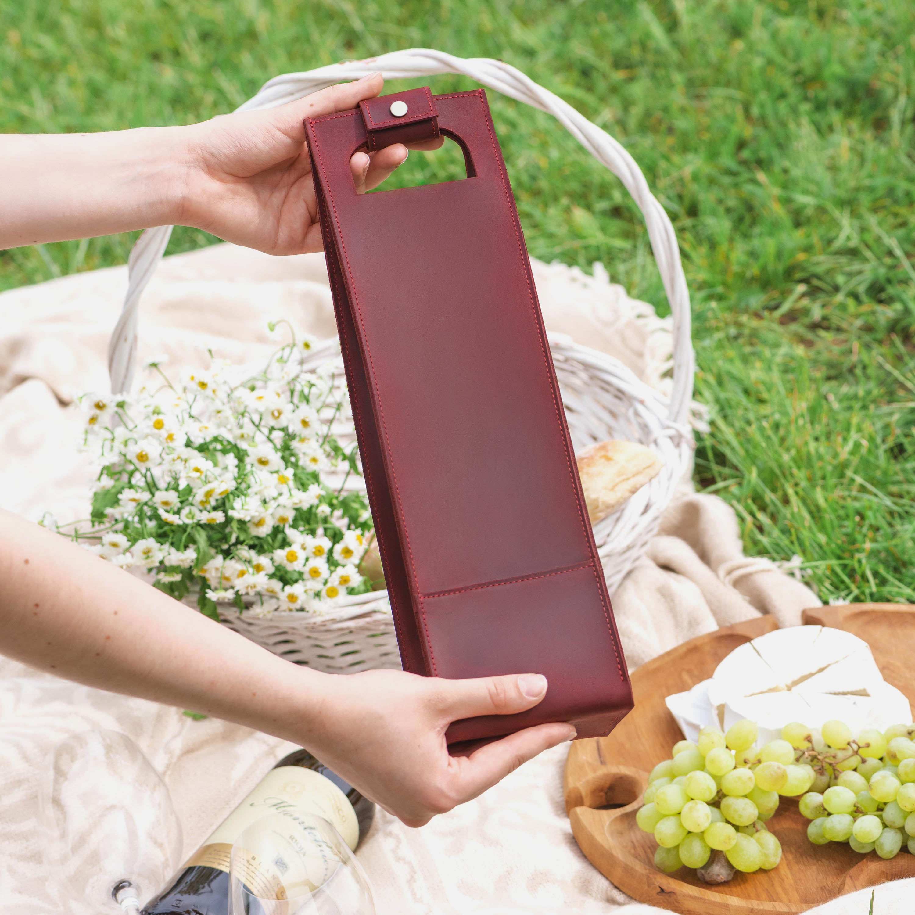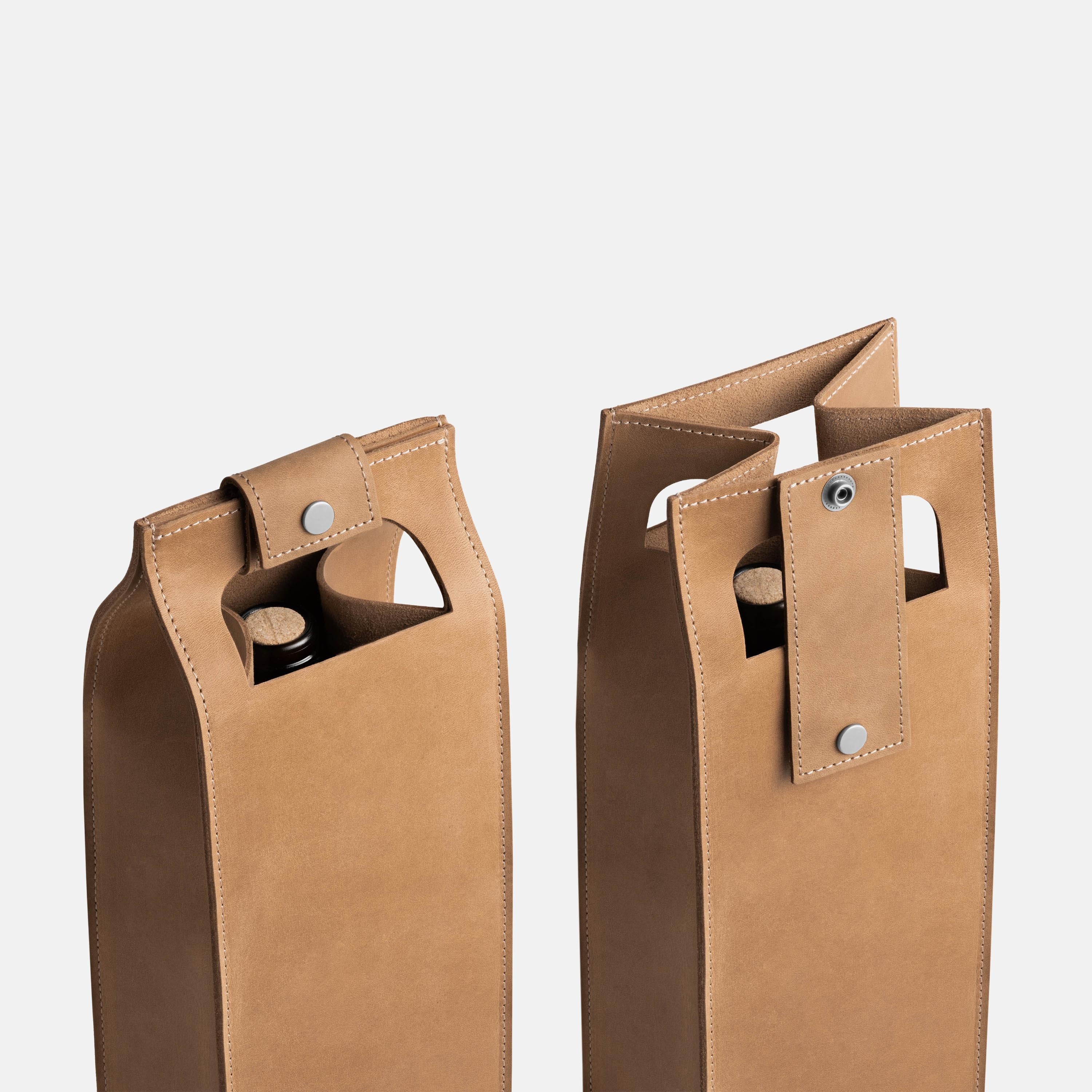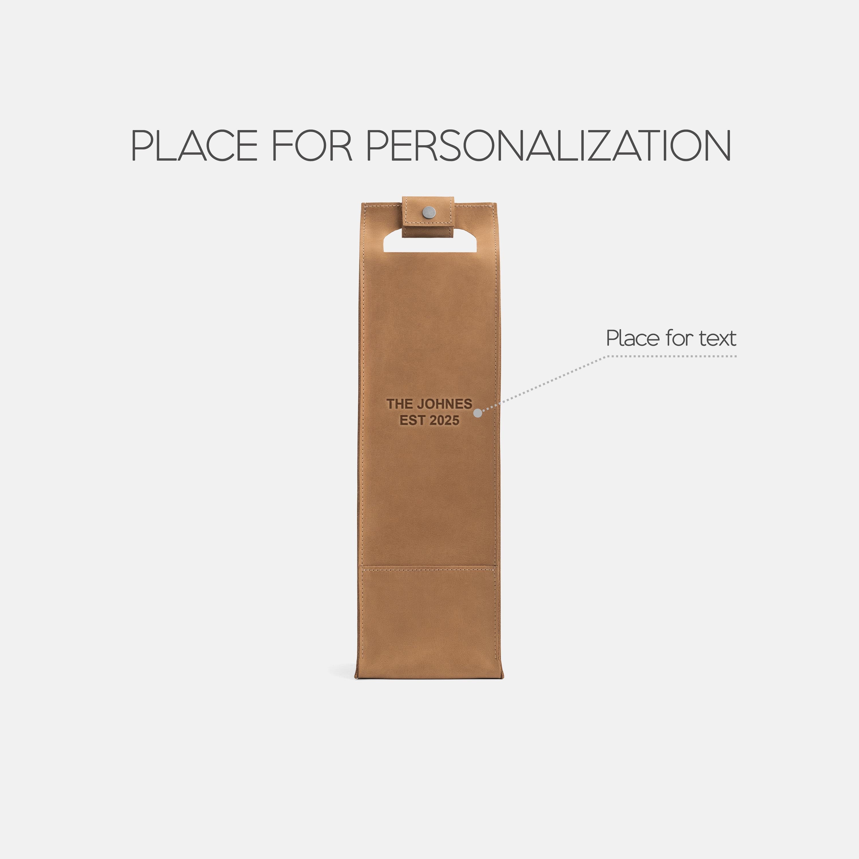 A good bottle deserves more than a paper bag. Made from soft Italian leather with a smooth finish, this leather wine holder designed to carry a single bottle with ease and style. The reinforced base adds support, while the snapped handle offers a comfortable grip. Whether you're heading to a dinner party, planning a romantic picnic, or looking for a unique holiday, wedding, or corporate gift – this wine tote adds a personal, lasting touch.