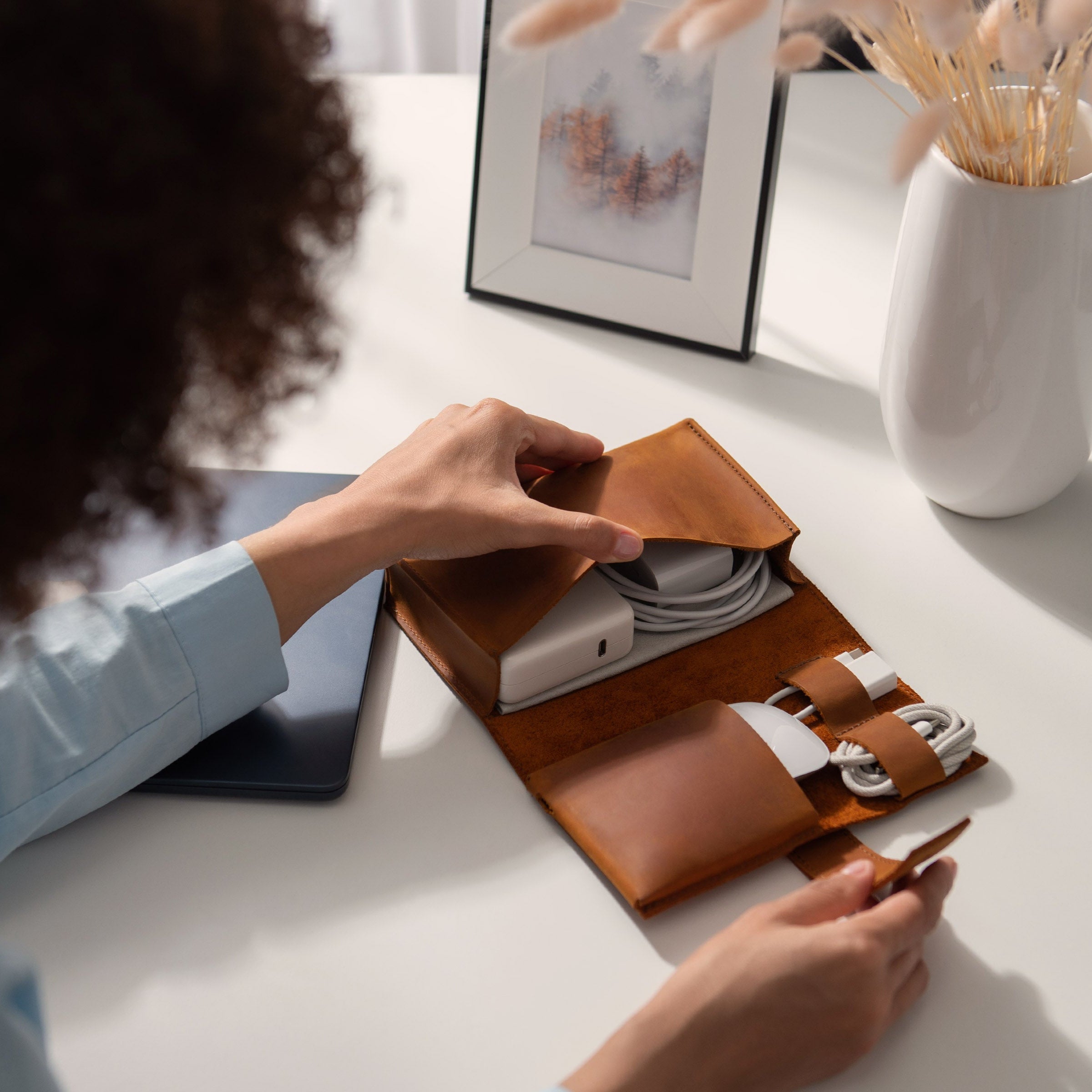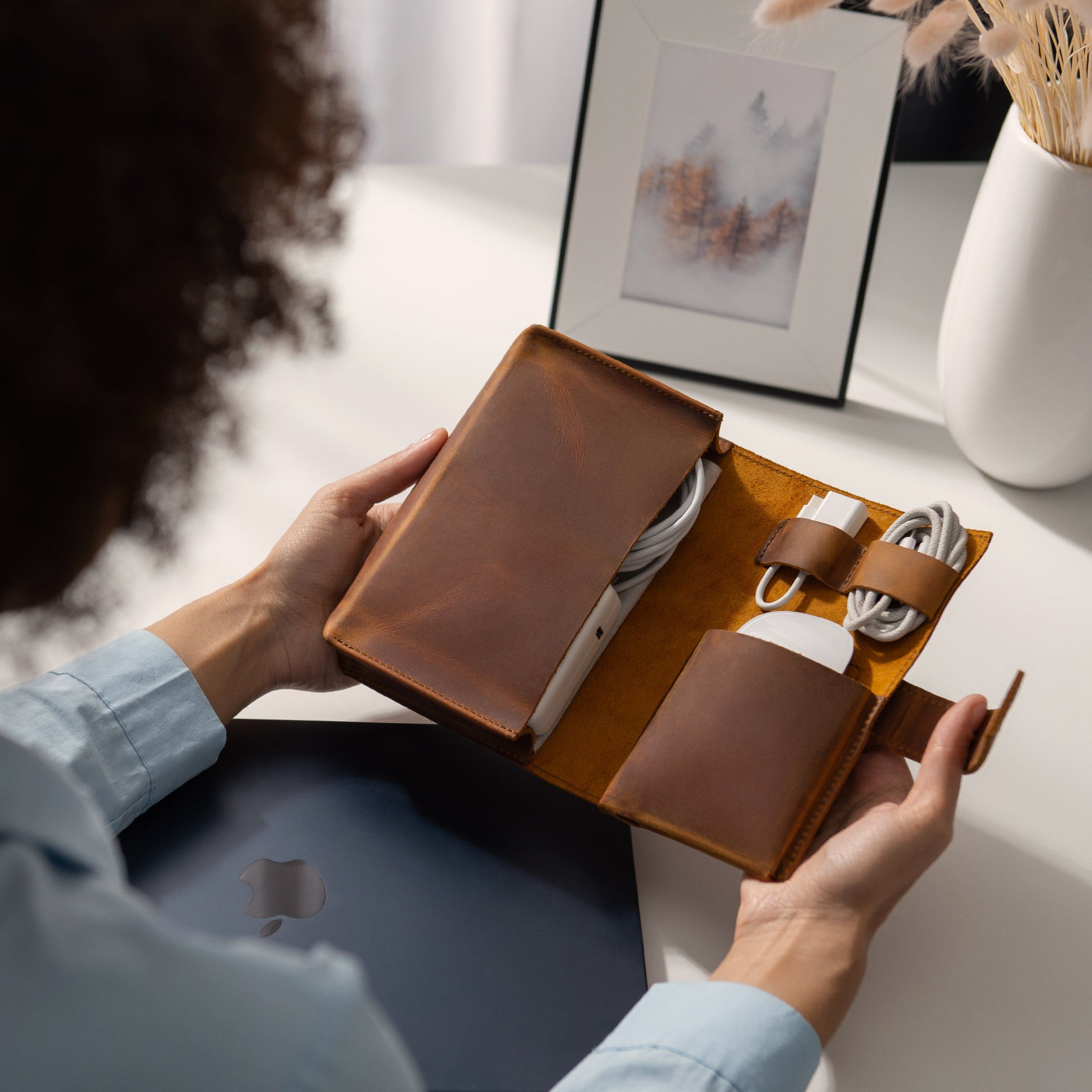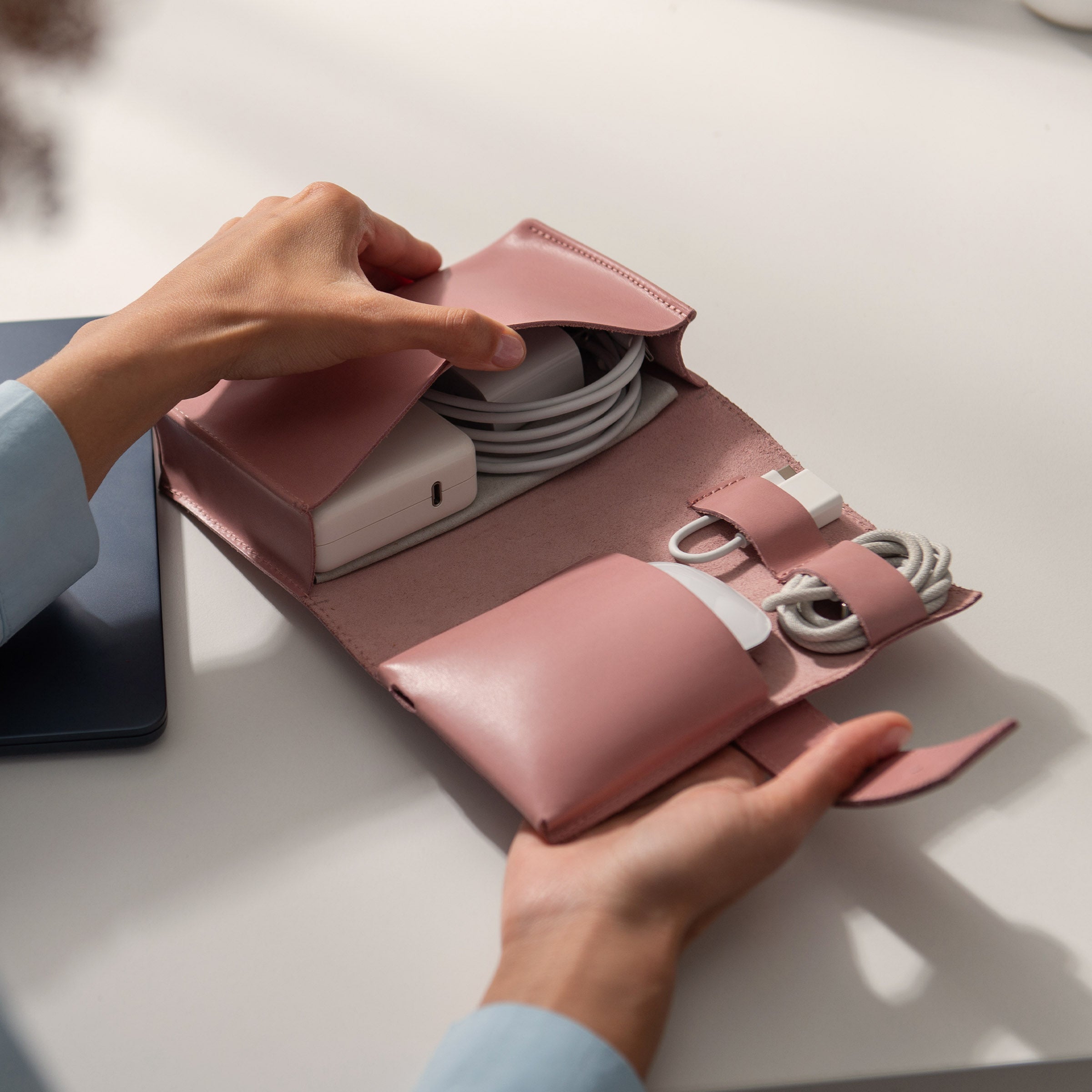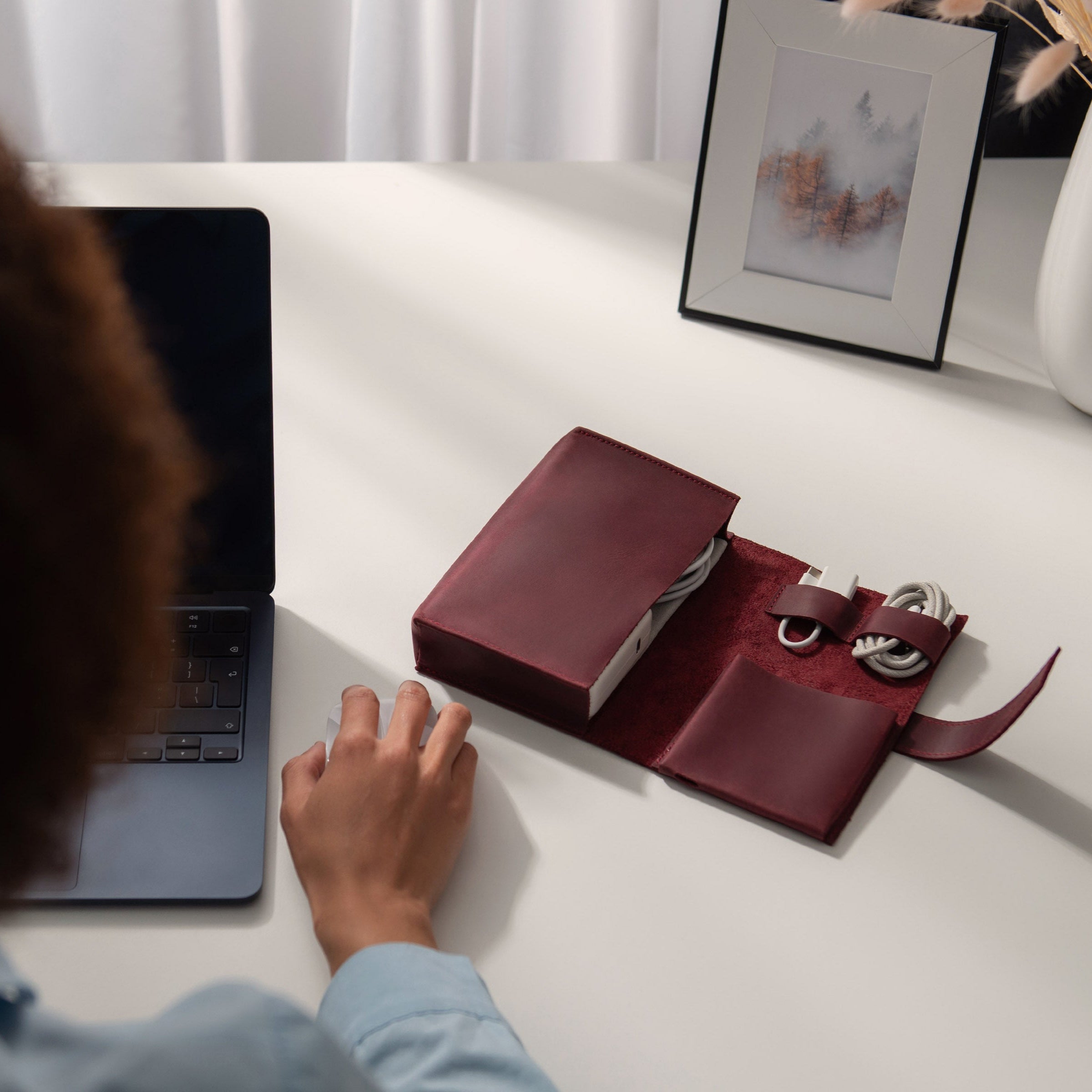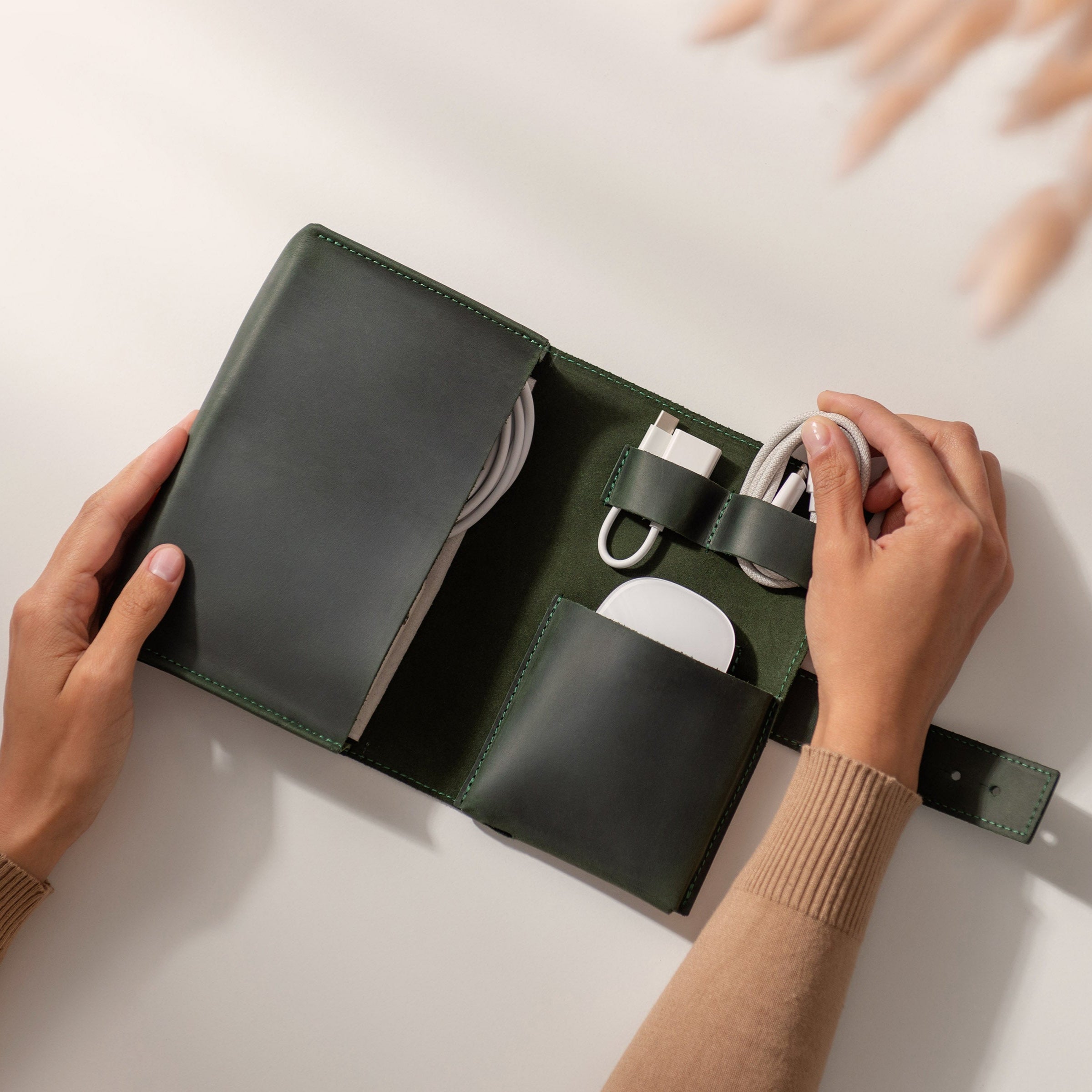 Keep your electronics organized with this compact leather tech organizer, crafted from quality leather for lasting durability. Designed to fit earphones, chargers, and other essentials, it features multi-sized slots to keep everything secure and tangle-free. Available in stylish colors with personalization options, it's a practical companion for travel or everyday use.