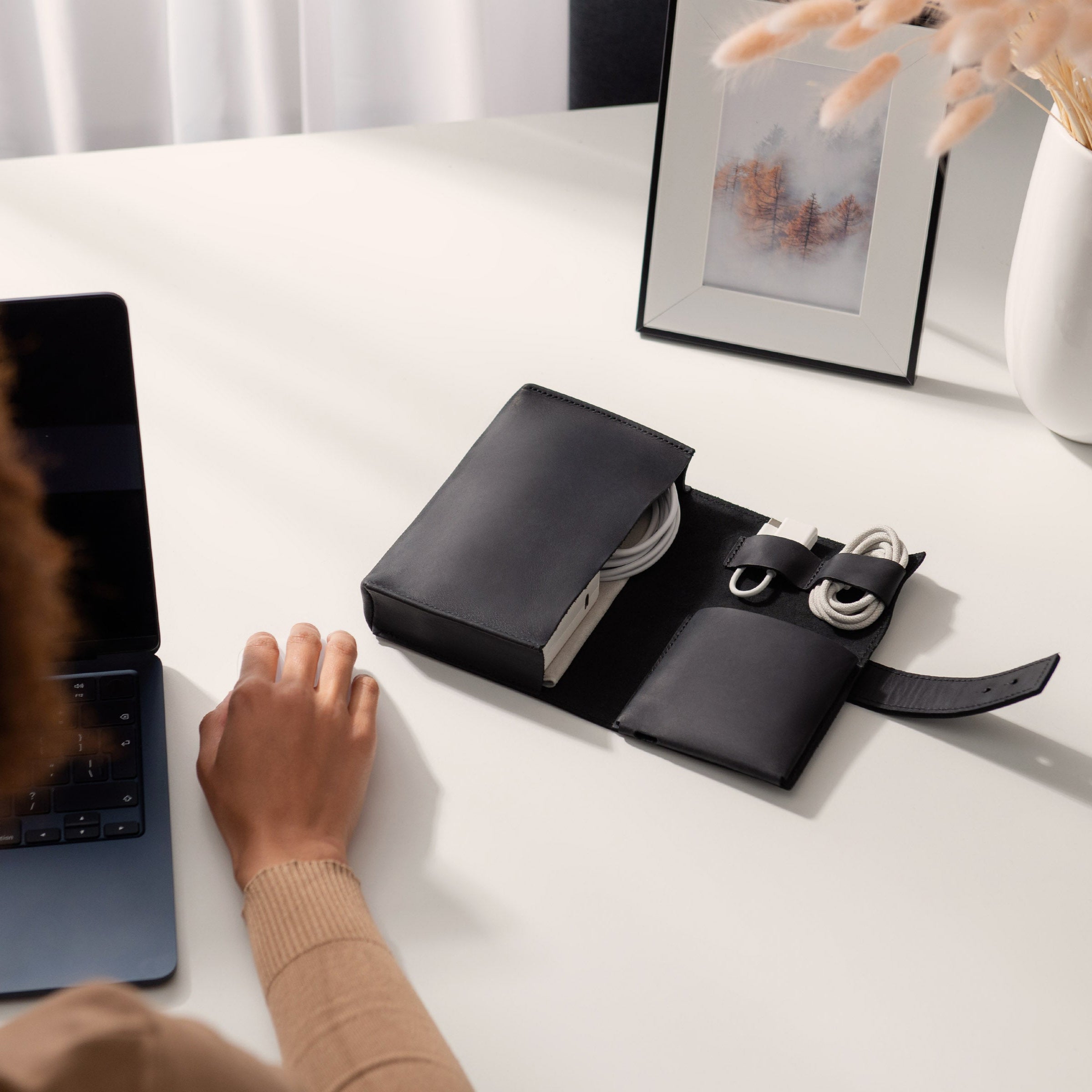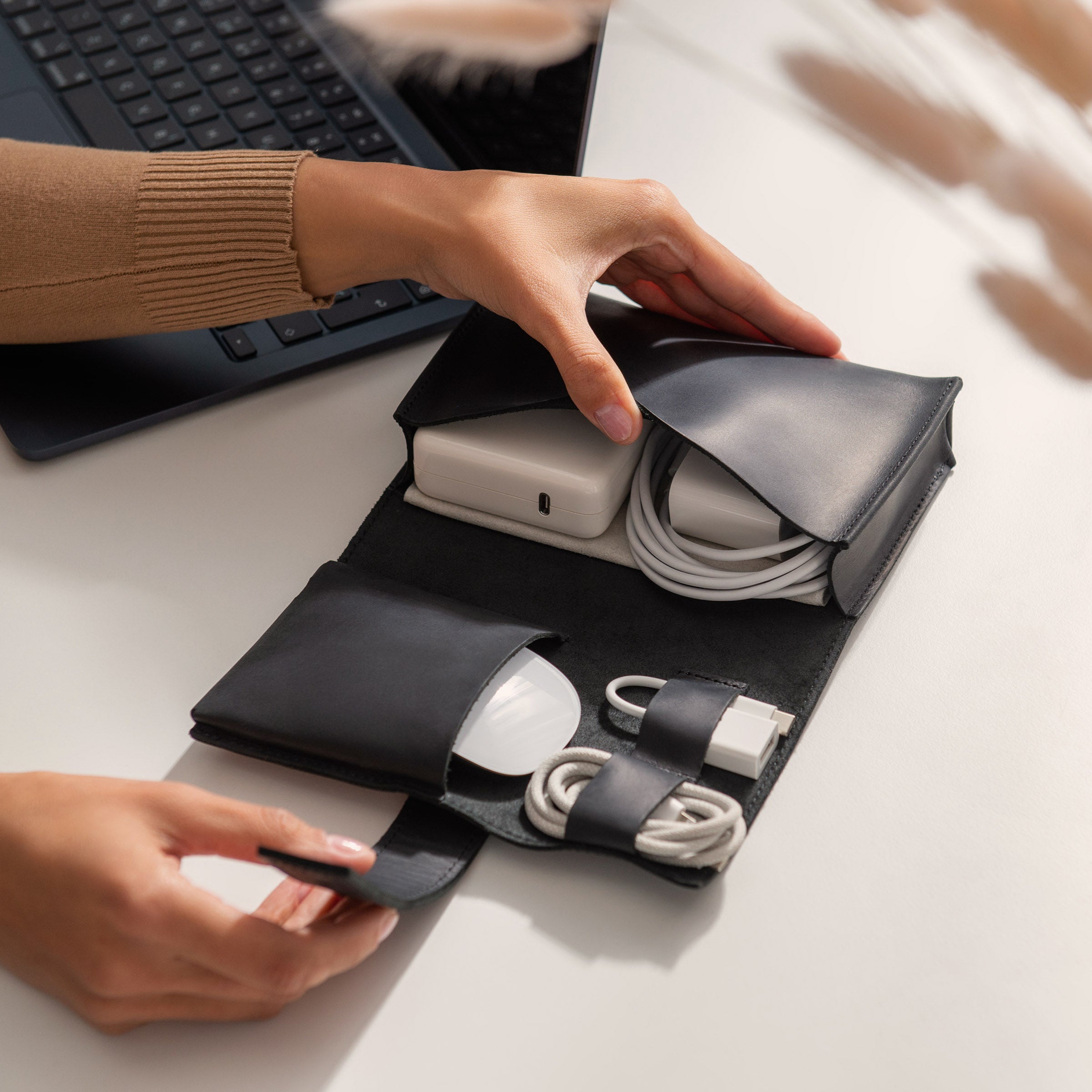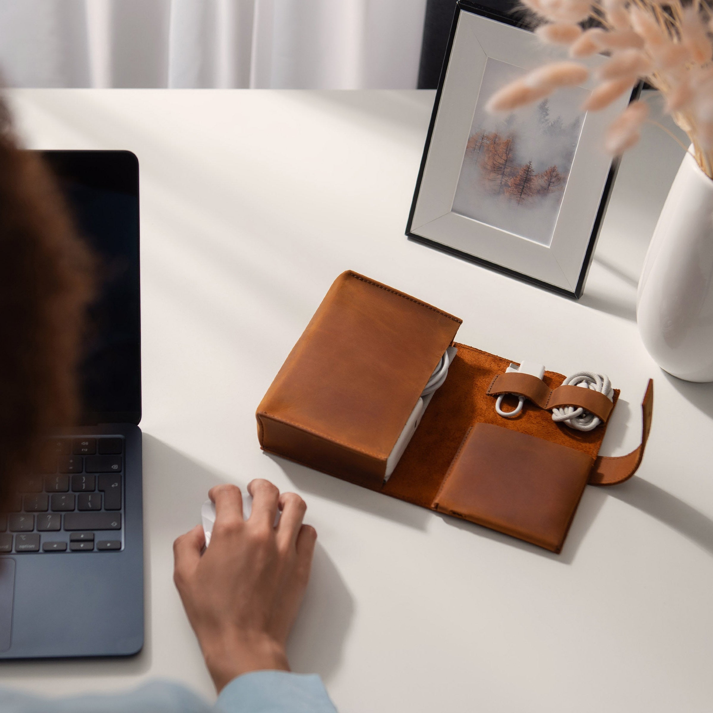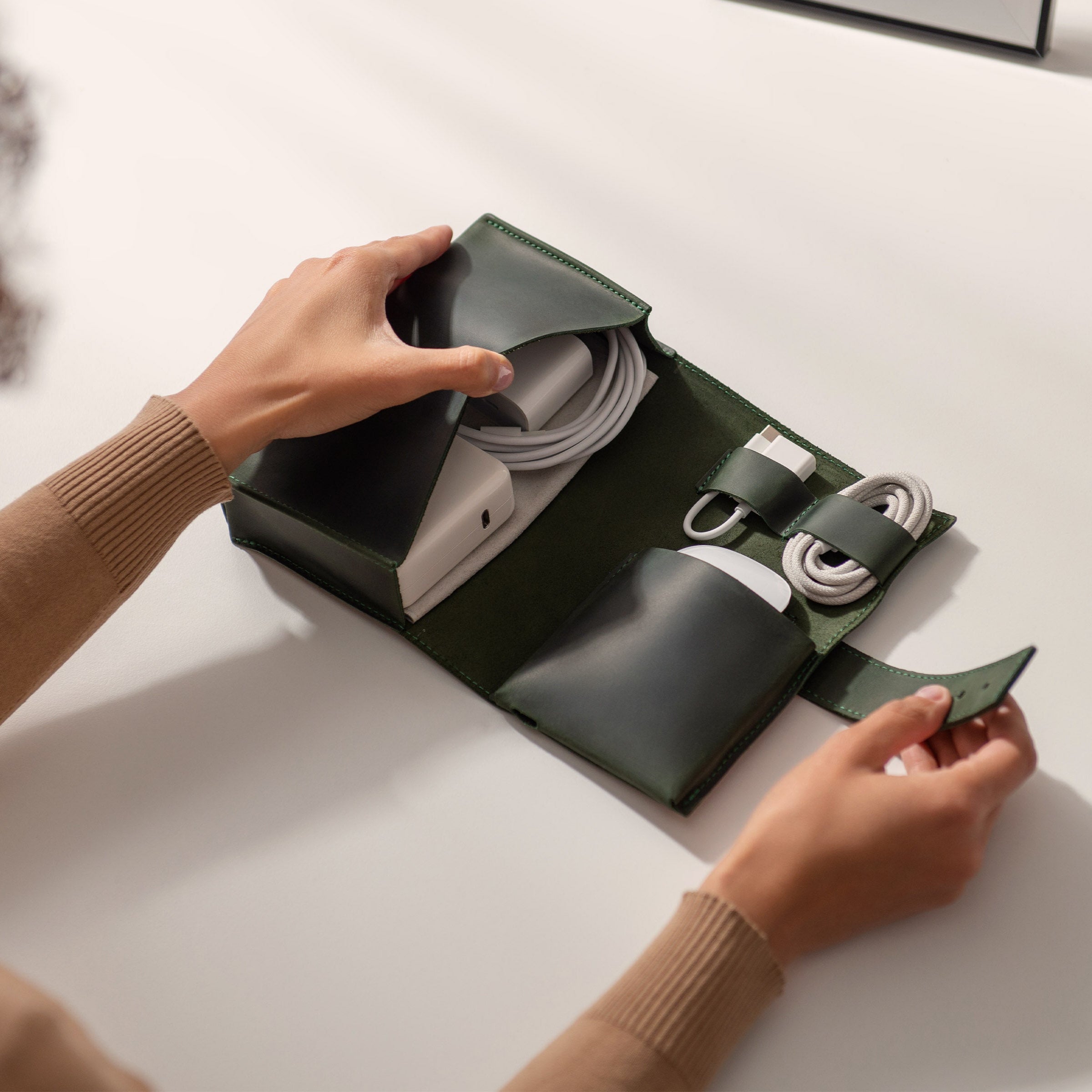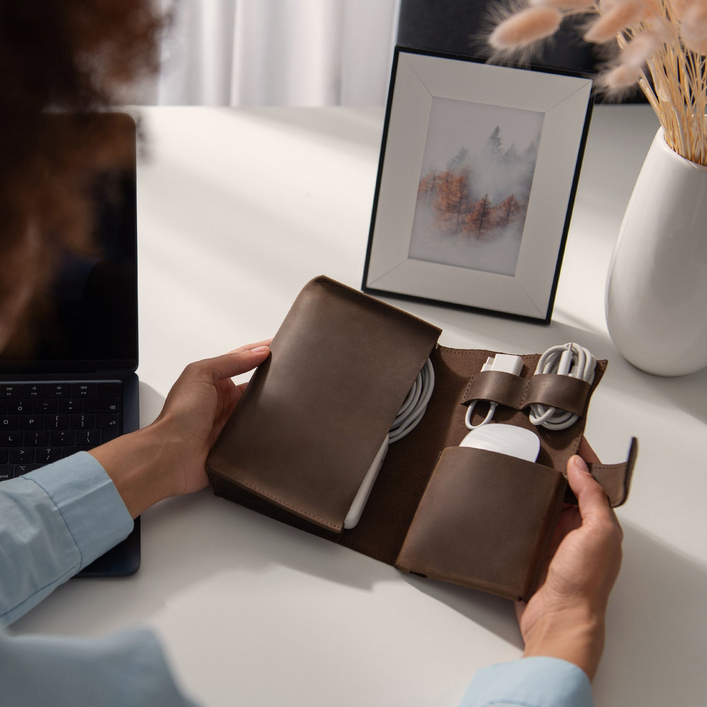 Keep your electronics organized with this compact leather tech organizer, crafted from quality leather for lasting durability. Designed to fit earphones, chargers, and other essentials, it features multi-sized slots to keep everything secure and tangle-free. Available in stylish colors with personalization options, it's a practical companion for travel or everyday use.