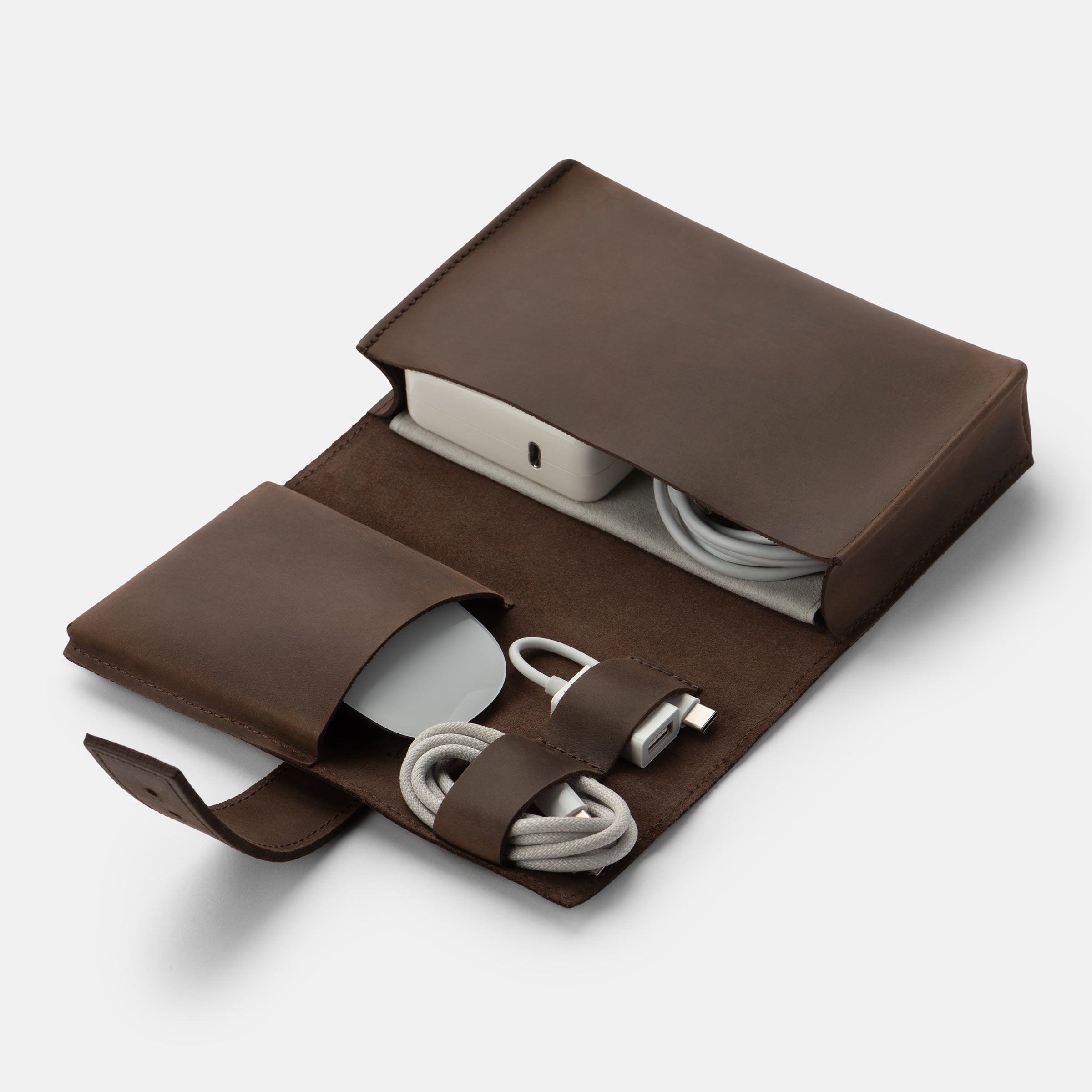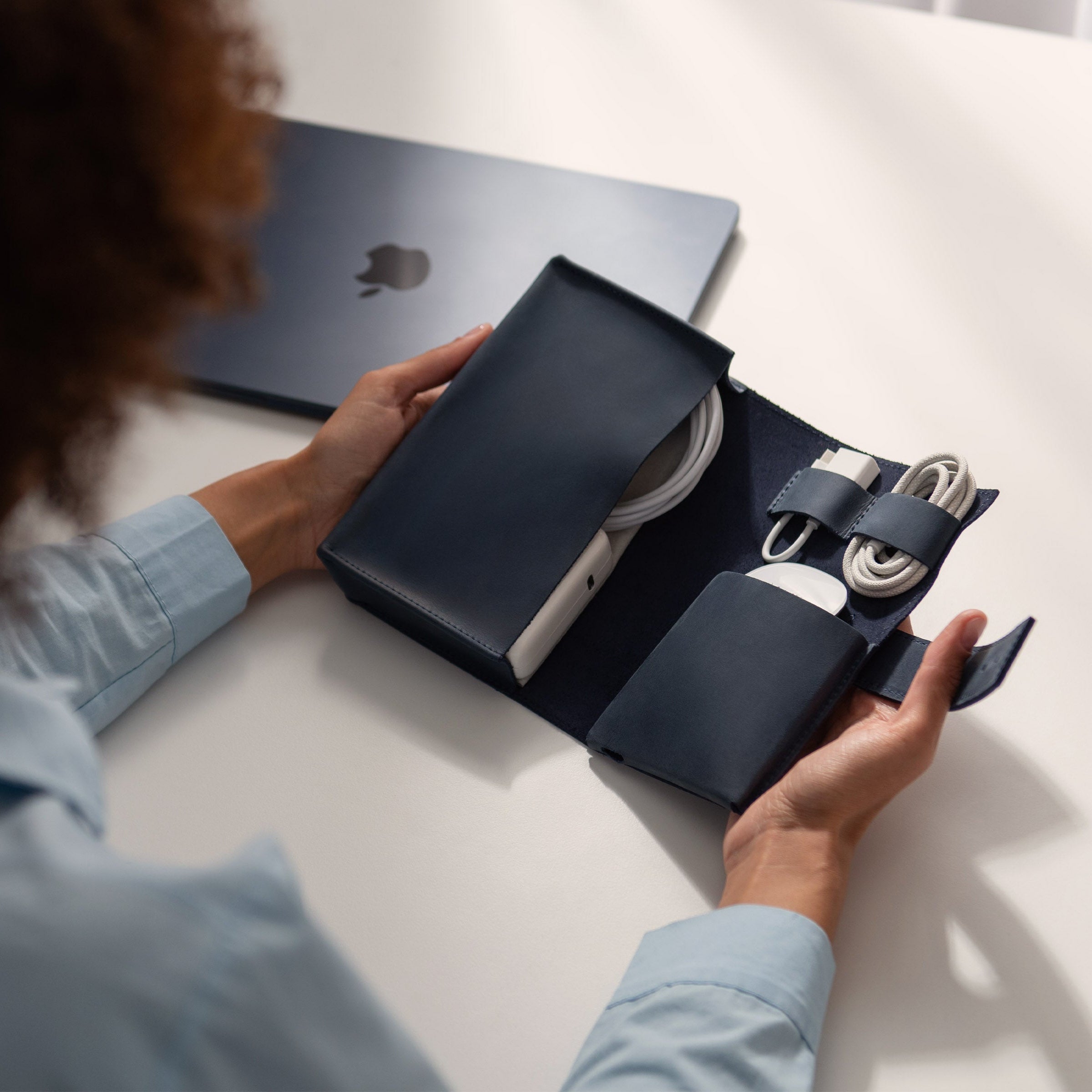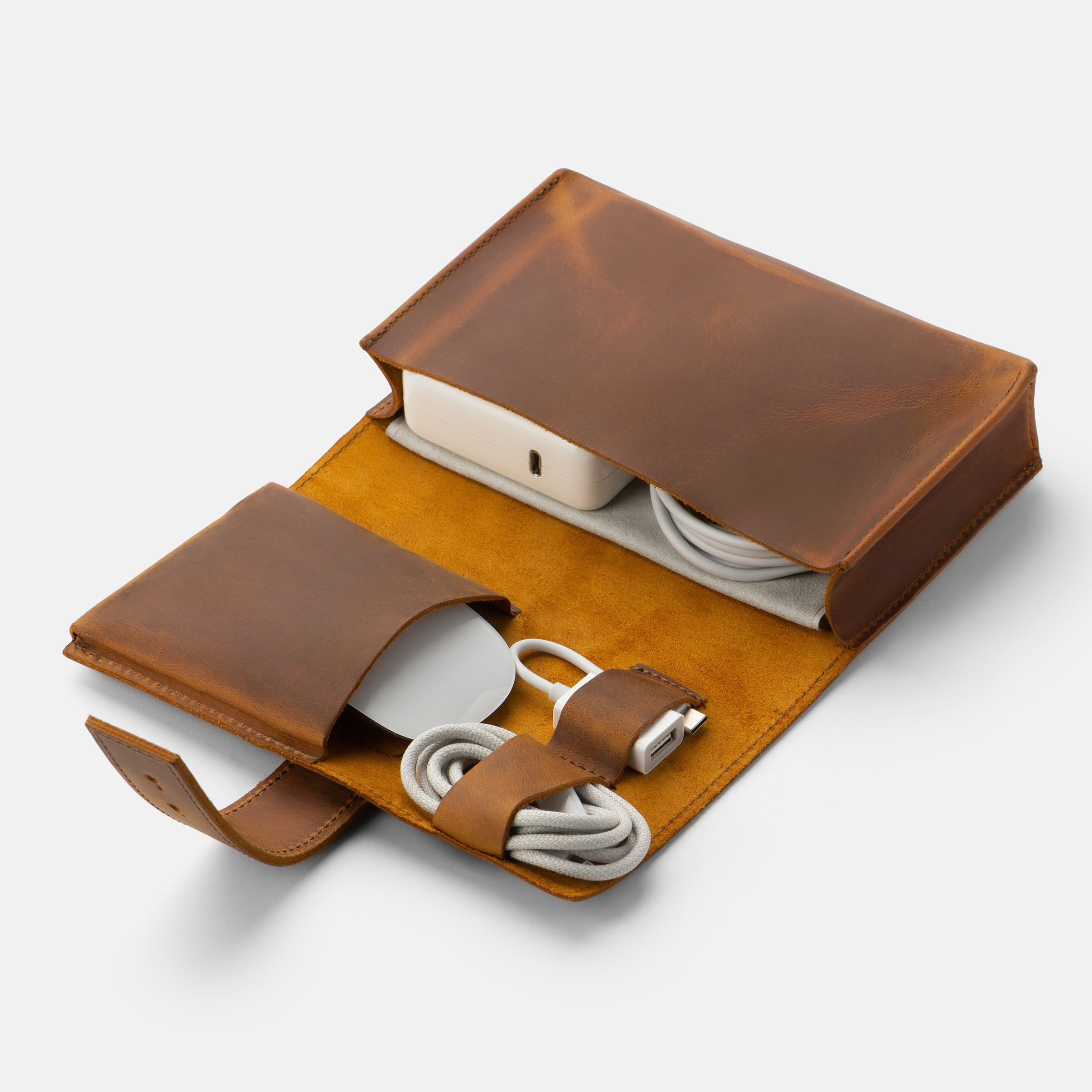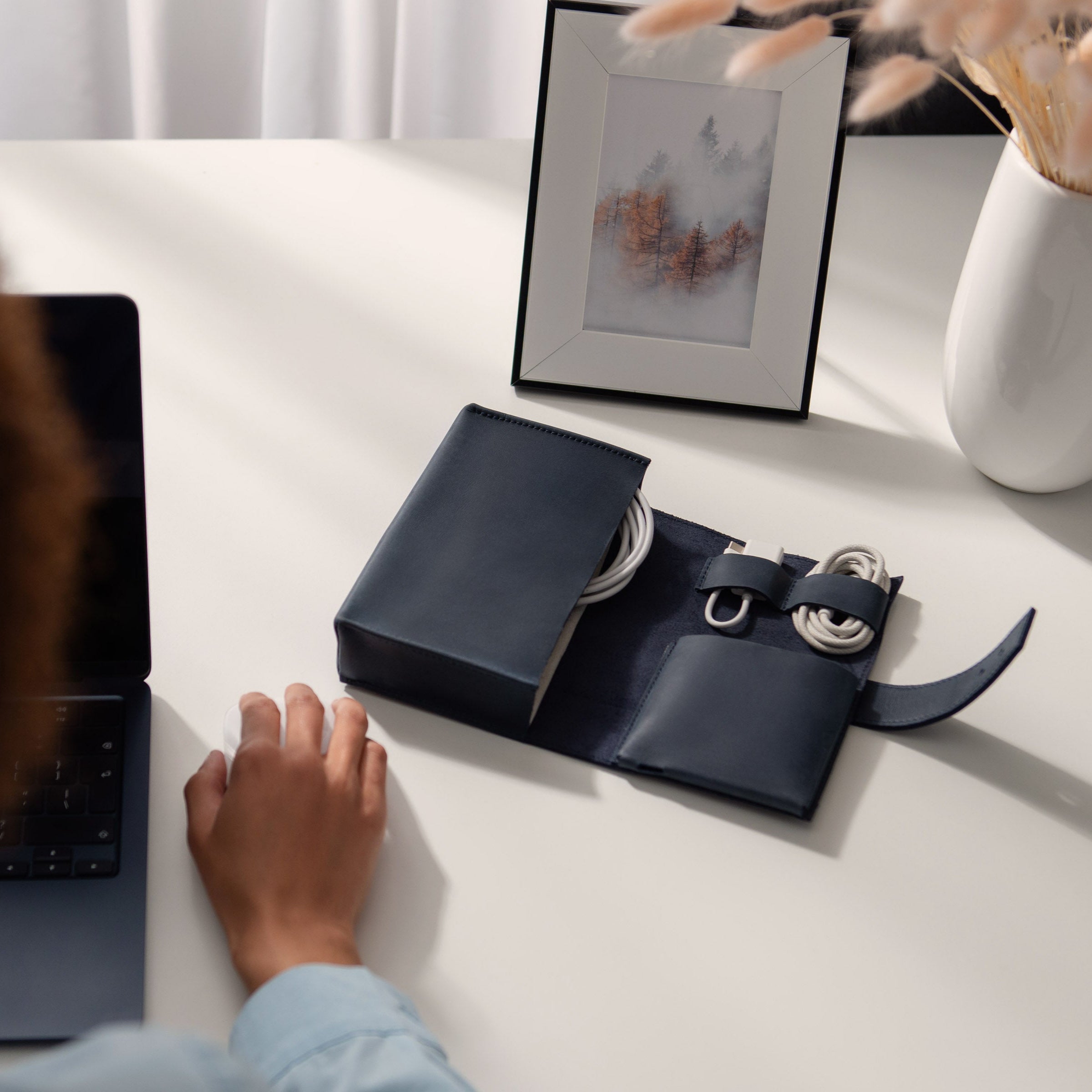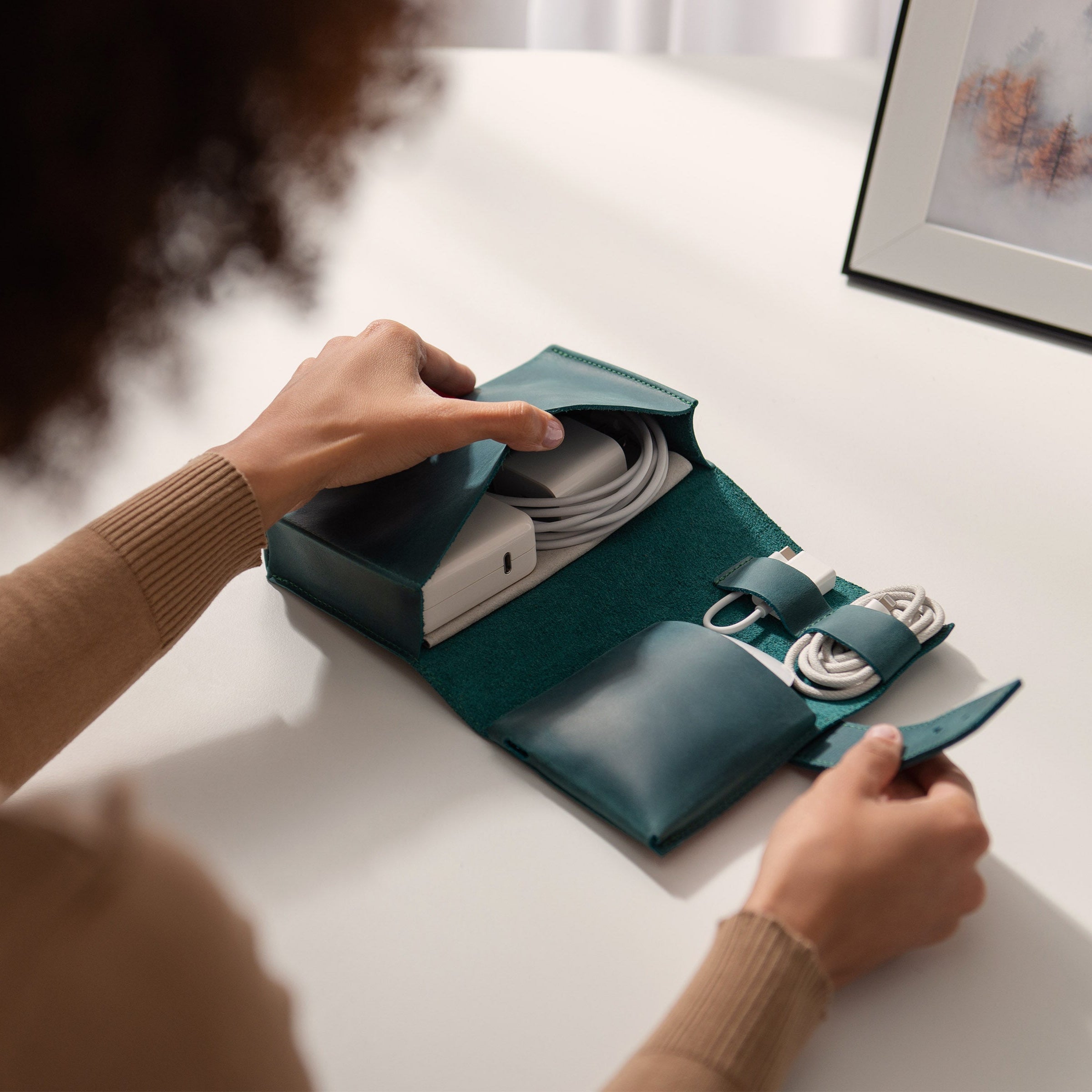 Keep your electronics organized with this compact leather tech organizer, crafted from quality leather for lasting durability. Designed to fit earphones, chargers, and other essentials, it features multi-sized slots to keep everything secure and tangle-free. Available in stylish colors with personalization options, it's a practical companion for travel or everyday use.