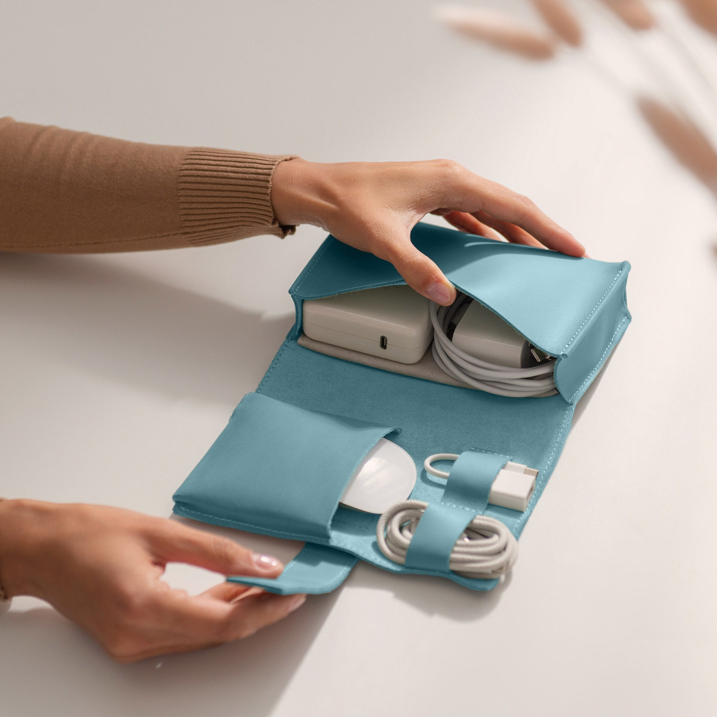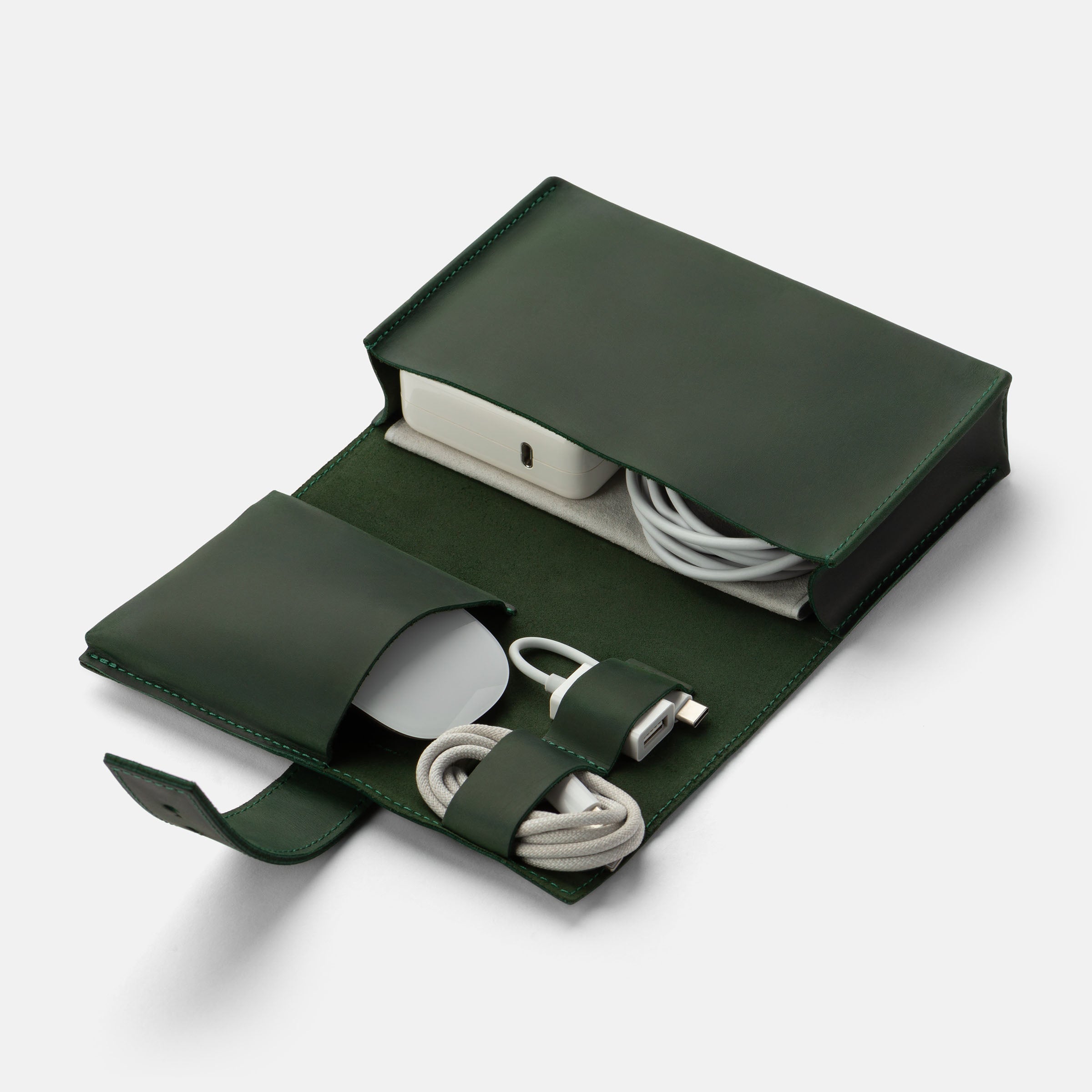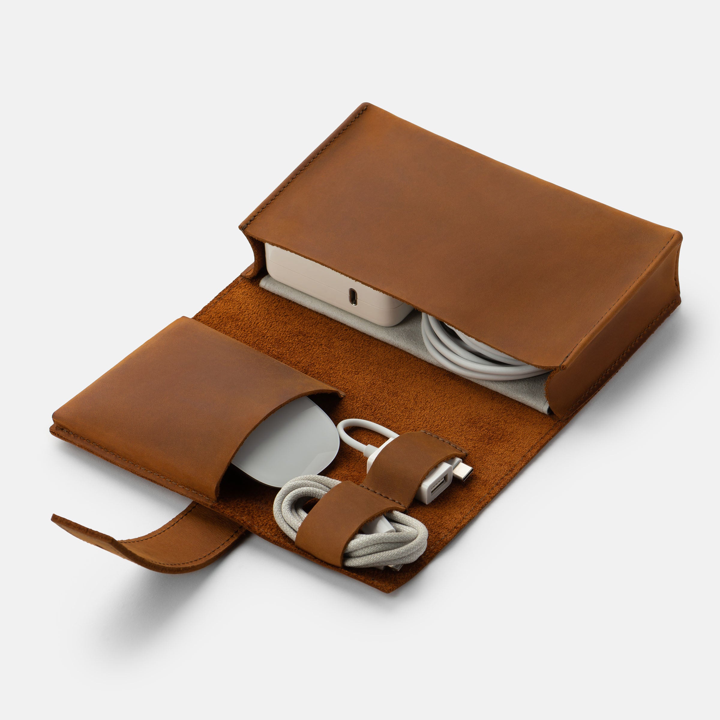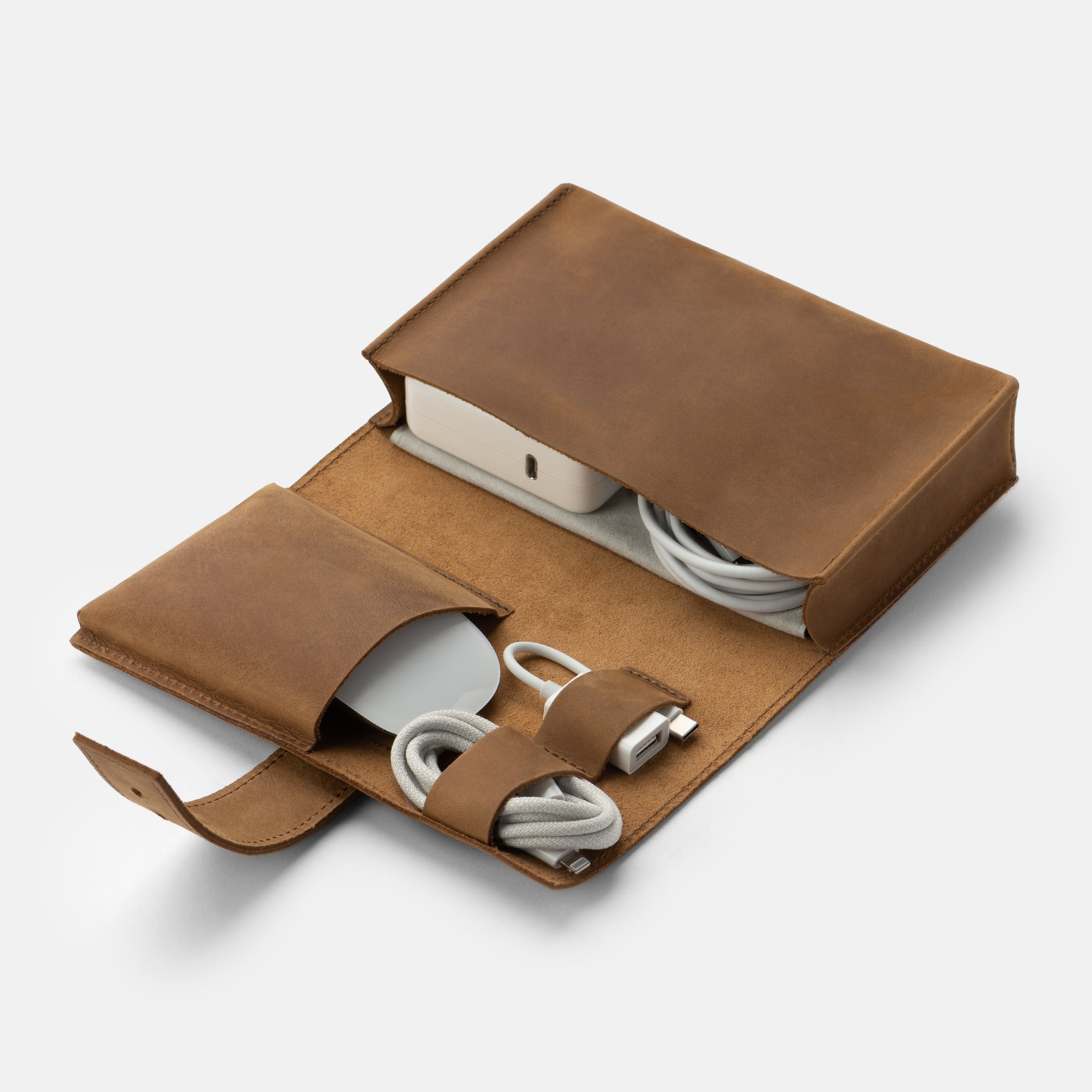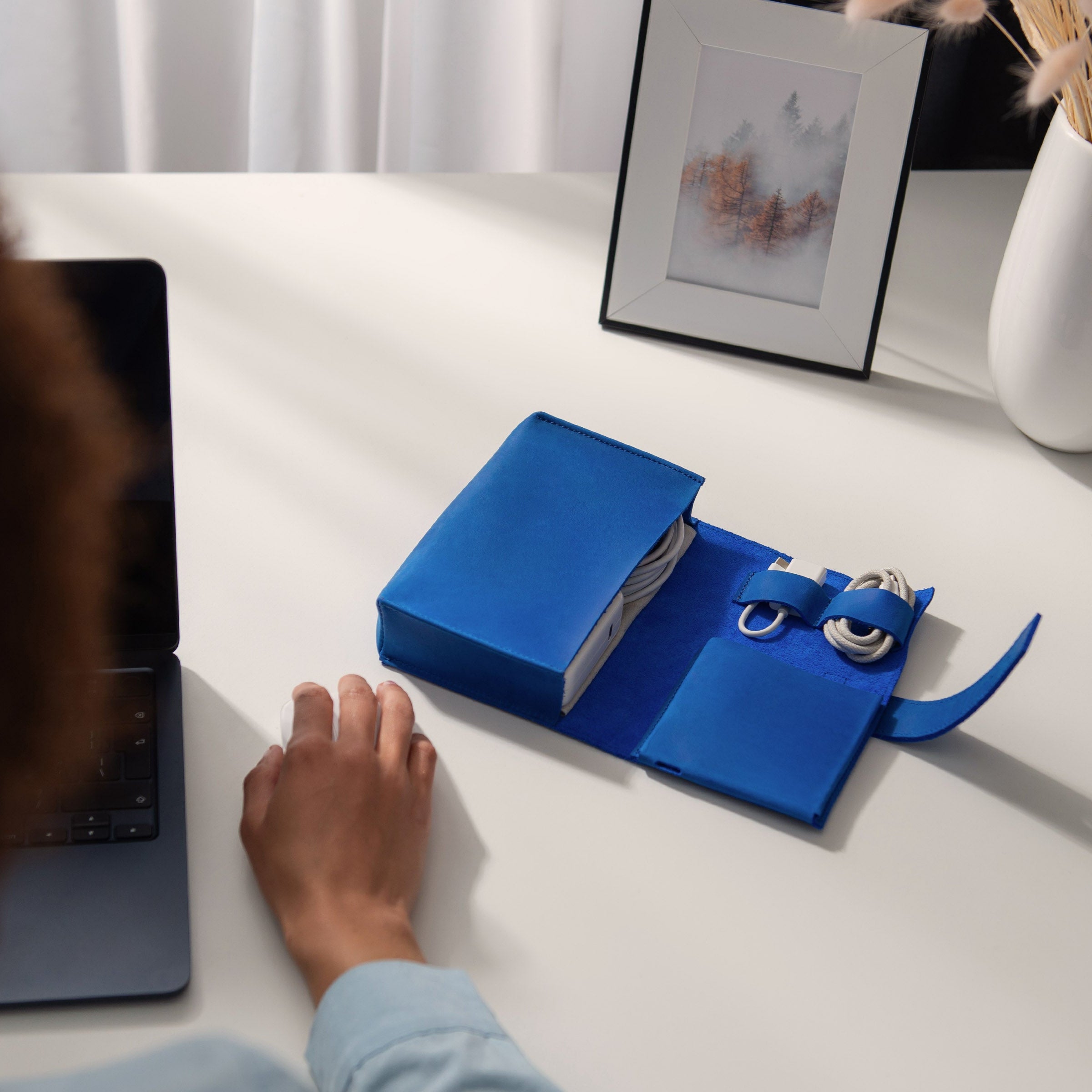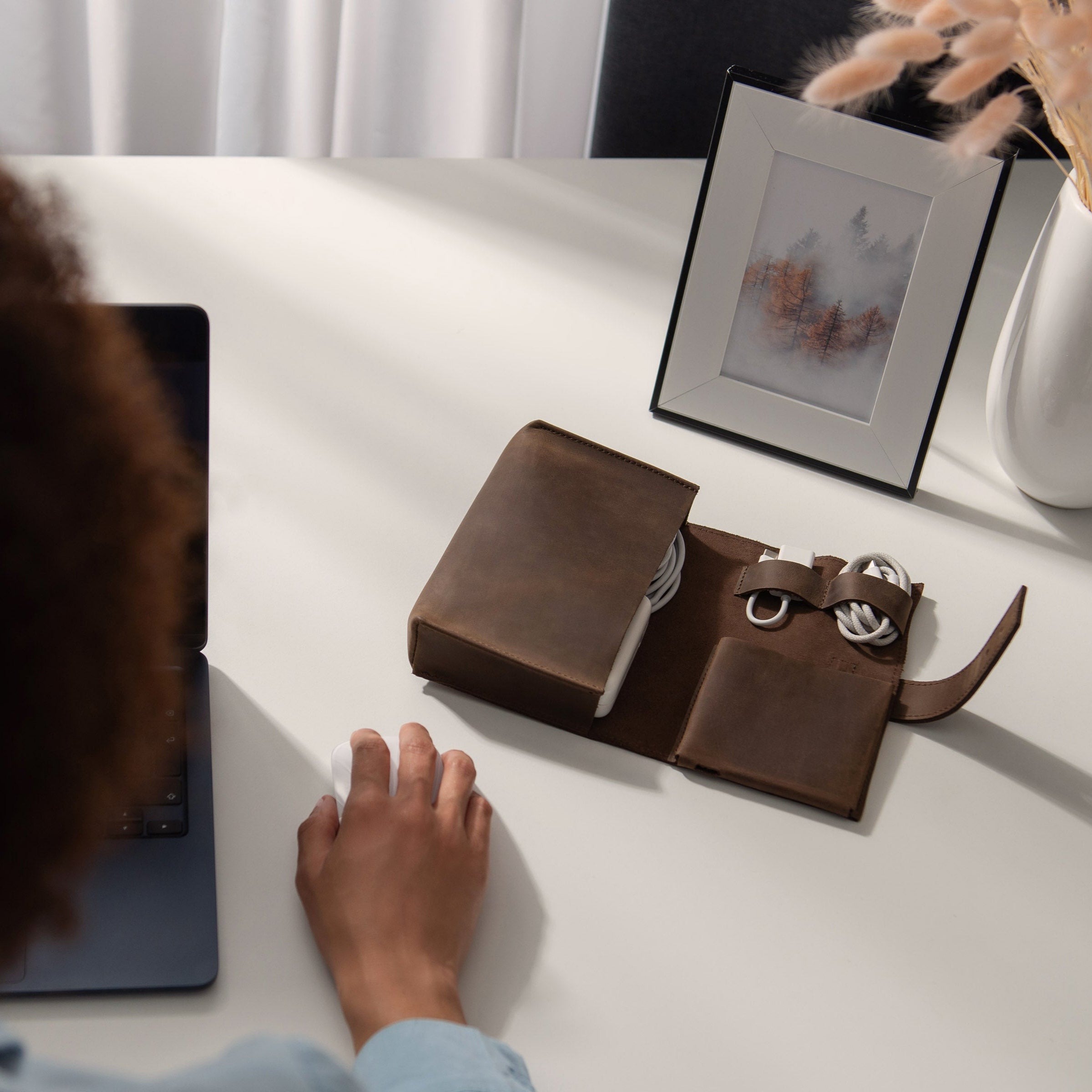 Keep your electronics organized with this compact leather tech organizer, crafted from quality leather for lasting durability. Designed to fit earphones, chargers, and other essentials, it features multi-sized slots to keep everything secure and tangle-free. Available in stylish colors with personalization options, it's a practical companion for travel or everyday use.
