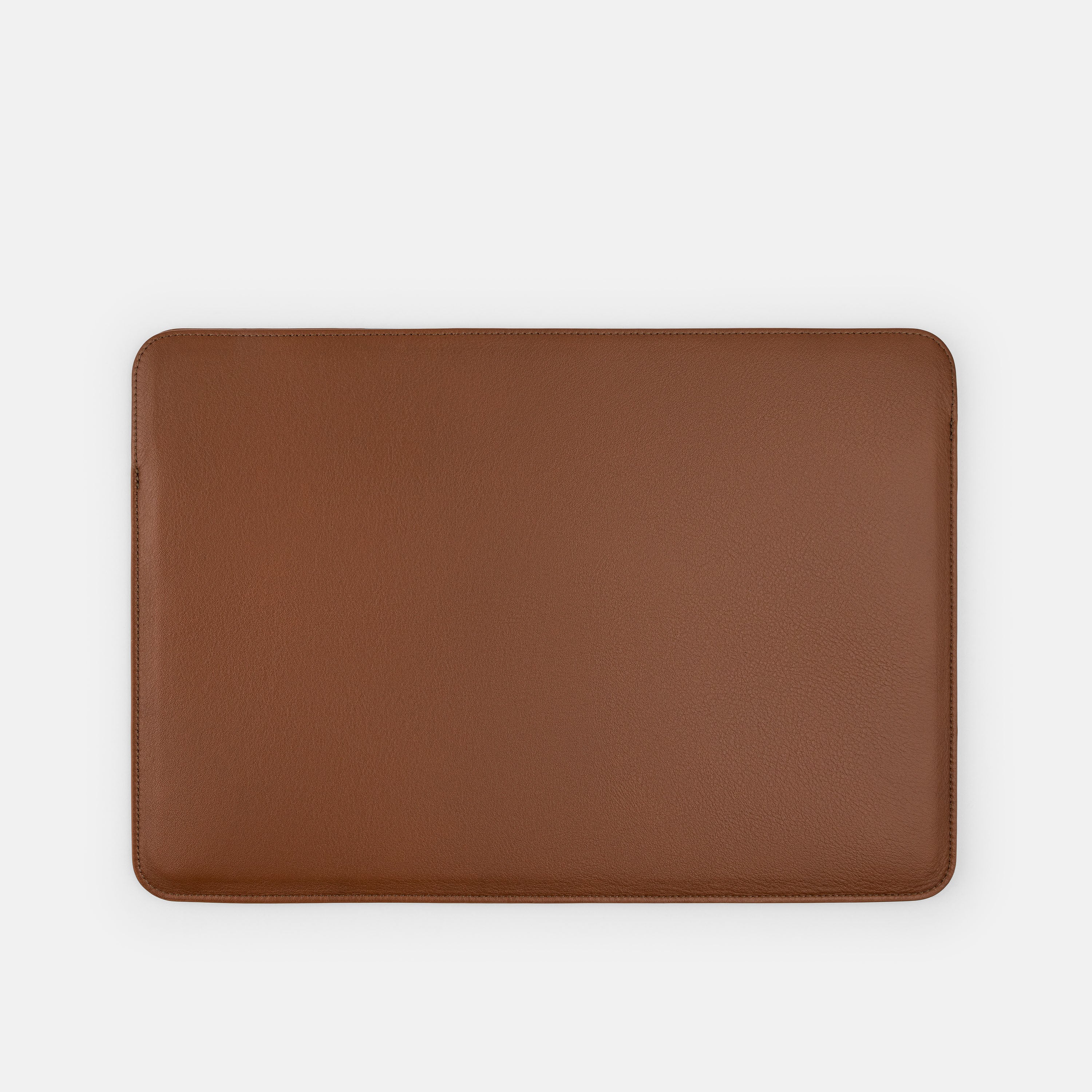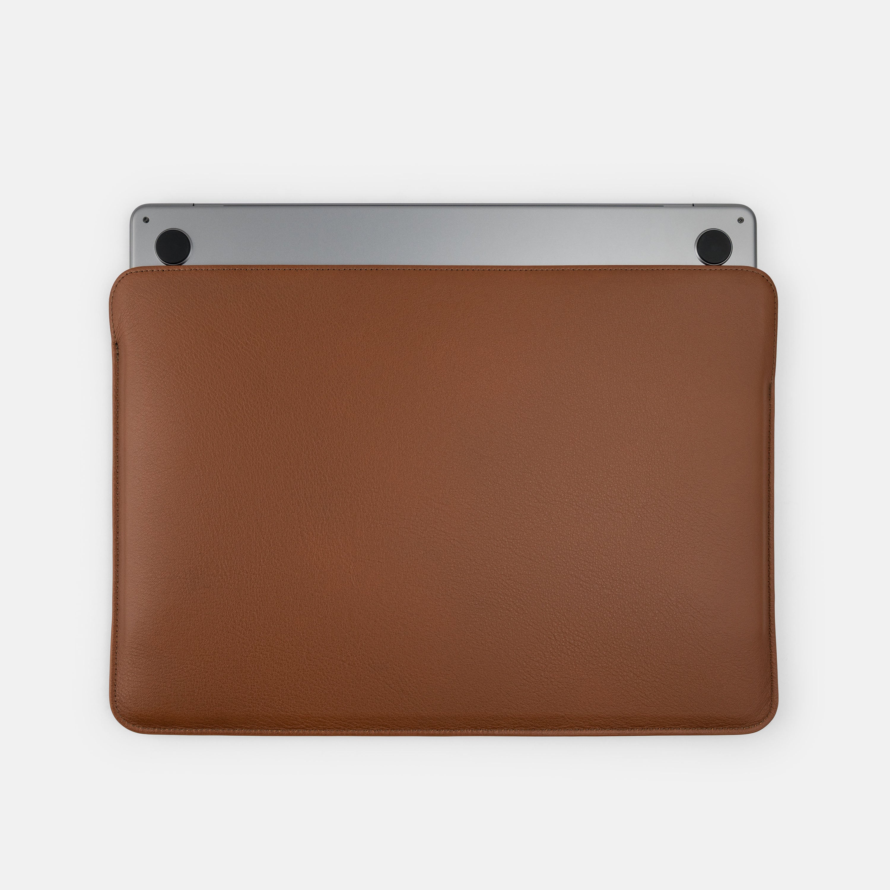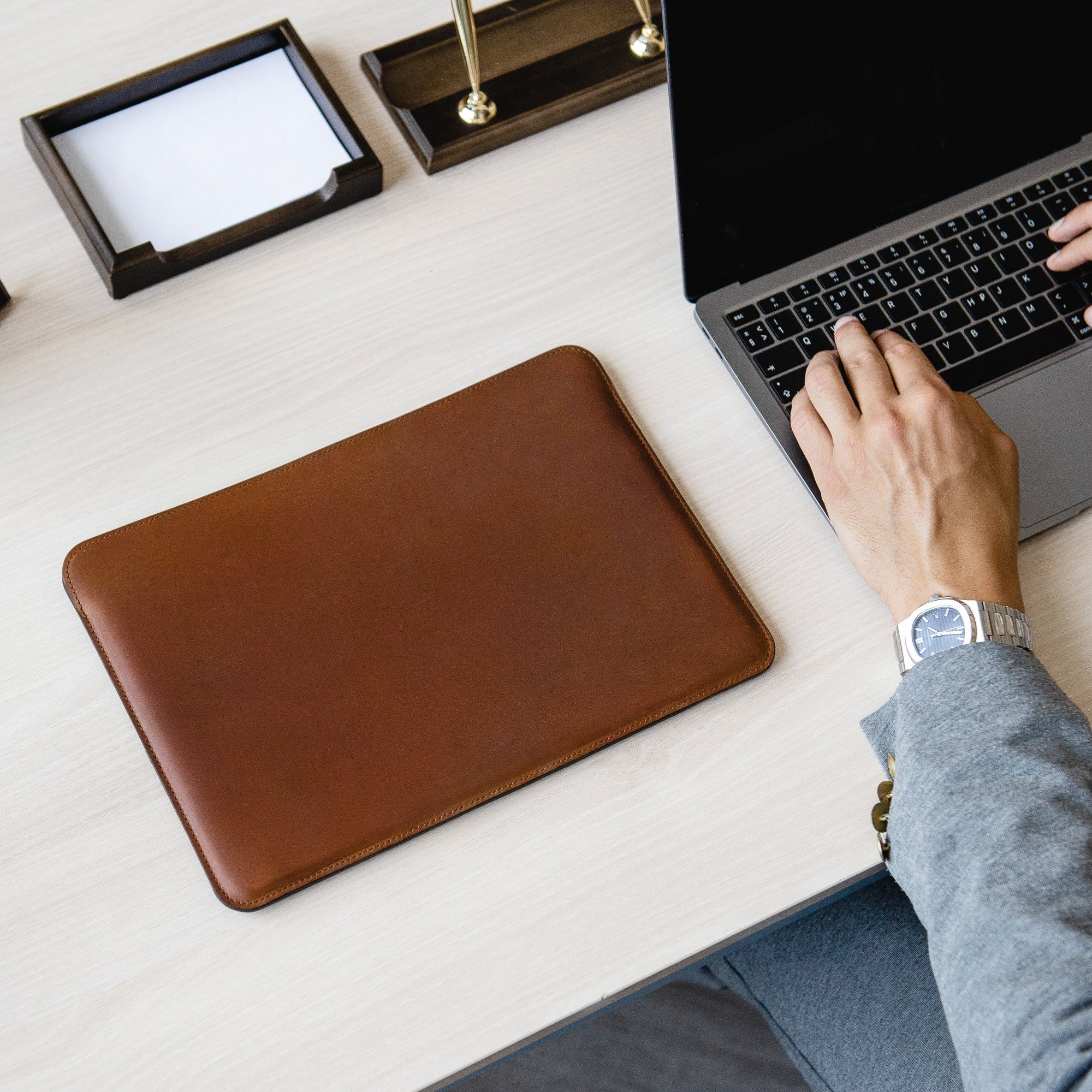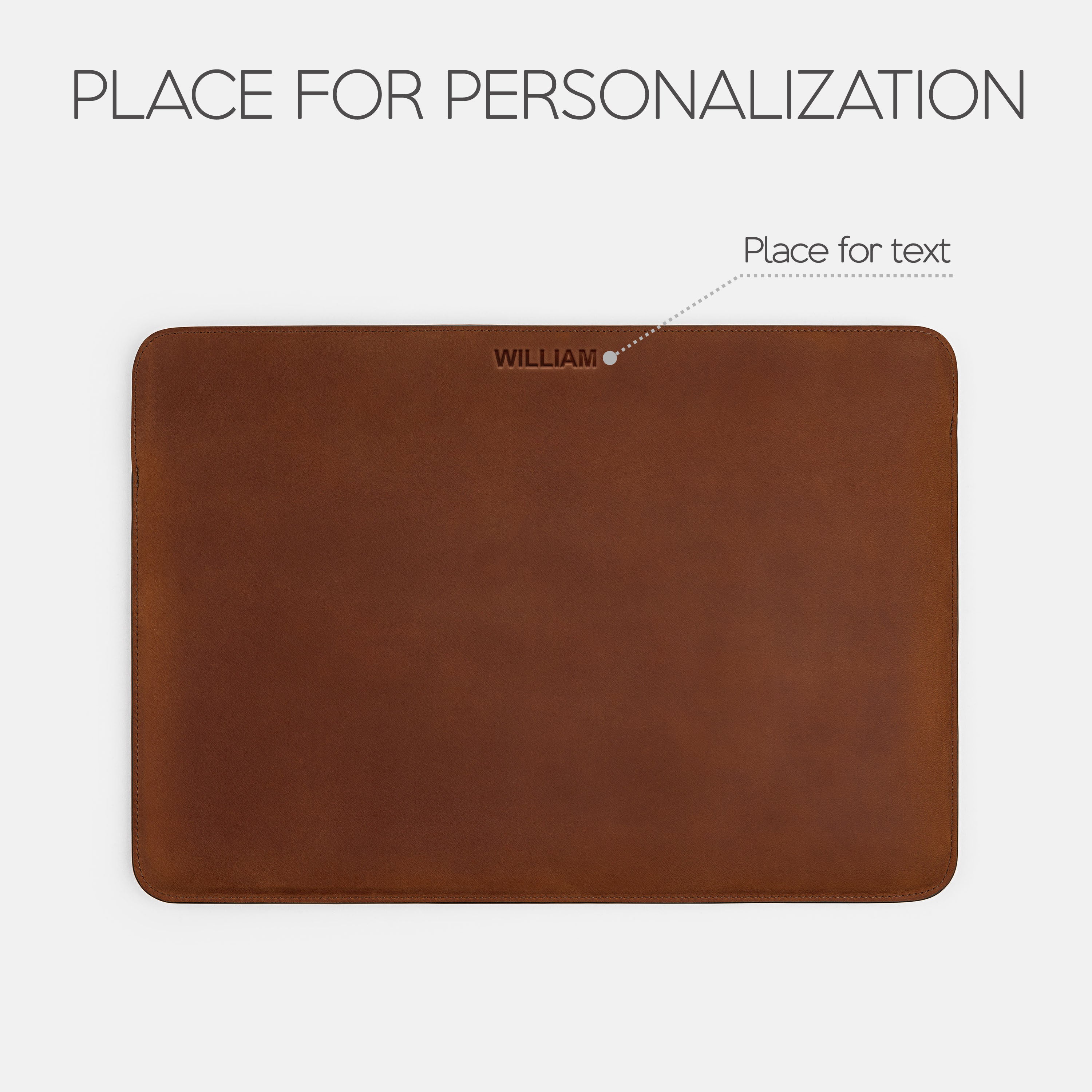 This personalized leather MacBook case combines a sturdy exterior with a soft microfiber interior to protect your device from scratches and slipping. The padded dints securely hold your laptop in place, while a side cutout allows for convenient charging without removing it from the case. Sleek and form-fitting, it's practical to carry on its own or tucked inside a bag.