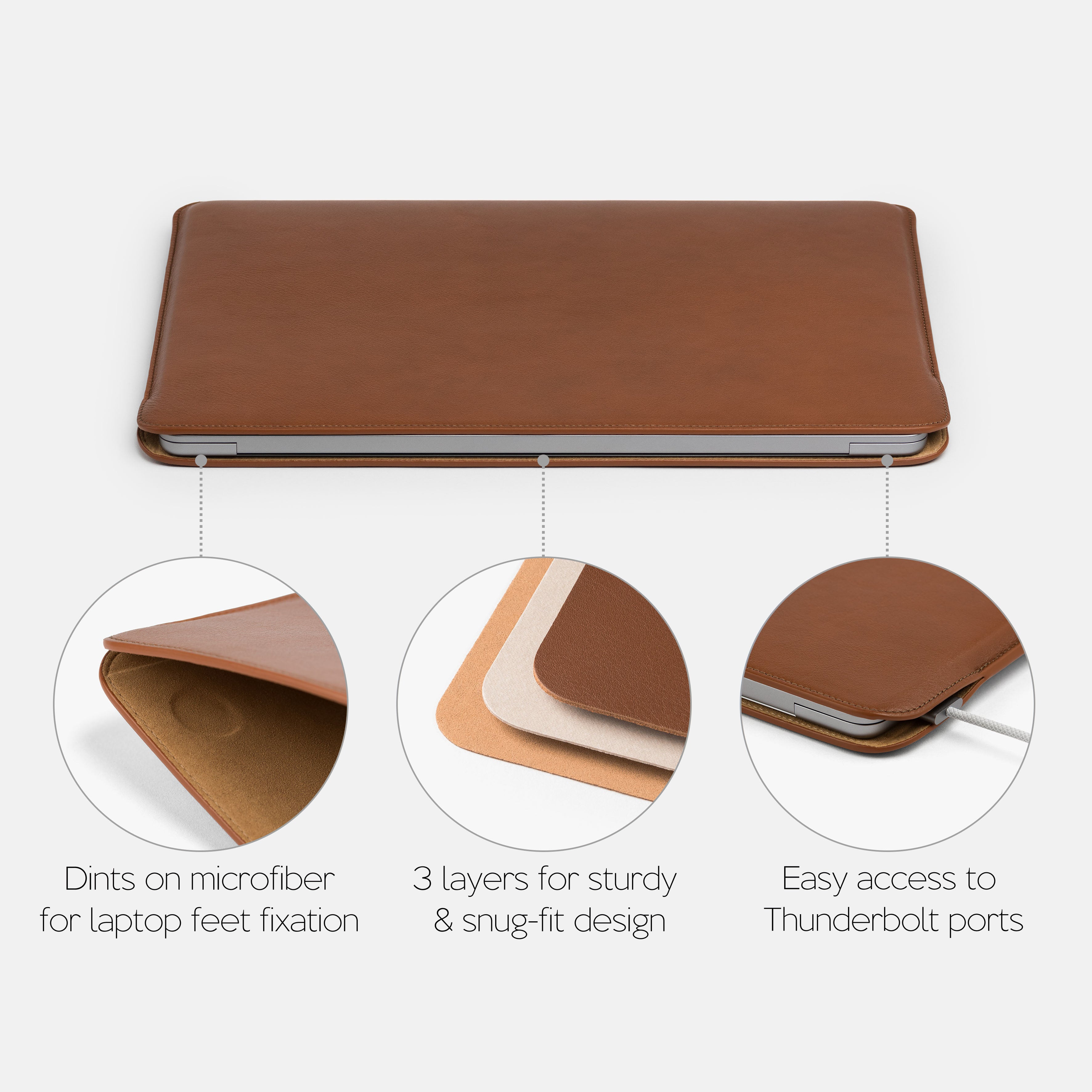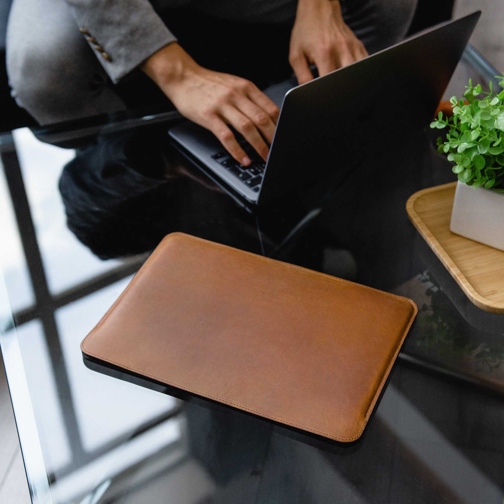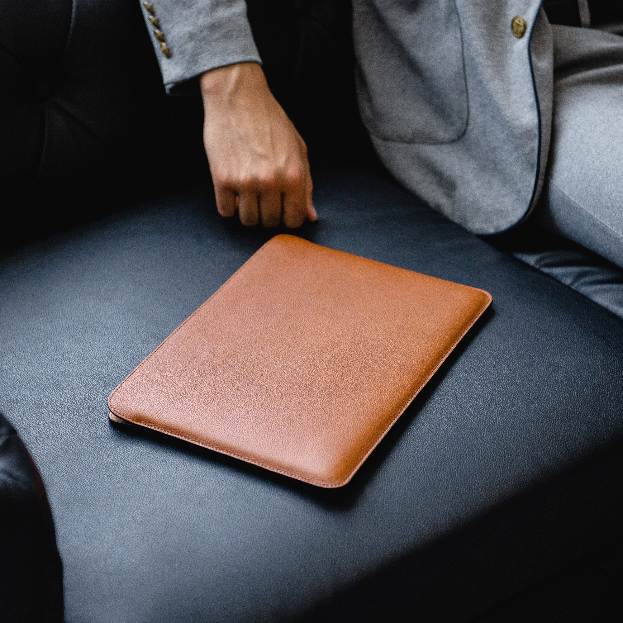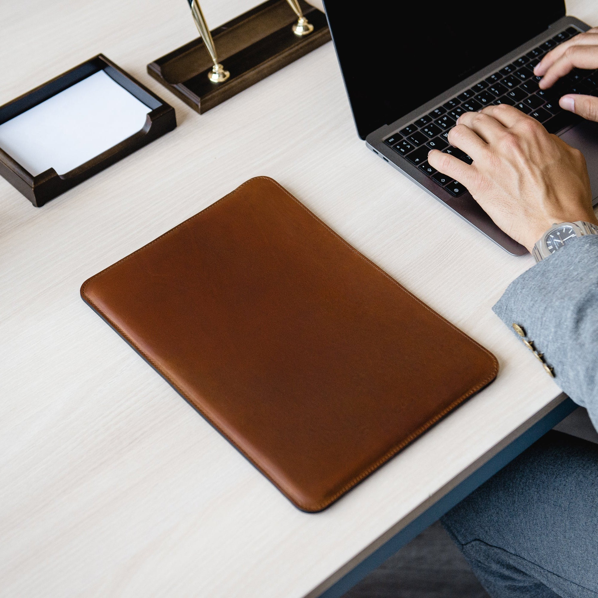 This personalized leather MacBook case combines a sturdy exterior with a soft microfiber interior to protect your device from scratches and slipping. The padded dints securely hold your laptop in place, while a side cutout allows for convenient charging without removing it from the case. Sleek and form-fitting, it's practical to carry on its own or tucked inside a bag.