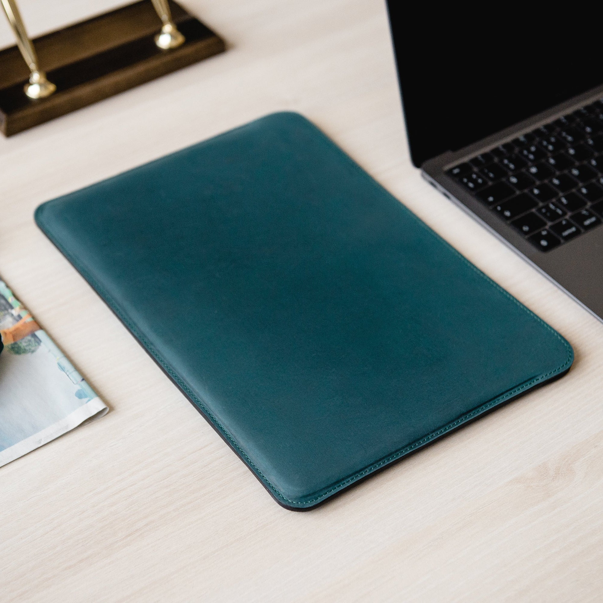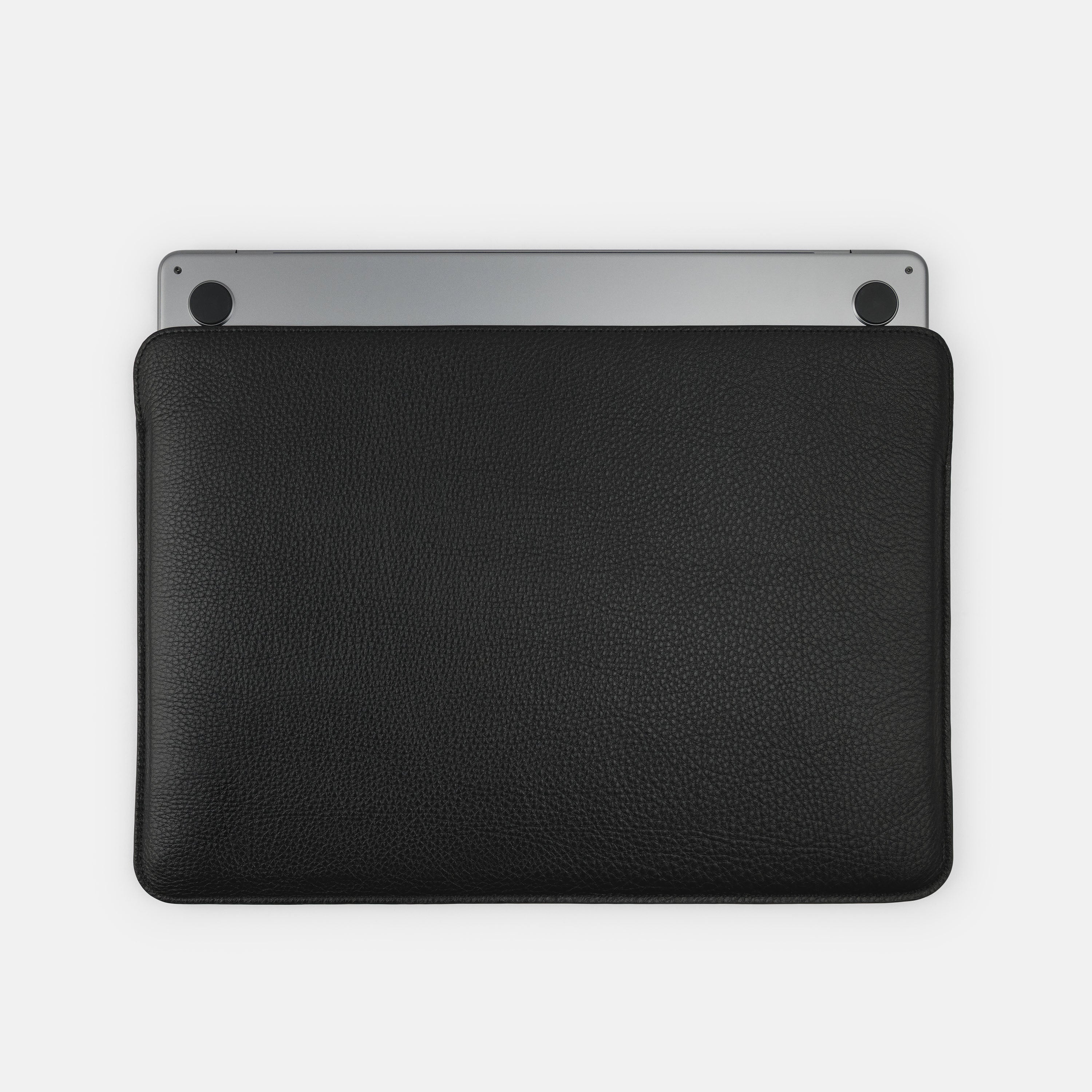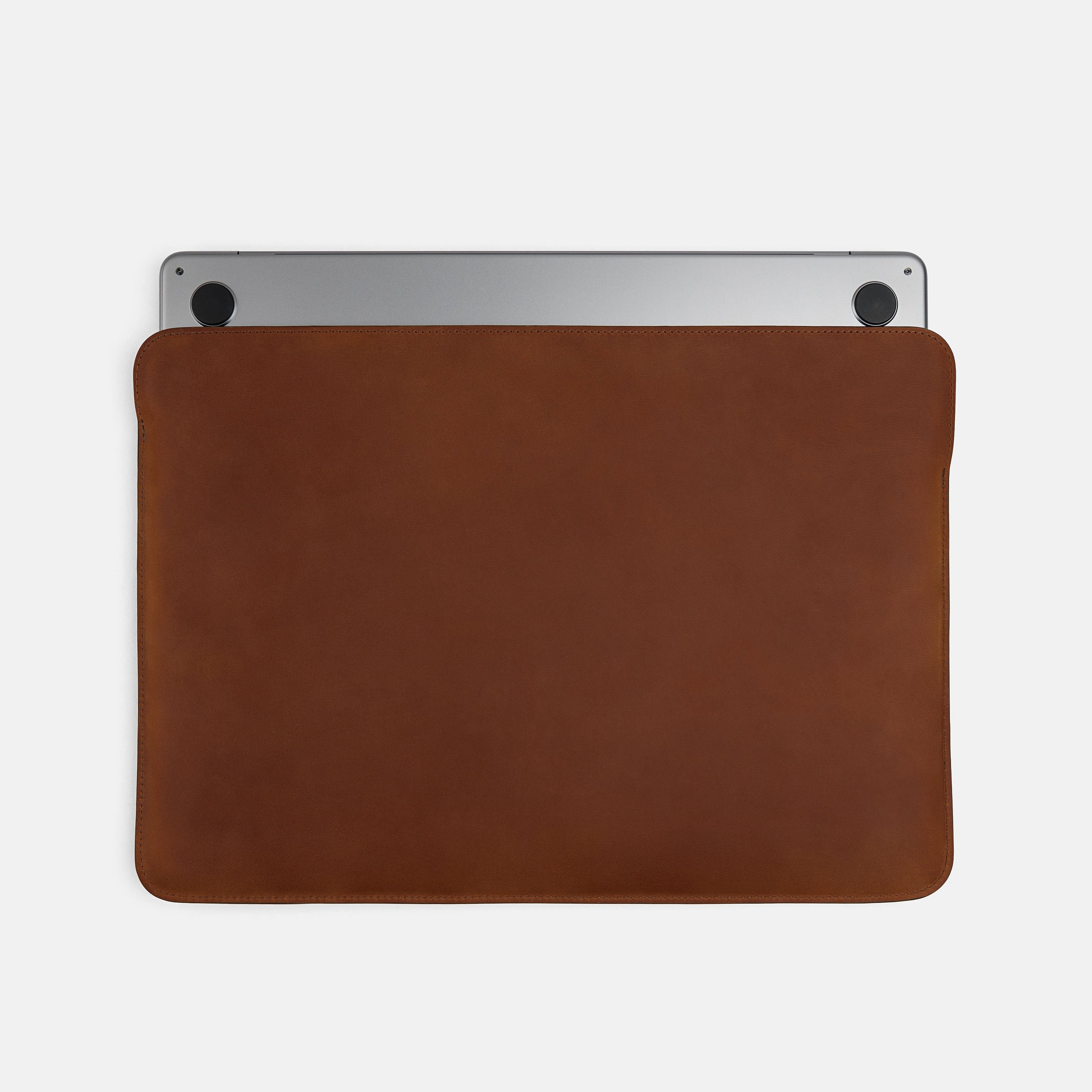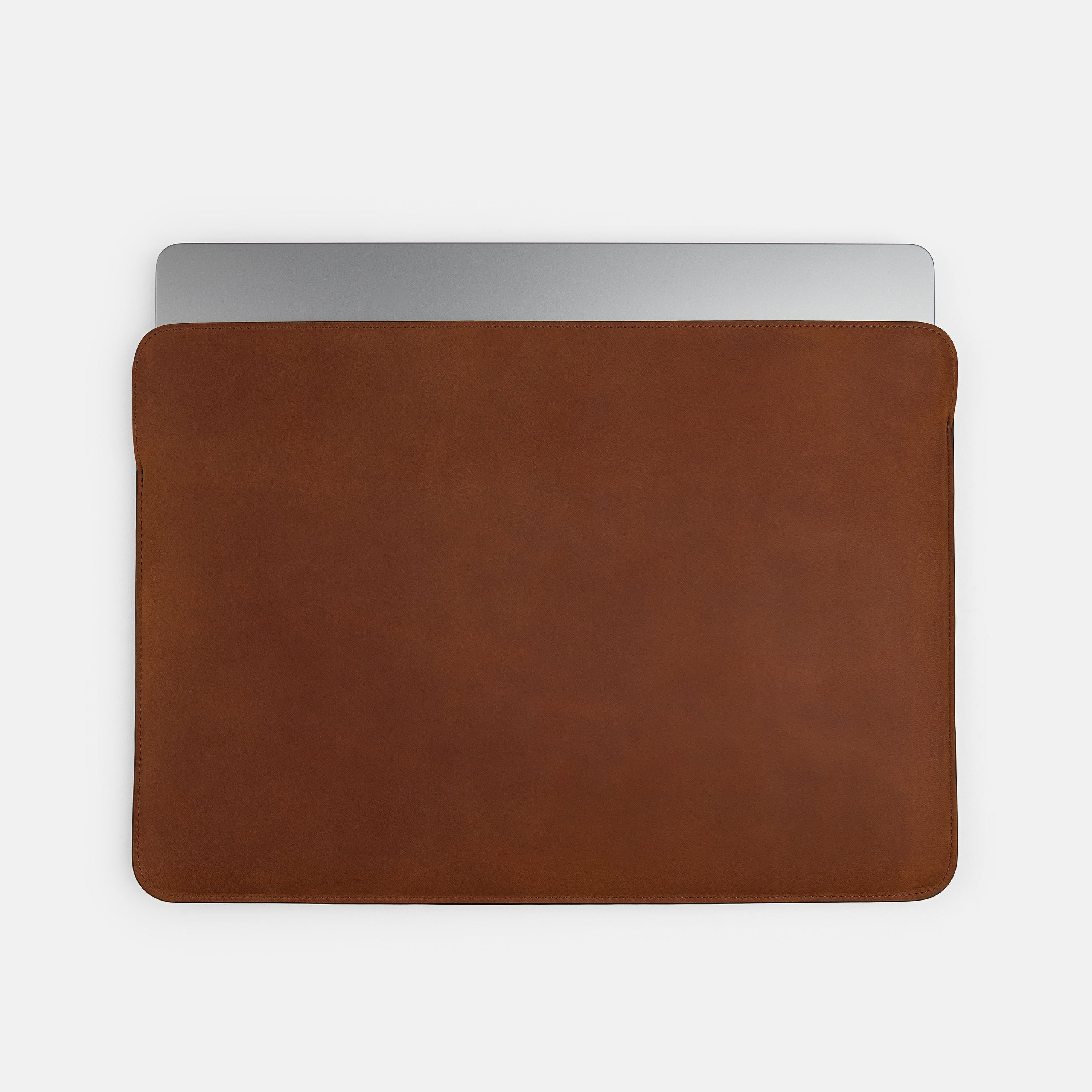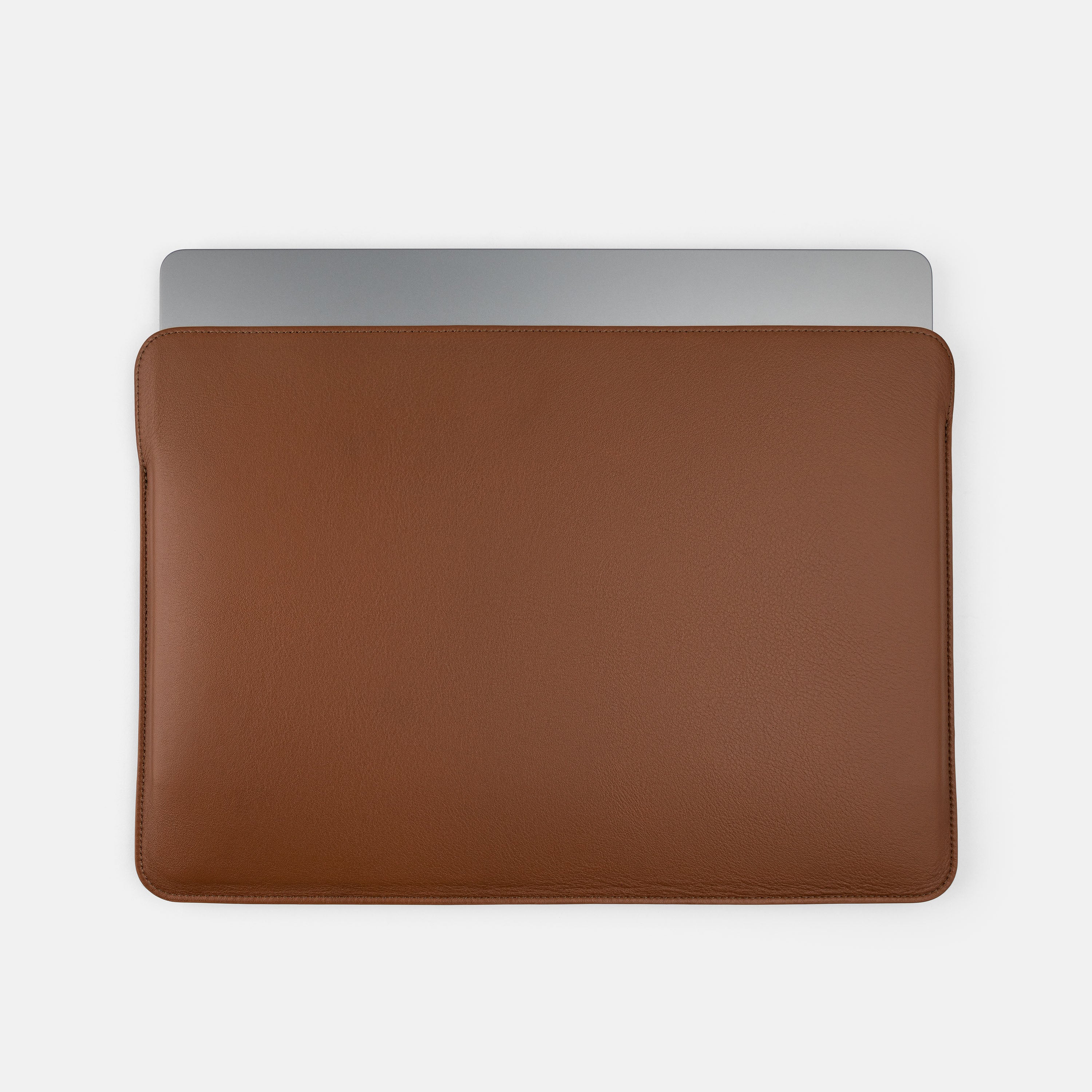 This personalized leather MacBook case combines a sturdy exterior with a soft microfiber interior to protect your device from scratches and slipping. The padded dints securely hold your laptop in place, while a side cutout allows for convenient charging without removing it from the case. Sleek and form-fitting, it's practical to carry on its own or tucked inside a bag.
