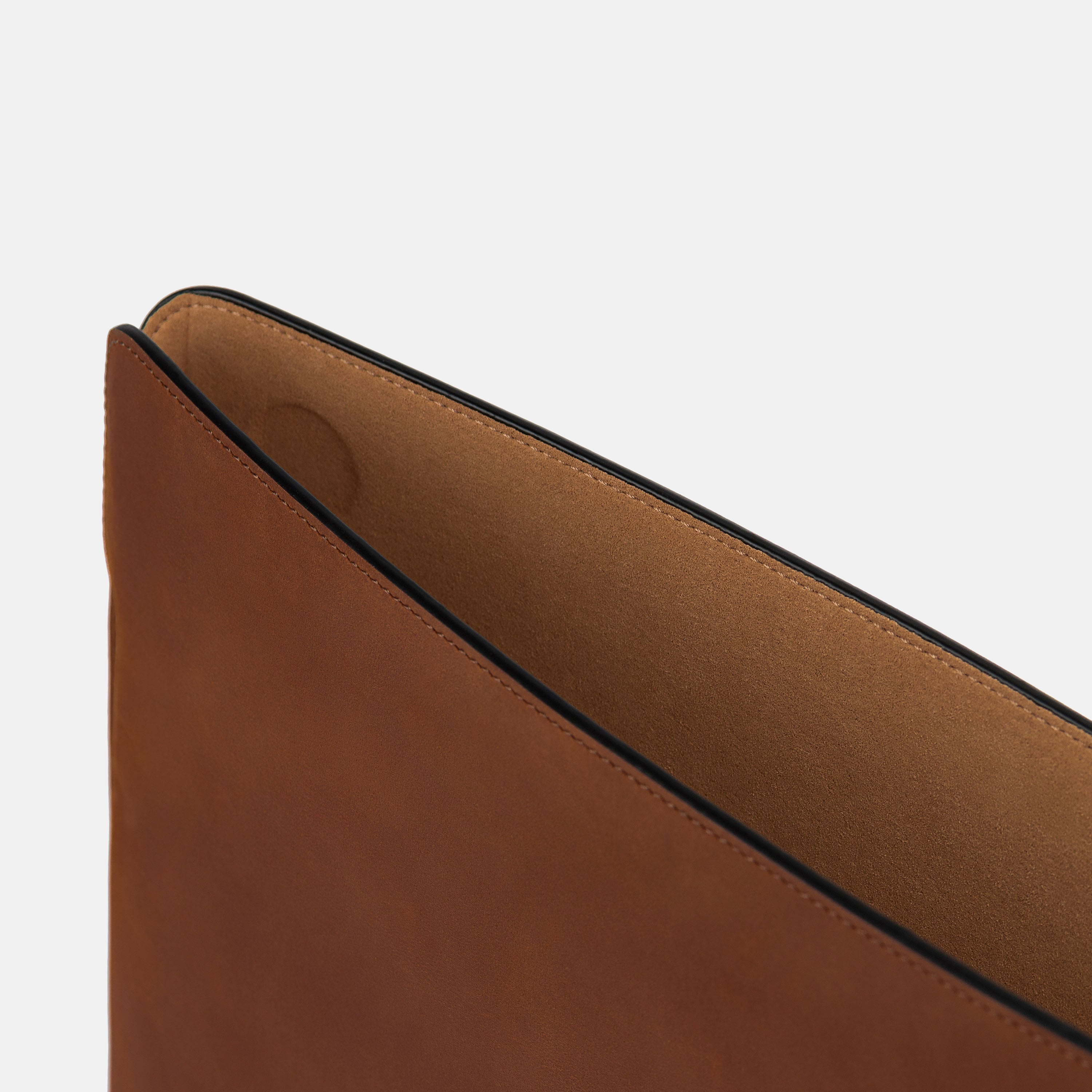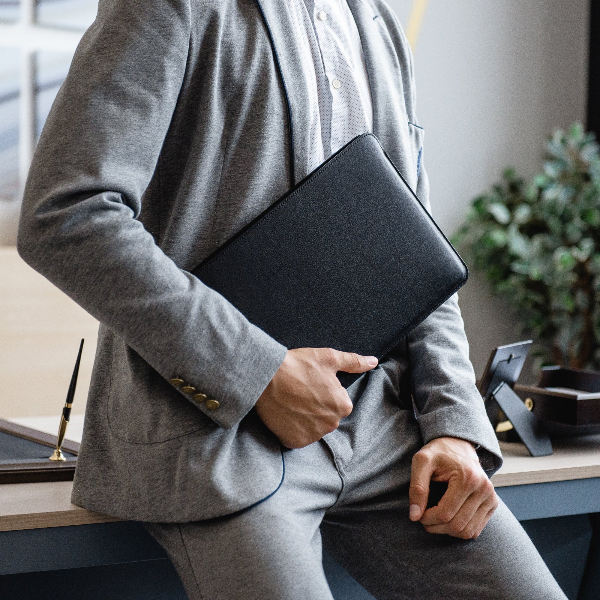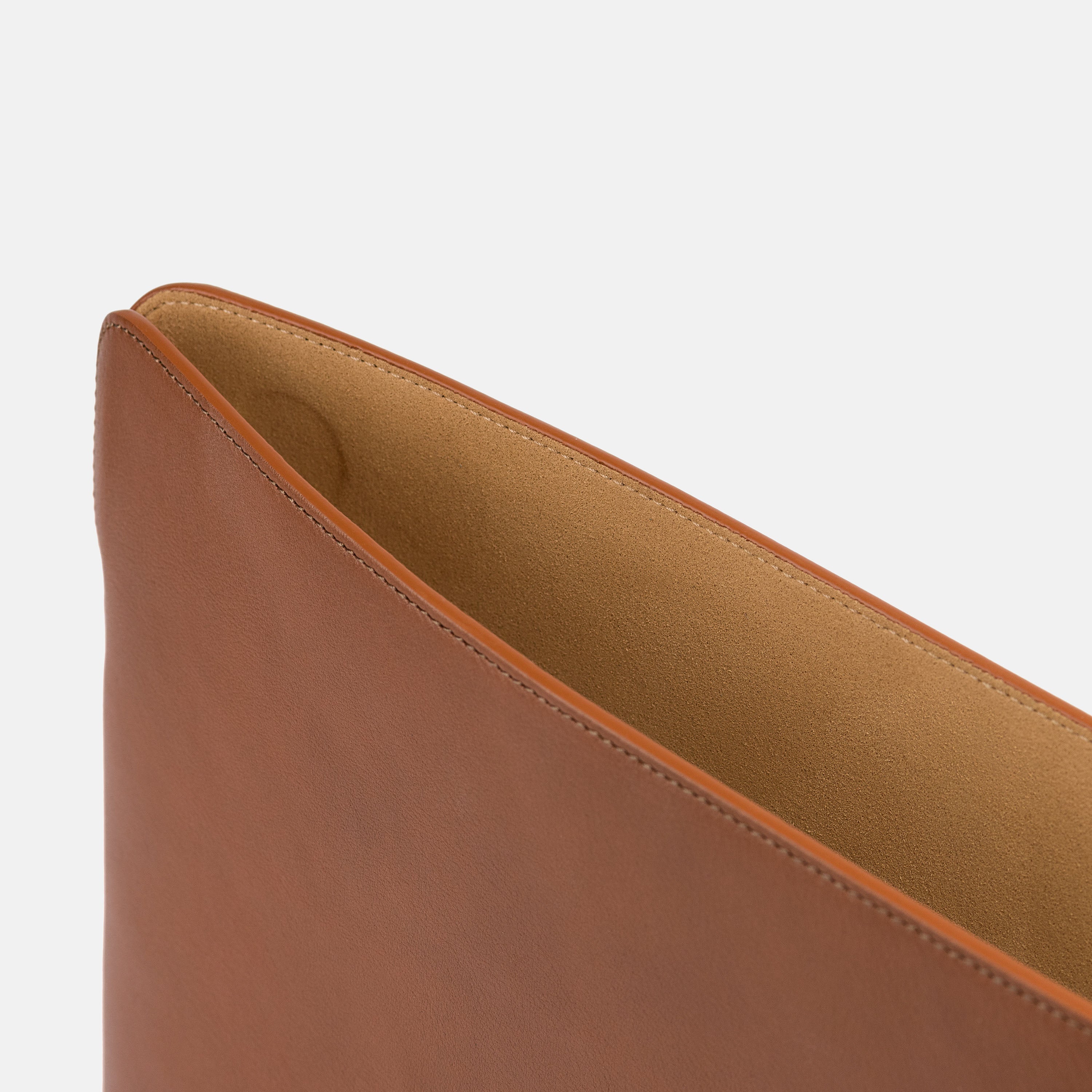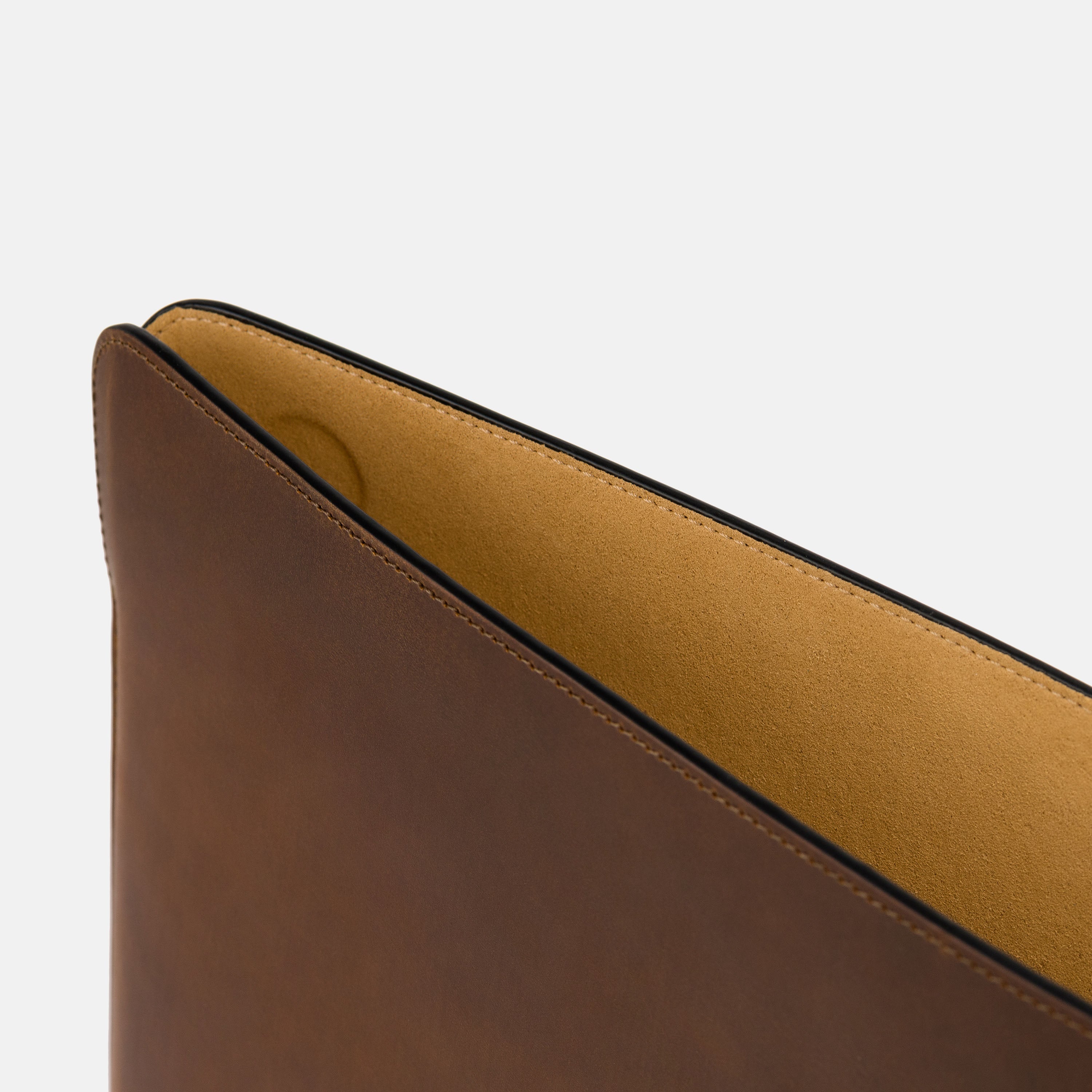 This personalized leather MacBook case combines a sturdy exterior with a soft microfiber interior to protect your device from scratches and slipping. The padded dints securely hold your laptop in place, while a side cutout allows for convenient charging without removing it from the case. Sleek and form-fitting, it's practical to carry on its own or tucked inside a bag.