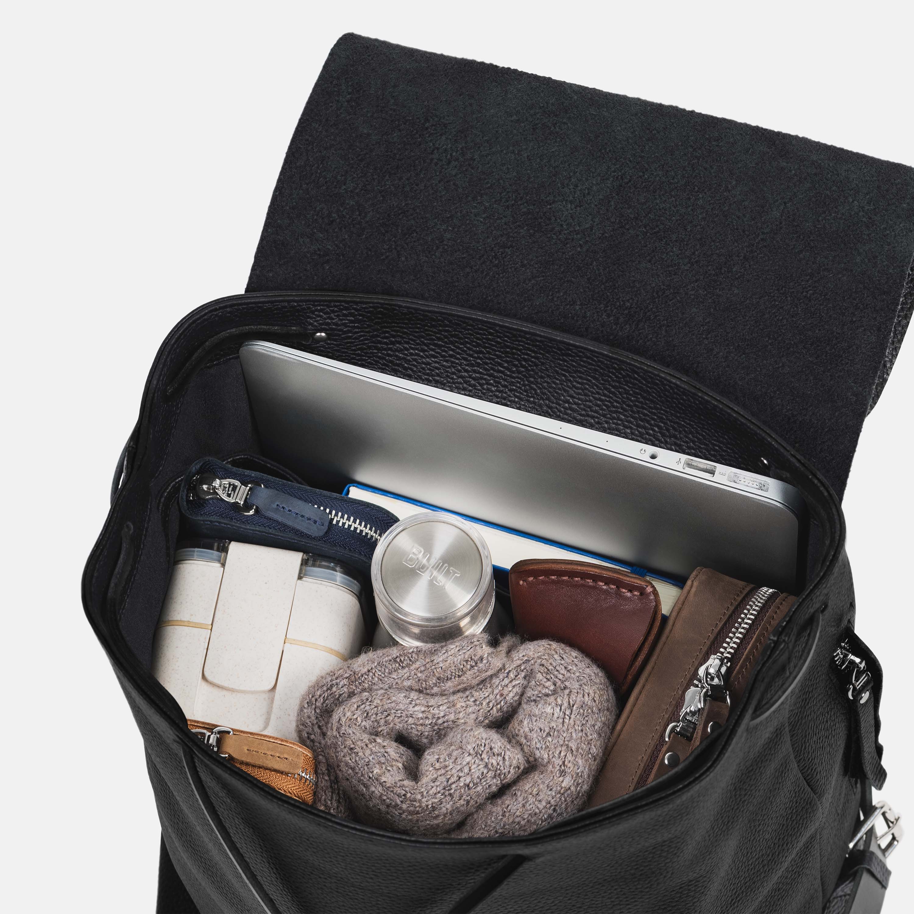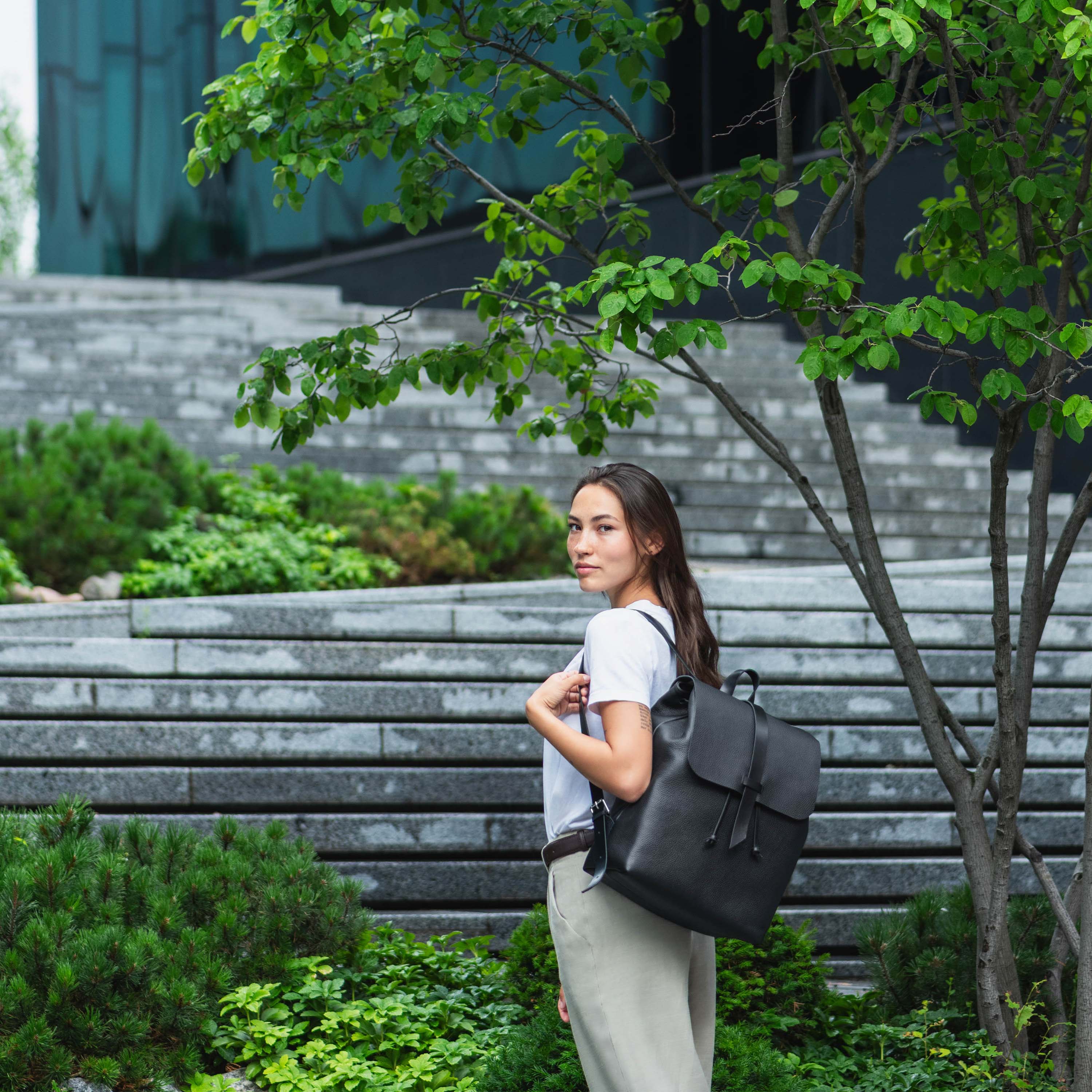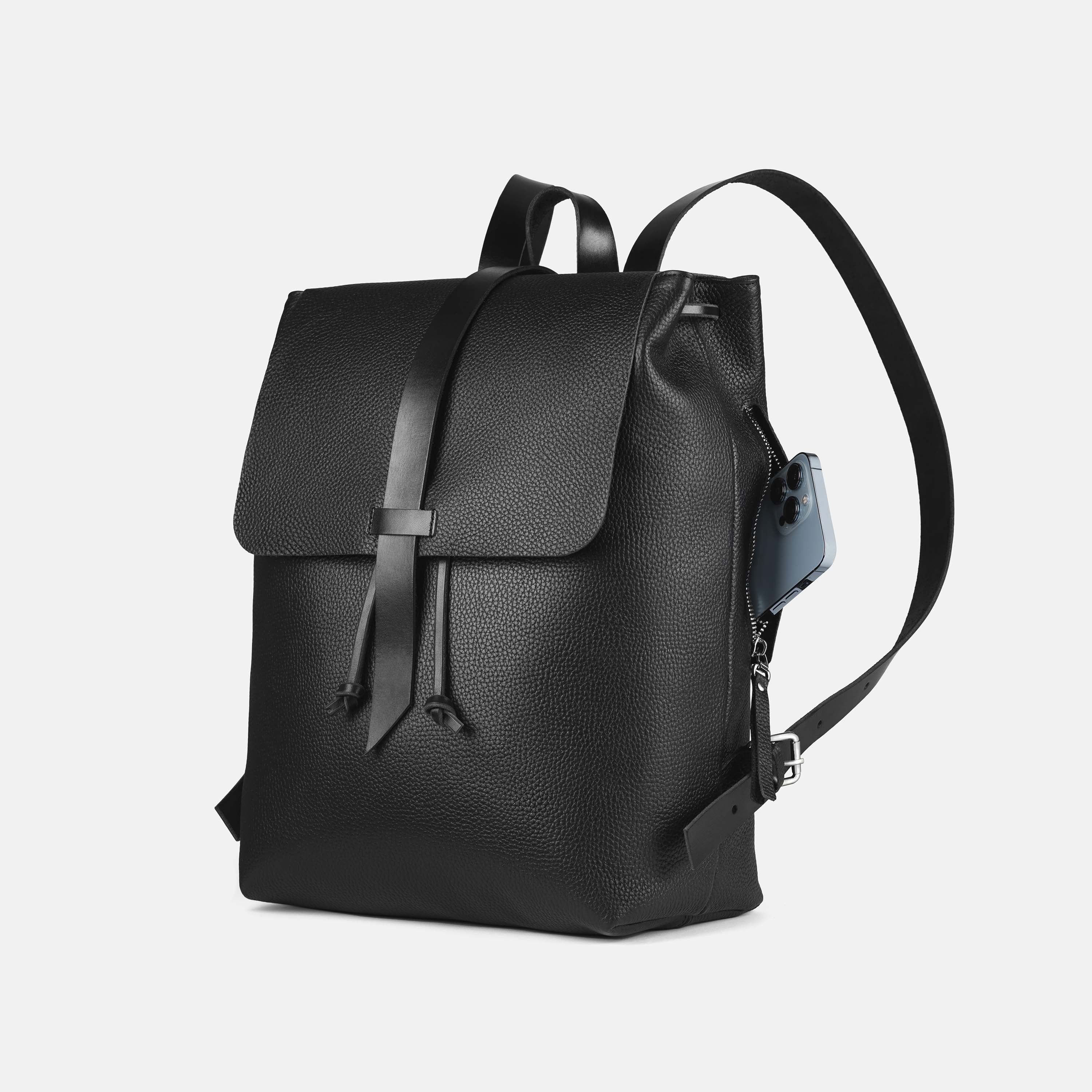 This black leather backpack blends everyday function with a timeless look. Made from durable, water-resistant pebbled leather that softens with use, it features a secure drawstring with a magnetic flap, adjustable straps, and a top handle. Inside, it fits a 14" laptop along with your daily essentials, making it ideal for work, travel, or weekends.