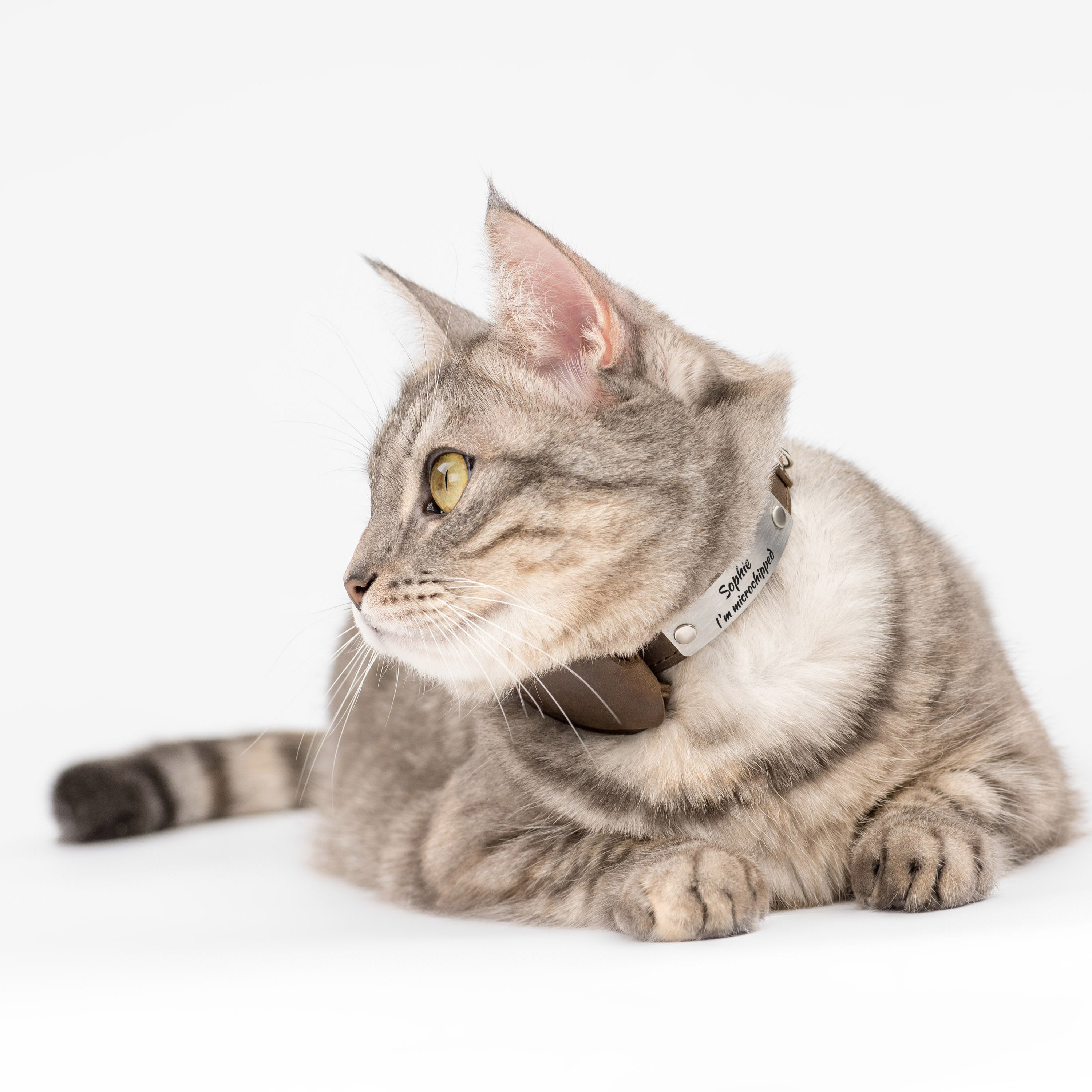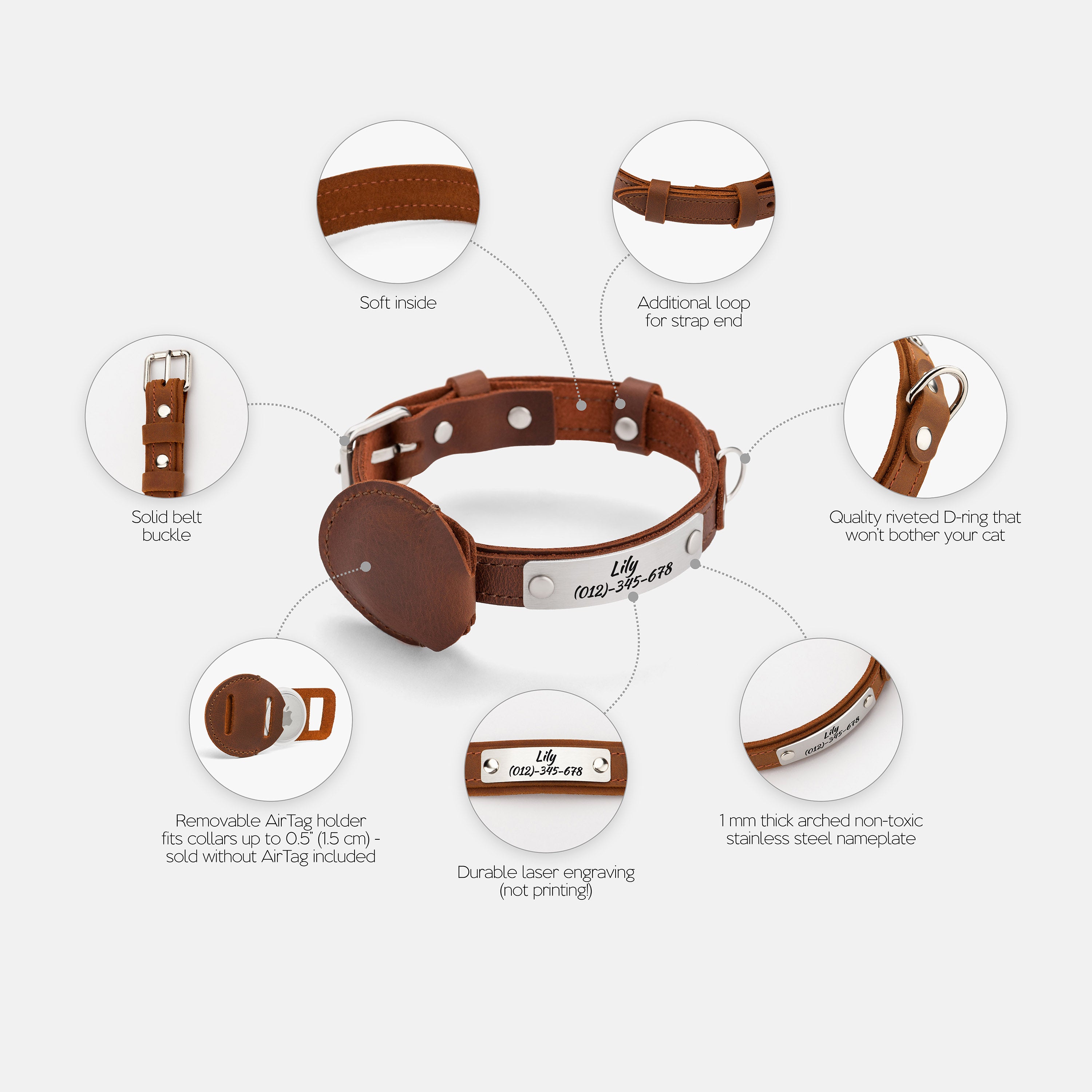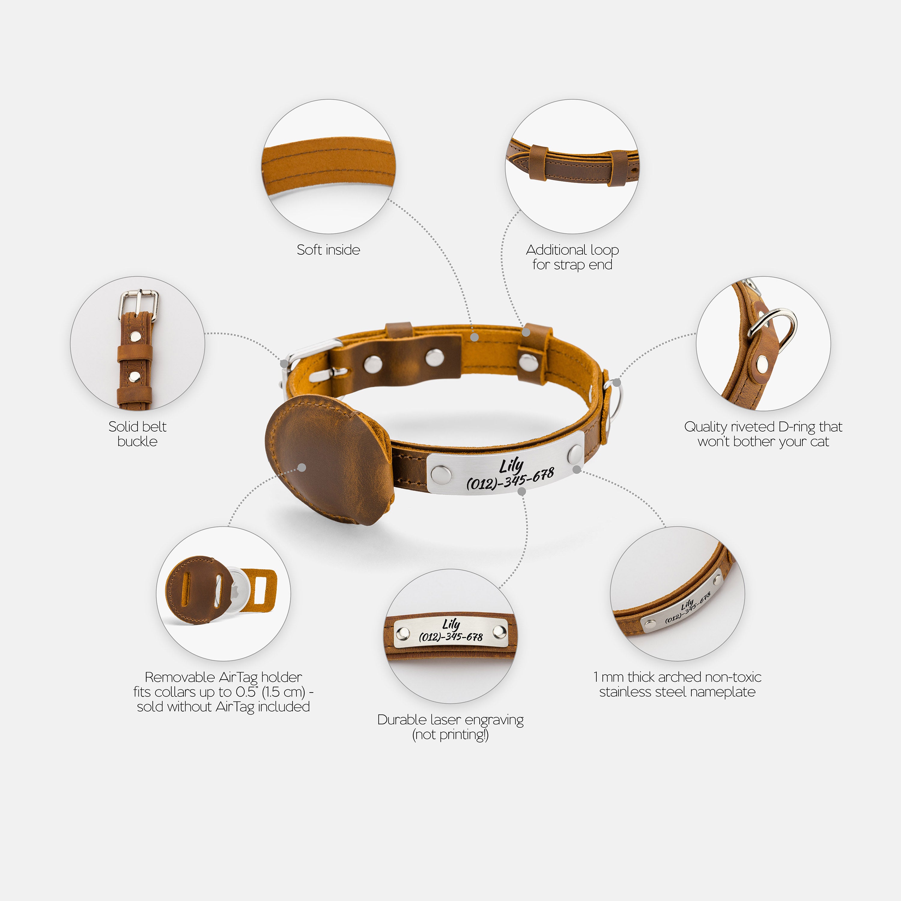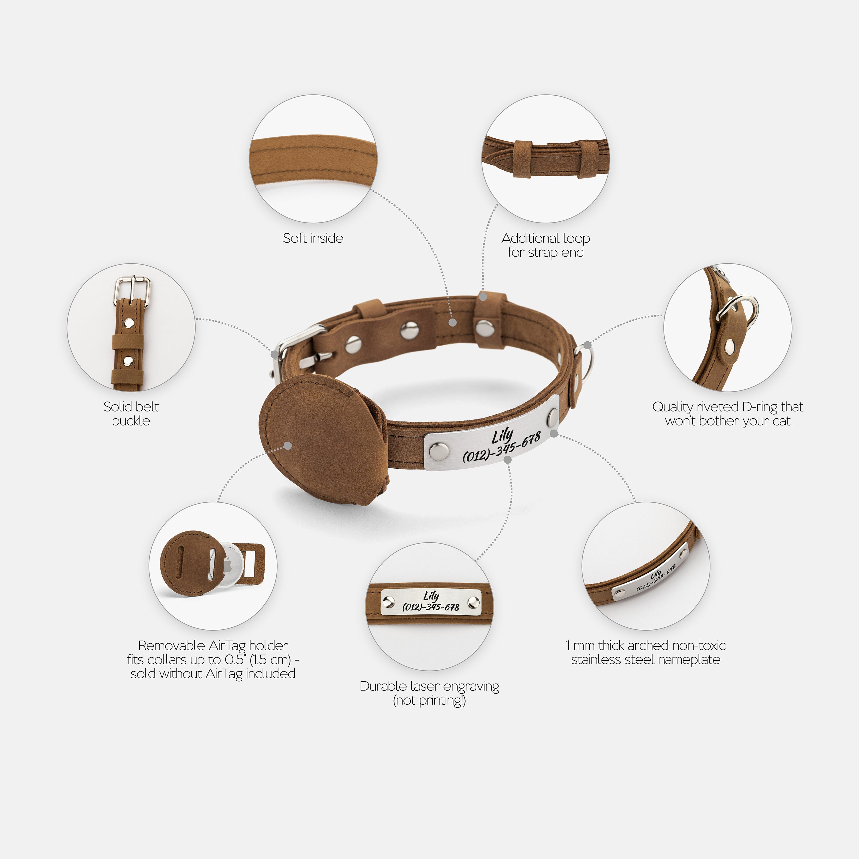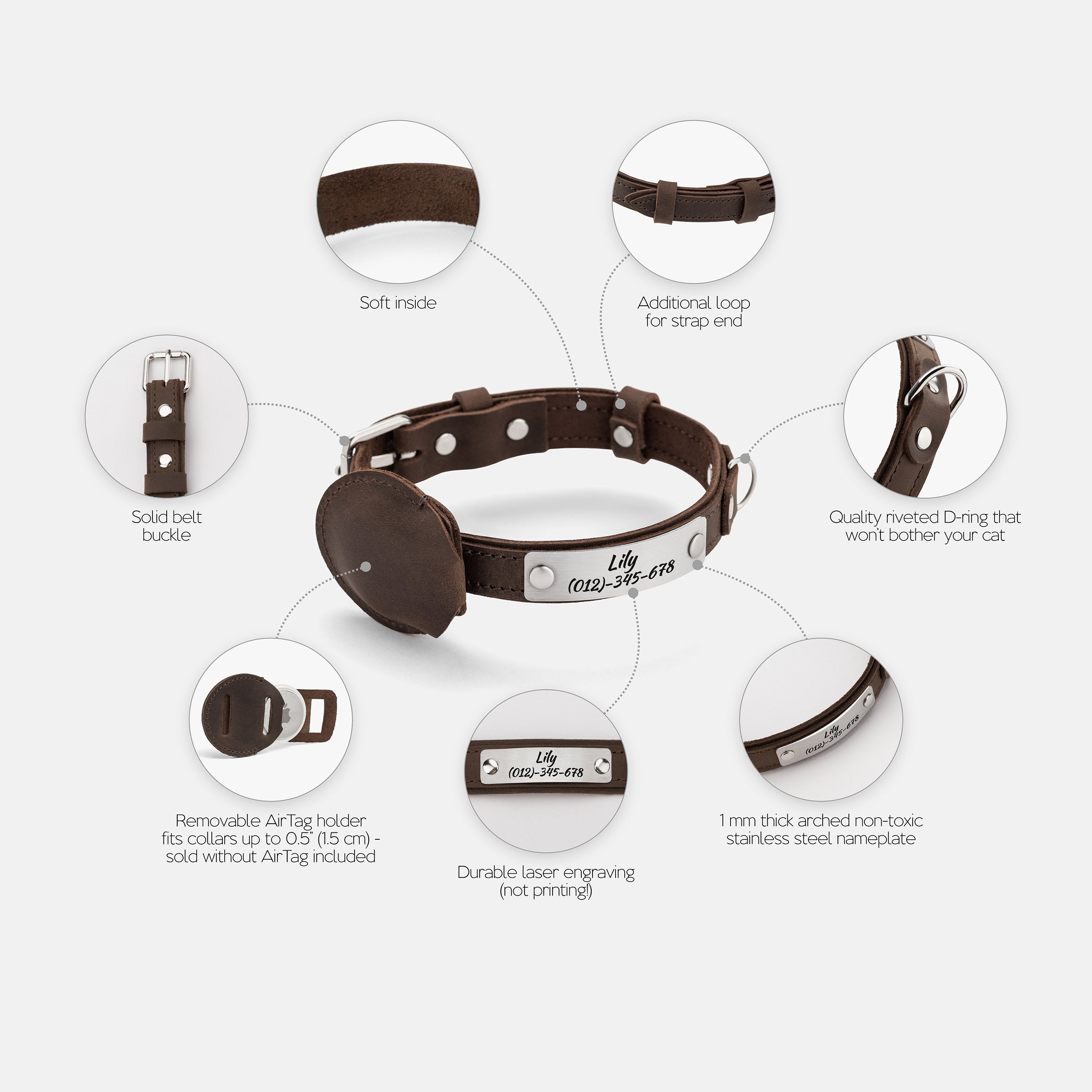 Made from durable leather, this lightweight cat collar is built for comfort and everyday wear. The adjustable buckle ensures a secure fit, while the extra loop keeps the strap neatly in place. A removable AirTag holder and D-ring add convenience for tracking and leash use. Finished with a silent, laser-engraved nameplate, it keeps your cat safely identified – without the jingle.