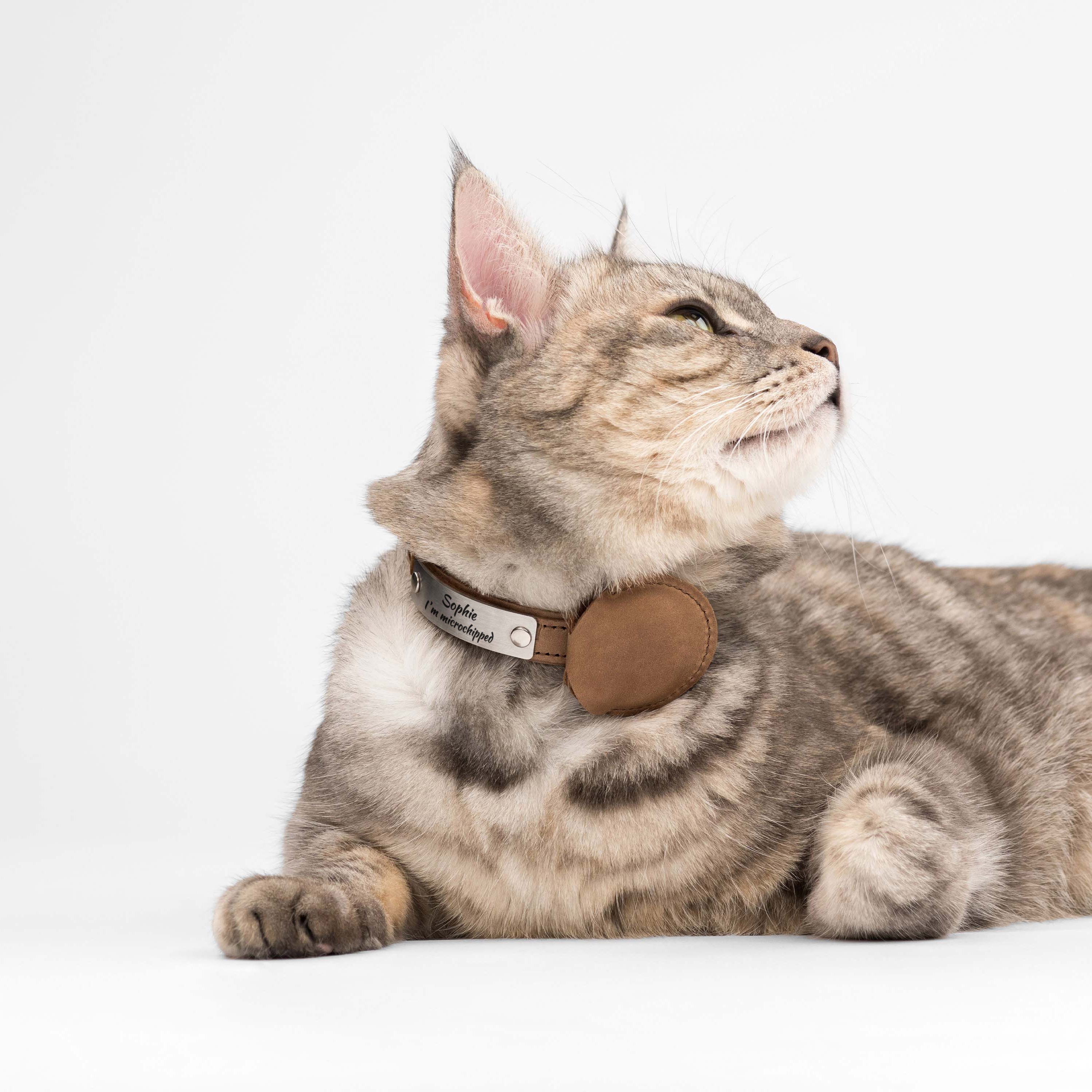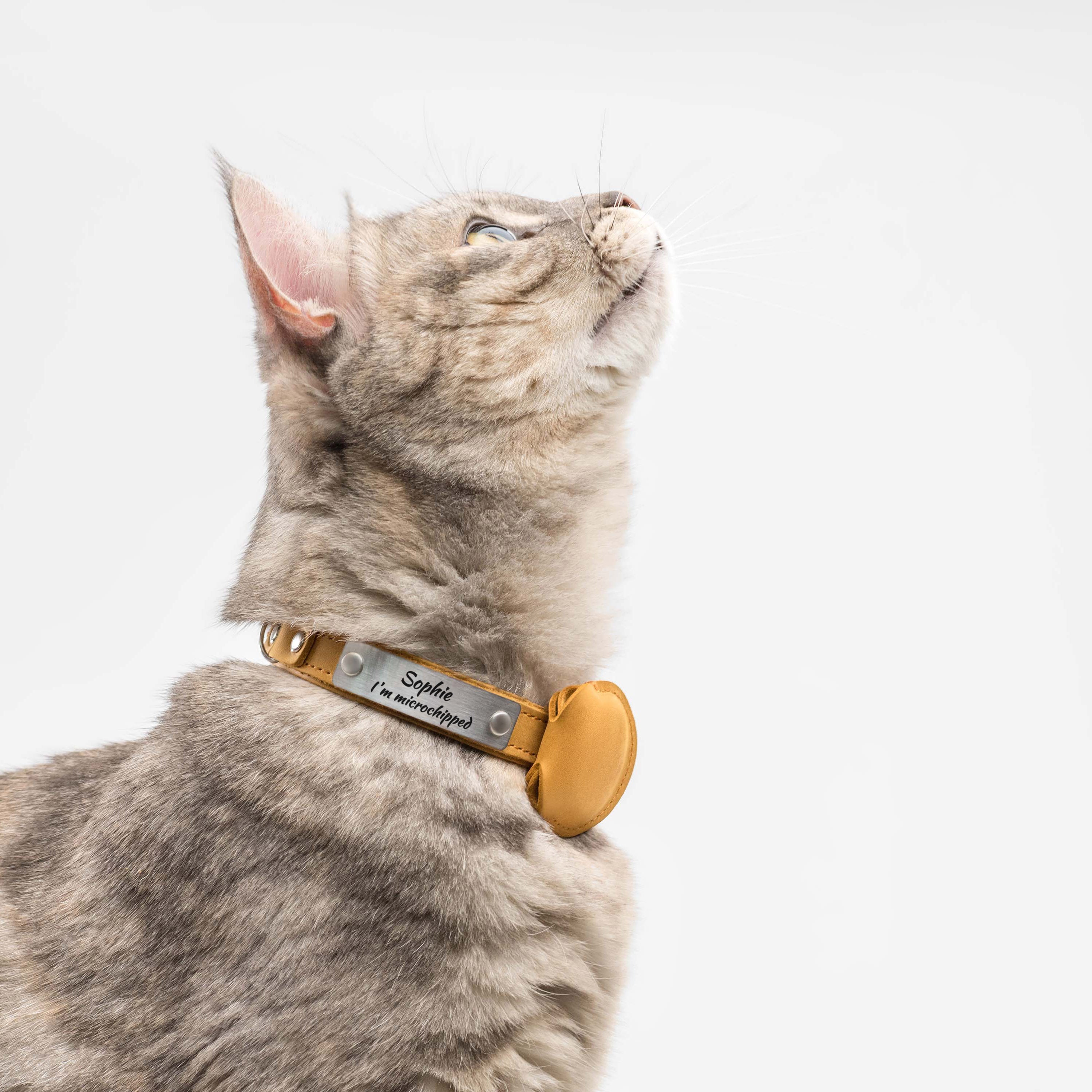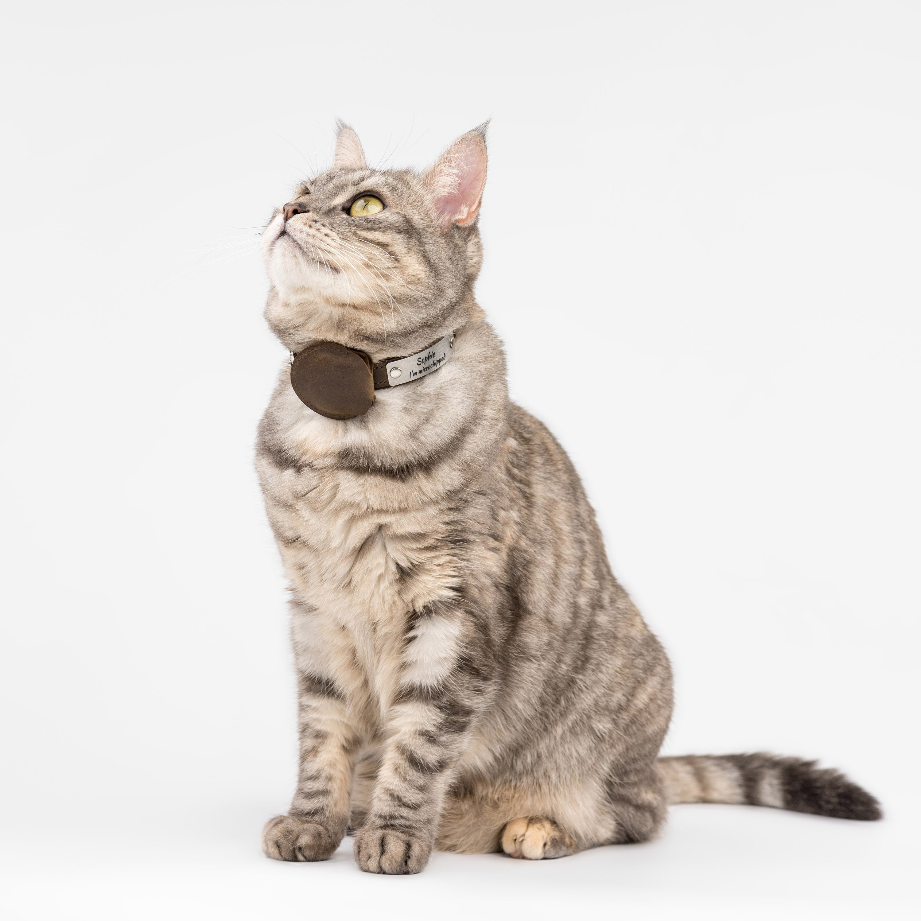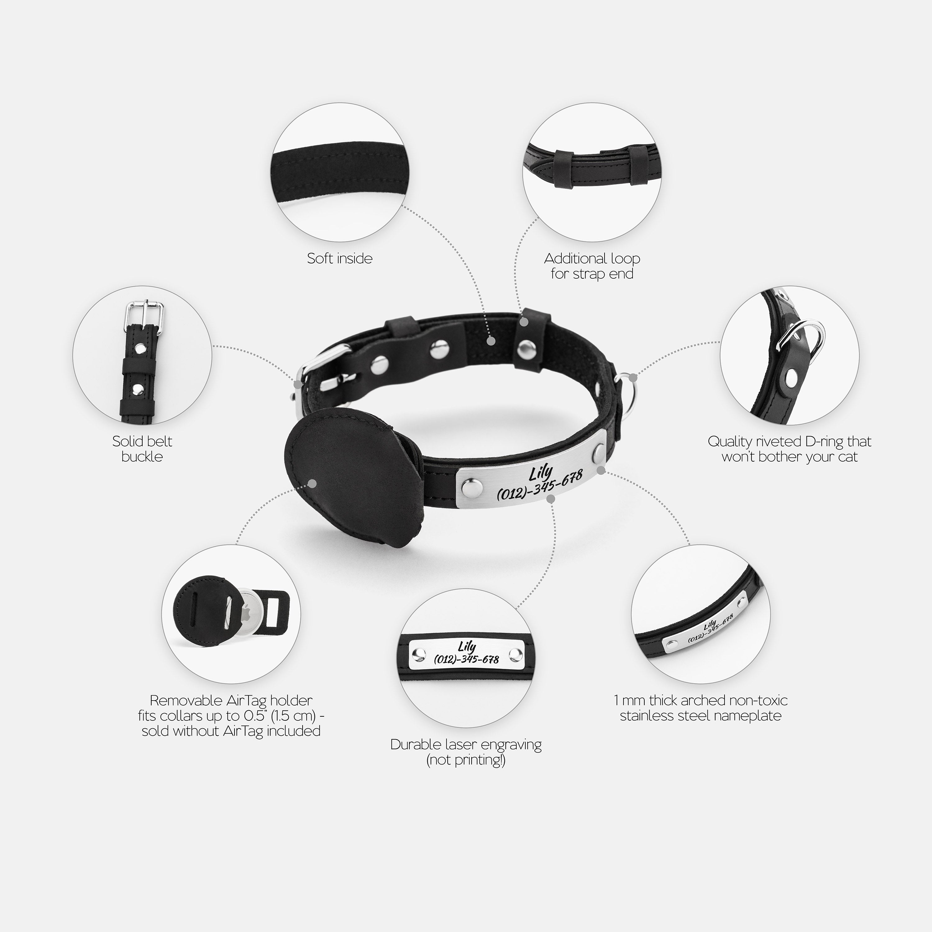 Made from durable leather, this lightweight cat collar is built for comfort and everyday wear. The adjustable buckle ensures a secure fit, while the extra loop keeps the strap neatly in place. A removable AirTag holder and D-ring add convenience for tracking and leash use. Finished with a silent, laser-engraved nameplate, it keeps your cat safely identified – without the jingle.