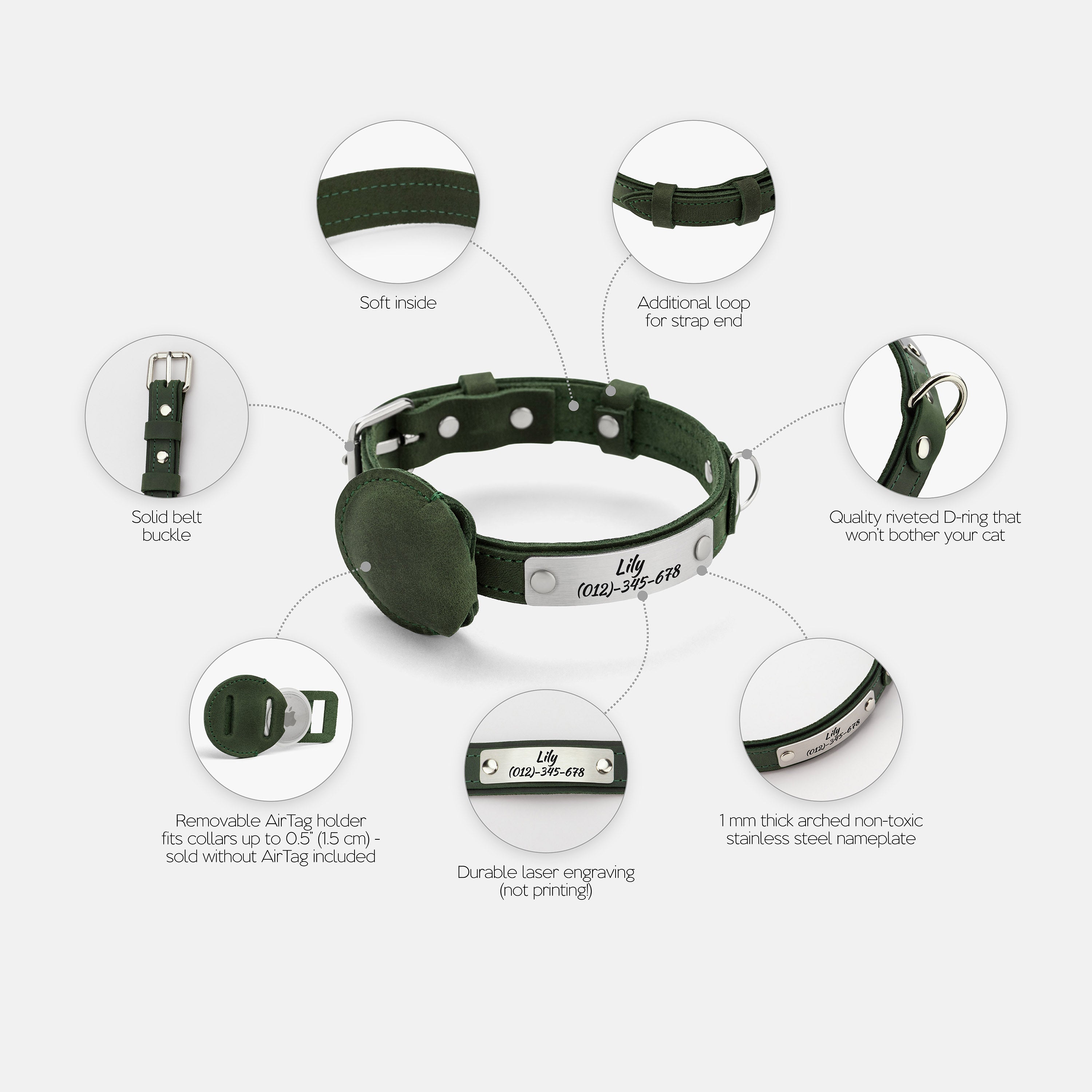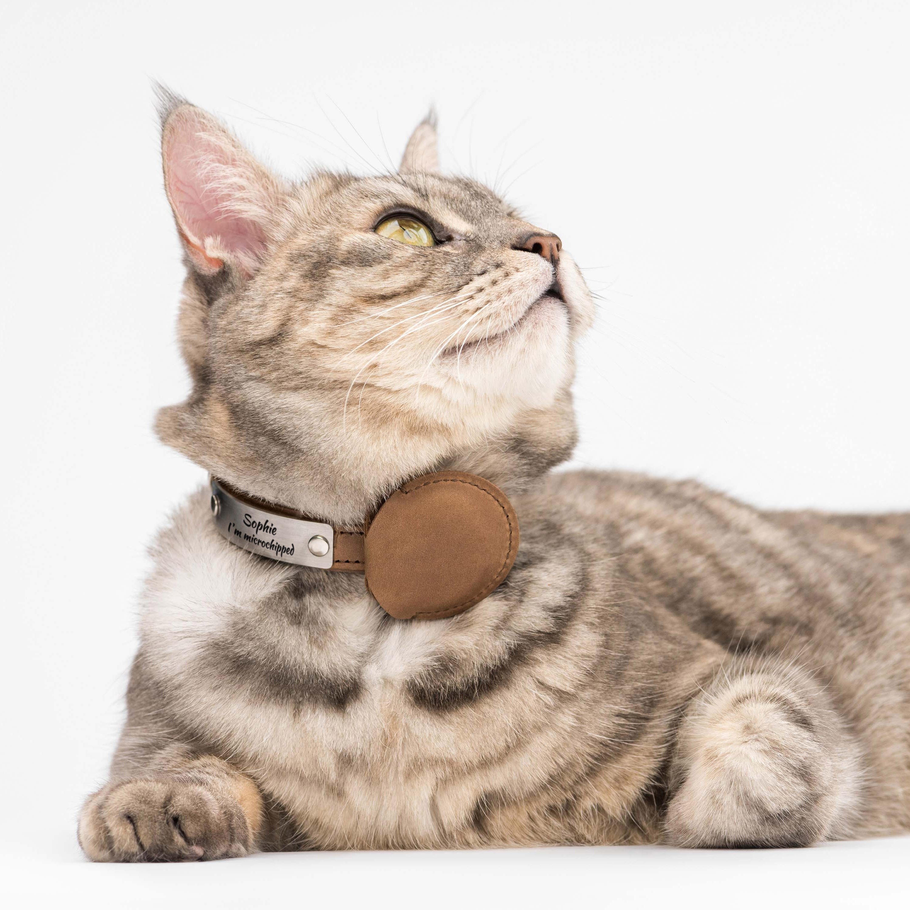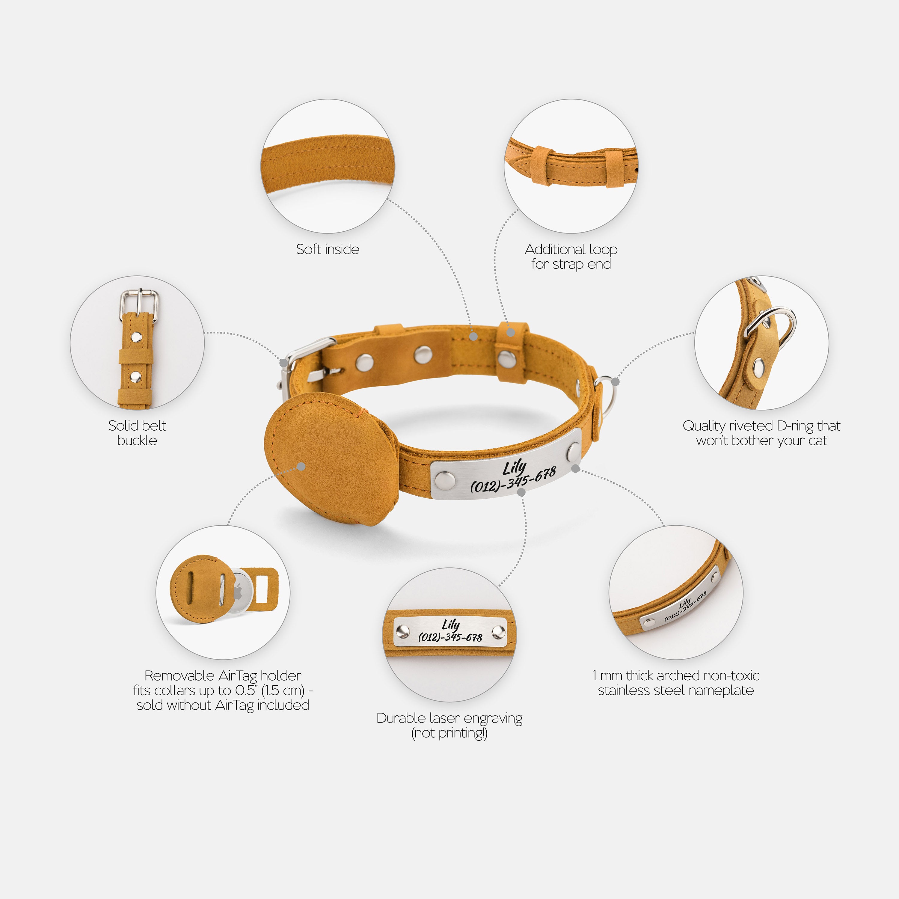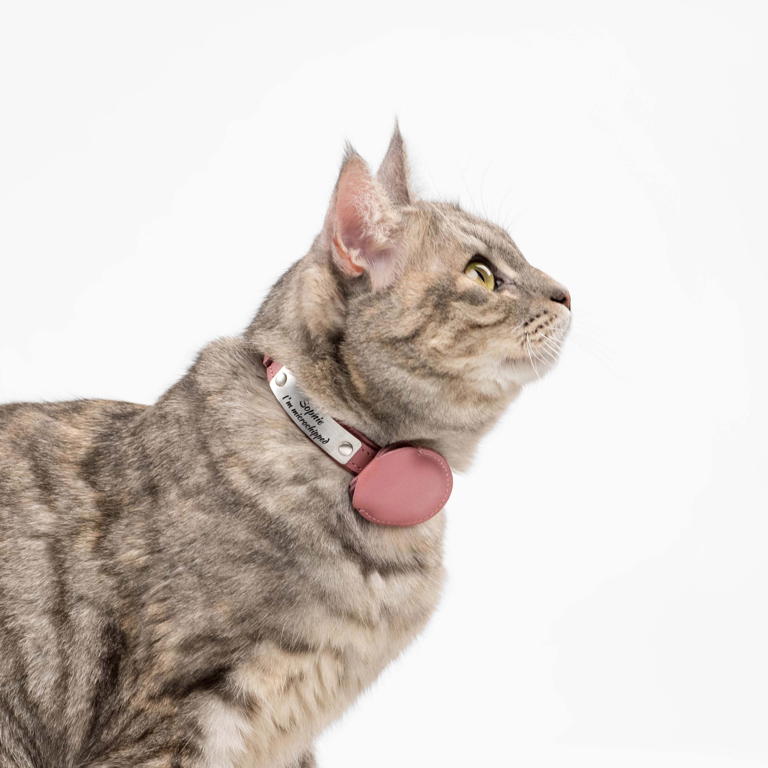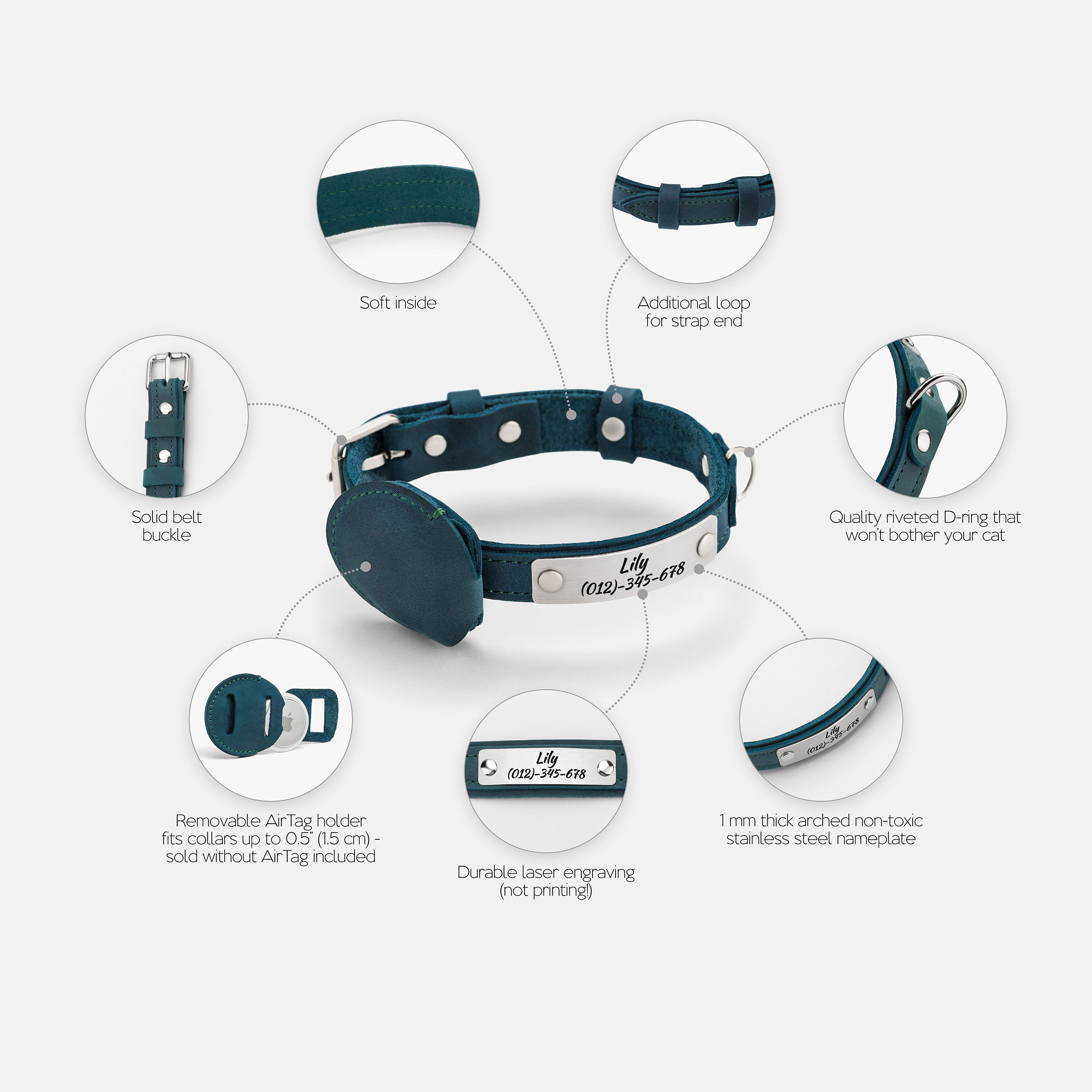 Made from durable leather, this lightweight cat collar is built for comfort and everyday wear. The adjustable buckle ensures a secure fit, while the extra loop keeps the strap neatly in place. A removable AirTag holder and D-ring add convenience for tracking and leash use. Finished with a silent, laser-engraved nameplate, it keeps your cat safely identified – without the jingle.
