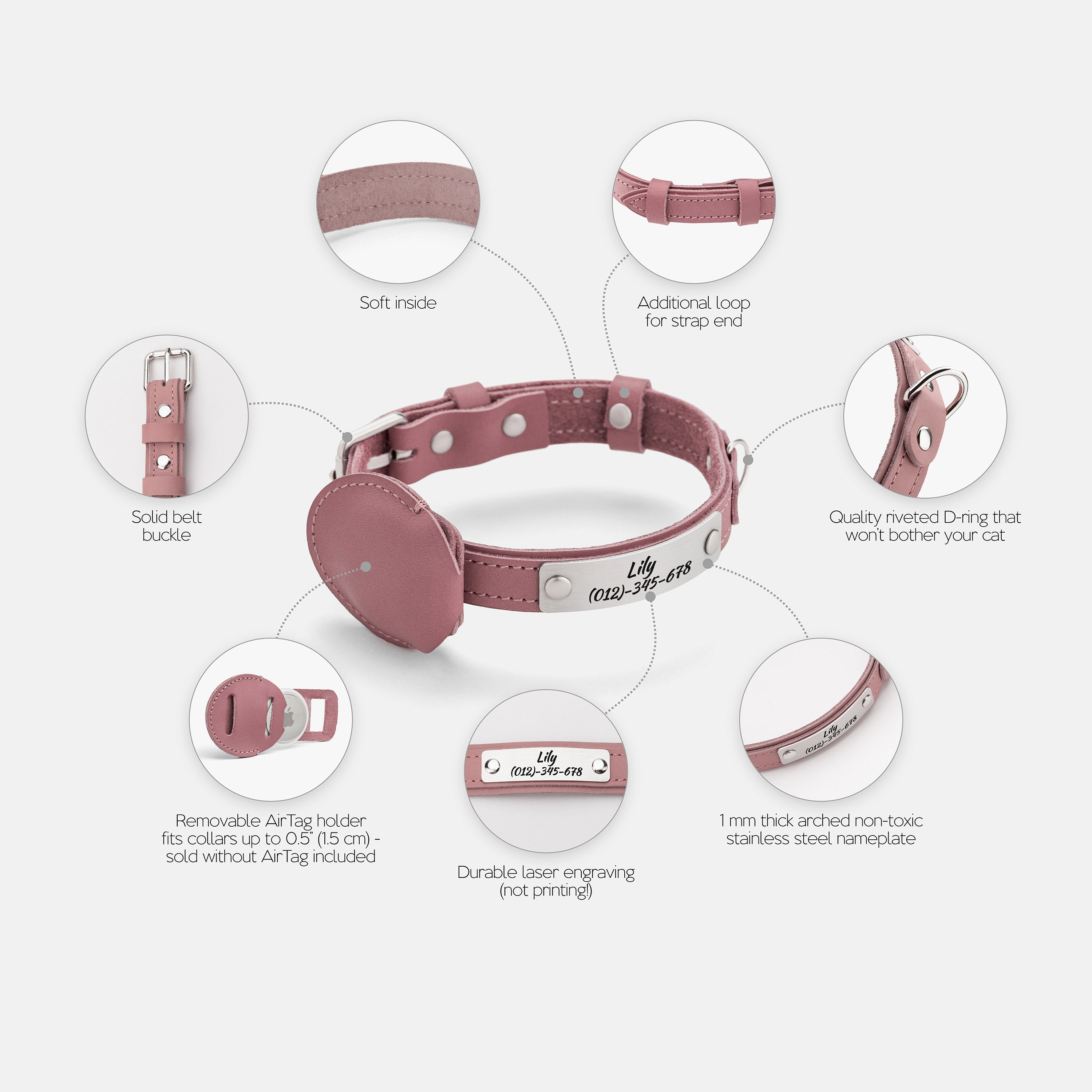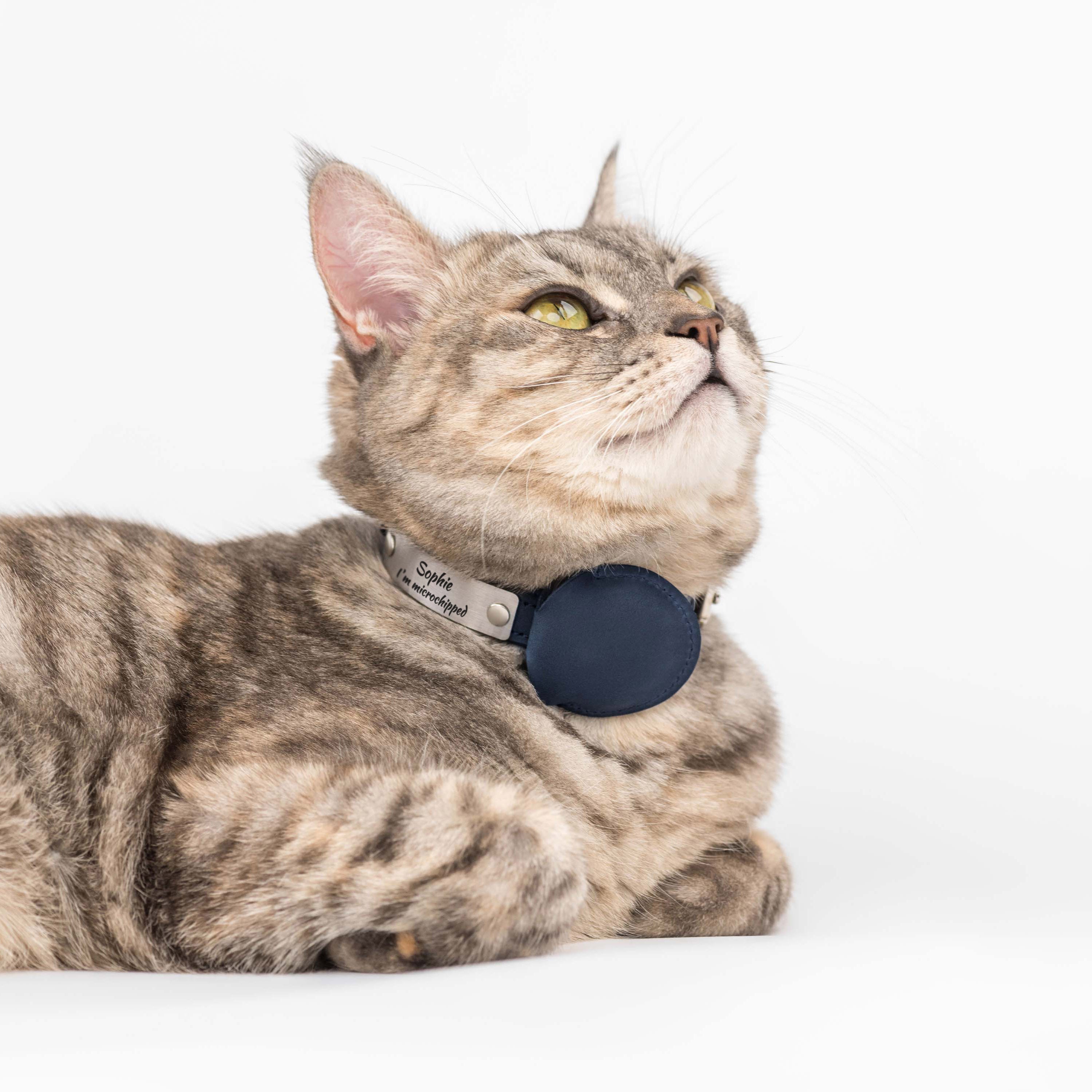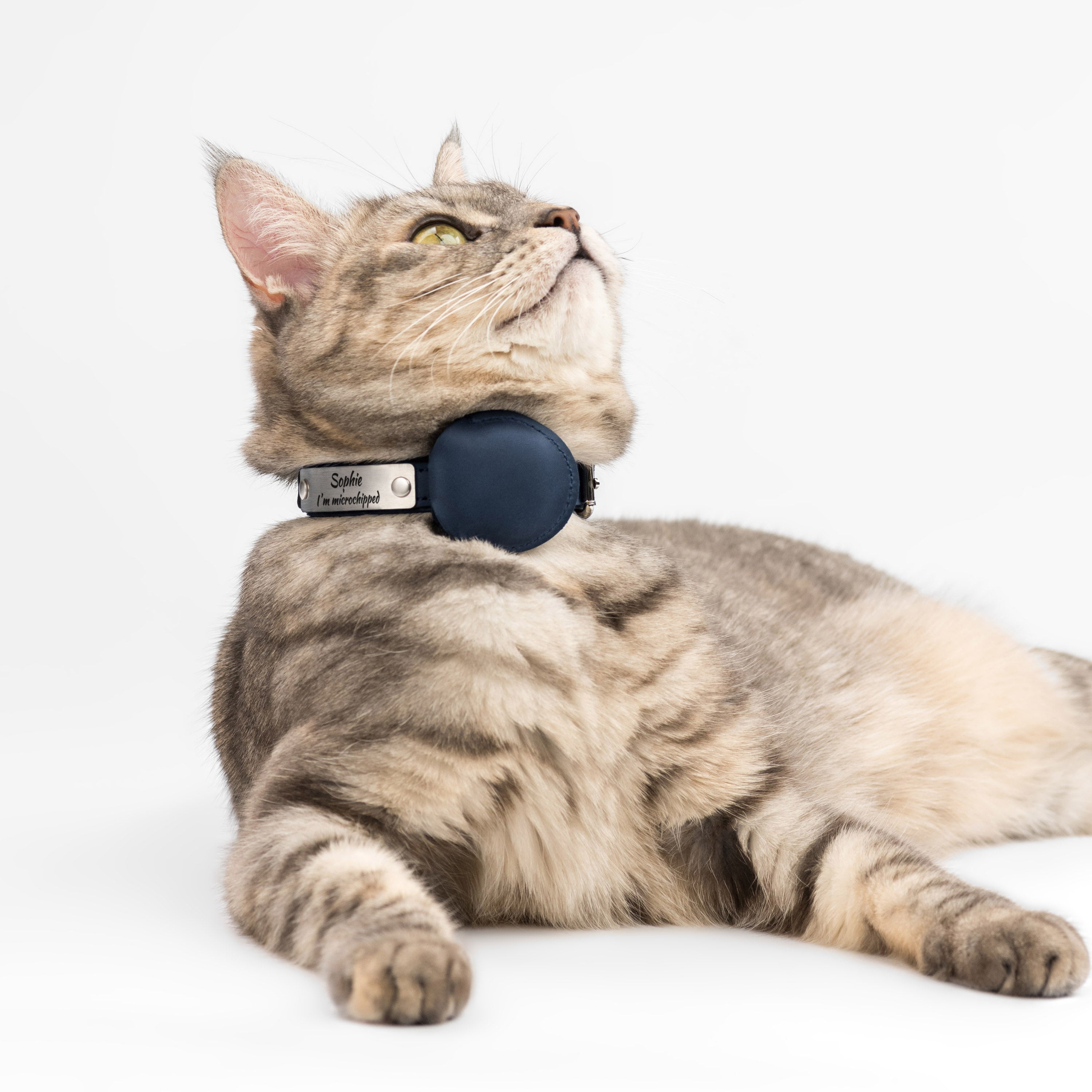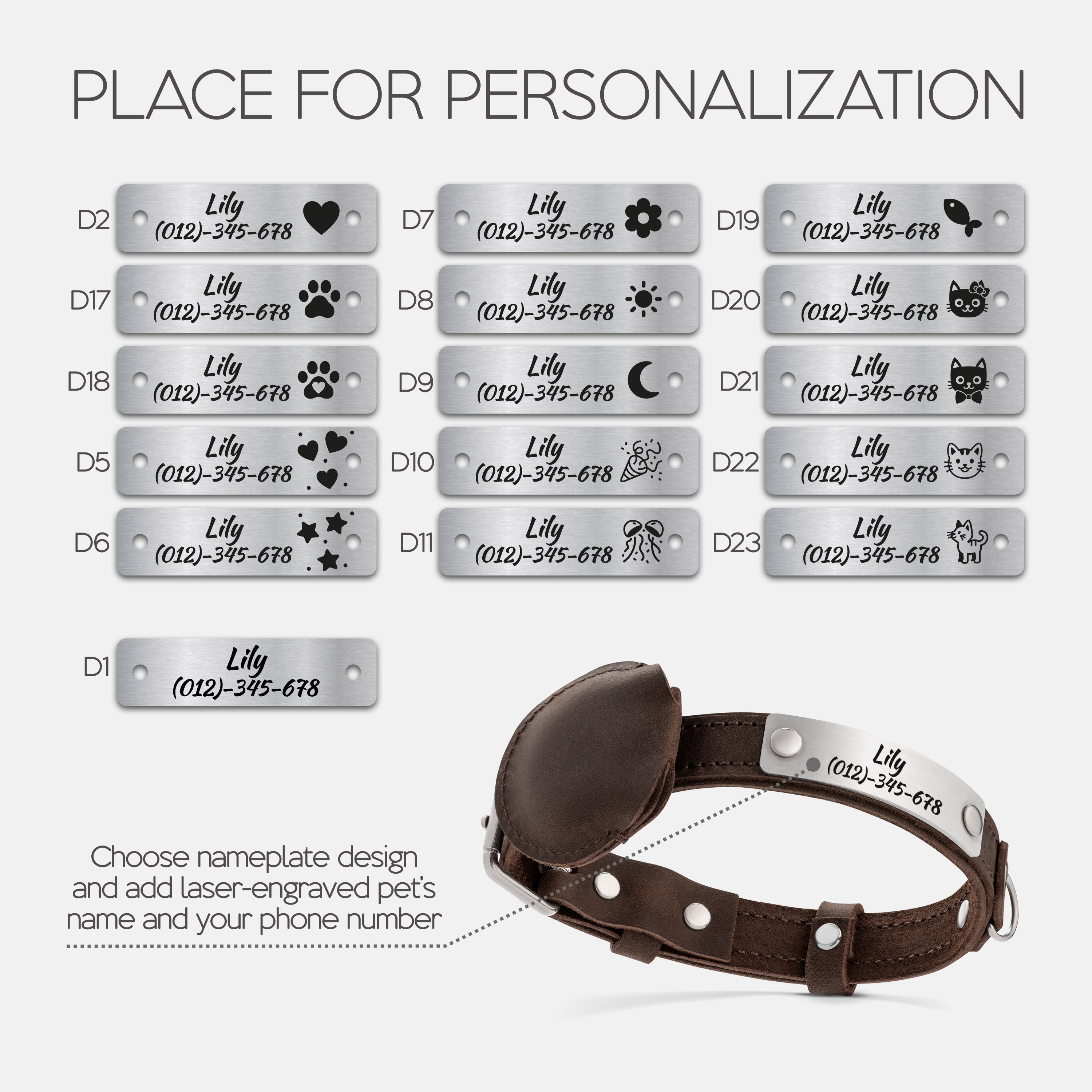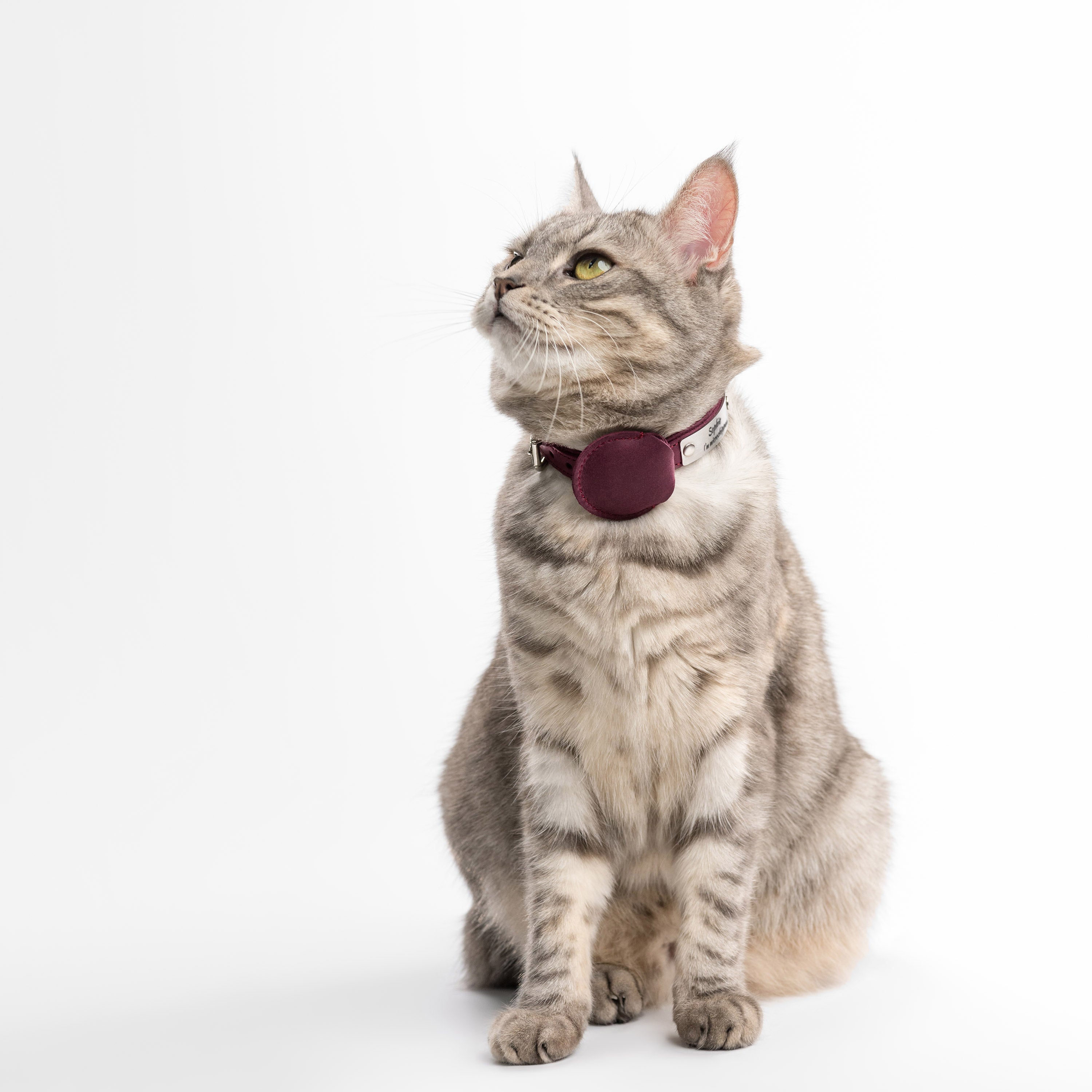 Made from durable leather, this lightweight cat collar is built for comfort and everyday wear. The adjustable buckle ensures a secure fit, while the extra loop keeps the strap neatly in place. A removable AirTag holder and D-ring add convenience for tracking and leash use. Finished with a silent, laser-engraved nameplate, it keeps your cat safely identified – without the jingle.
