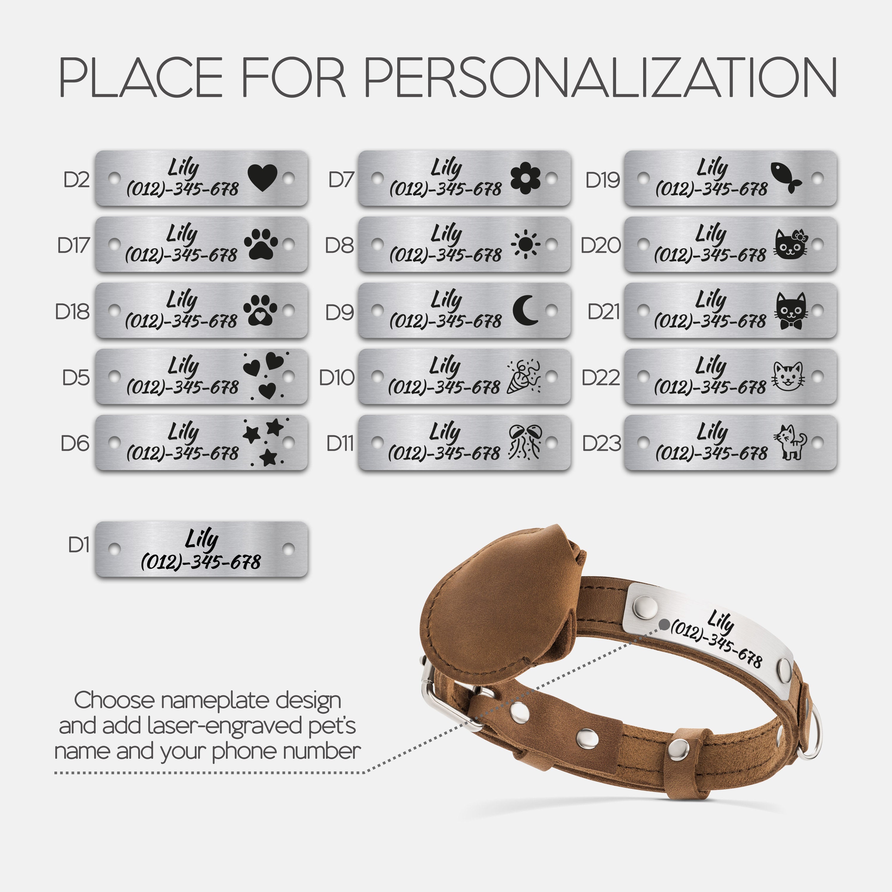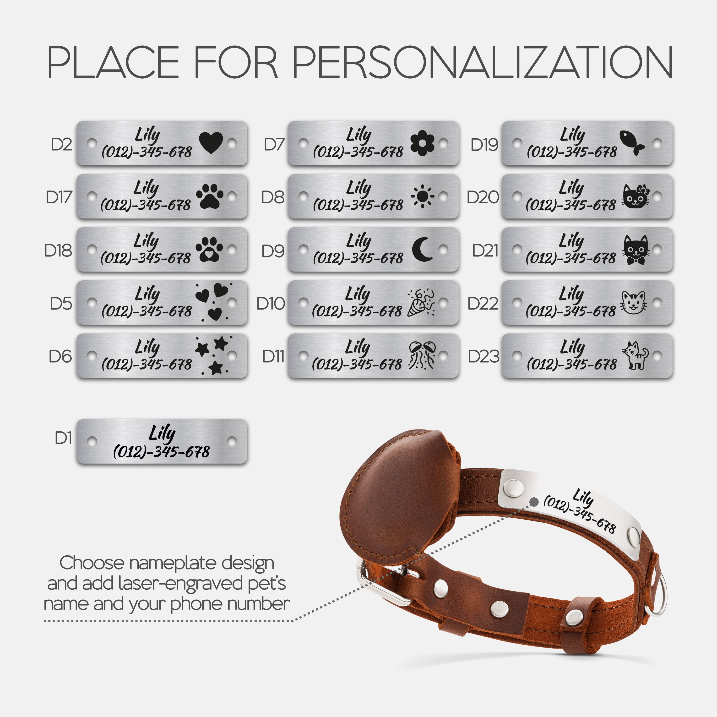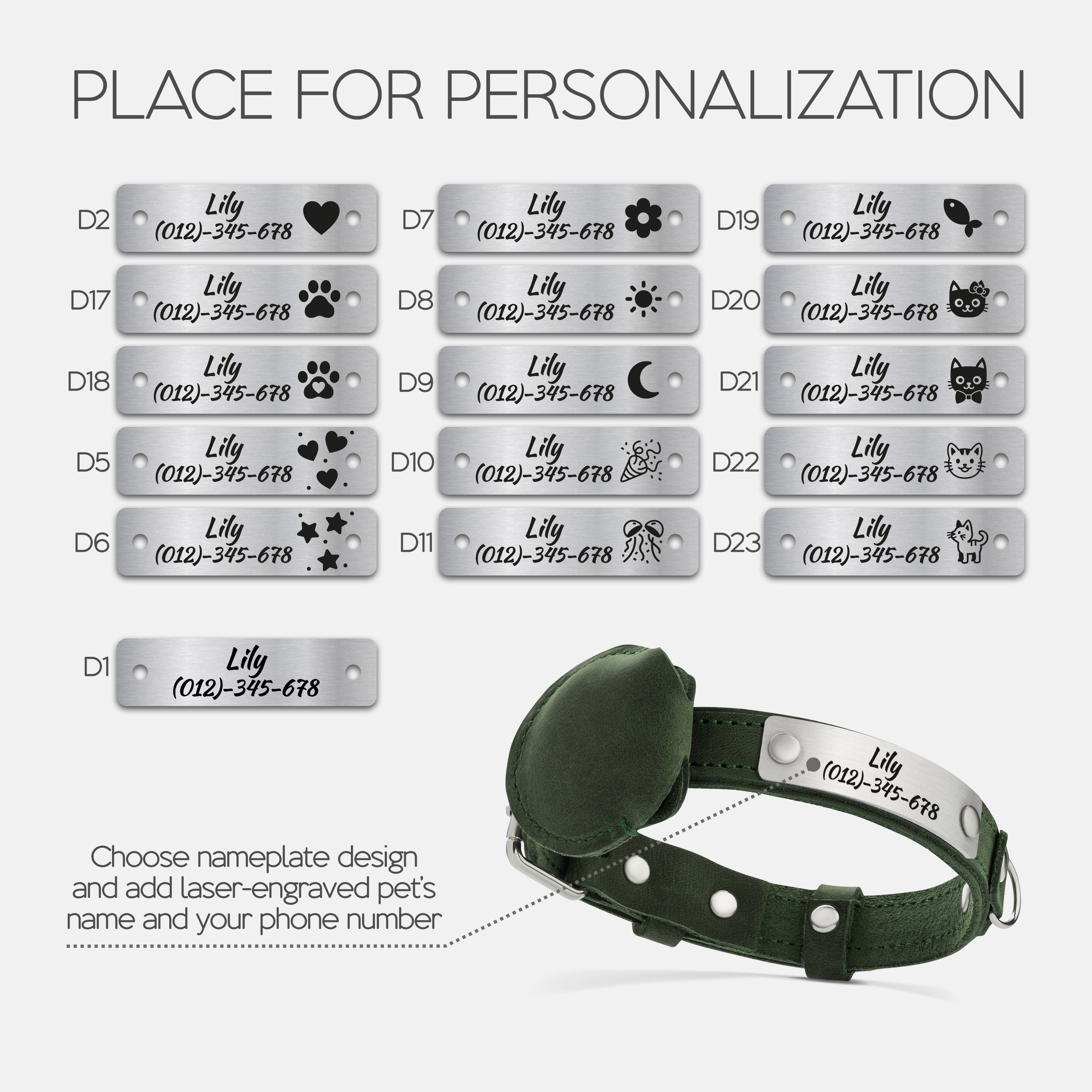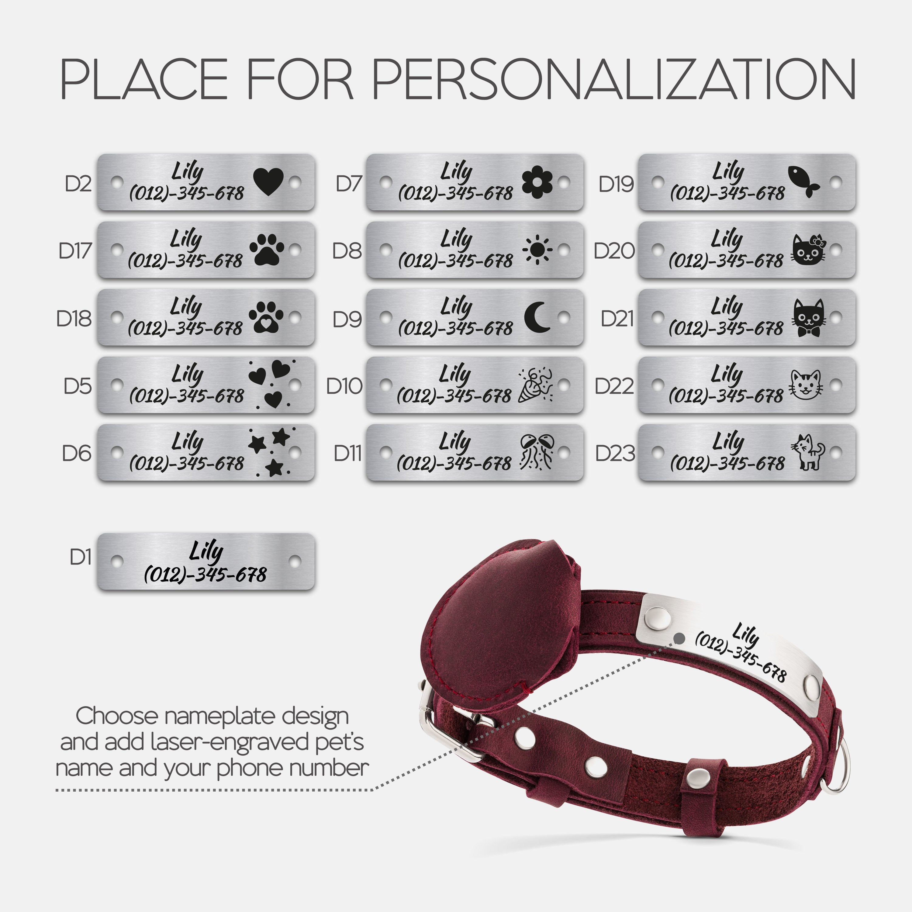 Made from durable leather, this lightweight cat collar is built for comfort and everyday wear. The adjustable buckle ensures a secure fit, while the extra loop keeps the strap neatly in place. A removable AirTag holder and D-ring add convenience for tracking and leash use. Finished with a silent, laser-engraved nameplate, it keeps your cat safely identified – without the jingle.