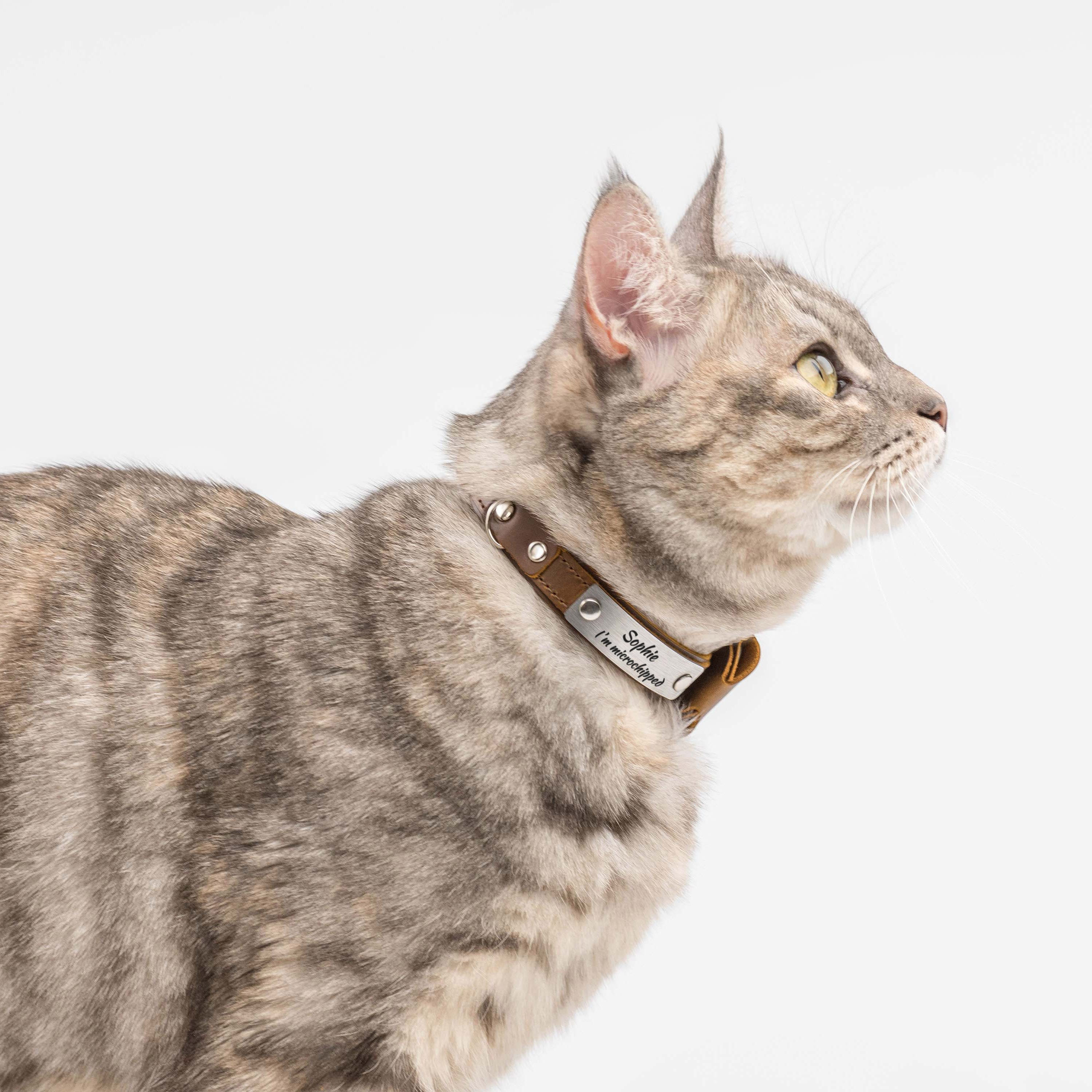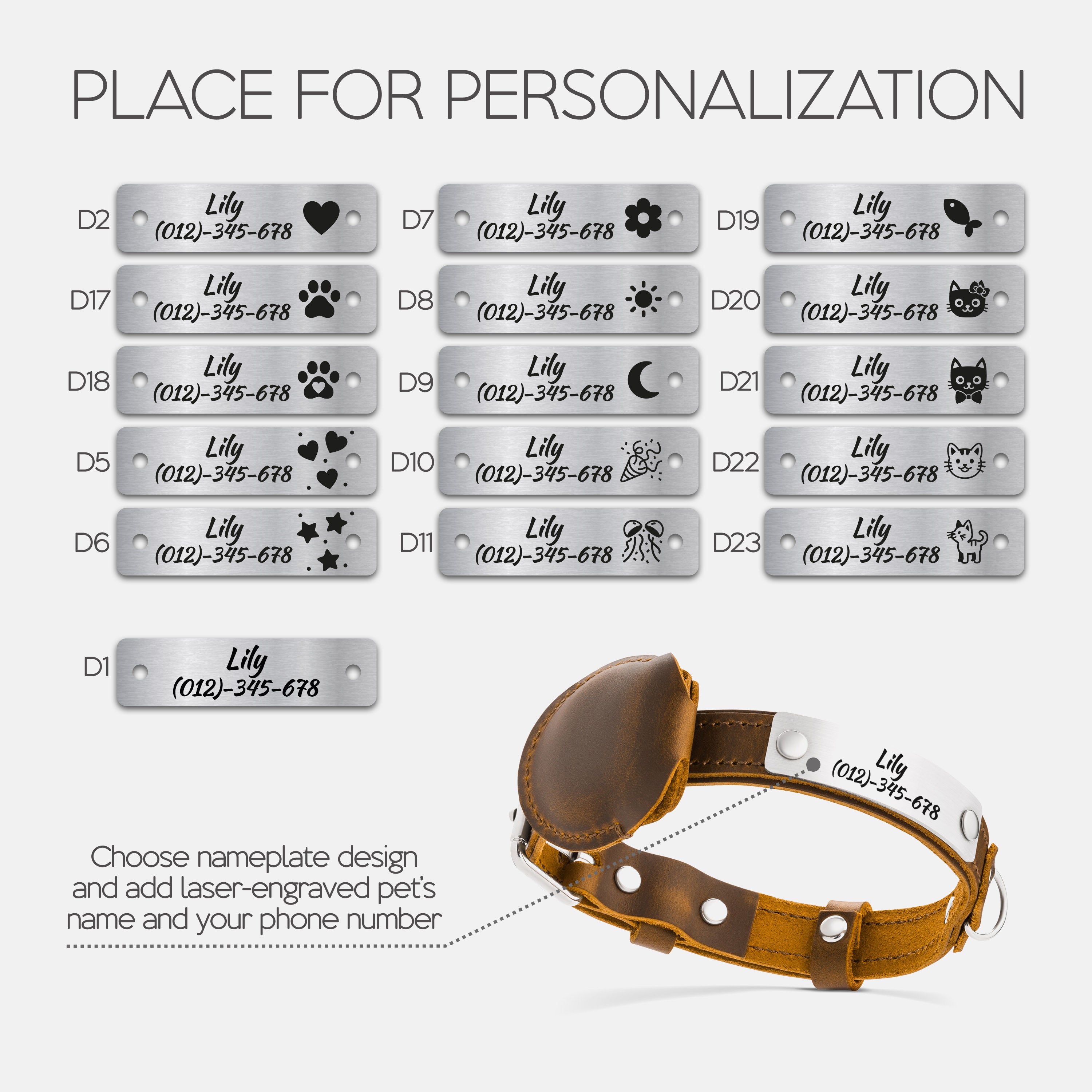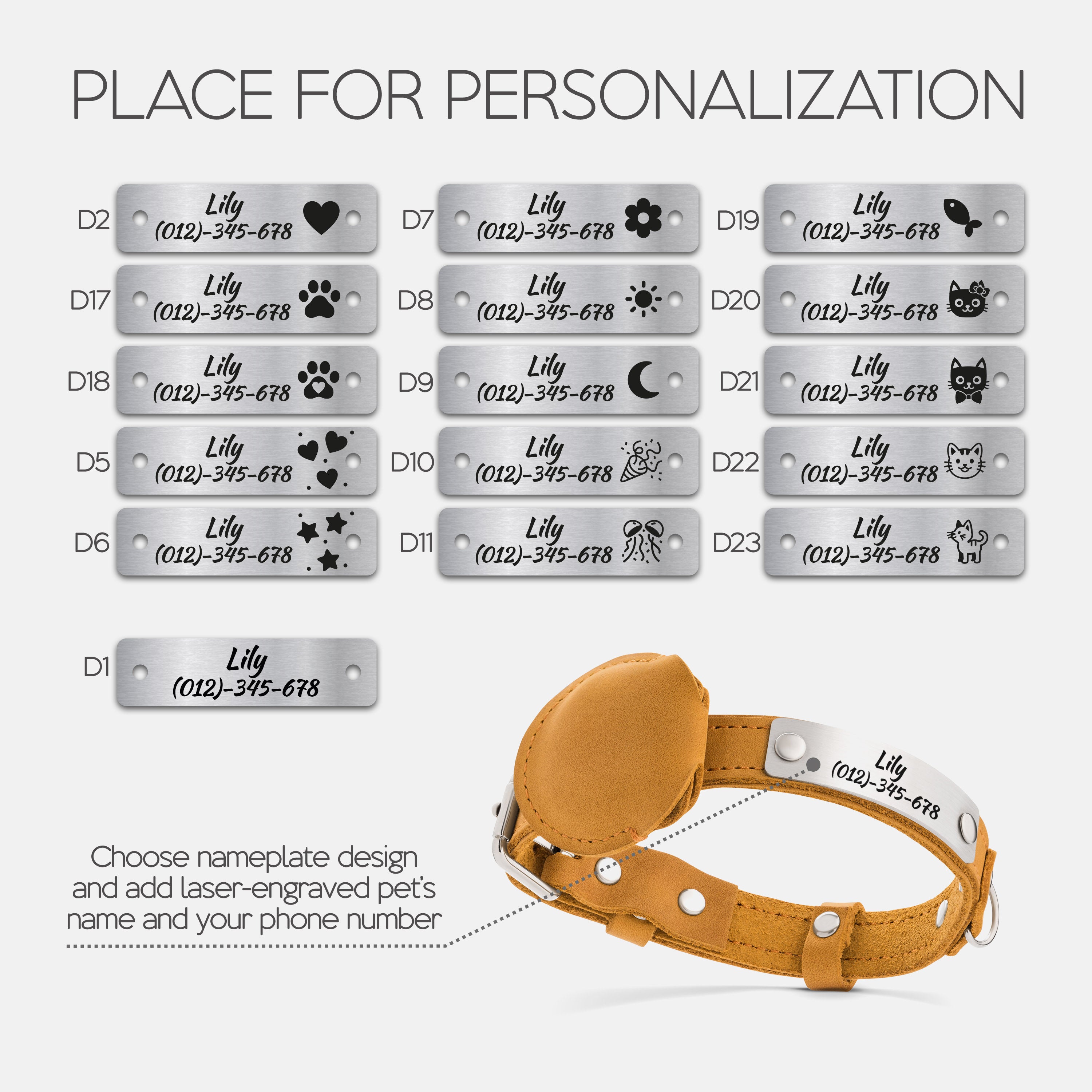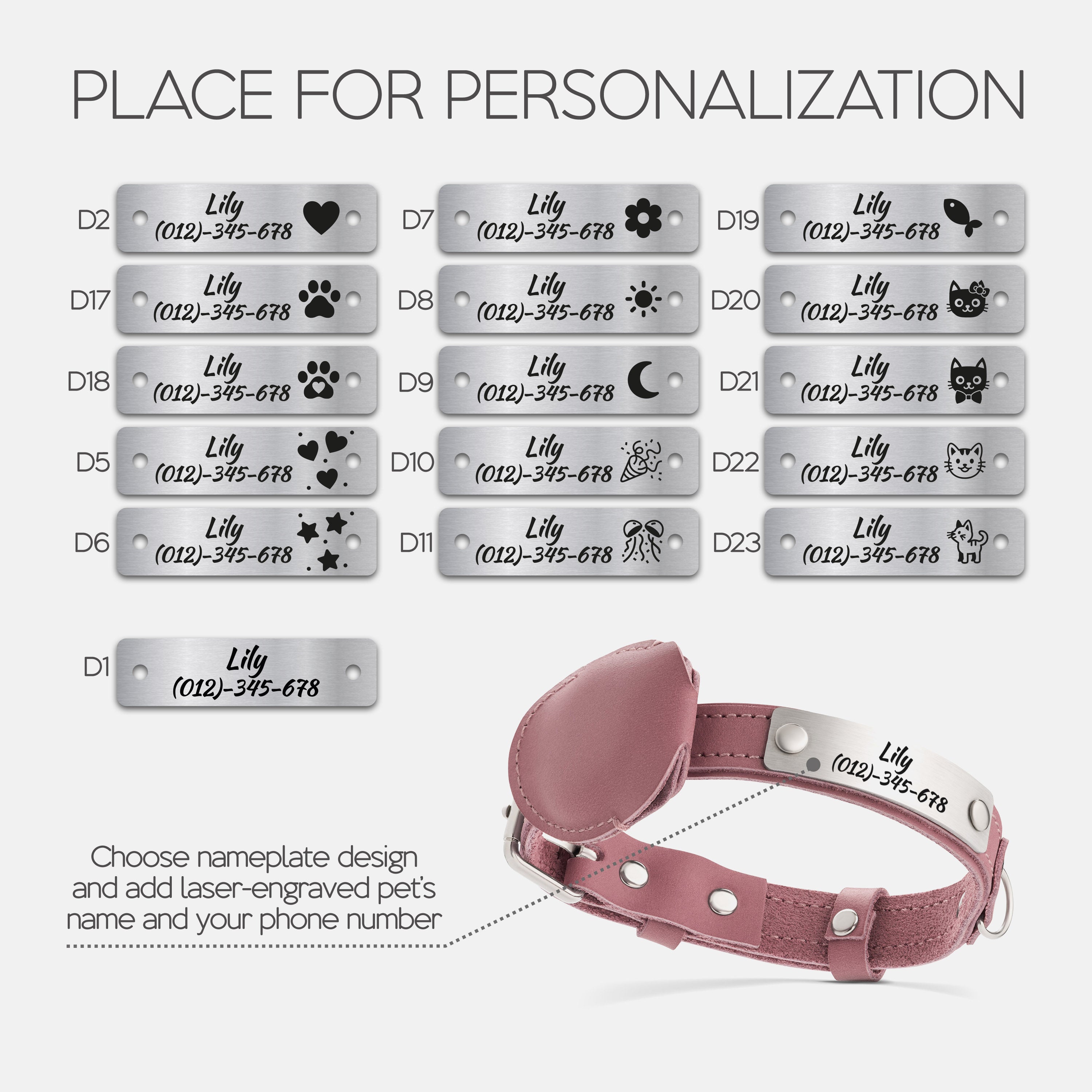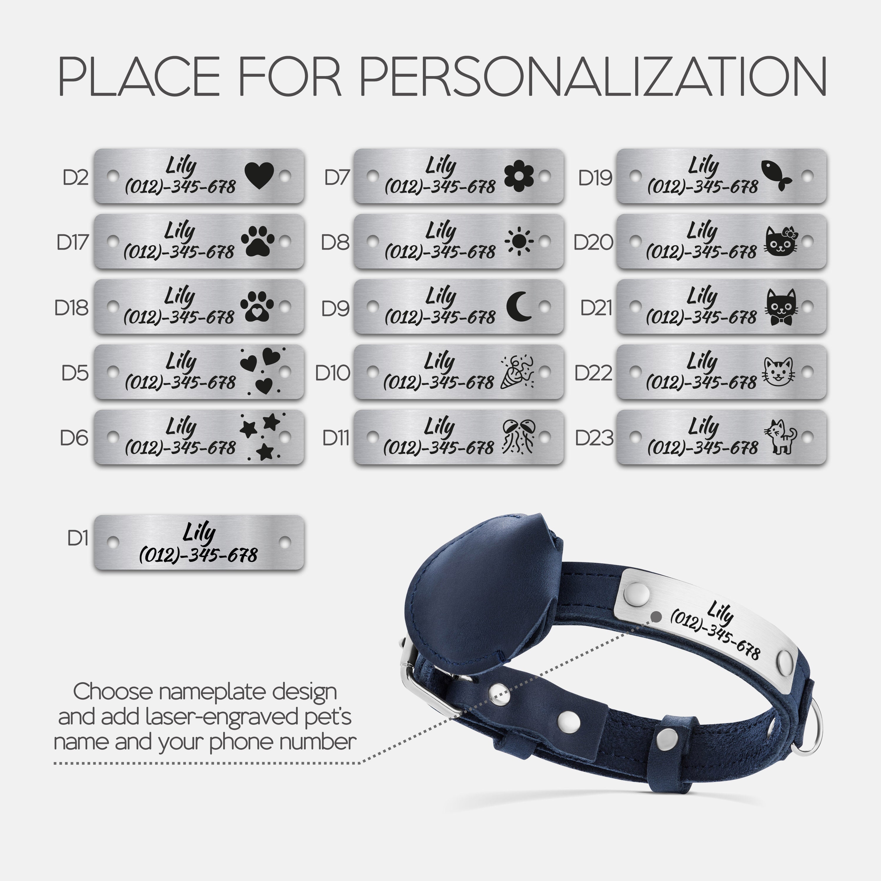 Made from durable leather, this lightweight cat collar is built for comfort and everyday wear. The adjustable buckle ensures a secure fit, while the extra loop keeps the strap neatly in place. A removable AirTag holder and D-ring add convenience for tracking and leash use. Finished with a silent, laser-engraved nameplate, it keeps your cat safely identified – without the jingle.