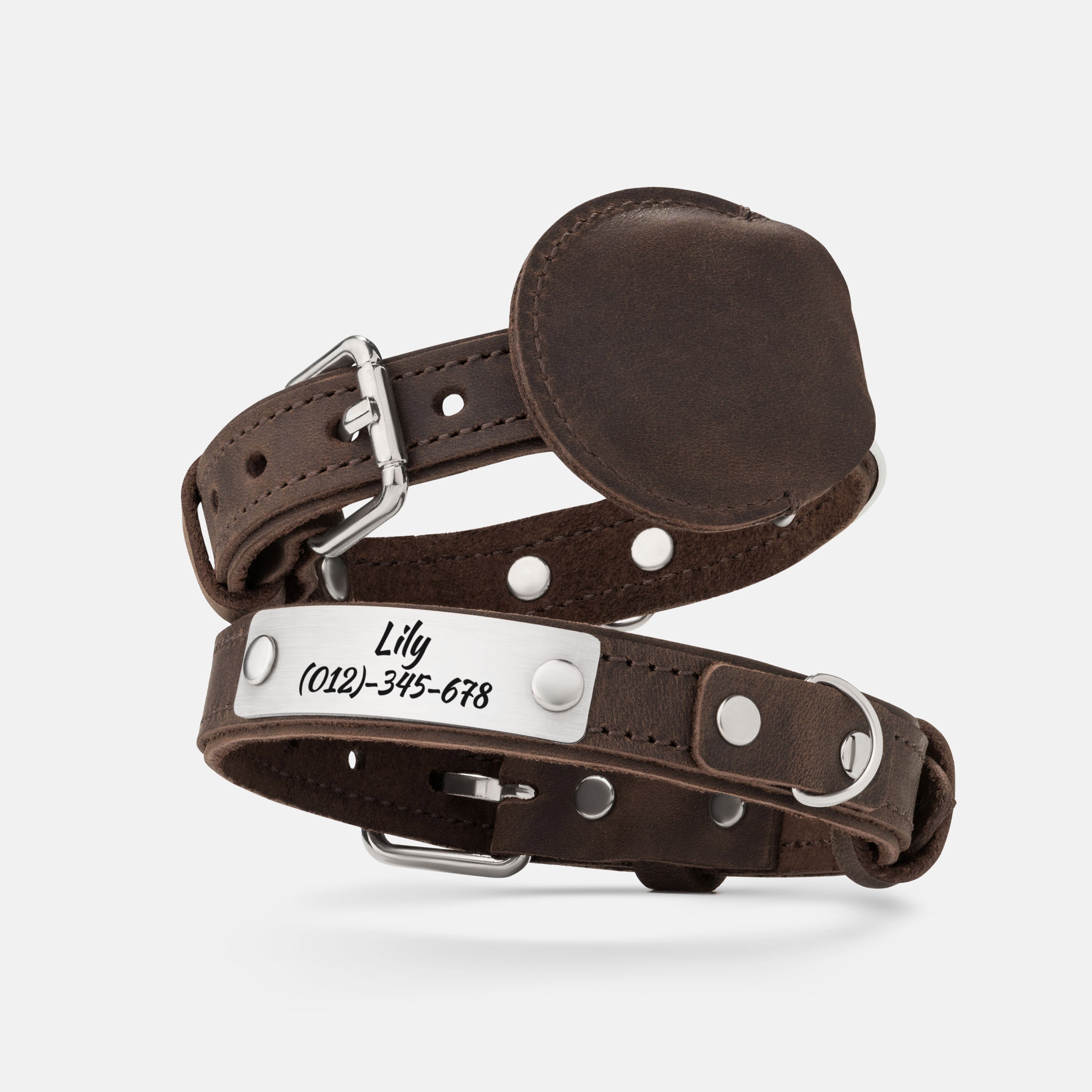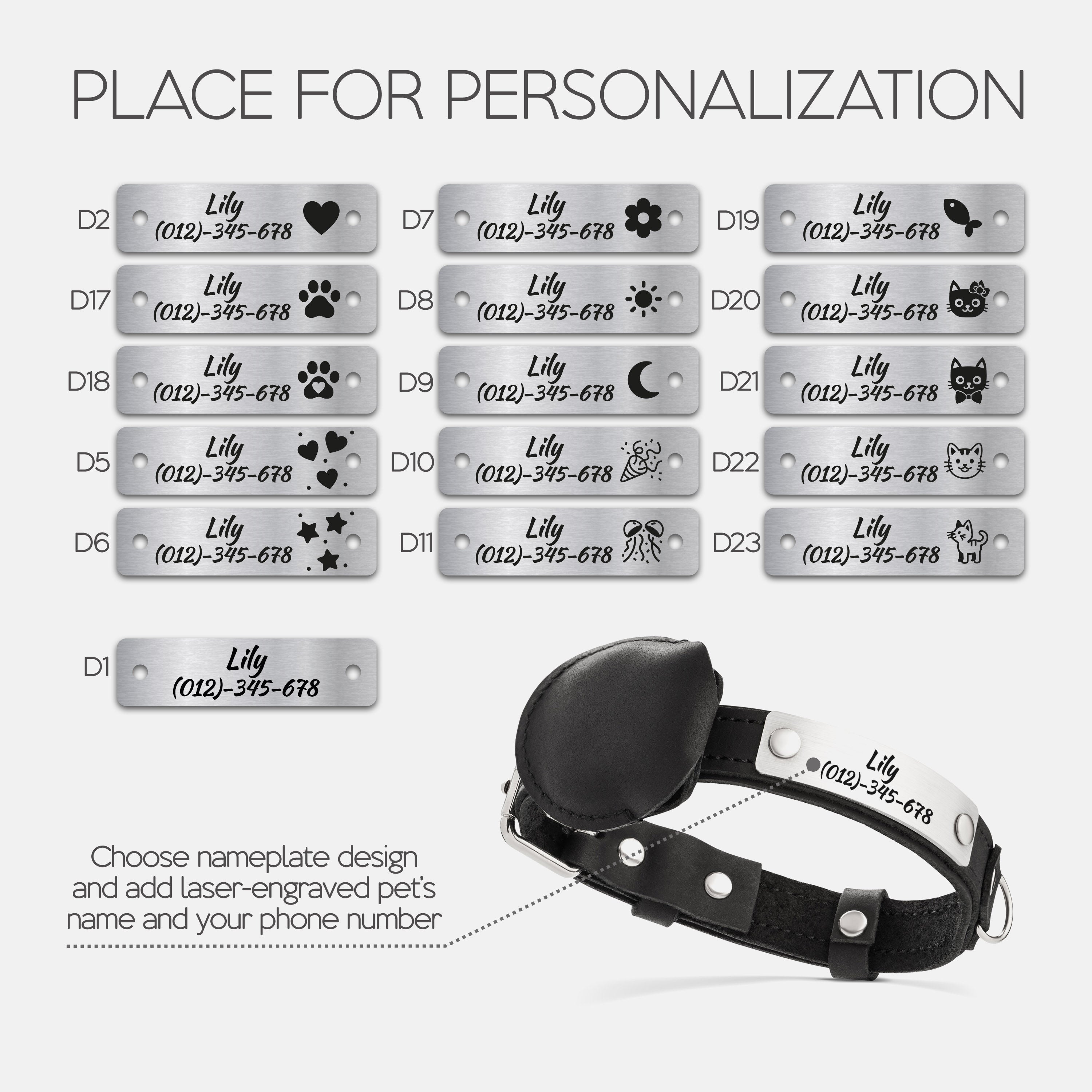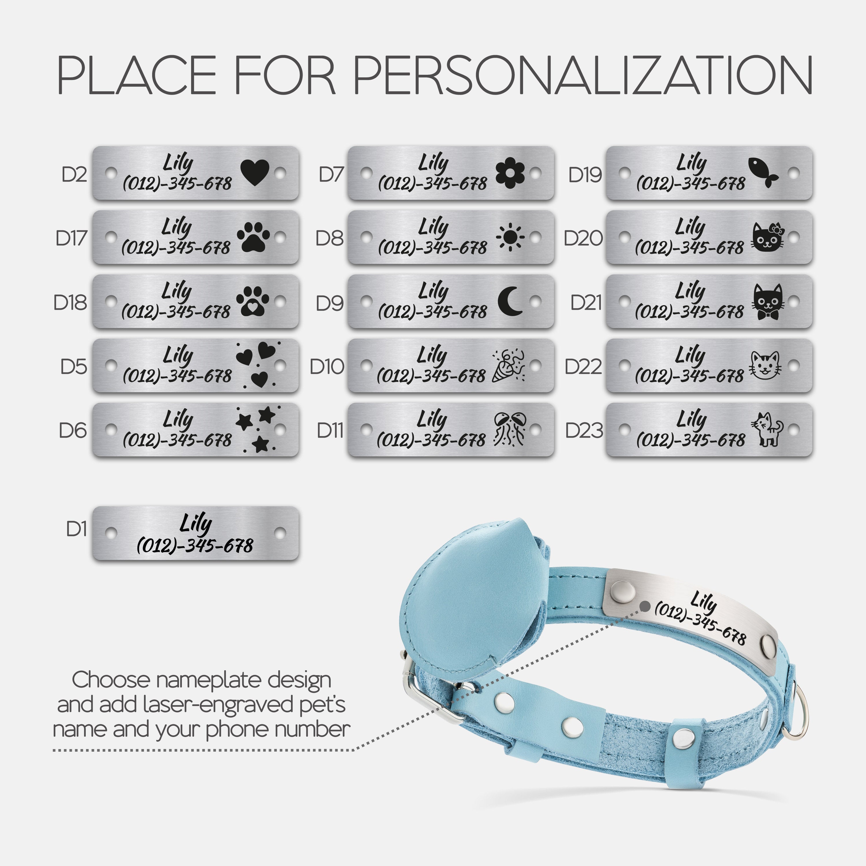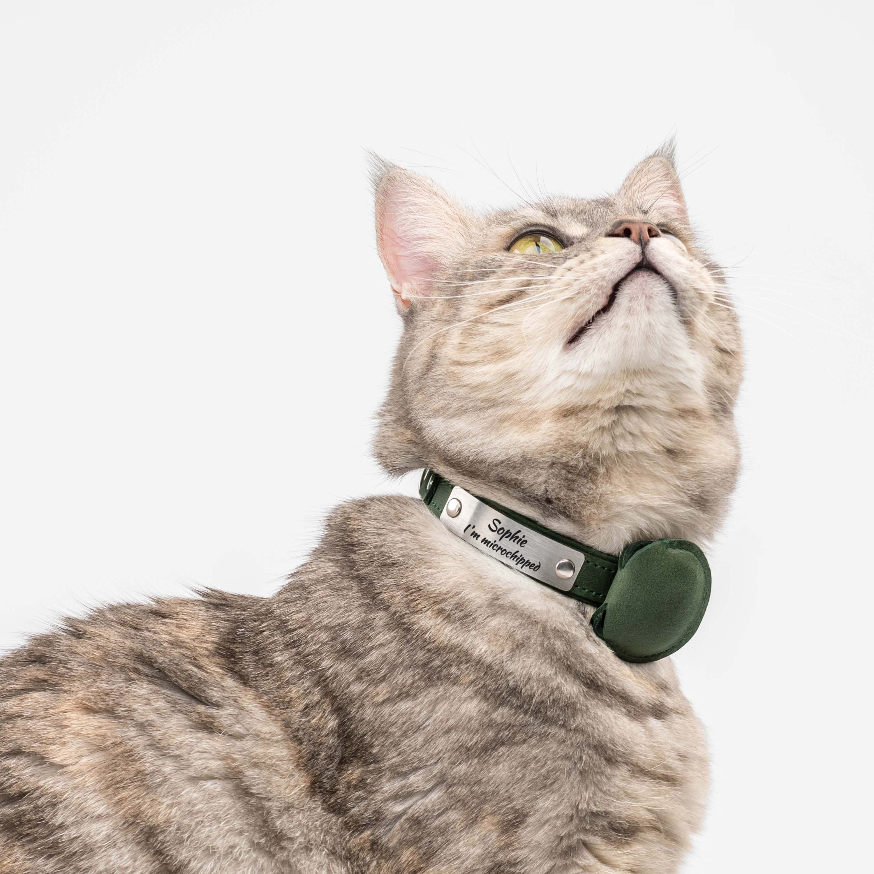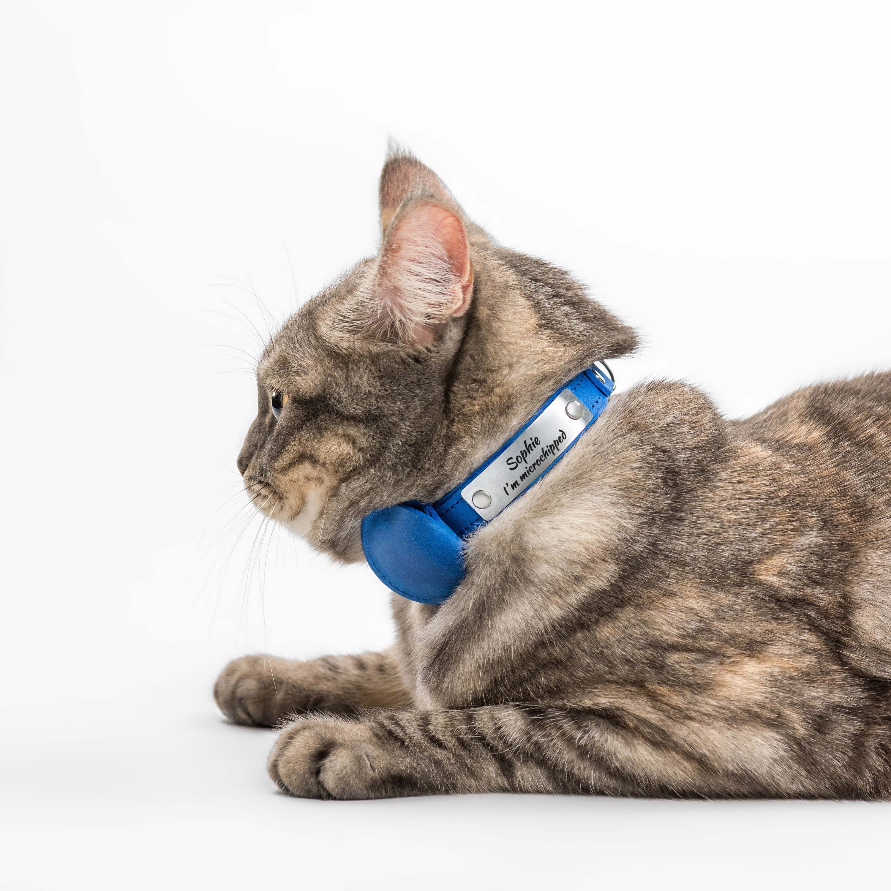 Made from durable leather, this lightweight cat collar is built for comfort and everyday wear. The adjustable buckle ensures a secure fit, while the extra loop keeps the strap neatly in place. A removable AirTag holder and D-ring add convenience for tracking and leash use. Finished with a silent, laser-engraved nameplate, it keeps your cat safely identified – without the jingle.