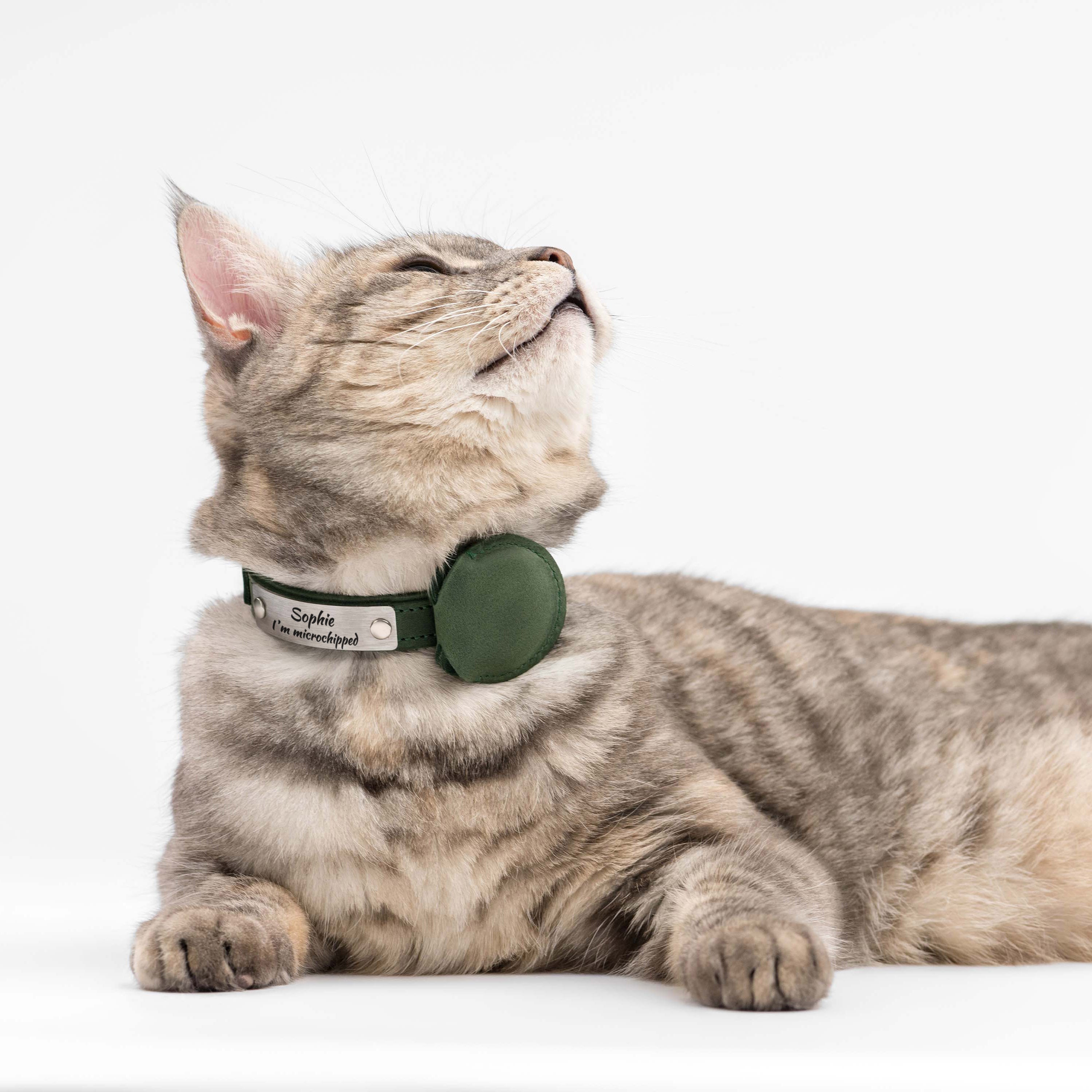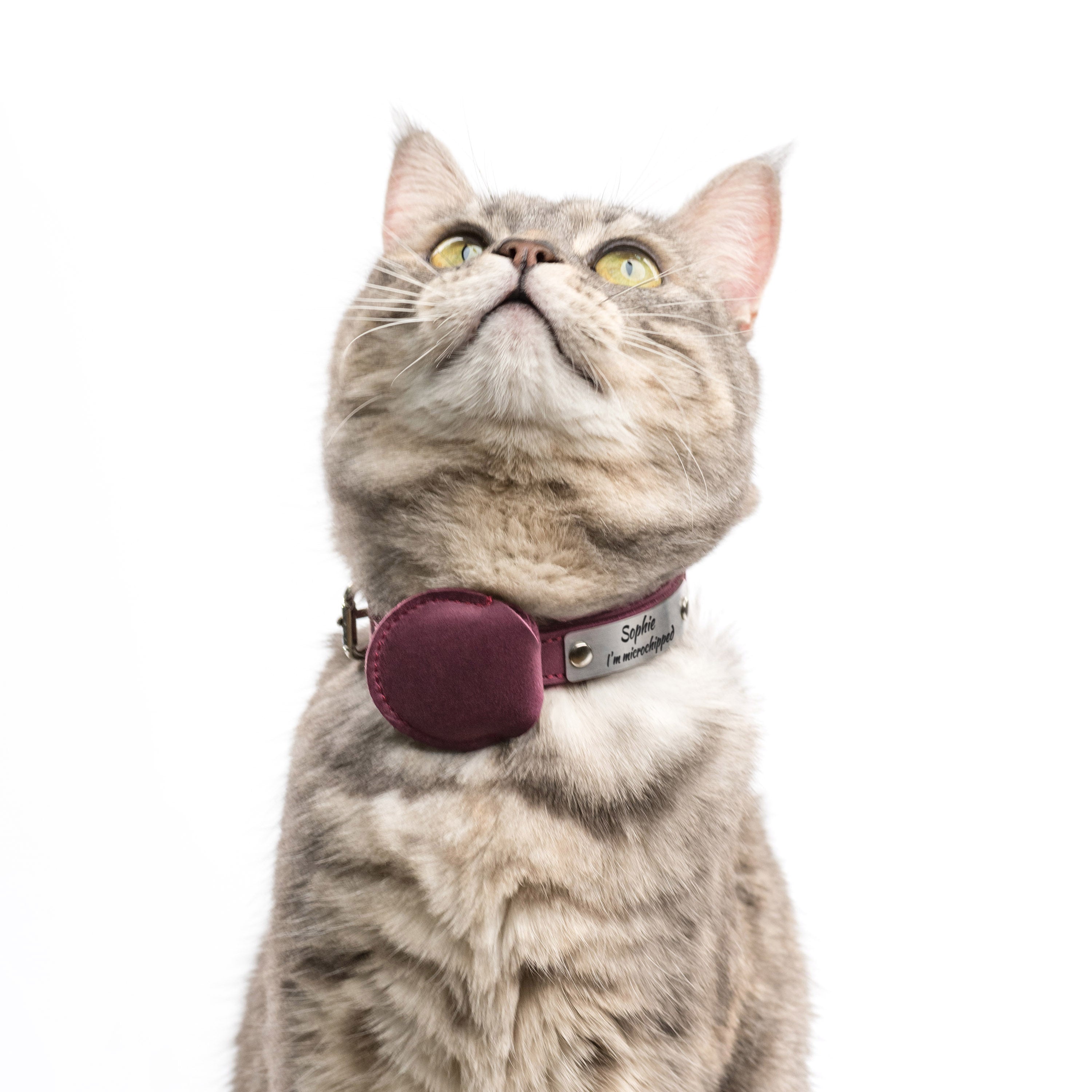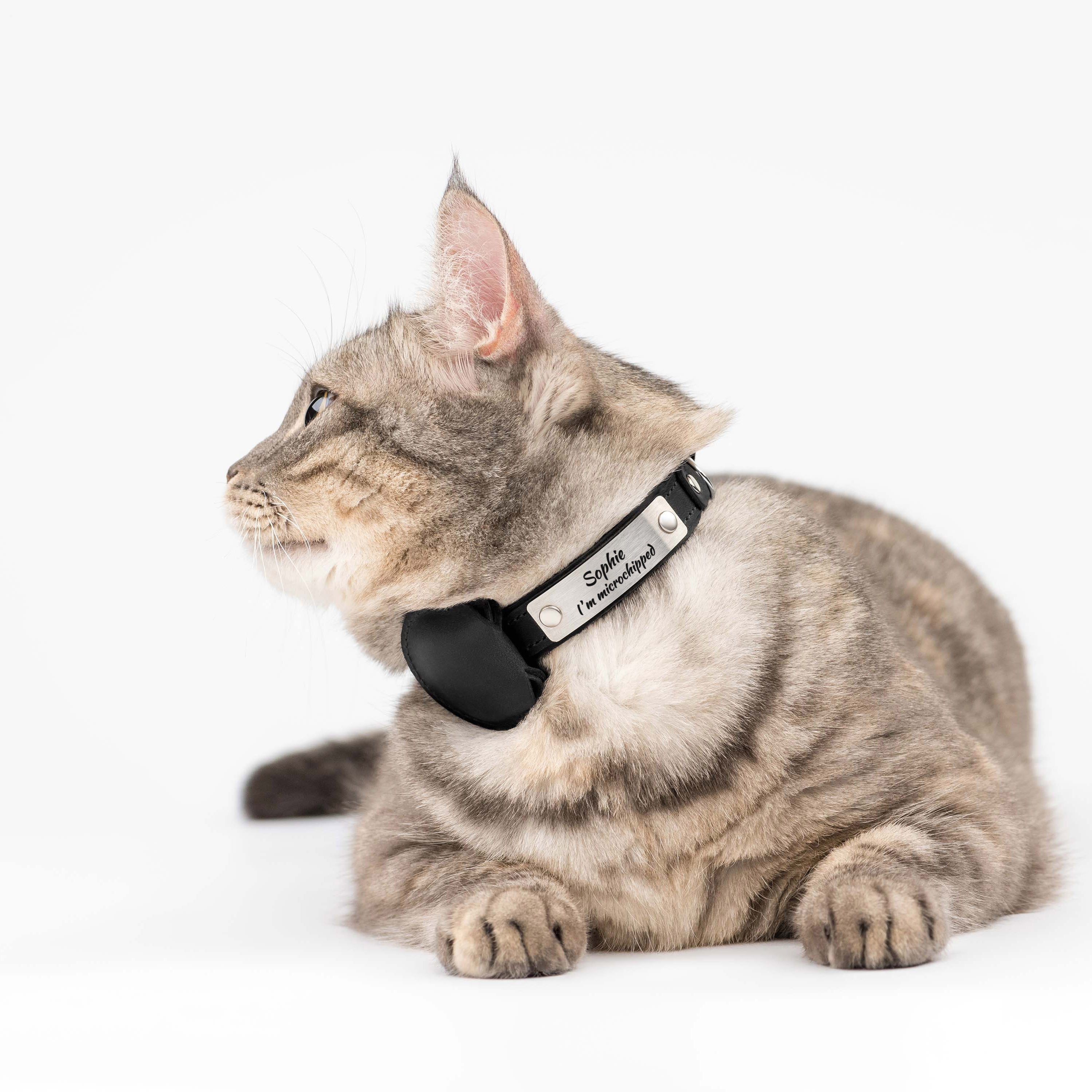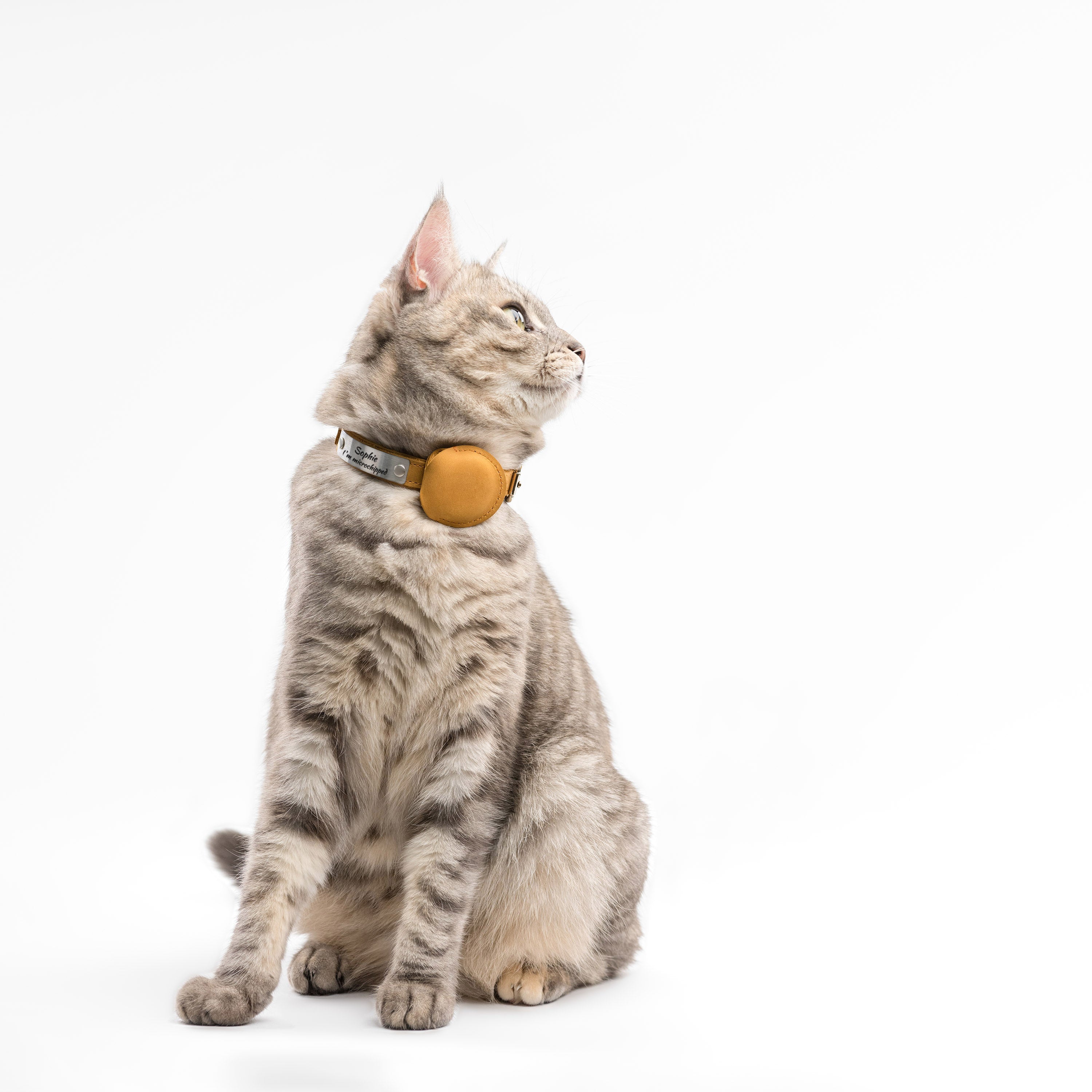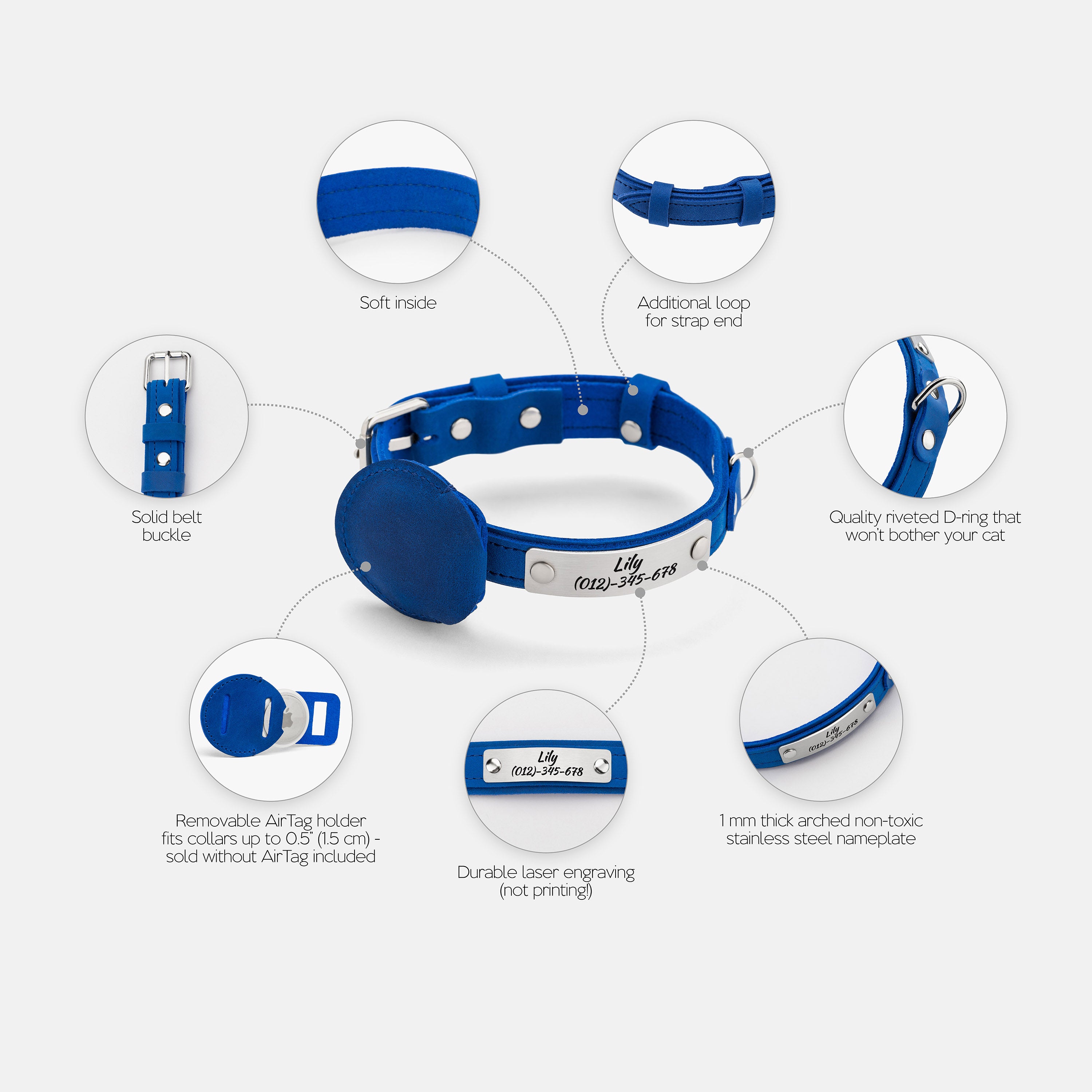 Made from durable leather, this lightweight cat collar is built for comfort and everyday wear. The adjustable buckle ensures a secure fit, while the extra loop keeps the strap neatly in place. A removable AirTag holder and D-ring add convenience for tracking and leash use. Finished with a silent, laser-engraved nameplate, it keeps your cat safely identified – without the jingle.