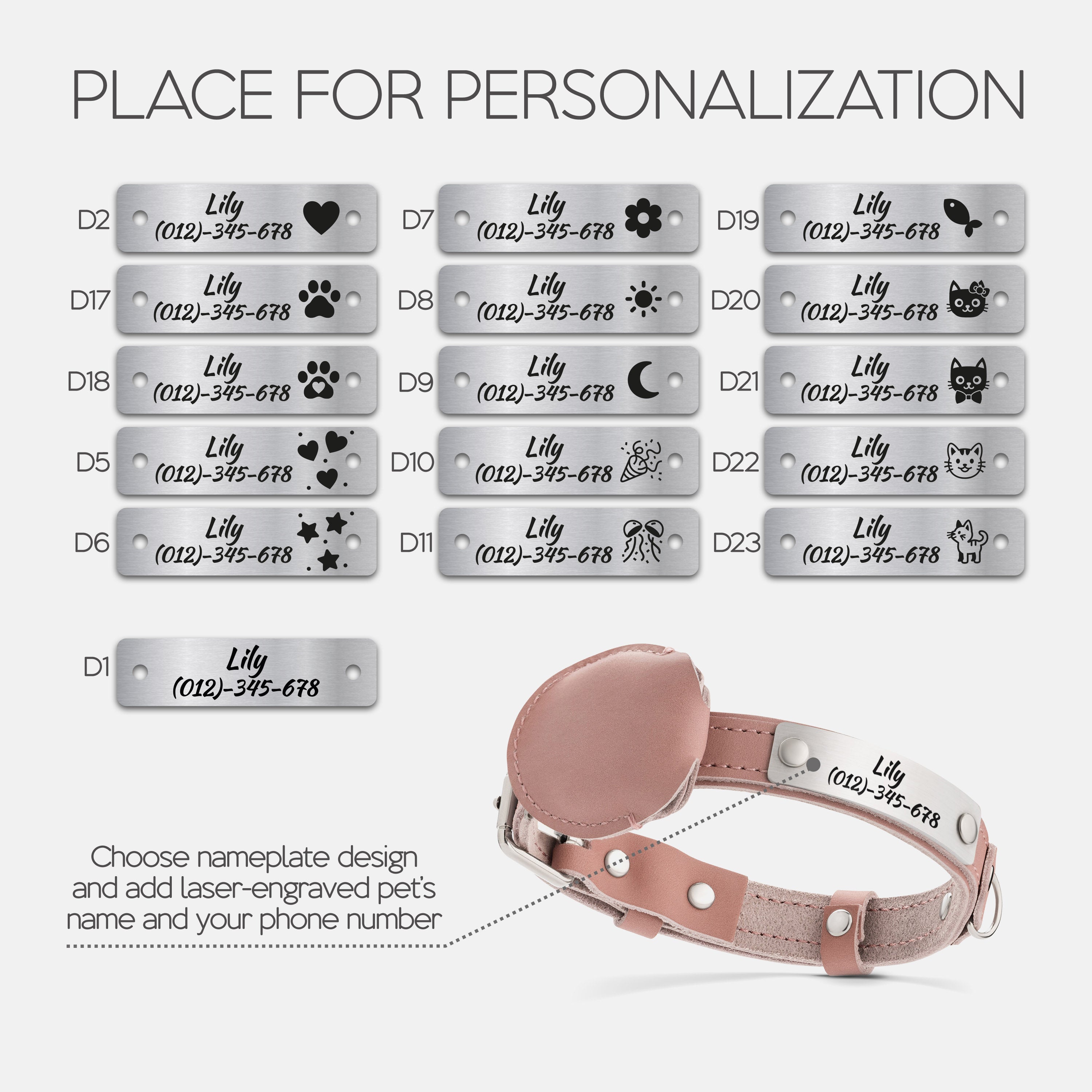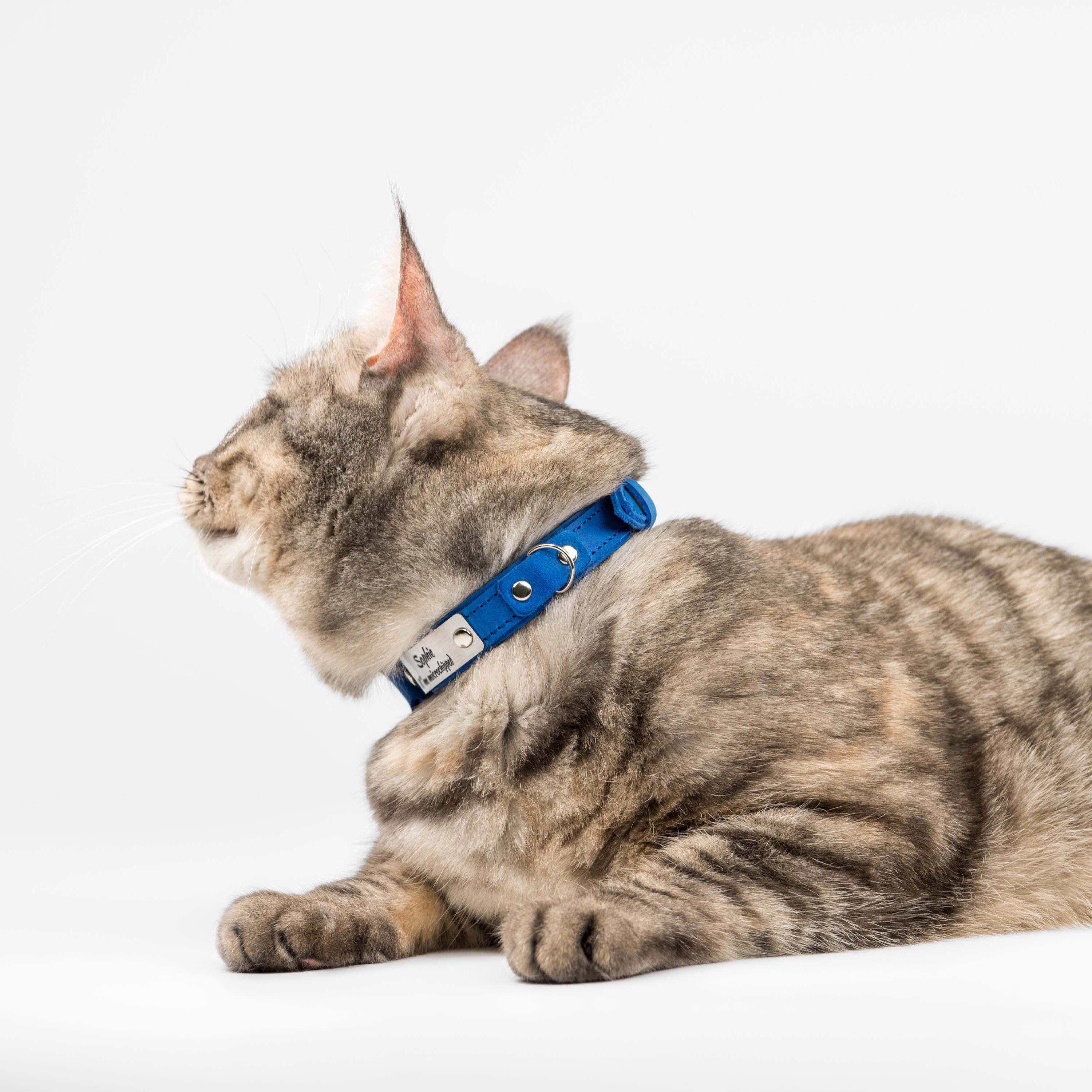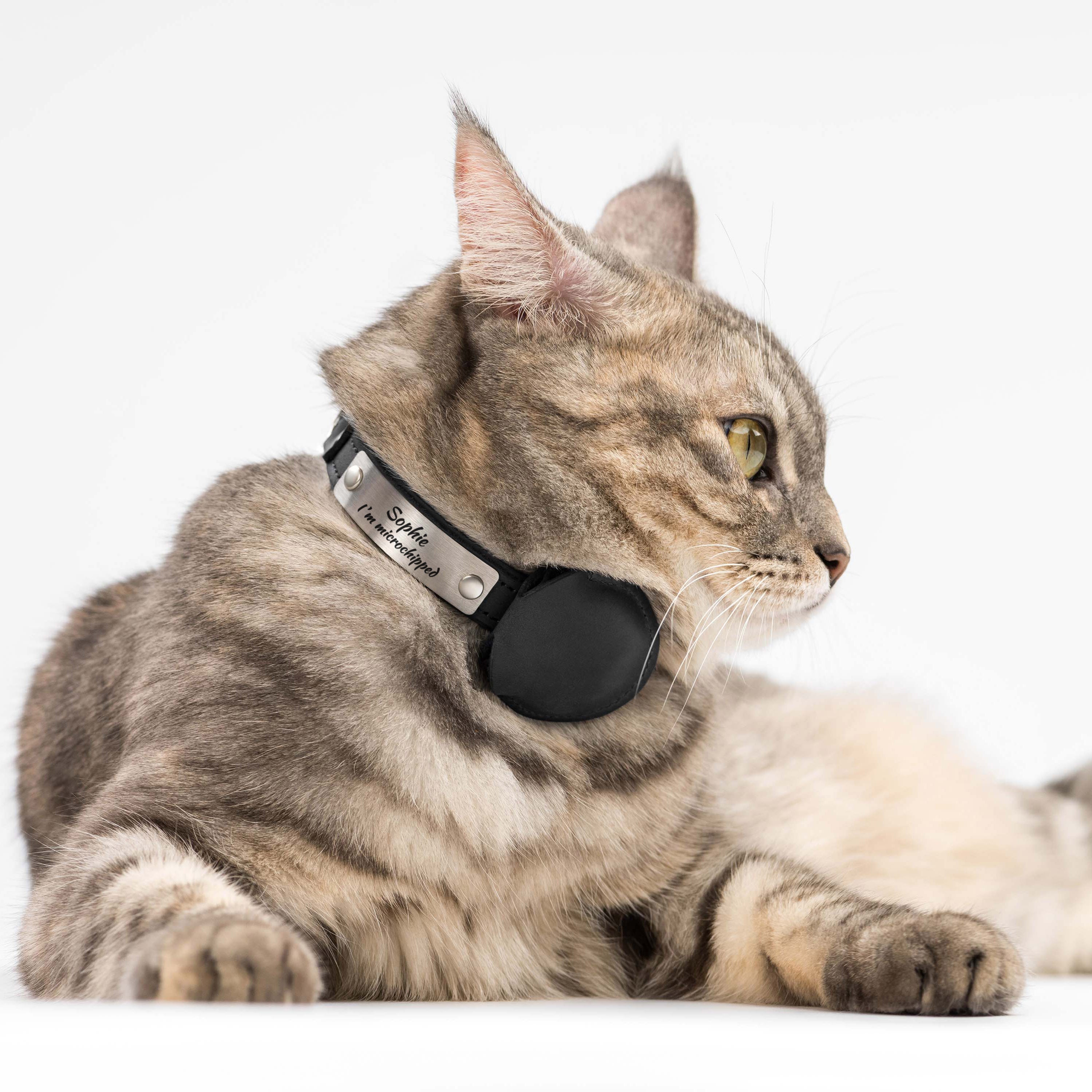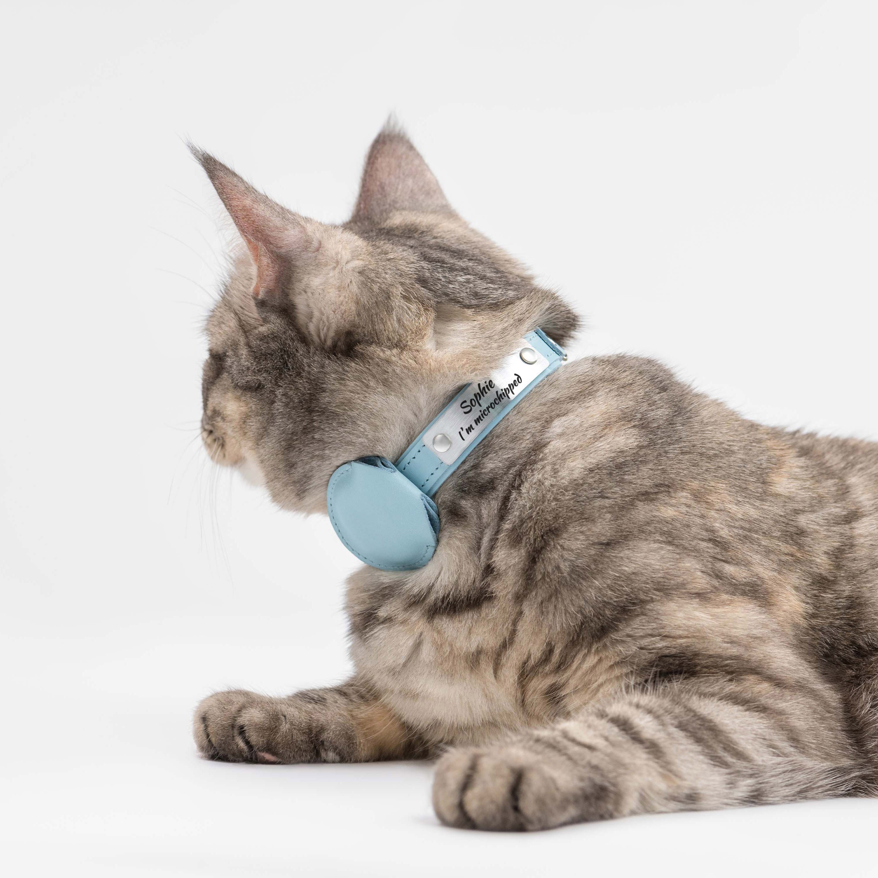 Made from durable leather, this lightweight cat collar is built for comfort and everyday wear. The adjustable buckle ensures a secure fit, while the extra loop keeps the strap neatly in place. A removable AirTag holder and D-ring add convenience for tracking and leash use. Finished with a silent, laser-engraved nameplate, it keeps your cat safely identified – without the jingle.
