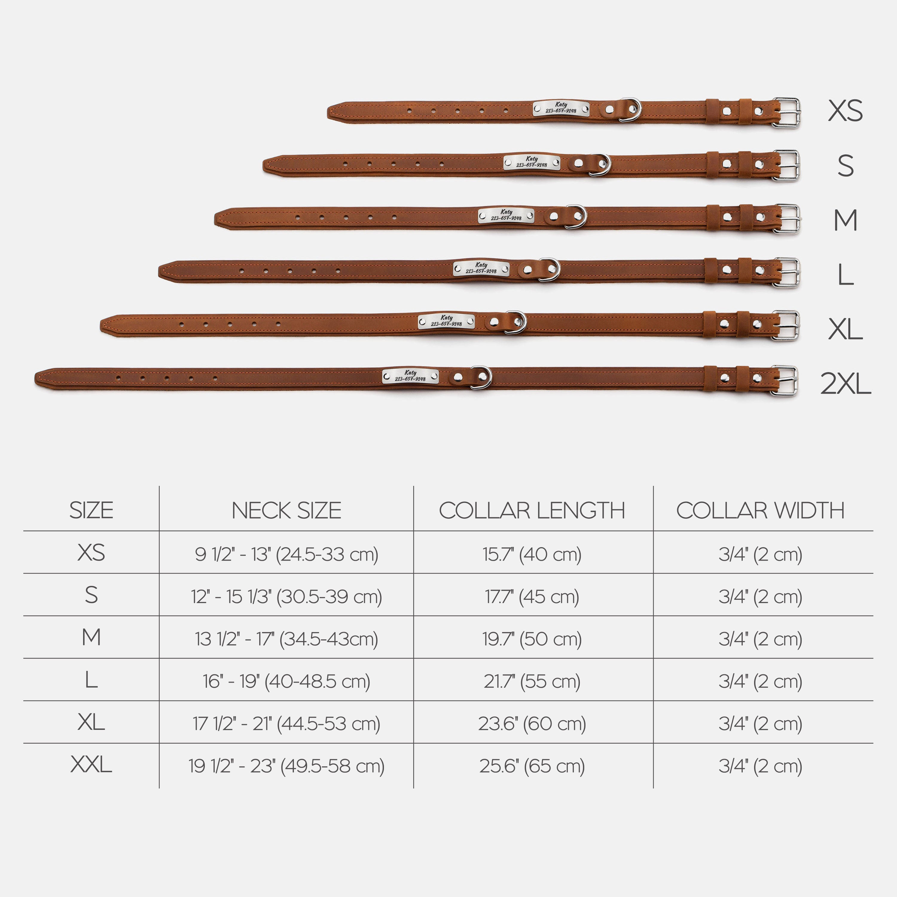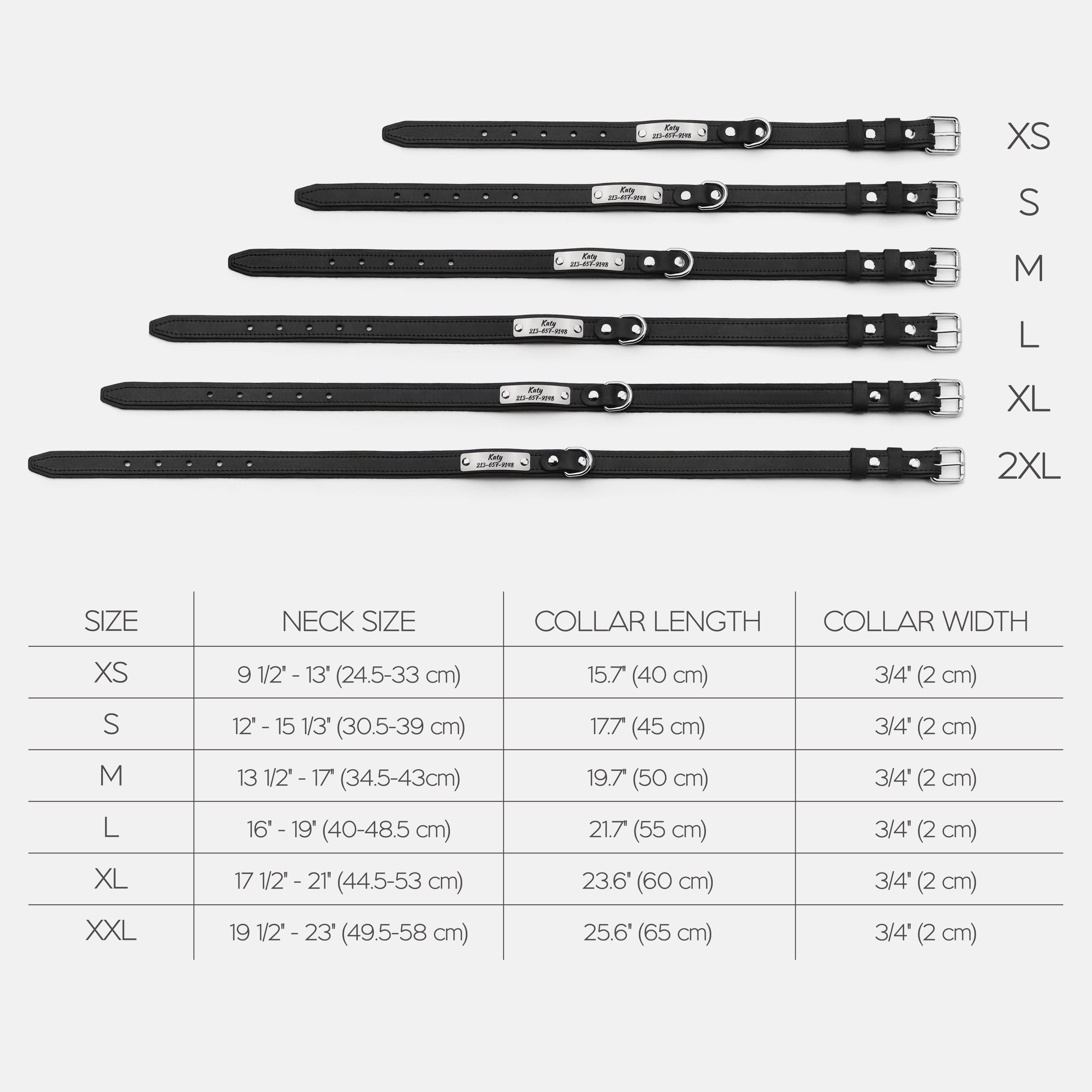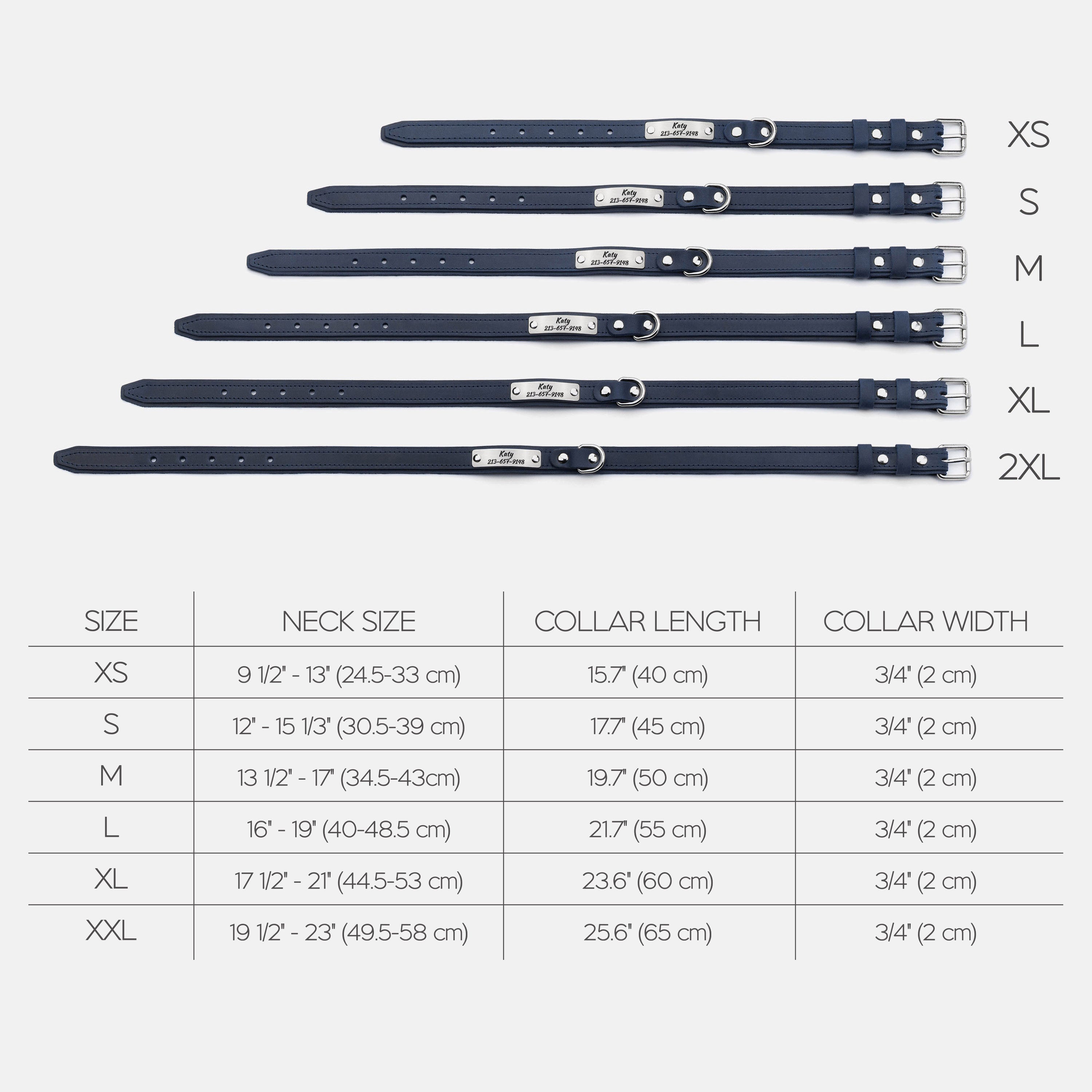 Size 2XL: neck size: 19 1/2" - 23" (49.5 - 58 cm), width: 3/4" (2 cm)