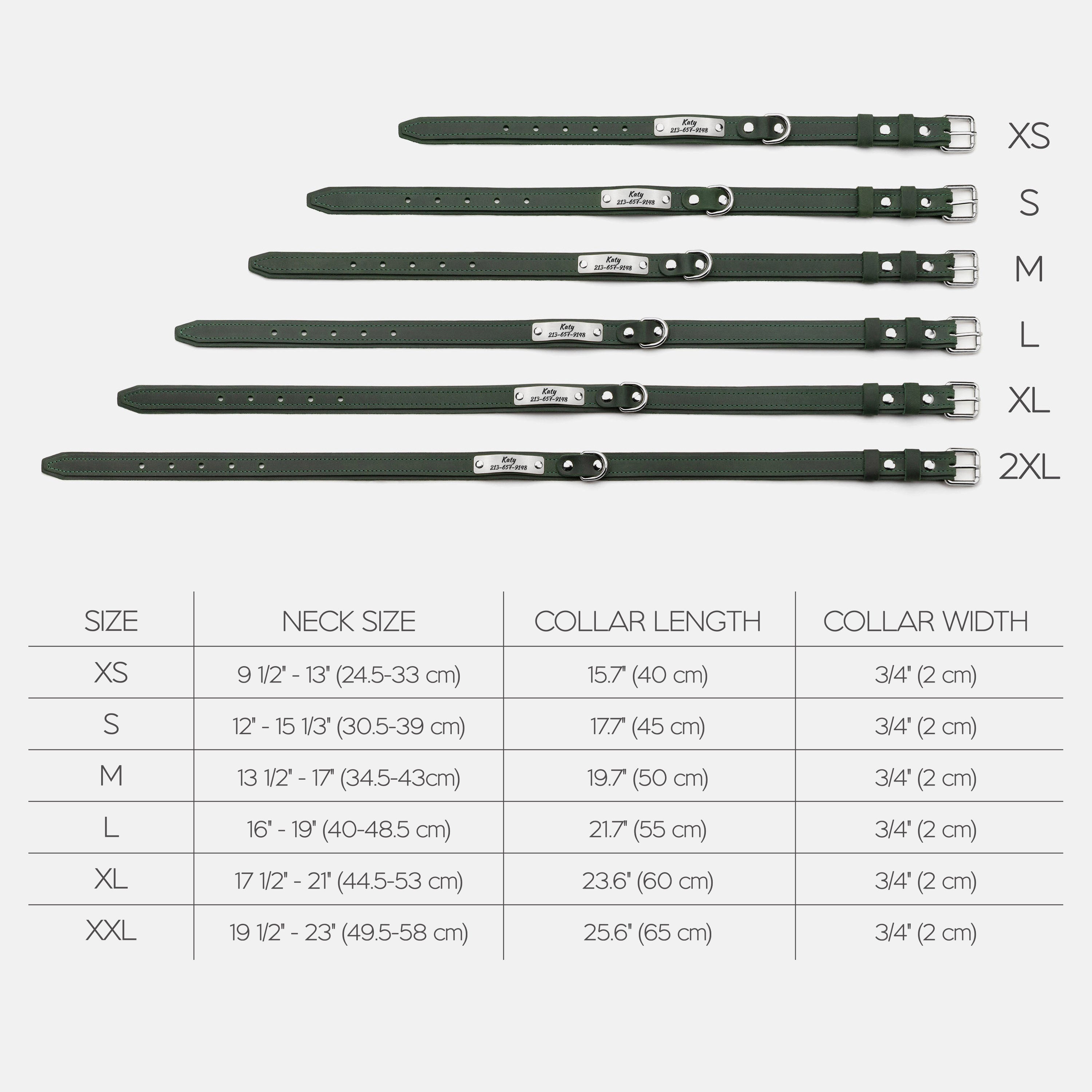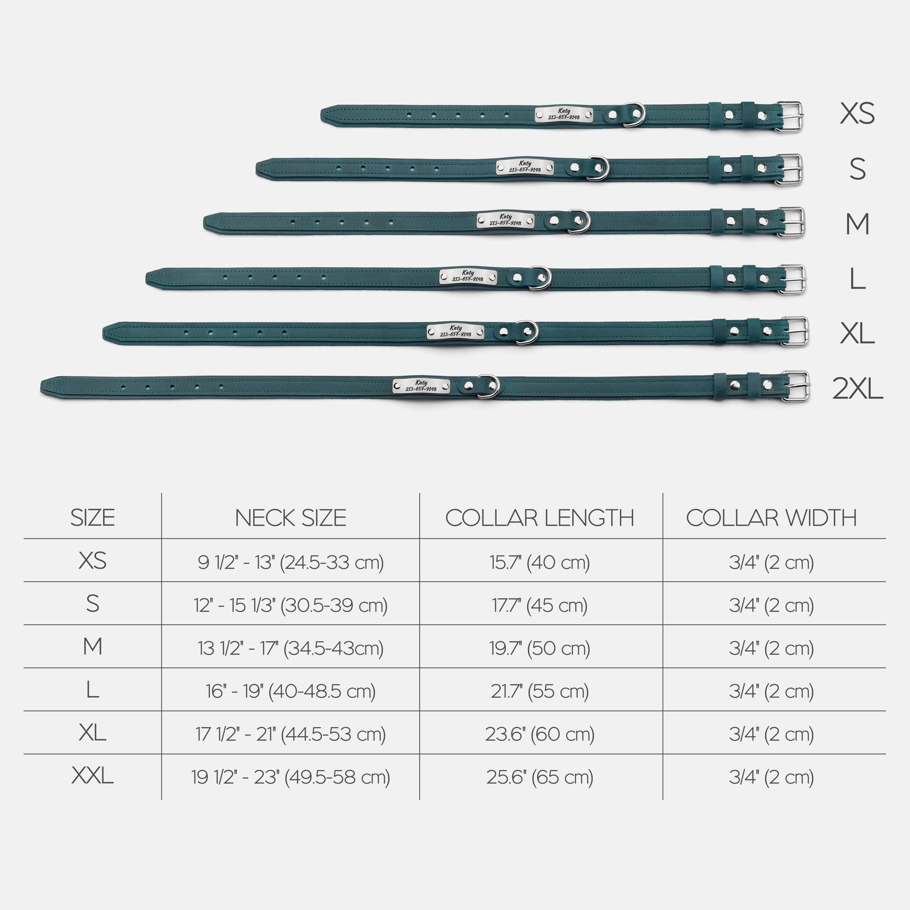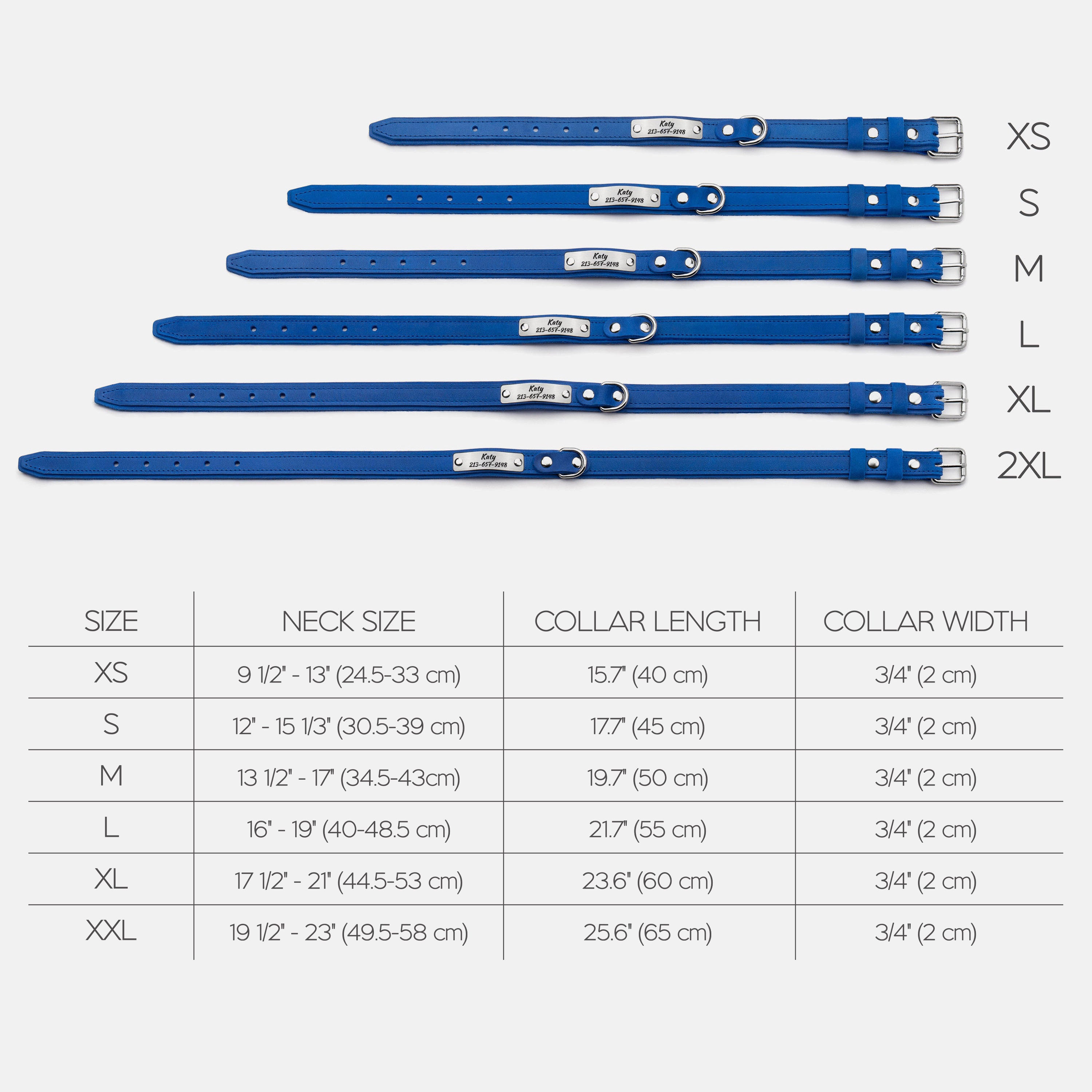 Size 2XL: neck size: 19 1/2" - 23" (49.5 - 58 cm), width: 3/4" (2 cm)
