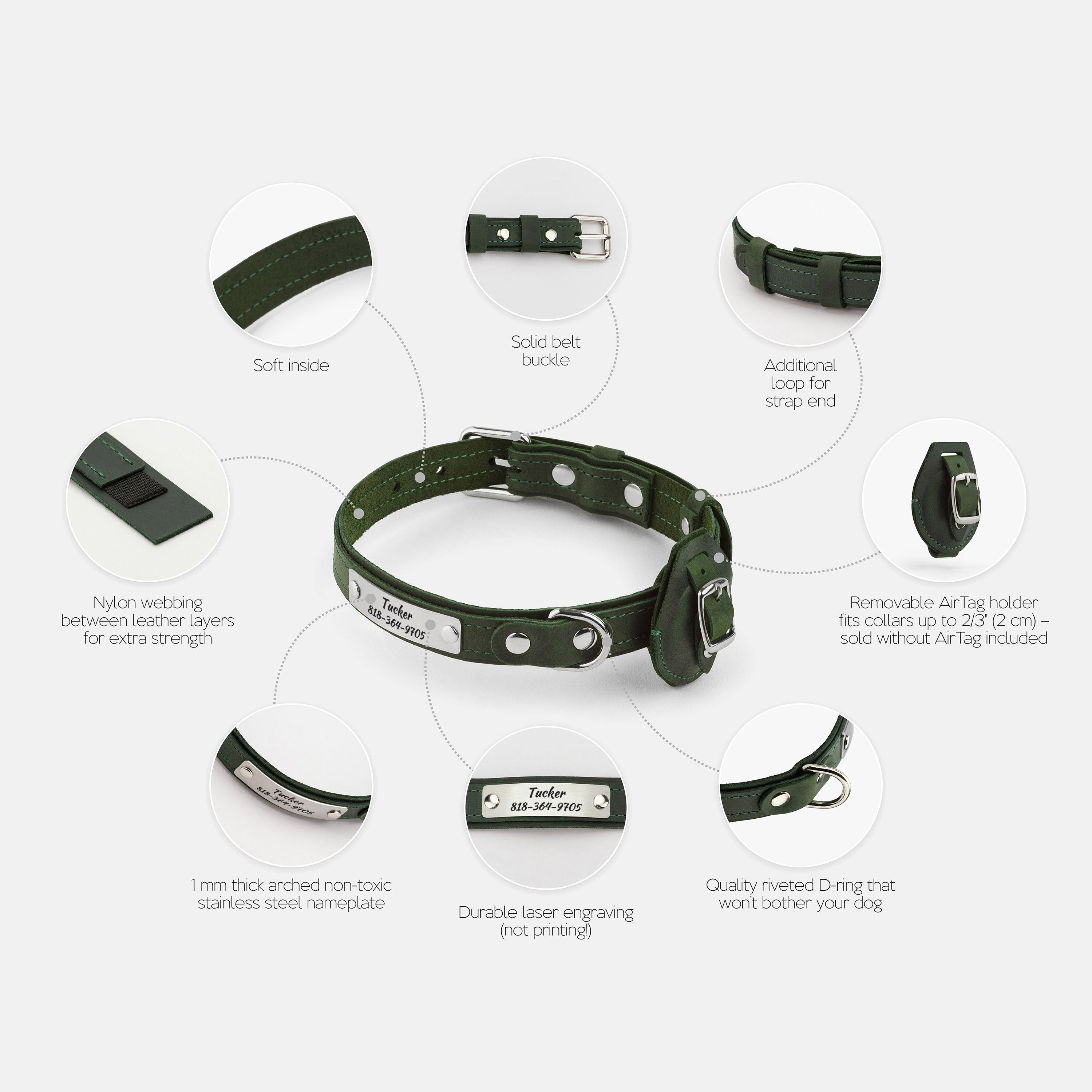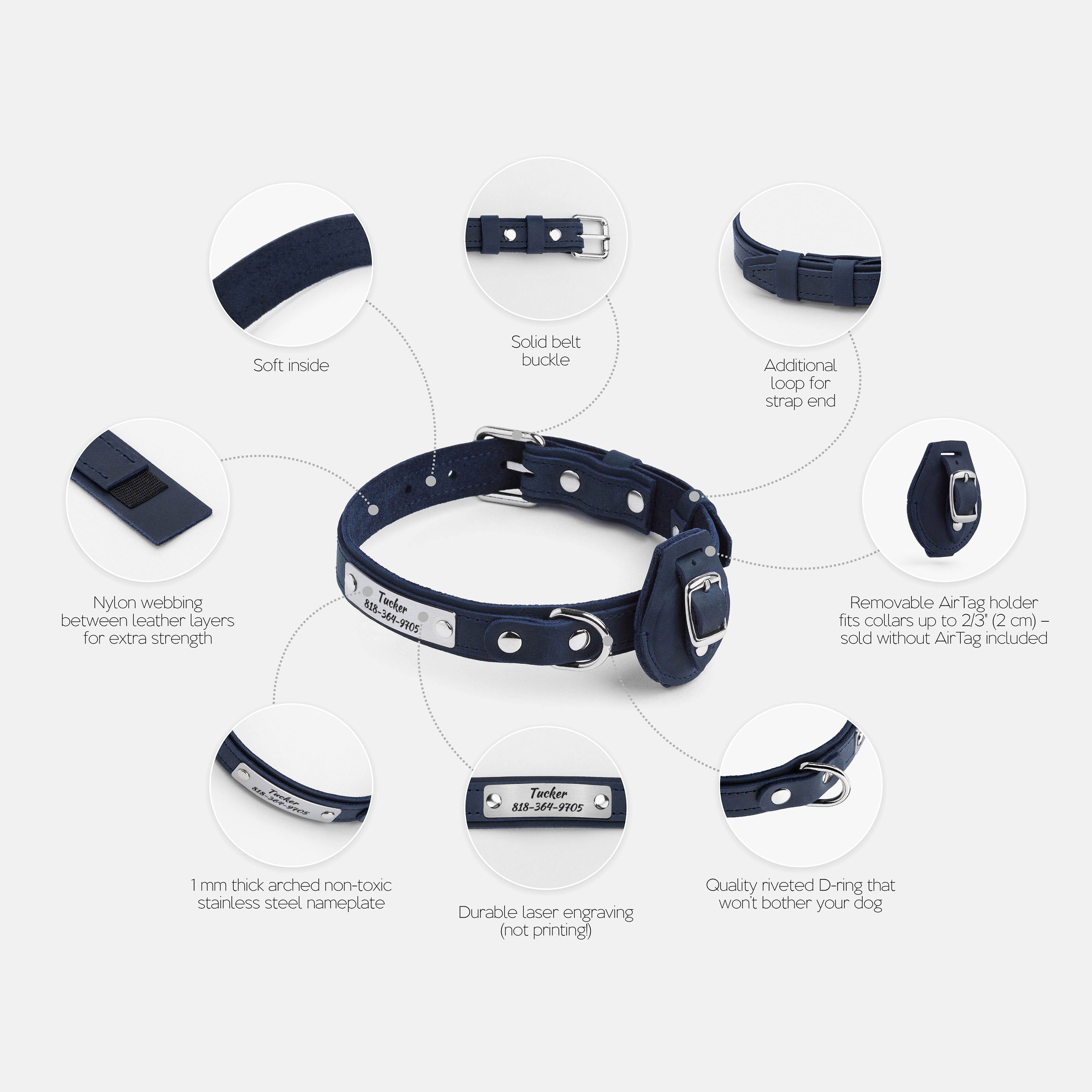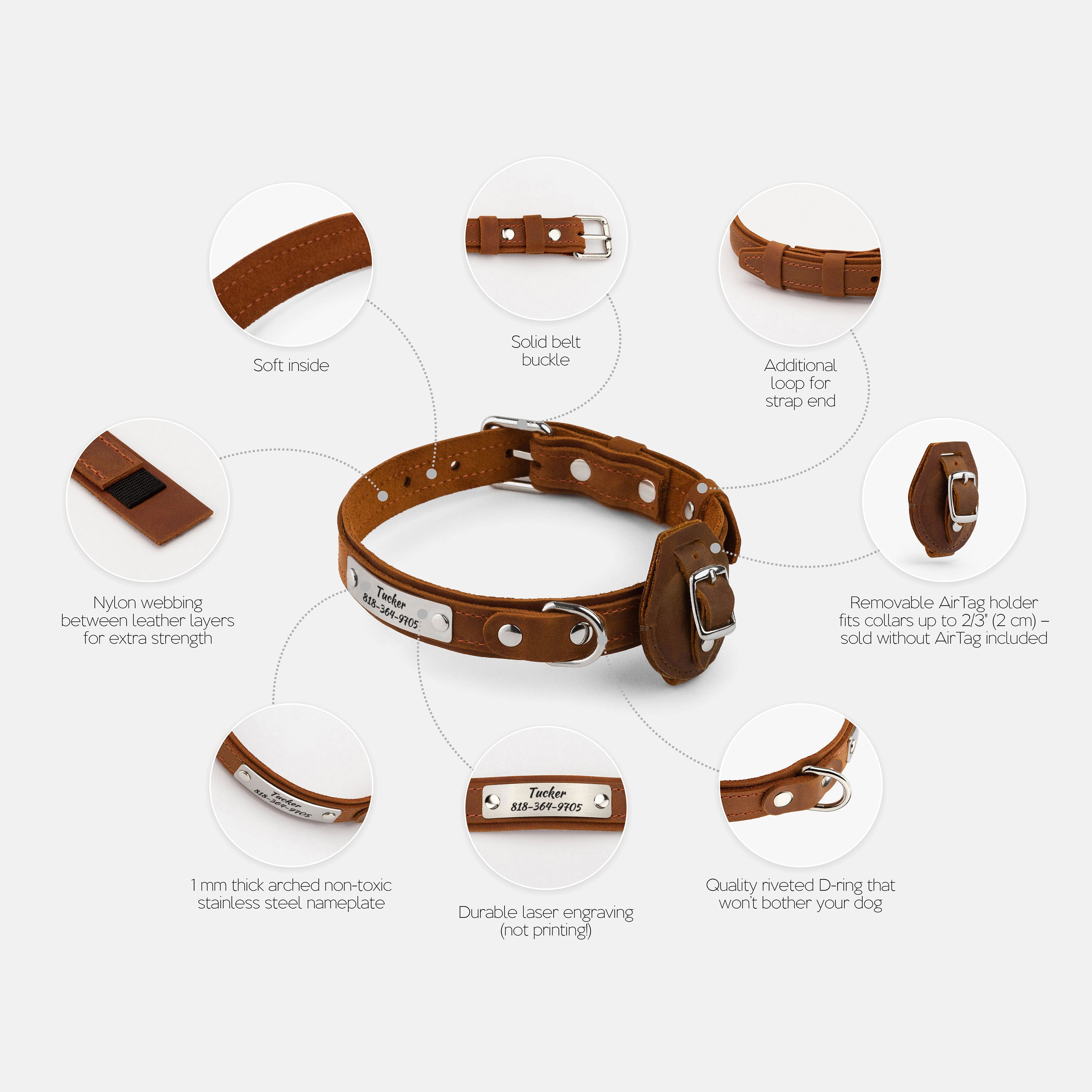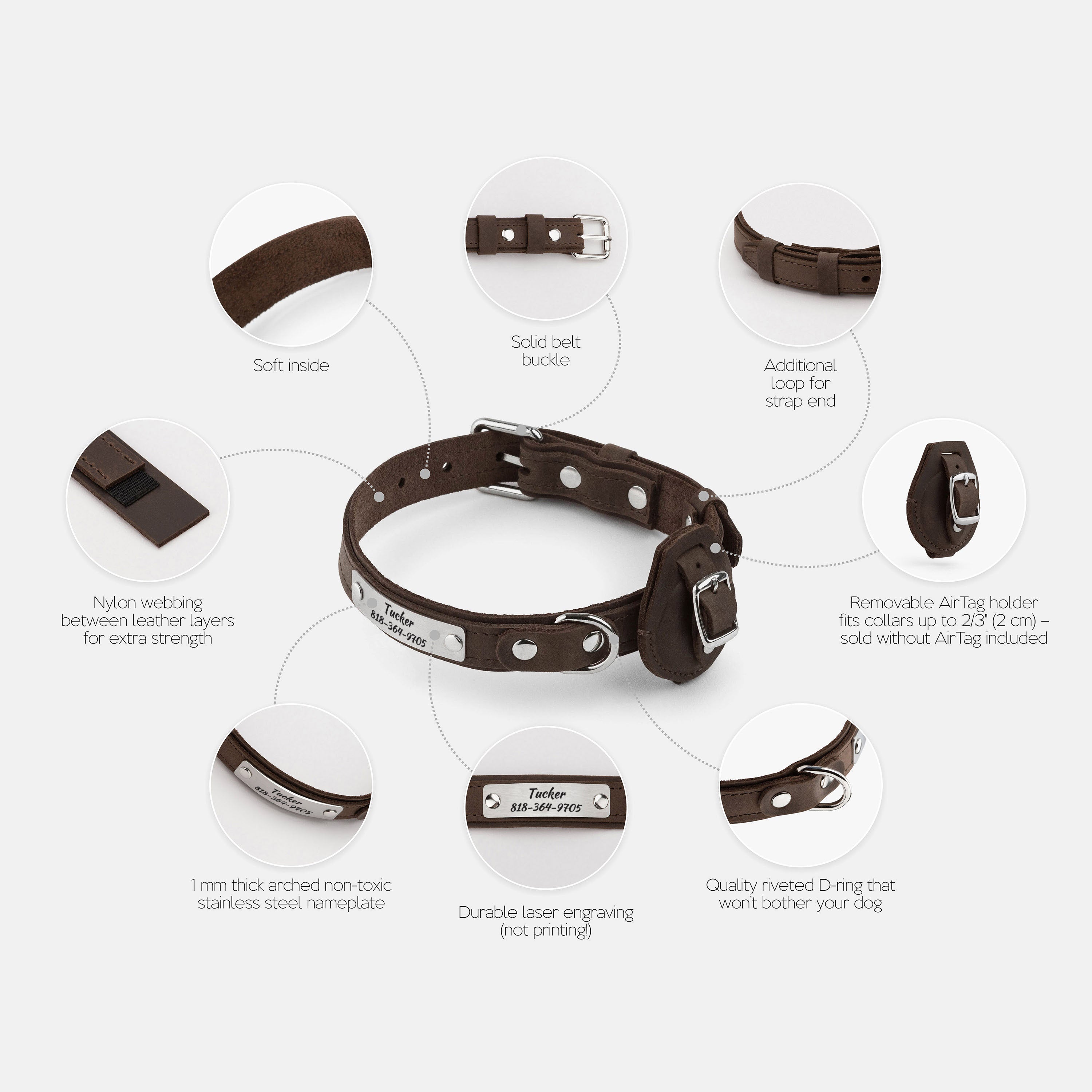 - Removable matching leather AirTag holder; fits collars up to 3/4" (2 cm) wide (AirTag not included)