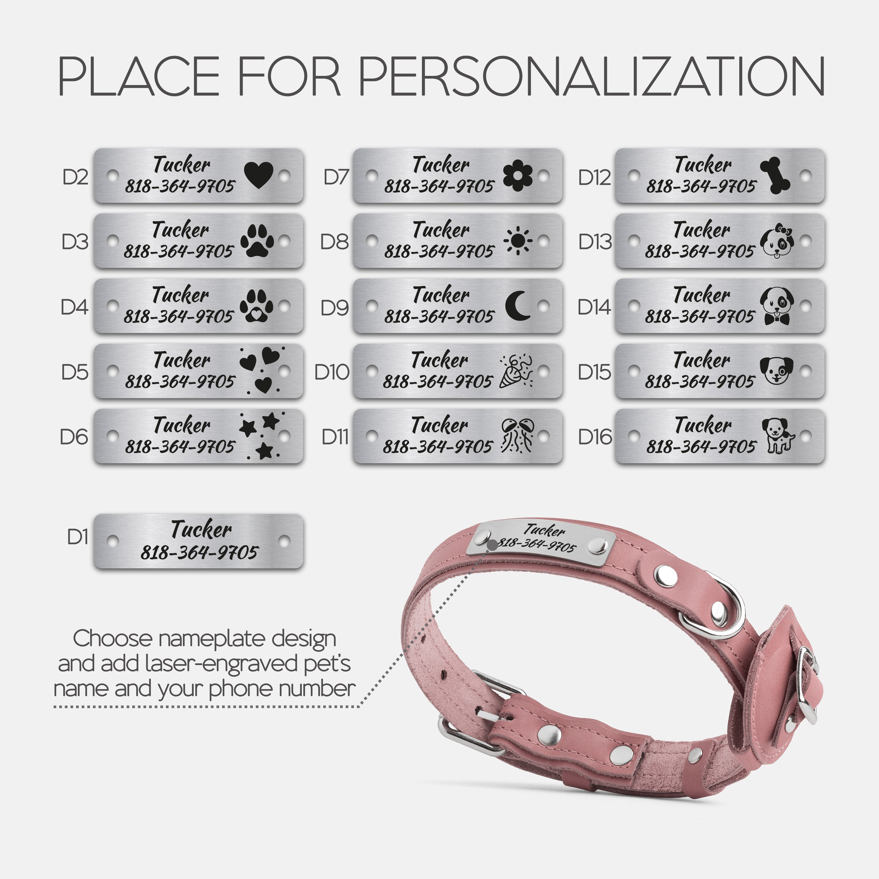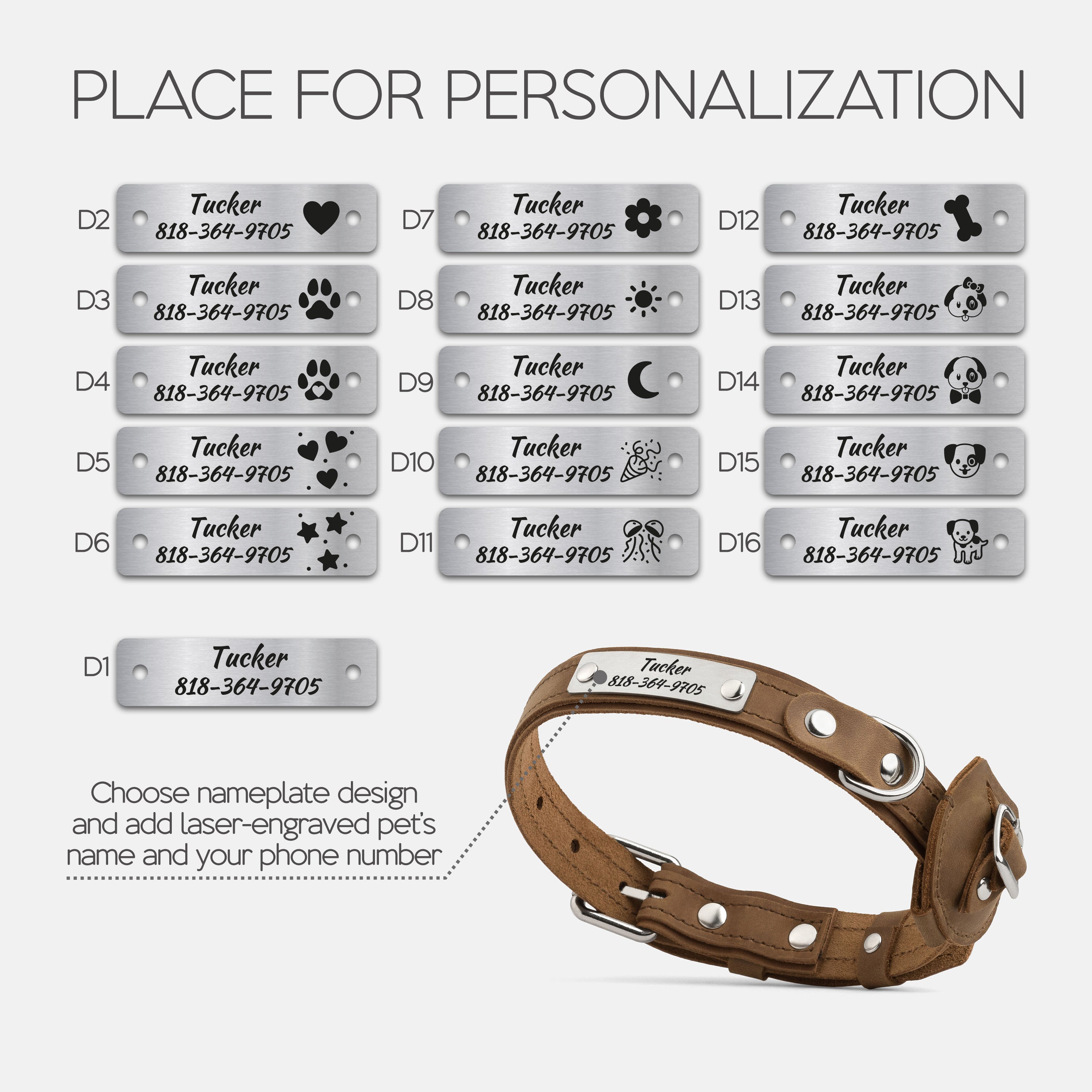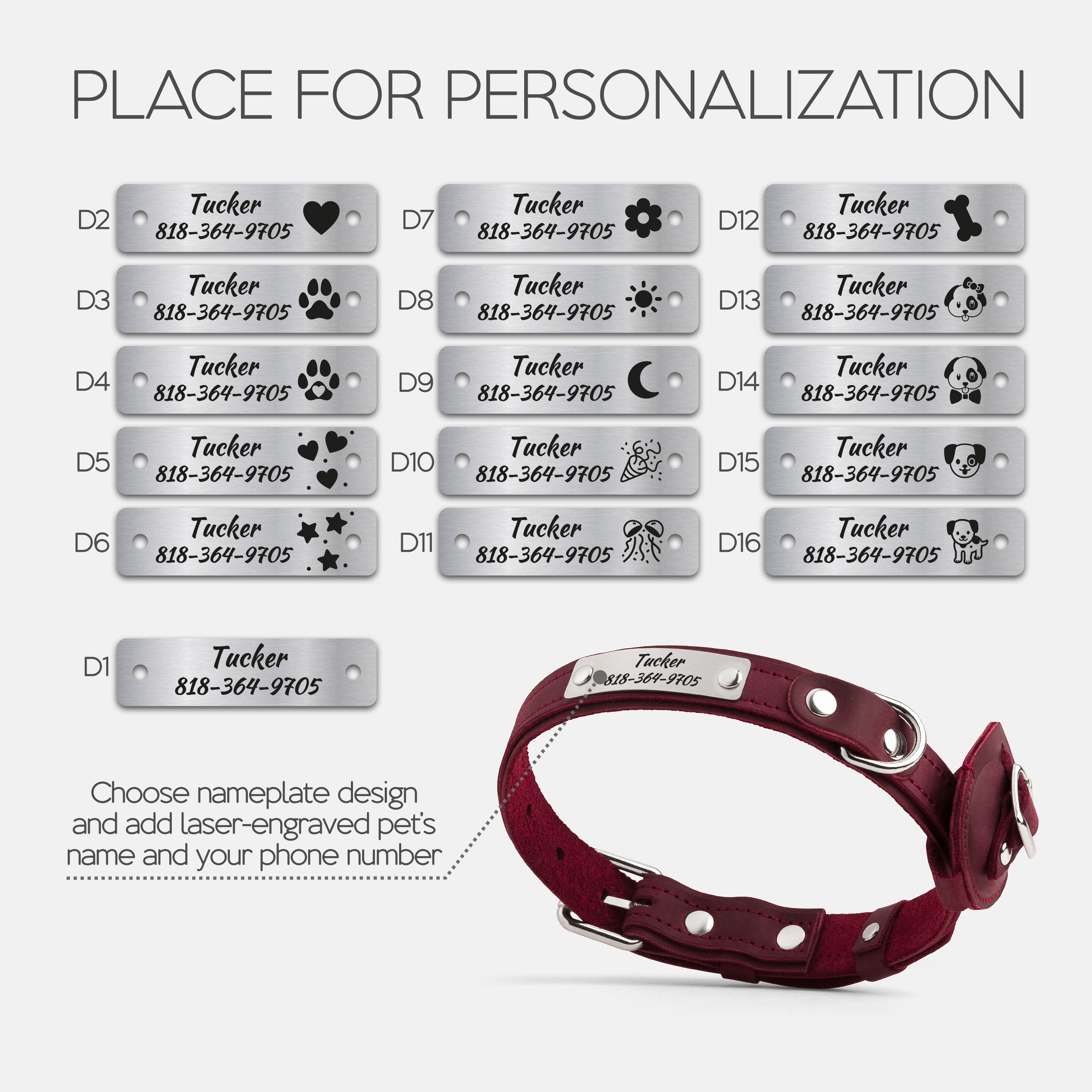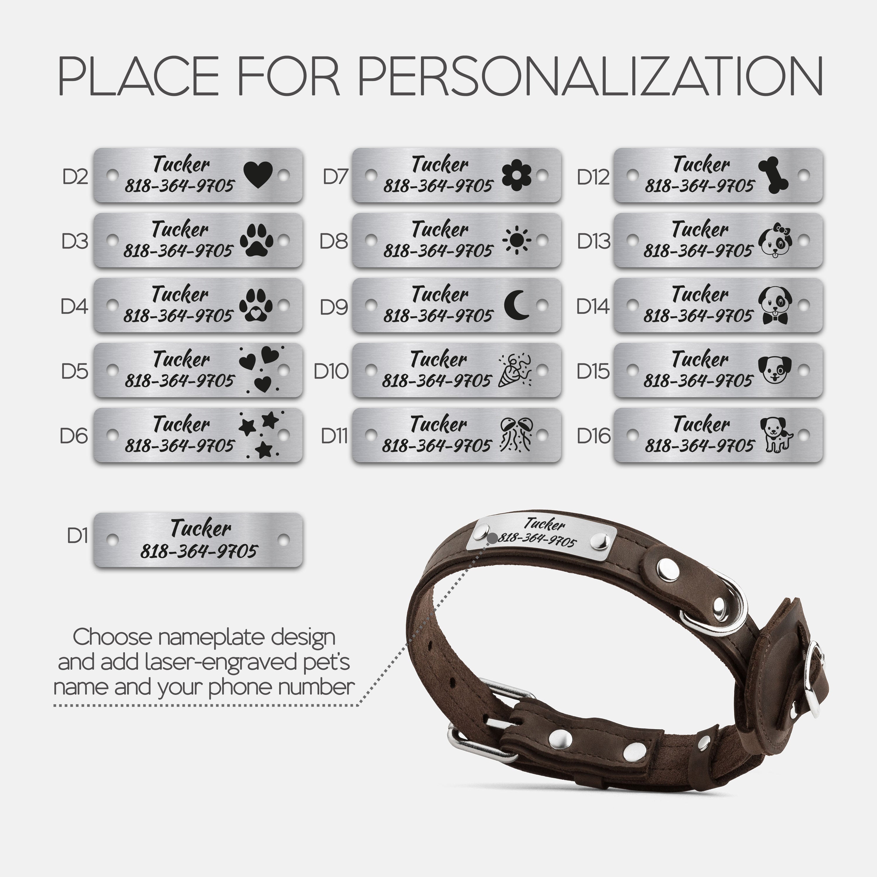 Choose your preferred nameplate design, then enter your dog’s name and your phone number or short phrase.