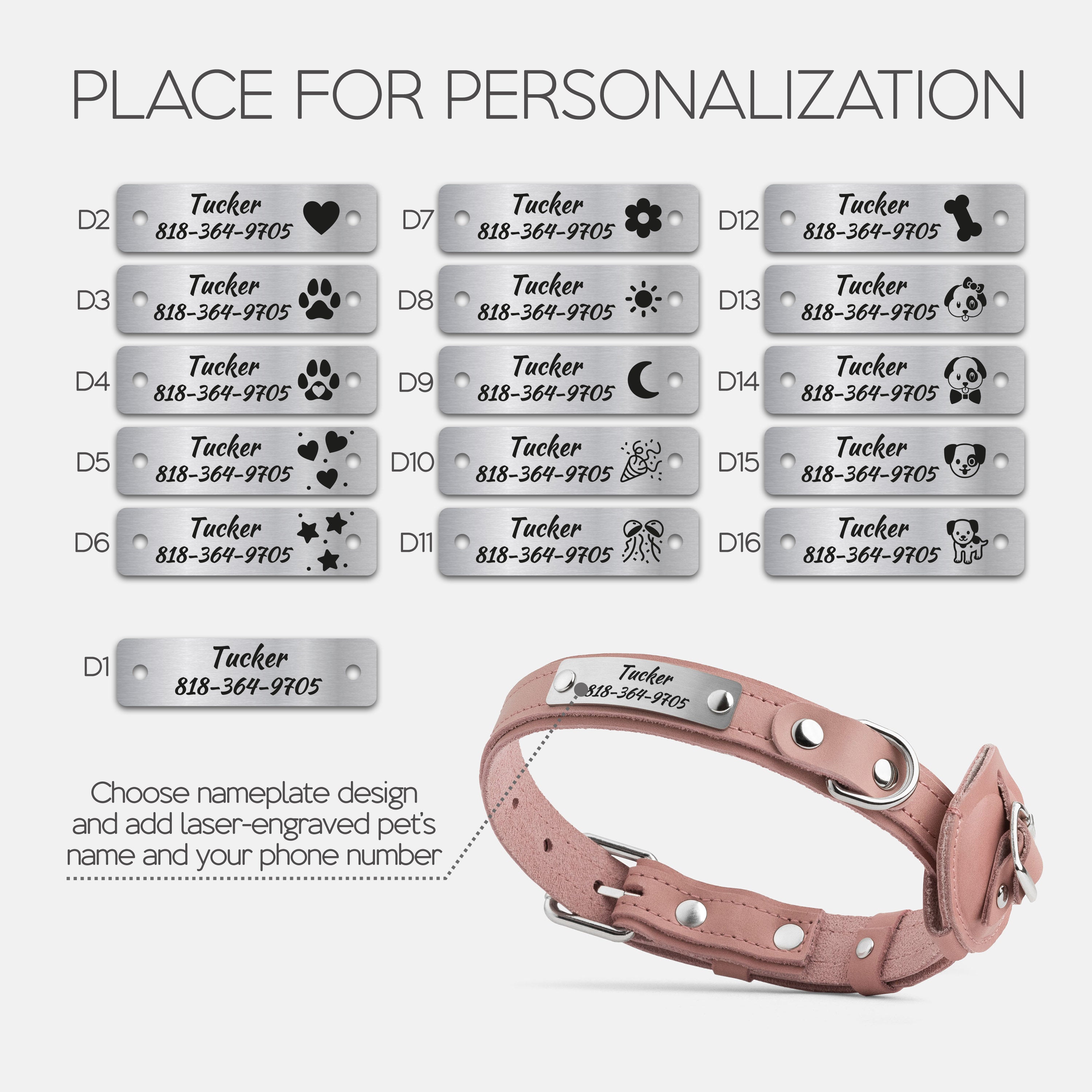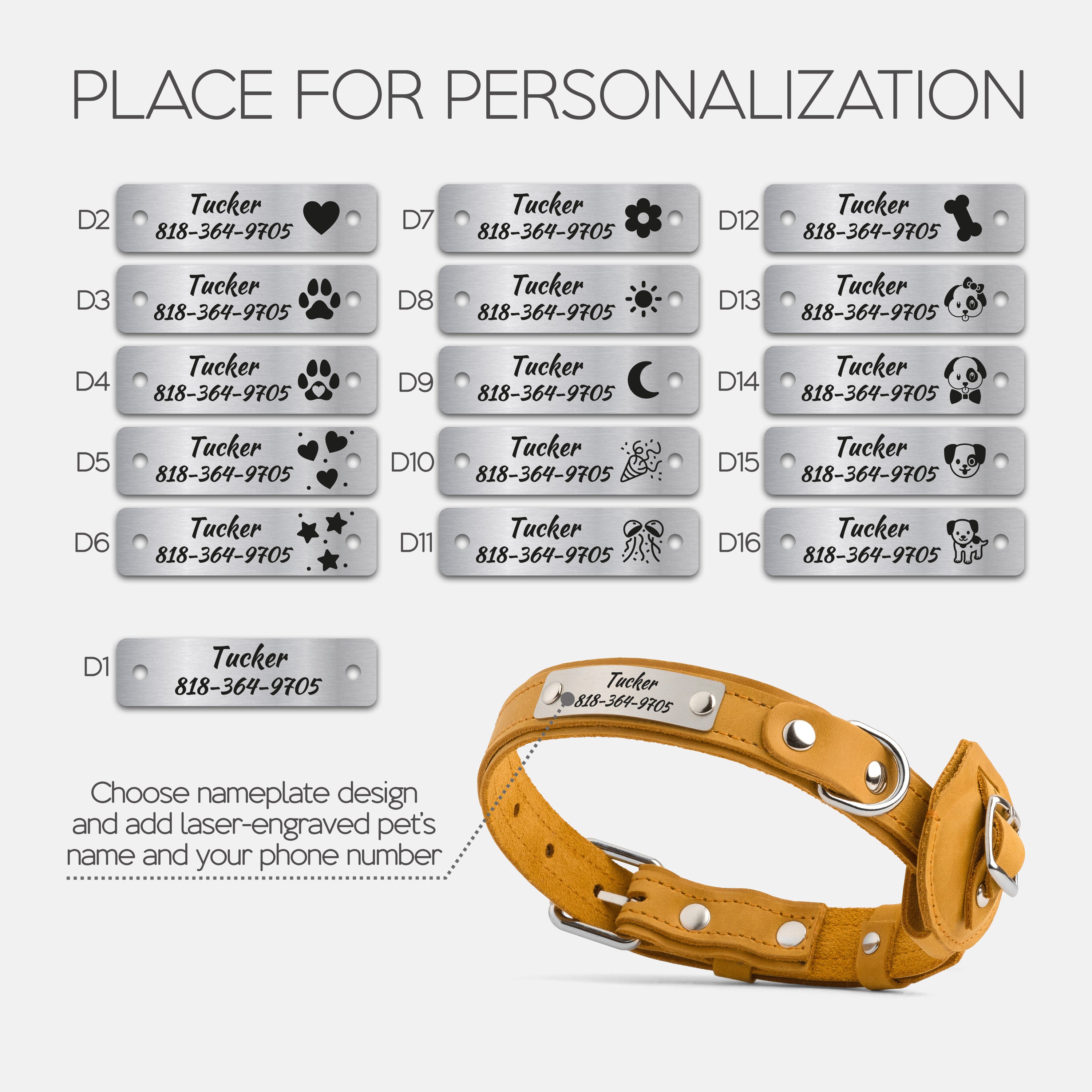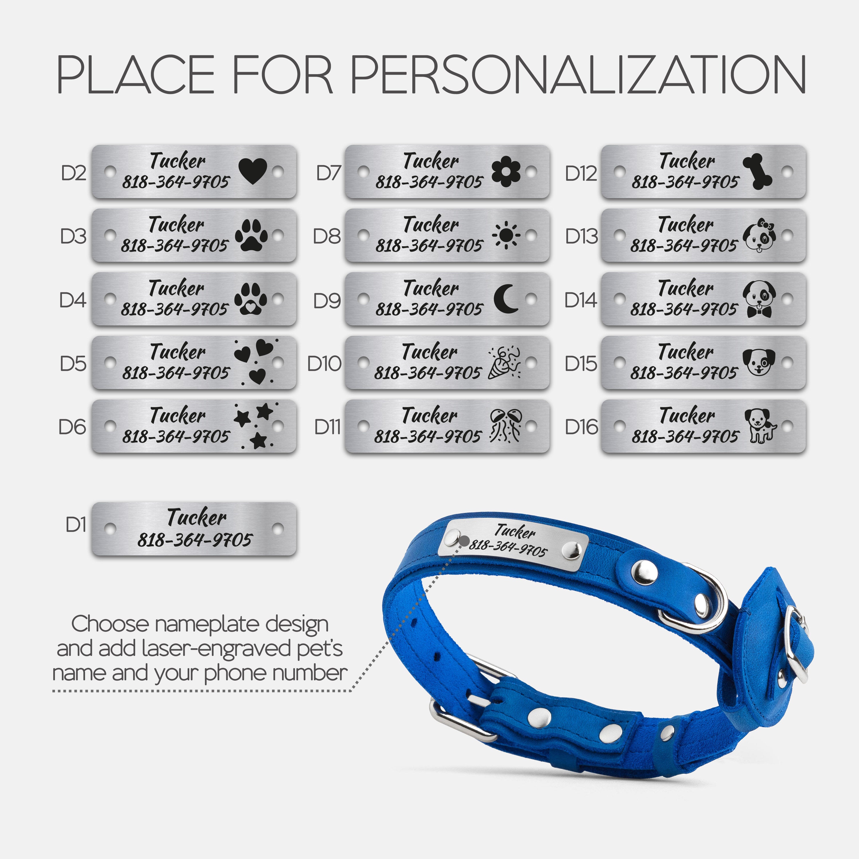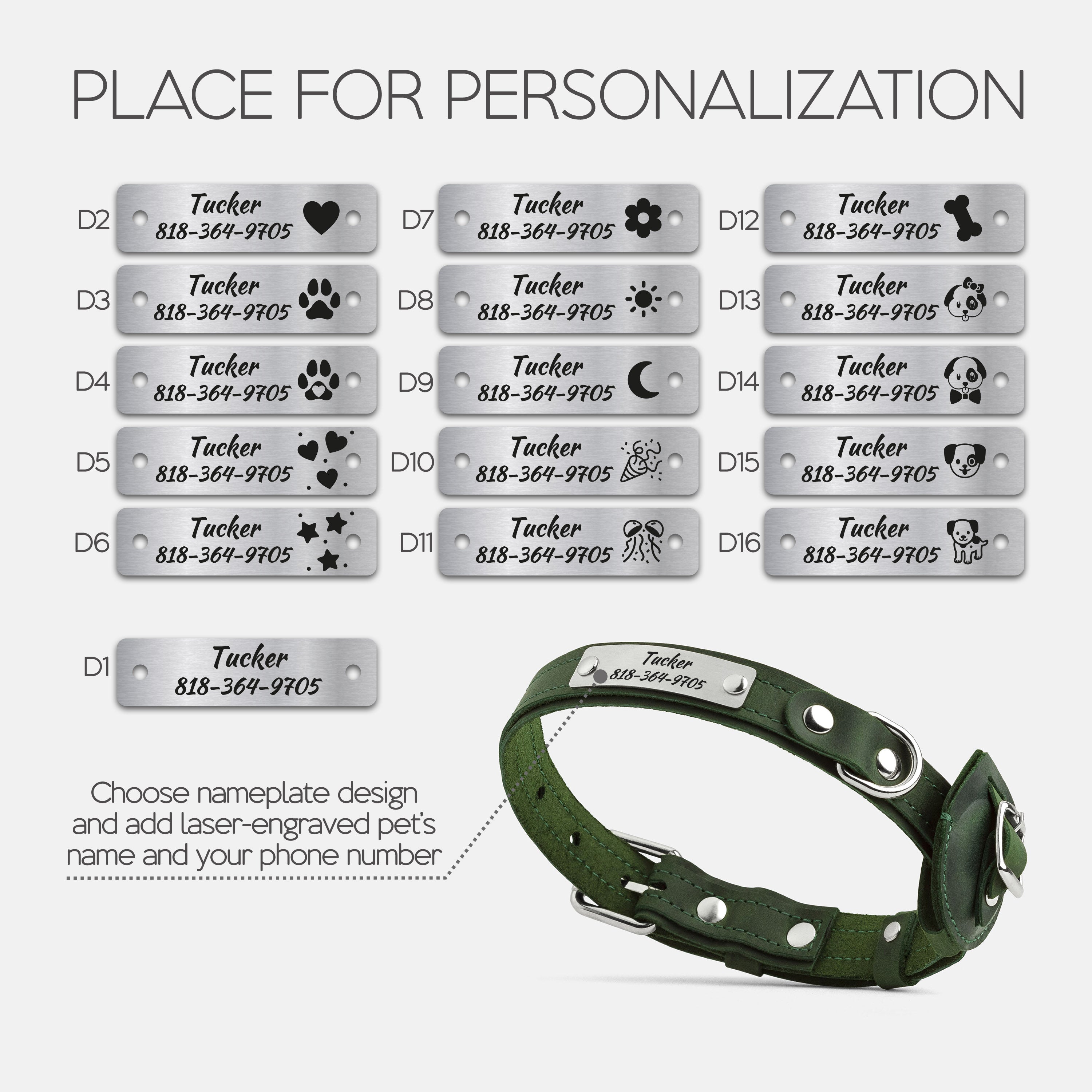 Choose your preferred nameplate design, then enter your dog’s name and your phone number or short phrase.