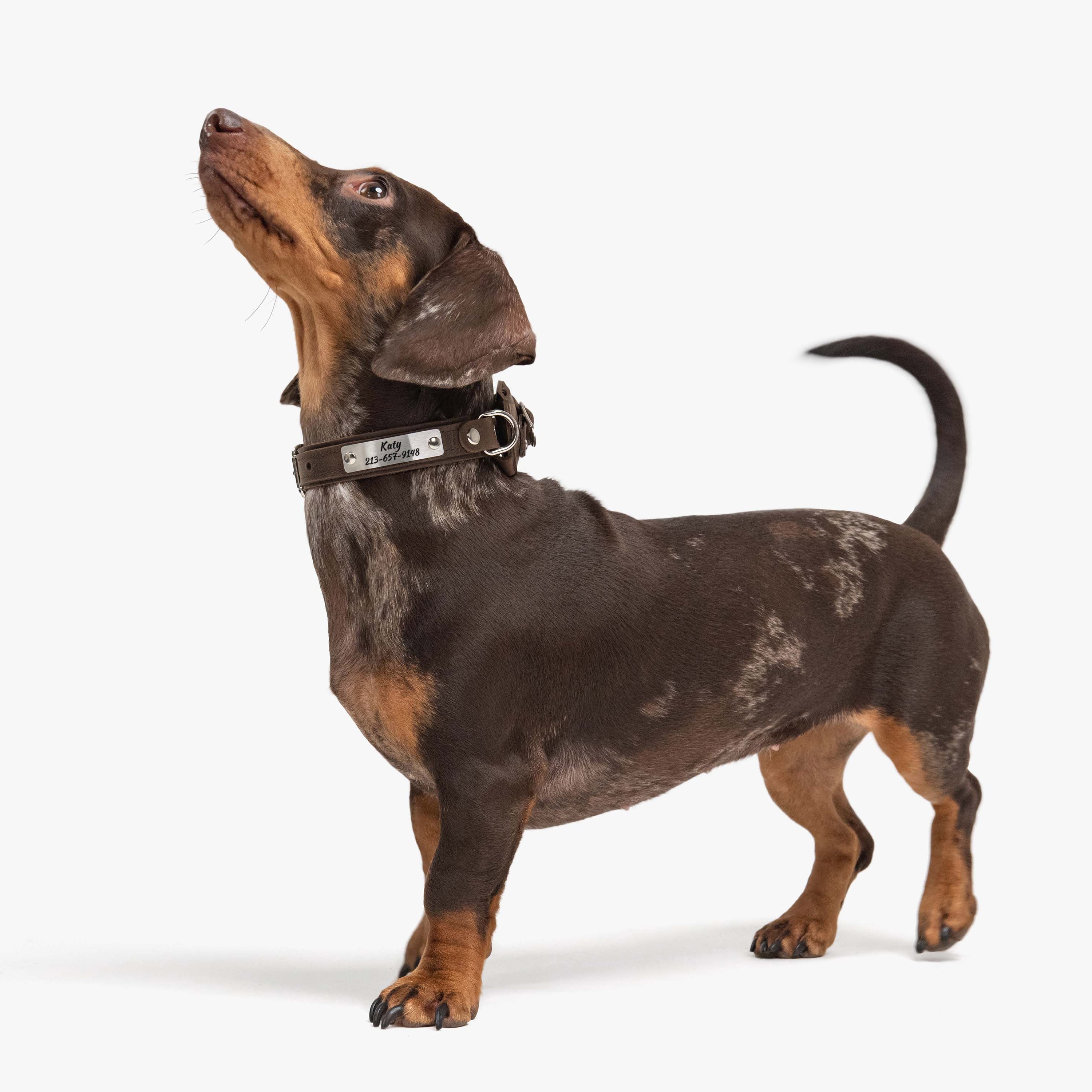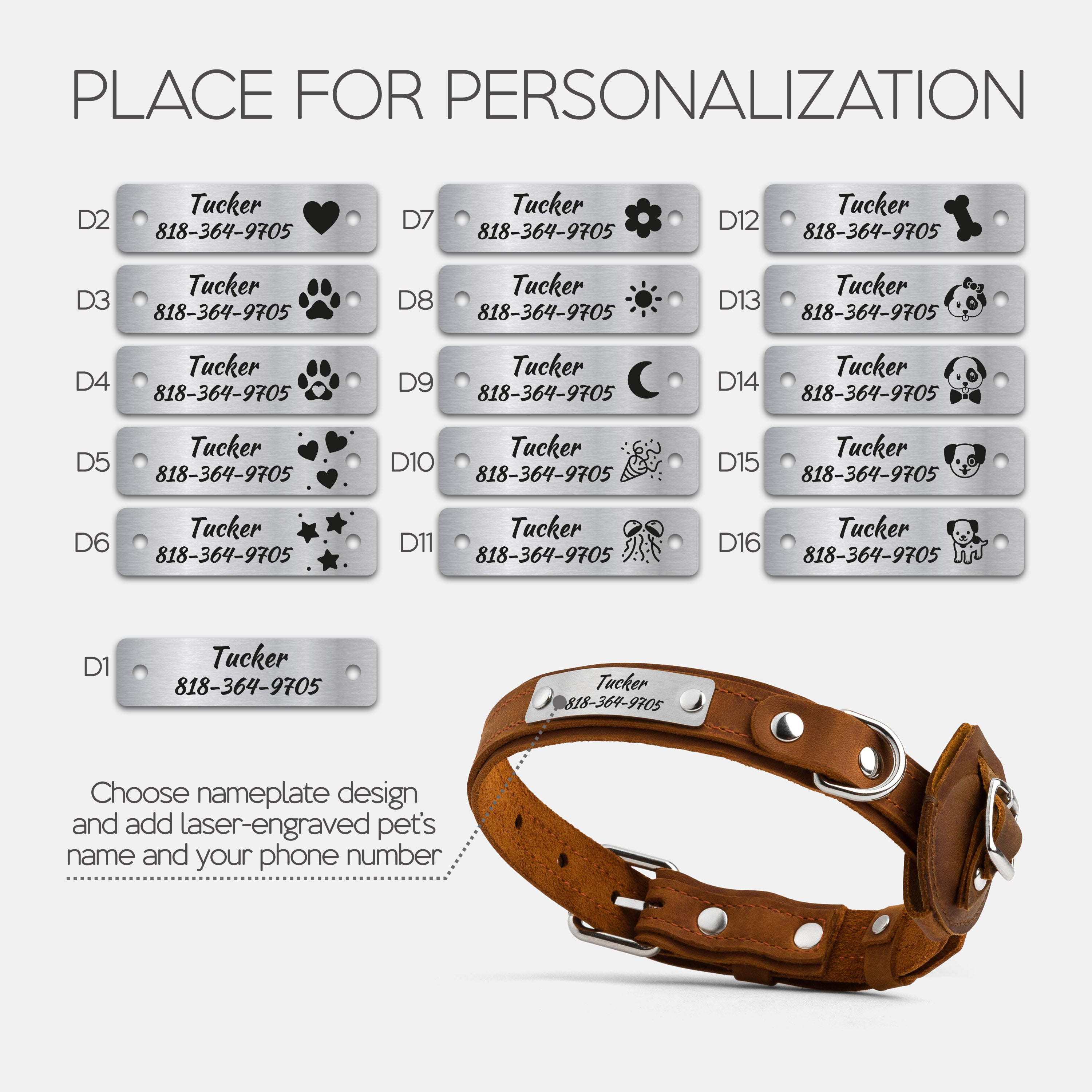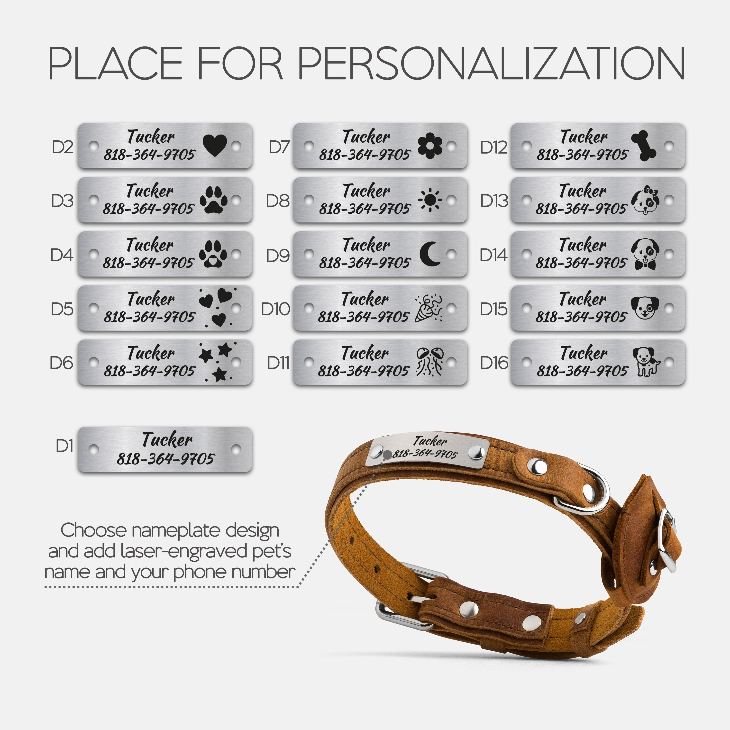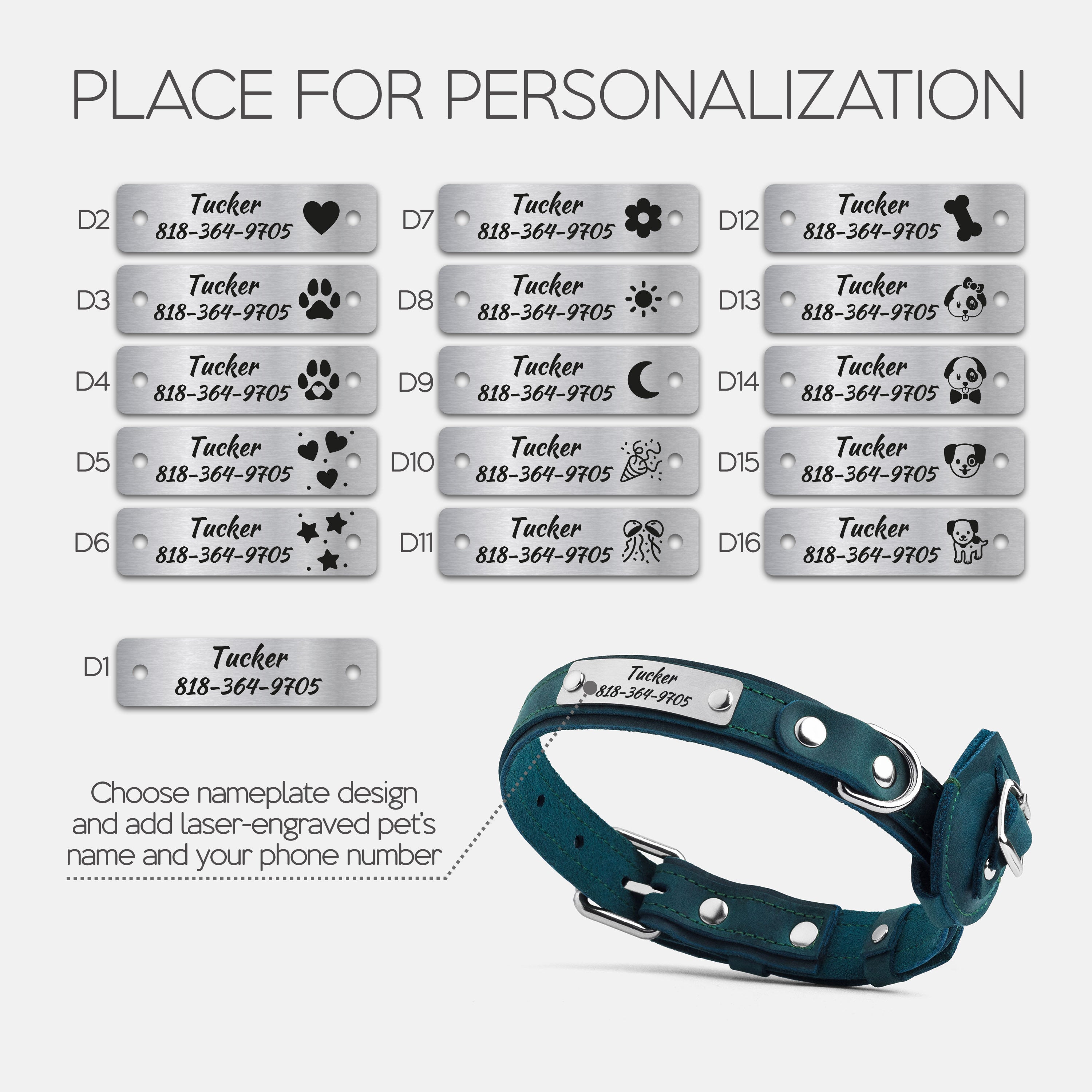 Choose your preferred nameplate design, then enter your dog’s name and your phone number or short phrase.