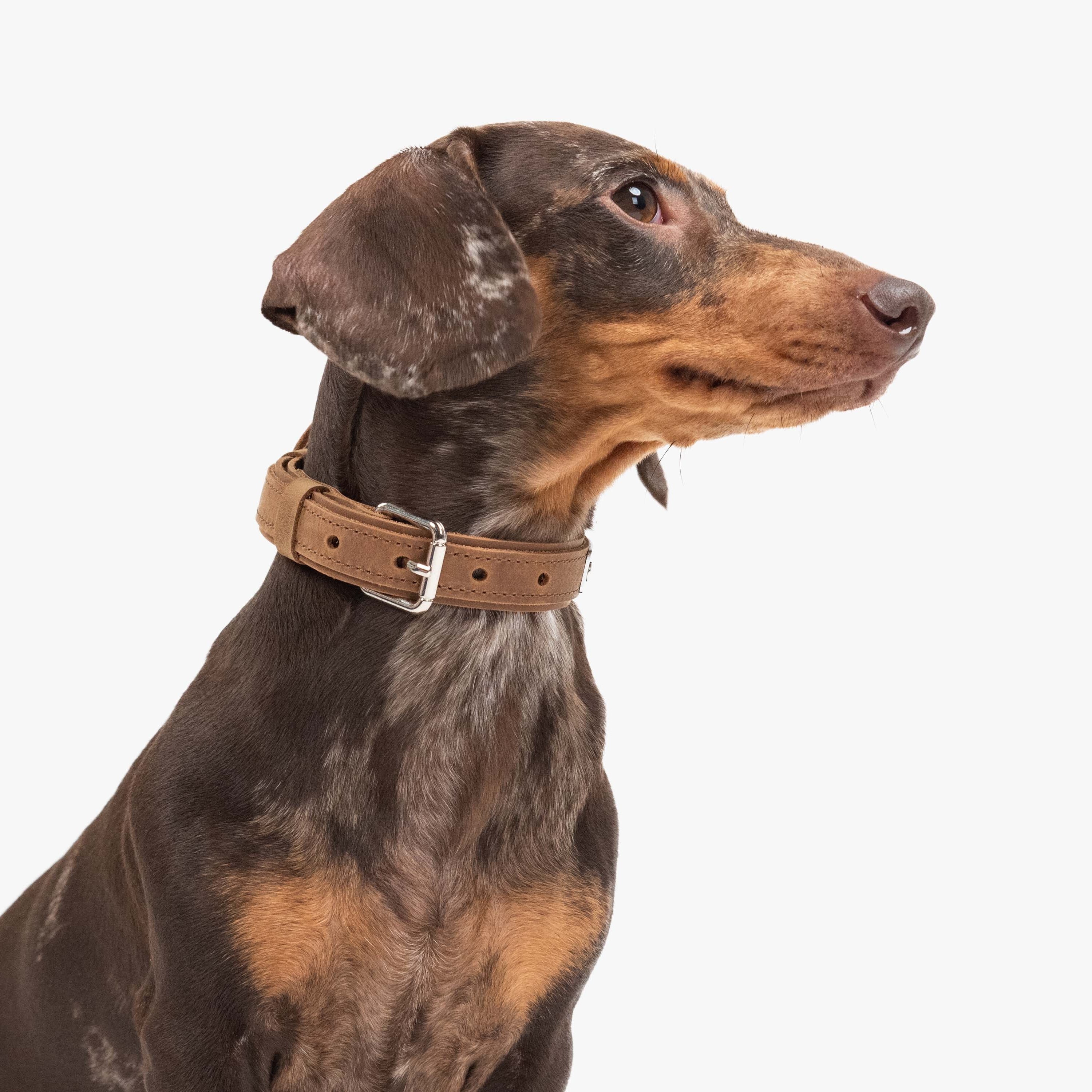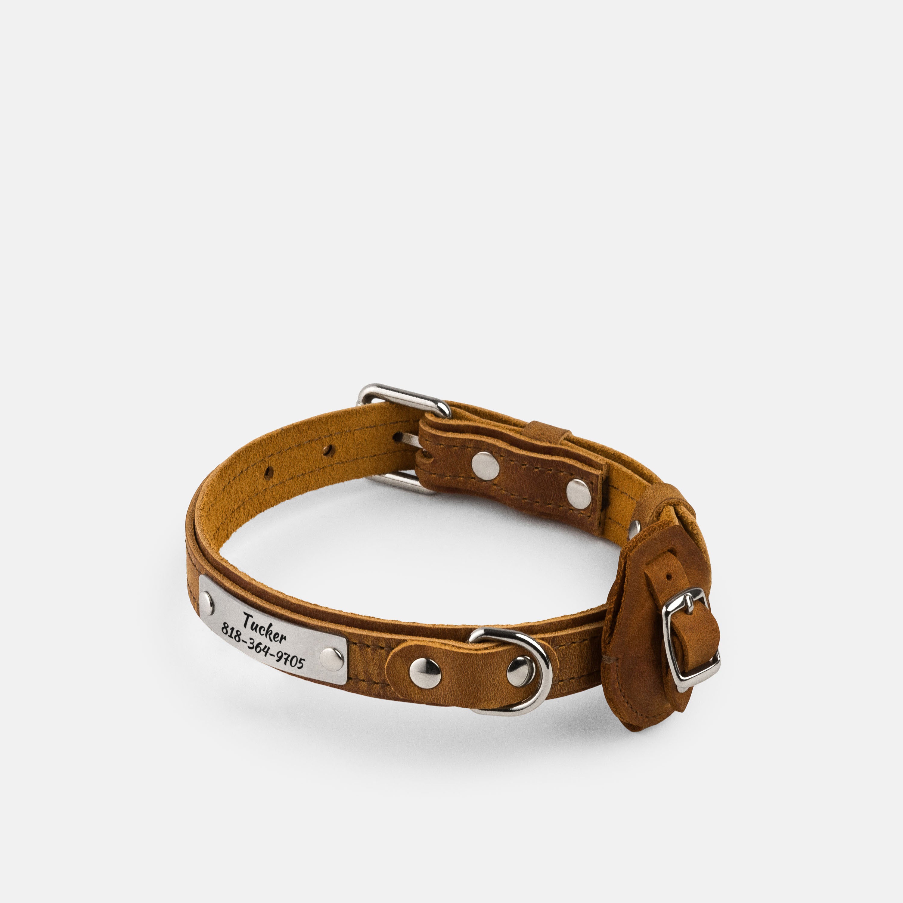 This leather dog collar is lightweight, adjustable, and designed for everyday comfort. A solid belt buckle ensures a secure fit, while a sturdy D-ring allows safe leash attachment. The collar includes a removable matching leather AirTag holder for added security and features a laser-engraved stainless steel nameplate for silent, long-lasting identification. A practical and stylish choice for daily wear or a thoughtful gift.