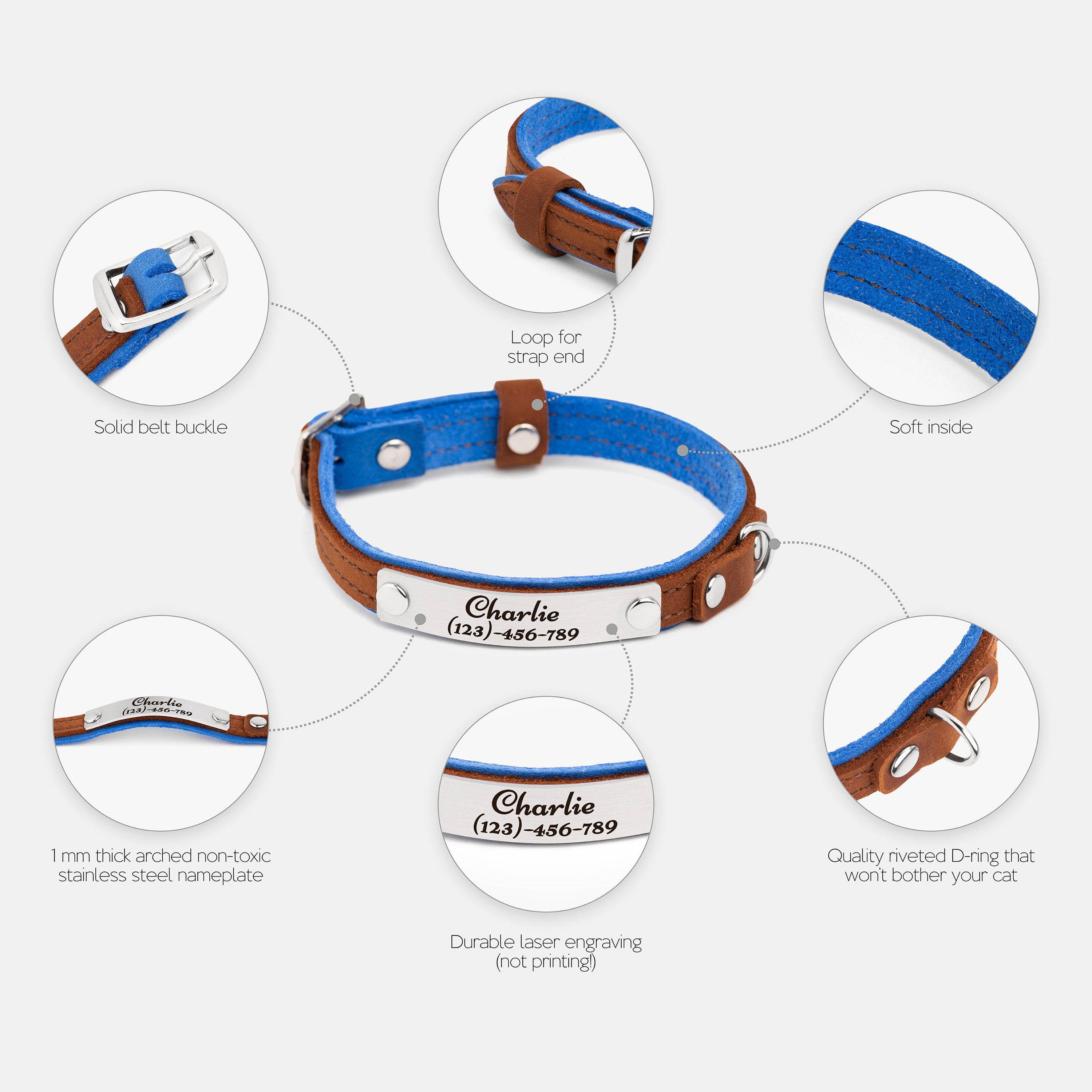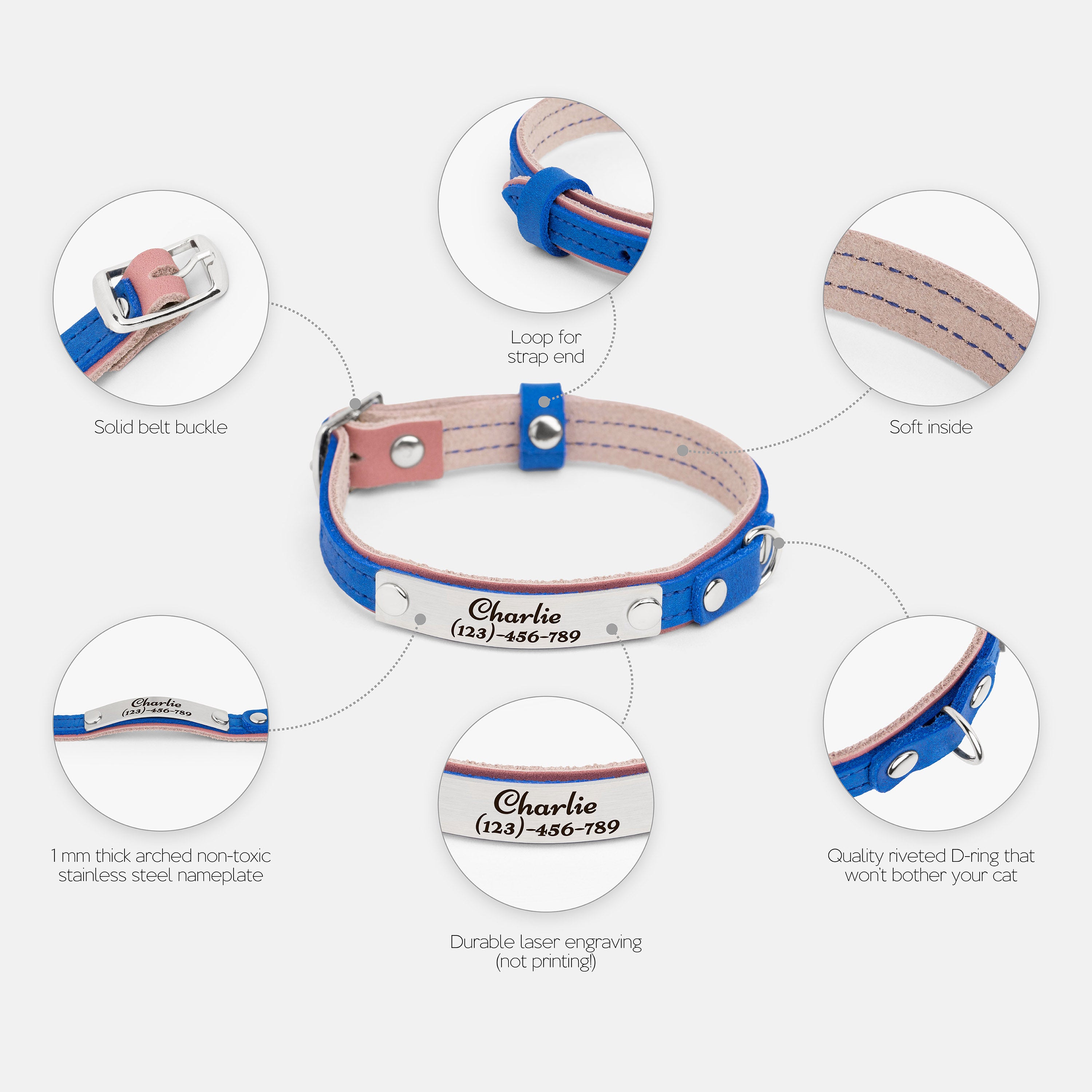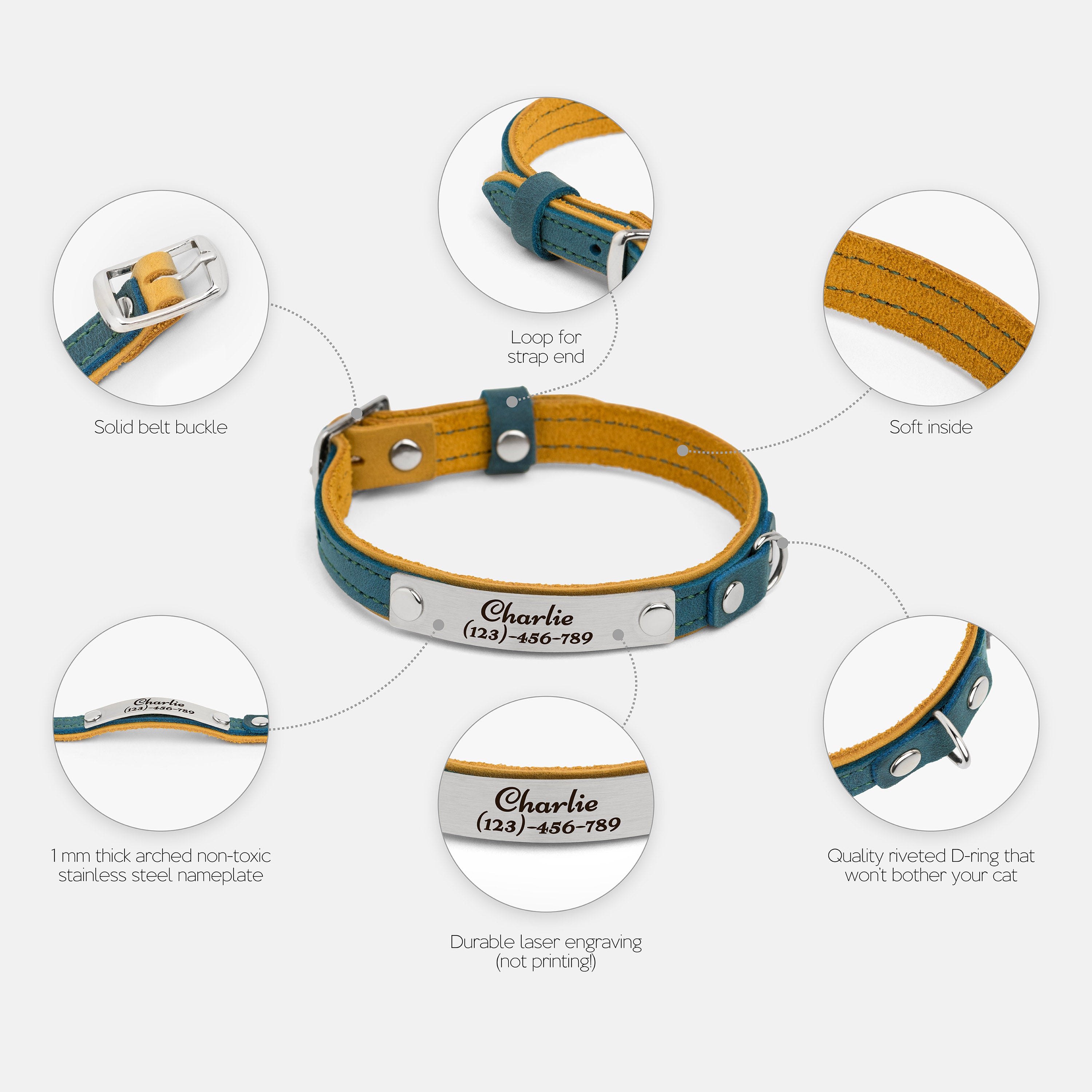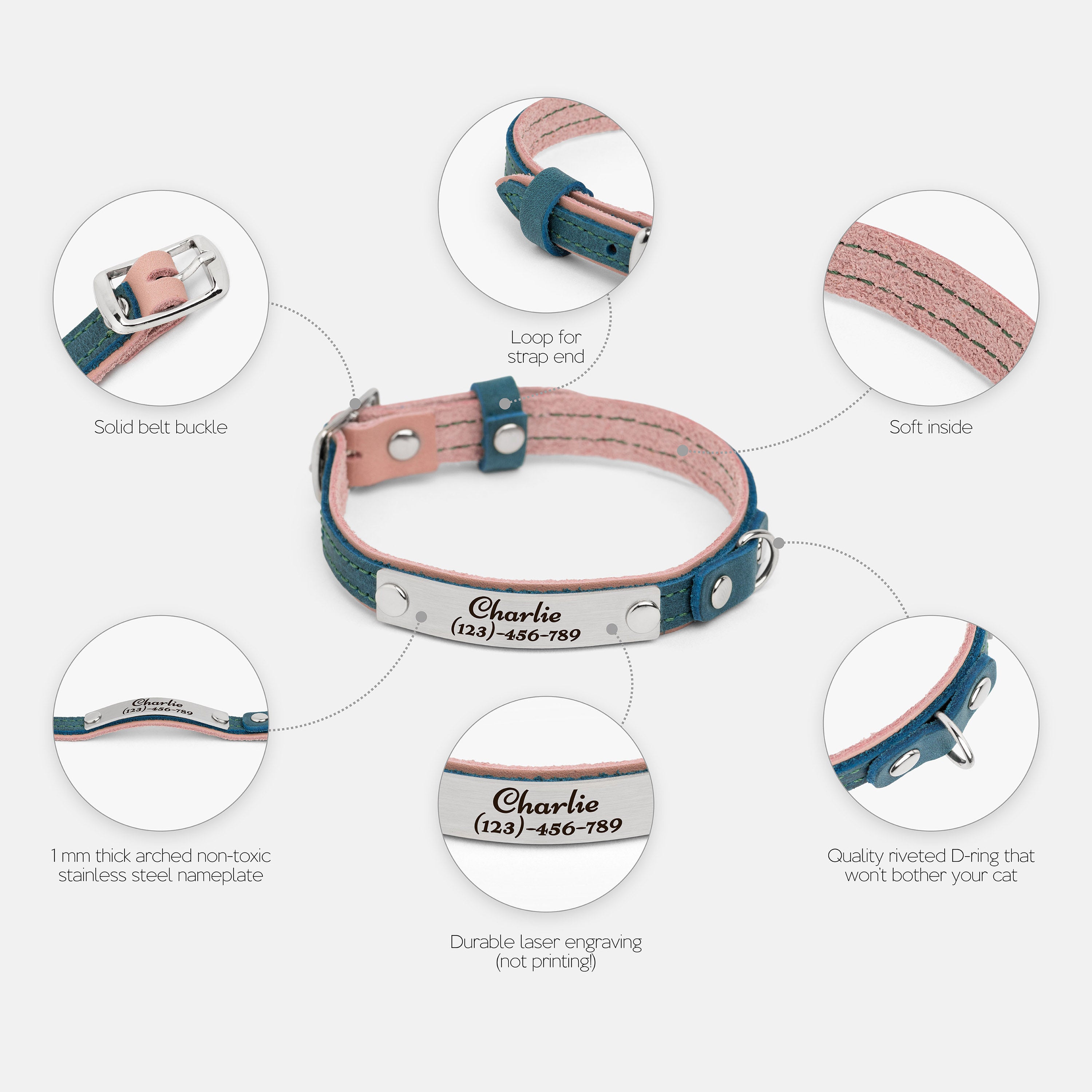 This leather cat collar combines lightweight comfort with practical features and a fun two-colored bright design, making it perfect for daily wear. Crafted from double-layered leather, it includes a durable buckle for easy adjustment, a sturdy D-ring for leash attachment, and a loop to secure the strap end. Personalize it with an engraved nameplate for a noise-free, stylish accessory or a thoughtful gift for a new kitten.