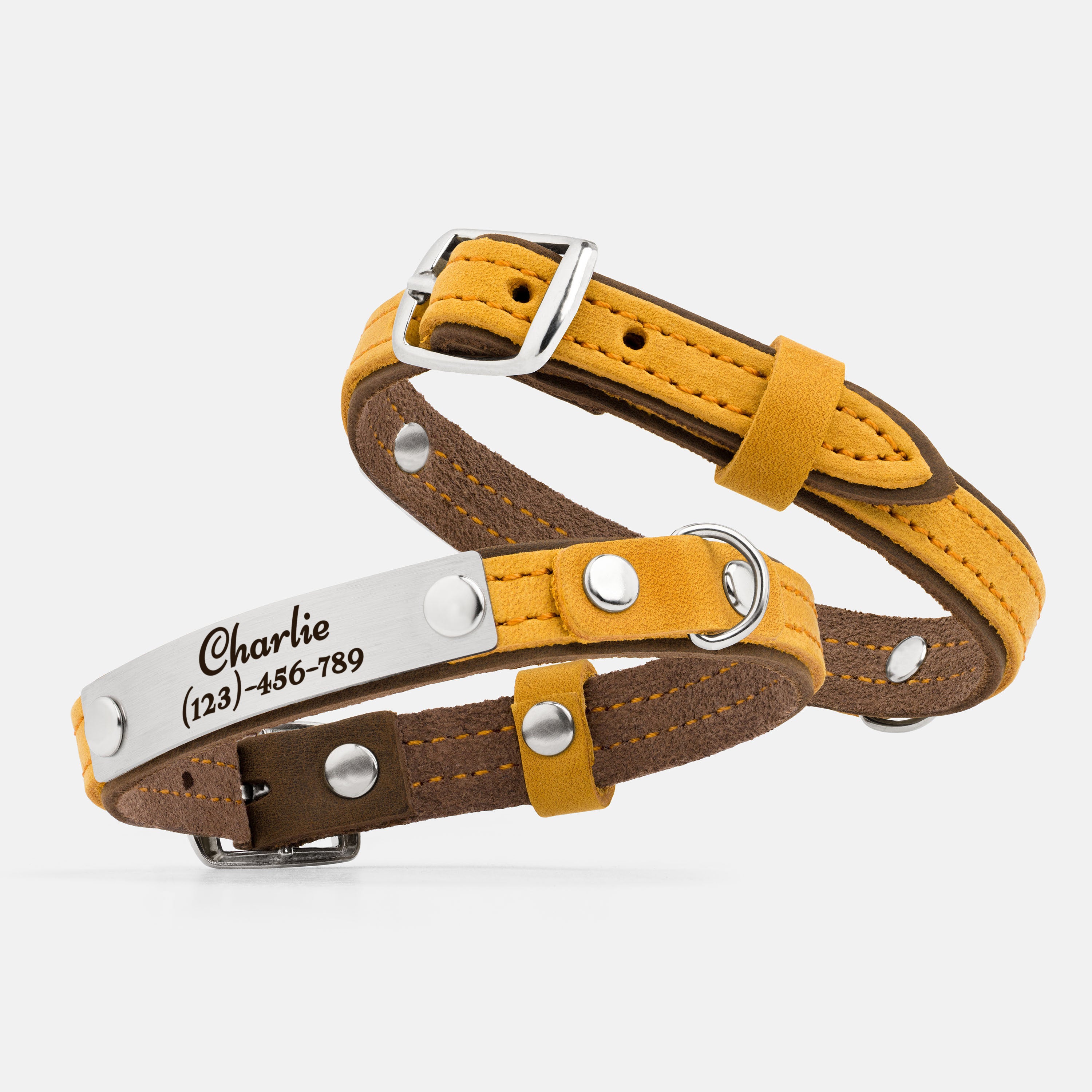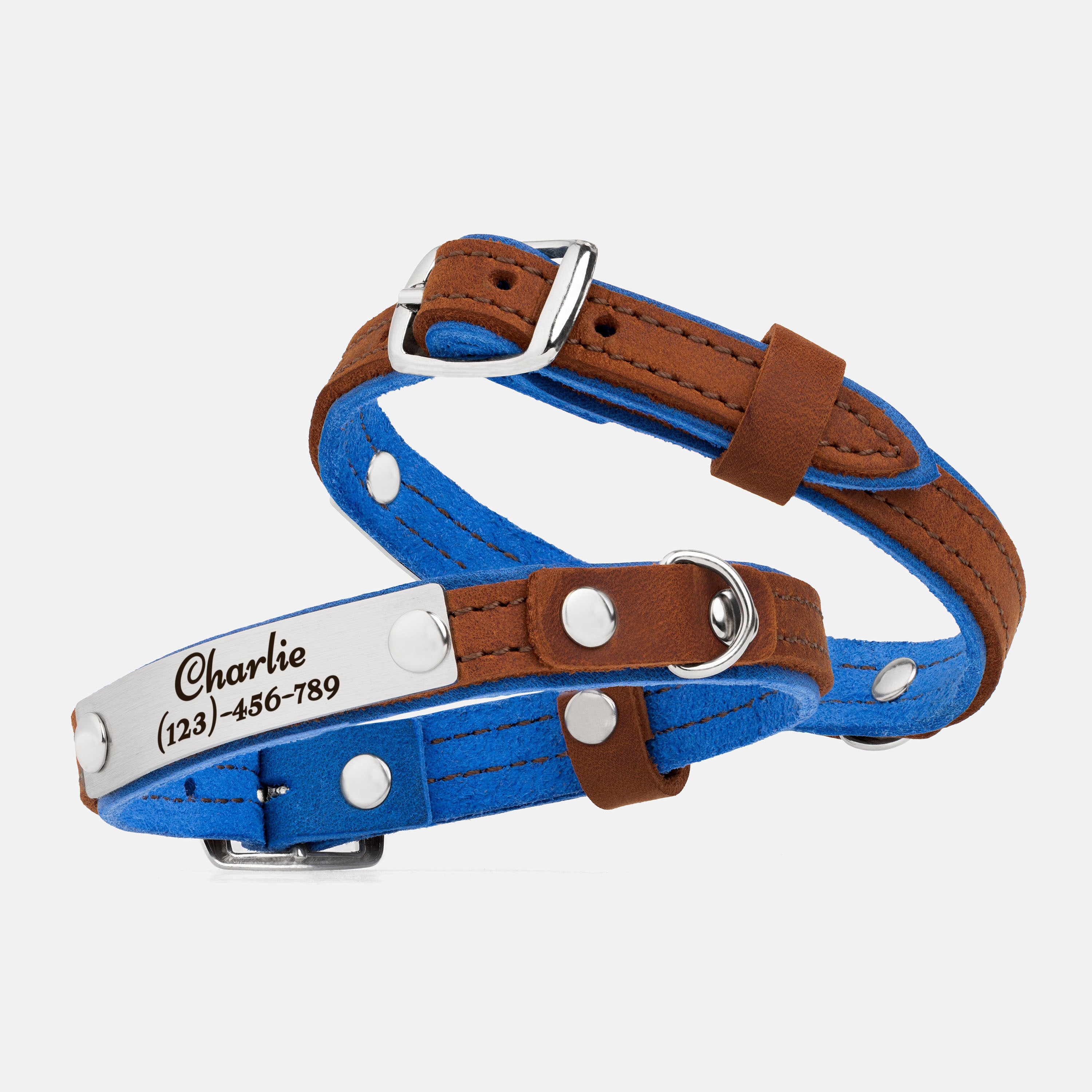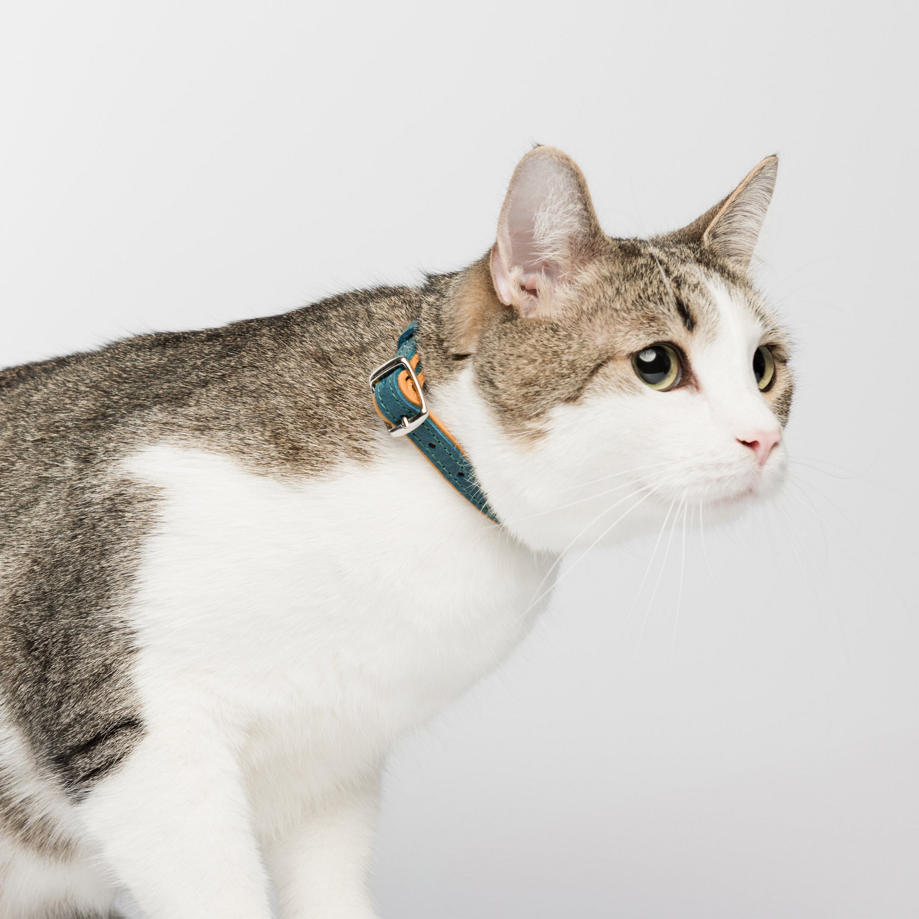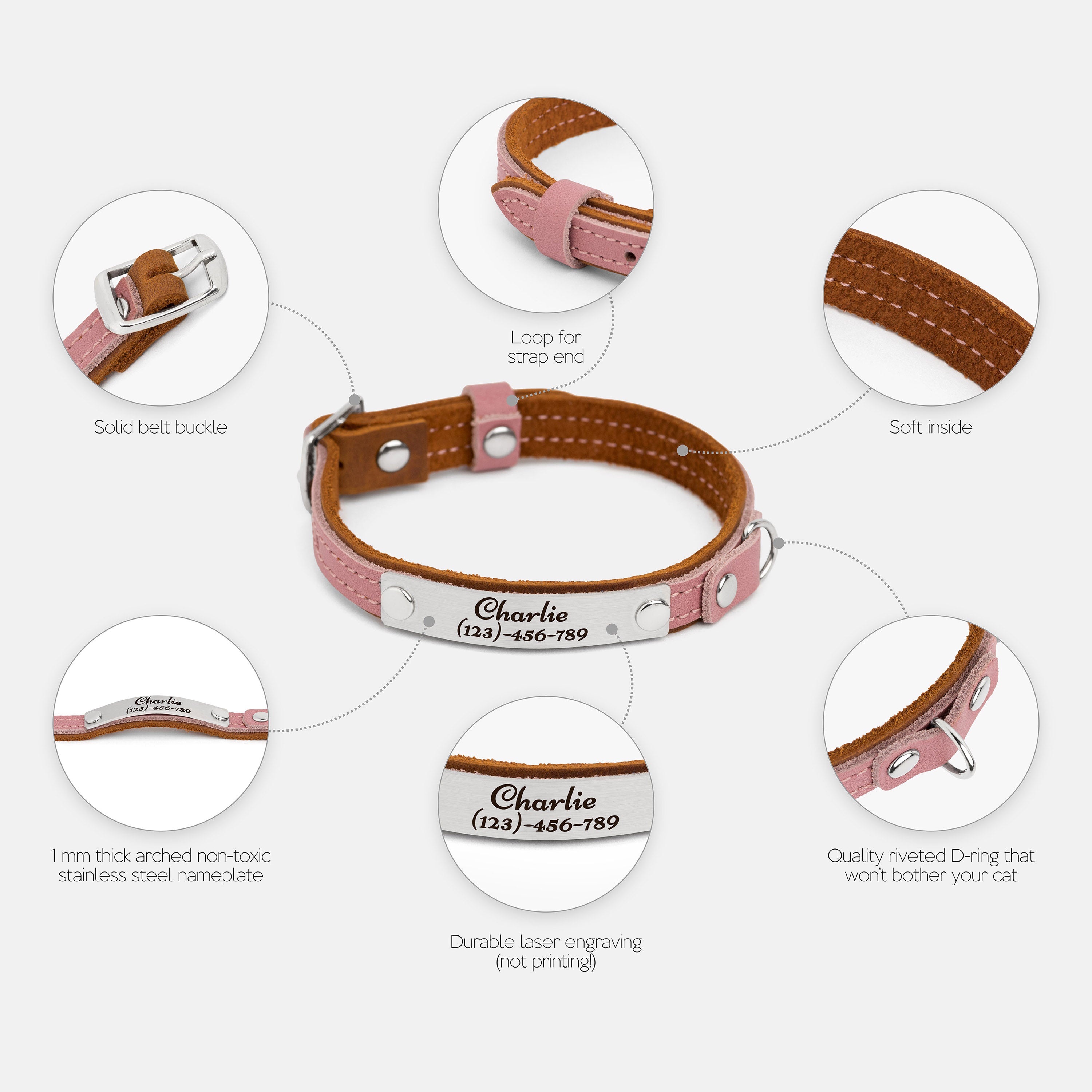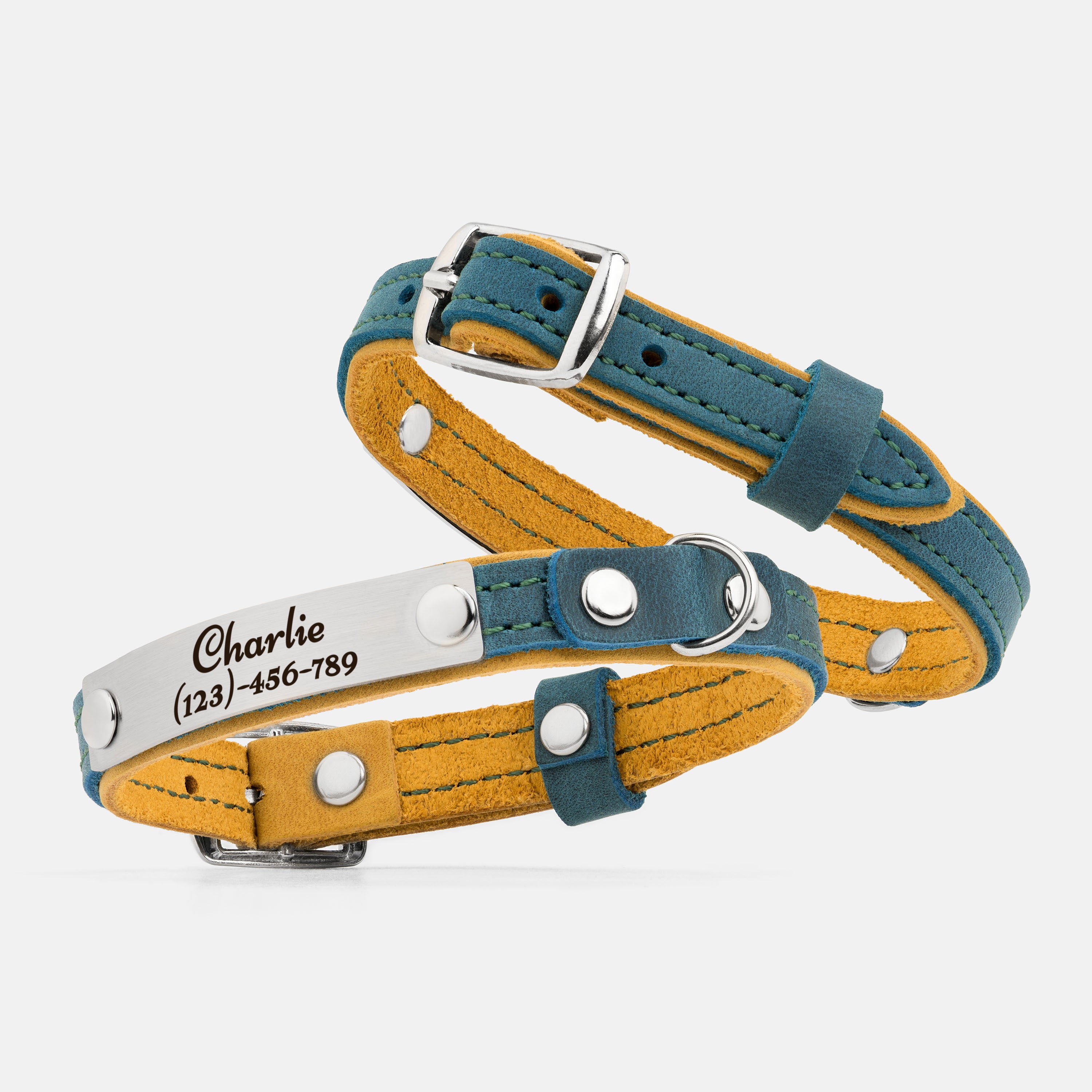 This leather cat collar combines lightweight comfort with practical features and a fun two-colored bright design, making it perfect for daily wear. Crafted from double-layered leather, it includes a durable buckle for easy adjustment, a sturdy D-ring for leash attachment, and a loop to secure the strap end. Personalize it with an engraved nameplate for a noise-free, stylish accessory or a thoughtful gift for a new kitten.