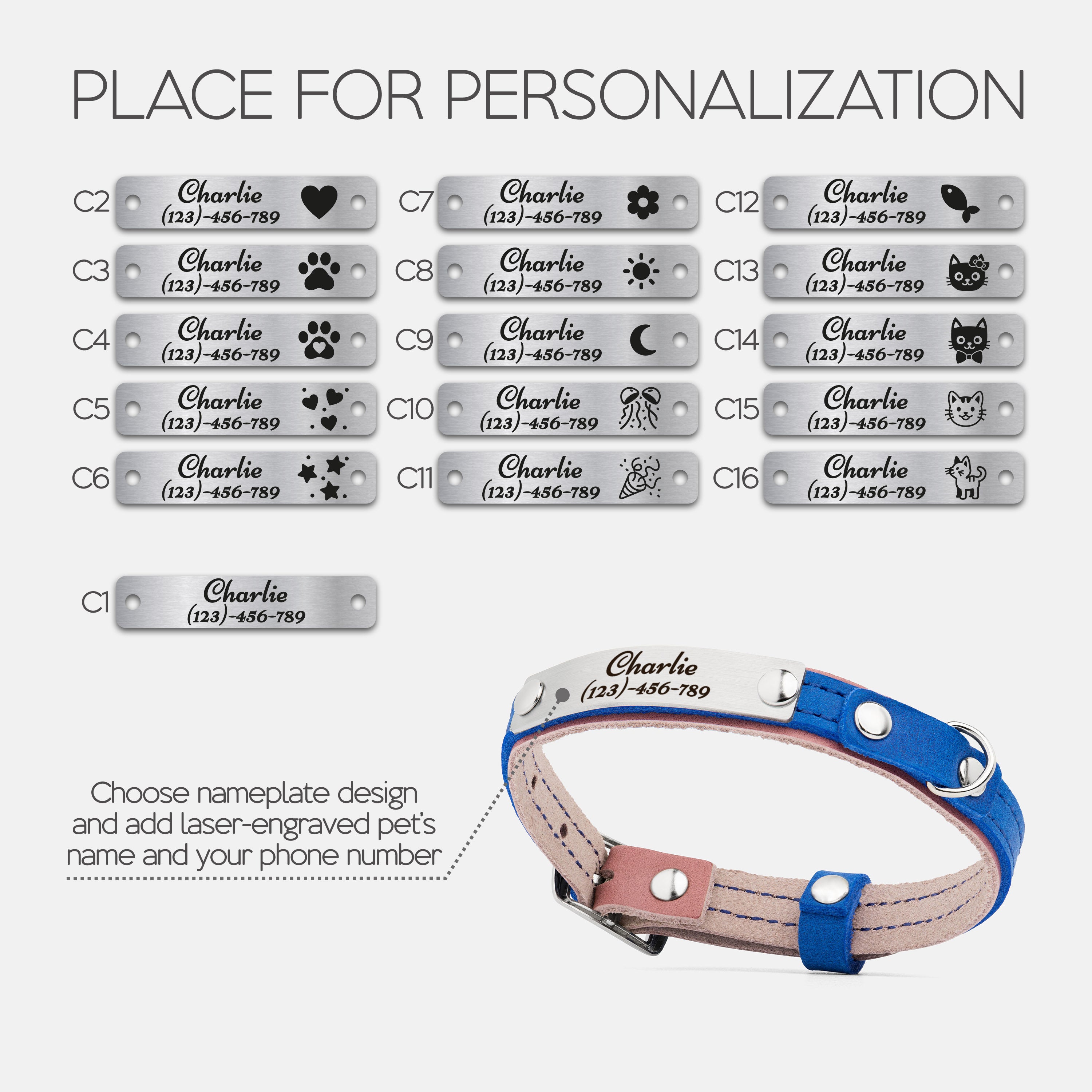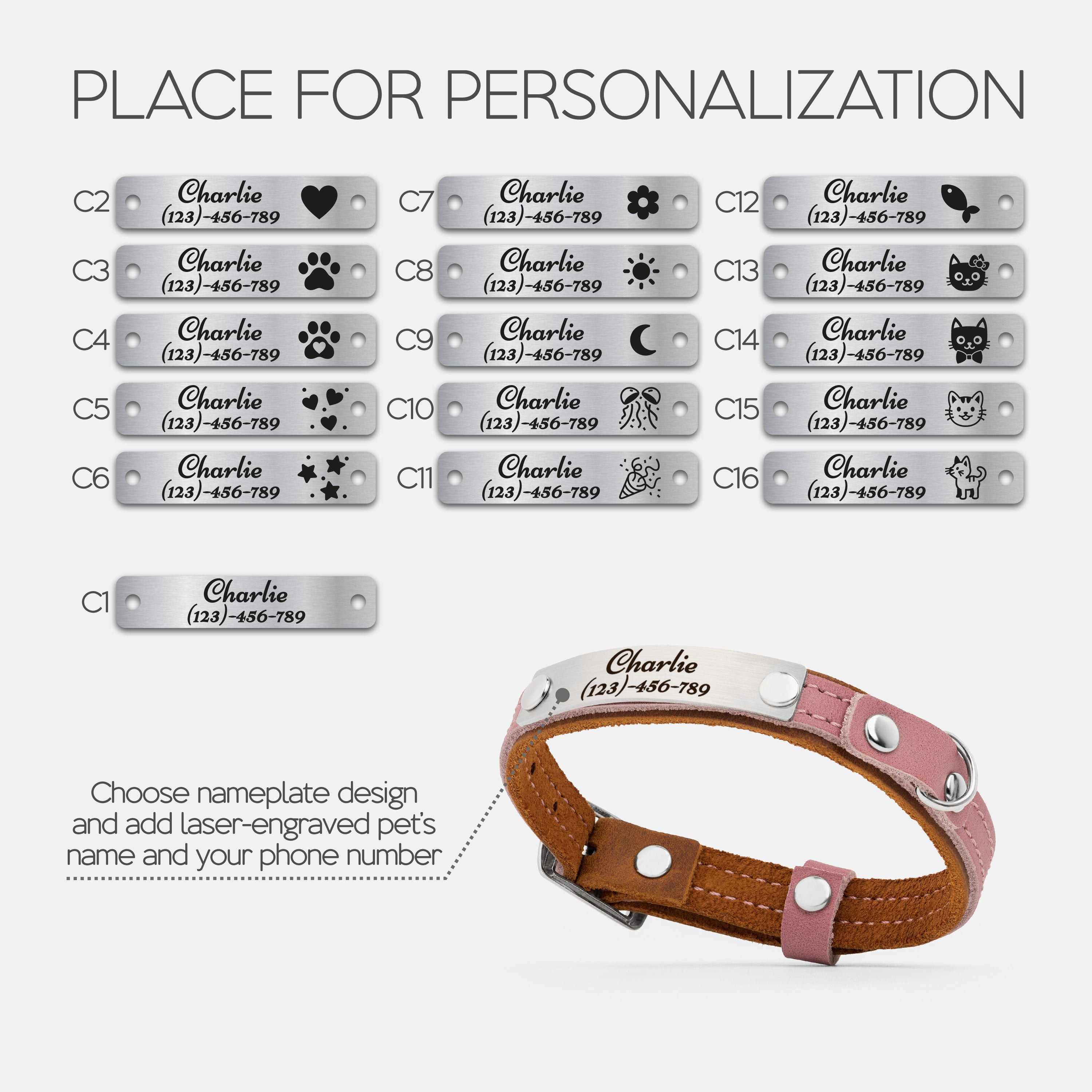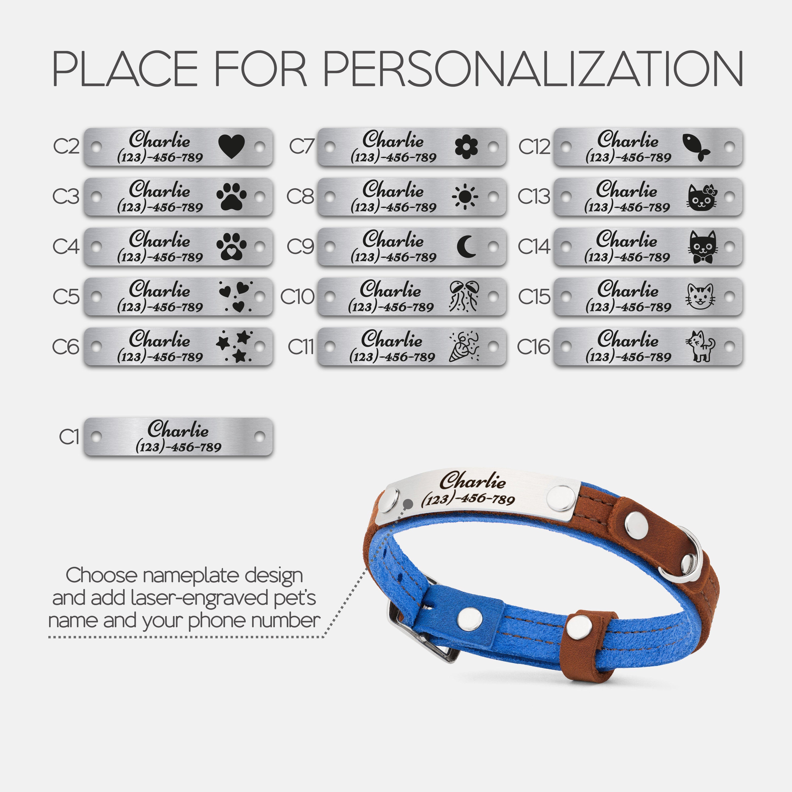 Choose your preferred nameplate design, then enter your pet’s name and your phone number or short phrase.