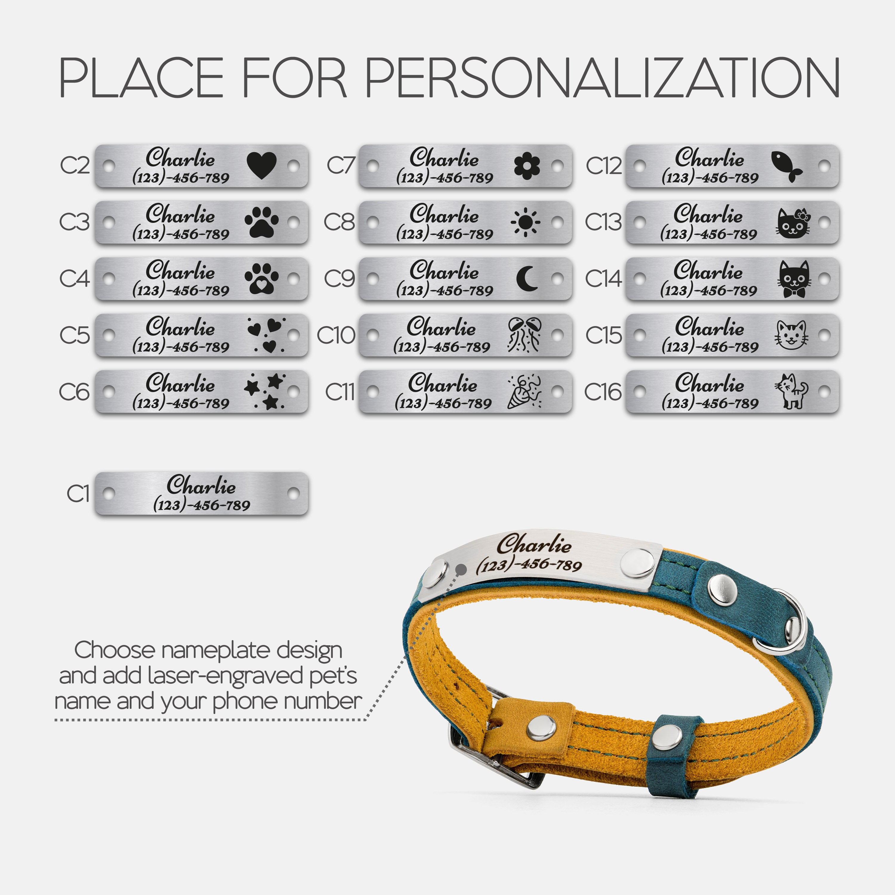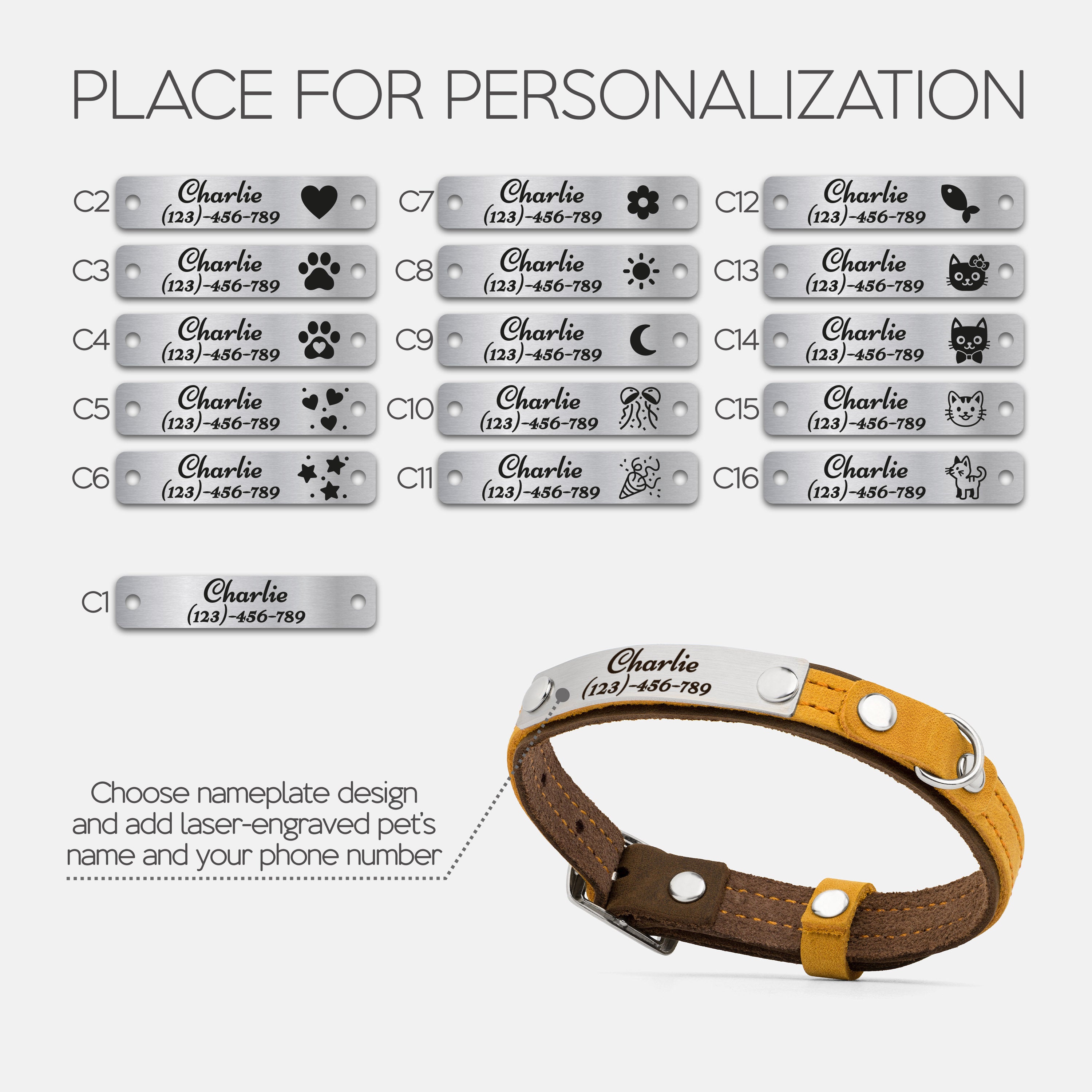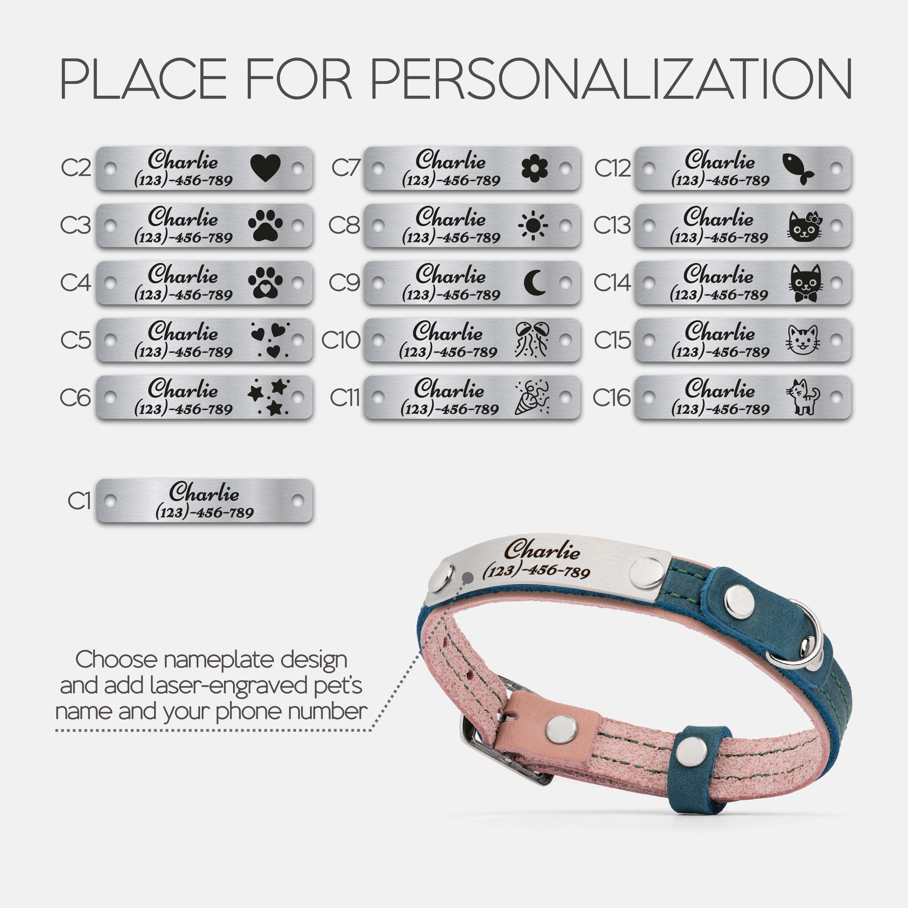 Choose your preferred nameplate design, then enter your pet’s name and your phone number or short phrase.