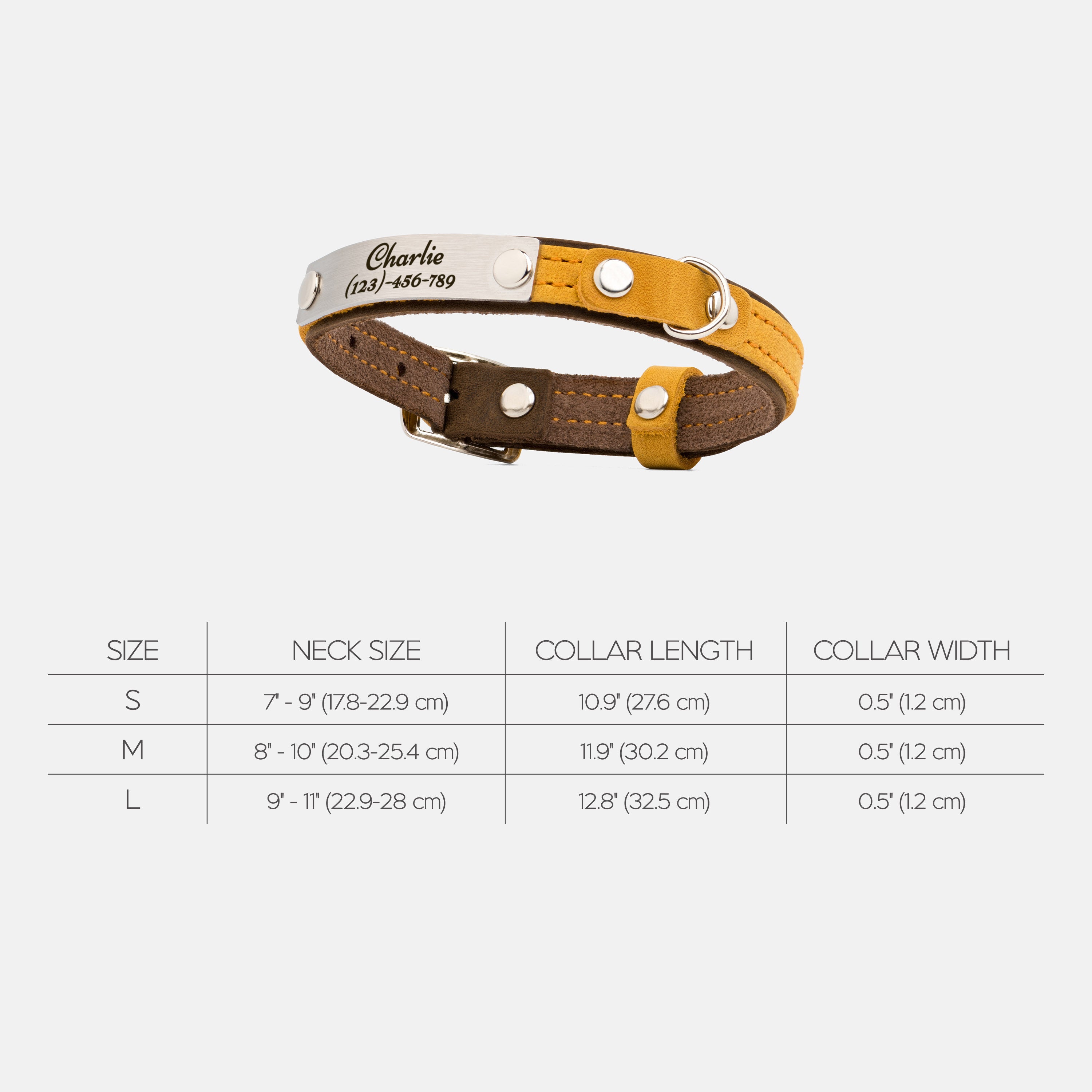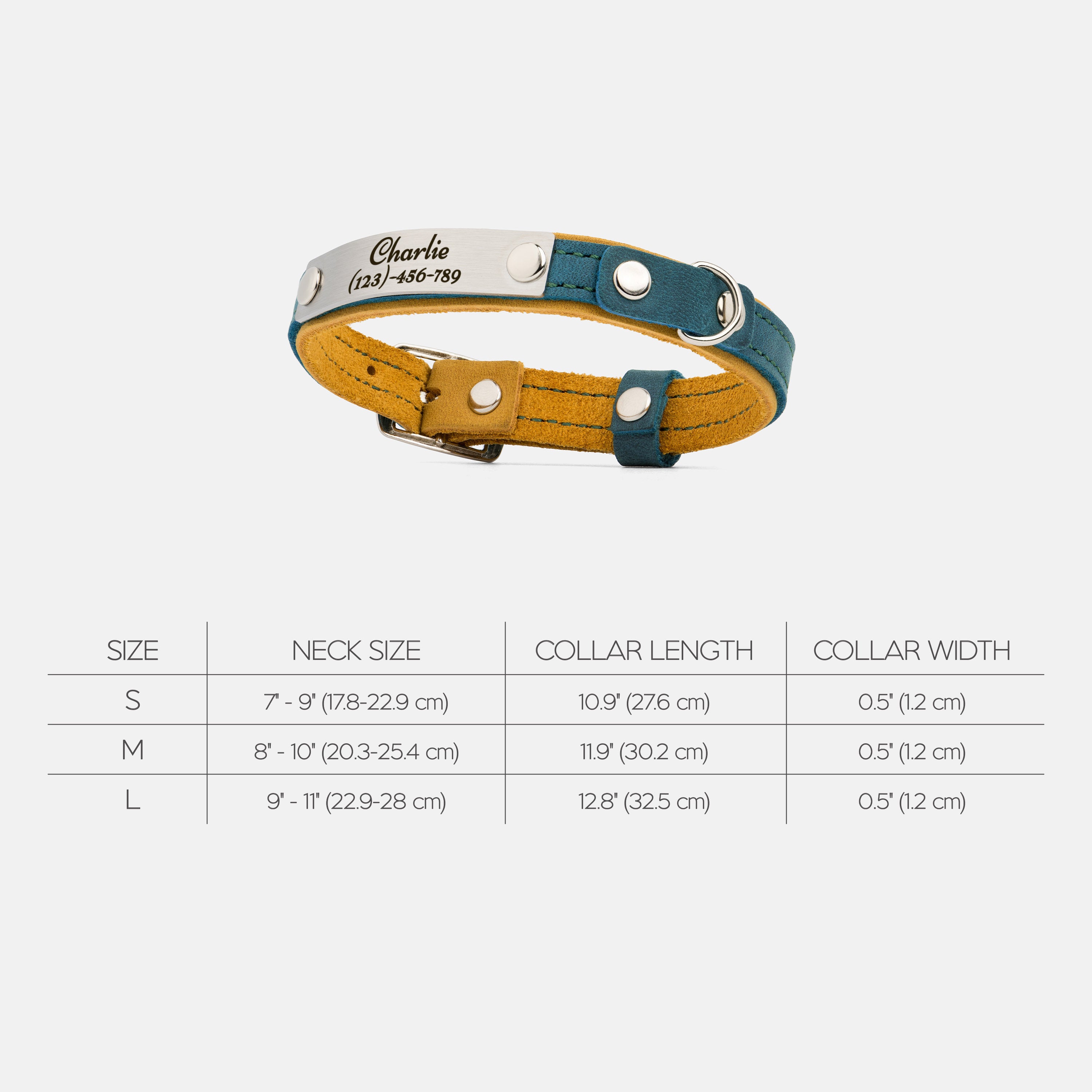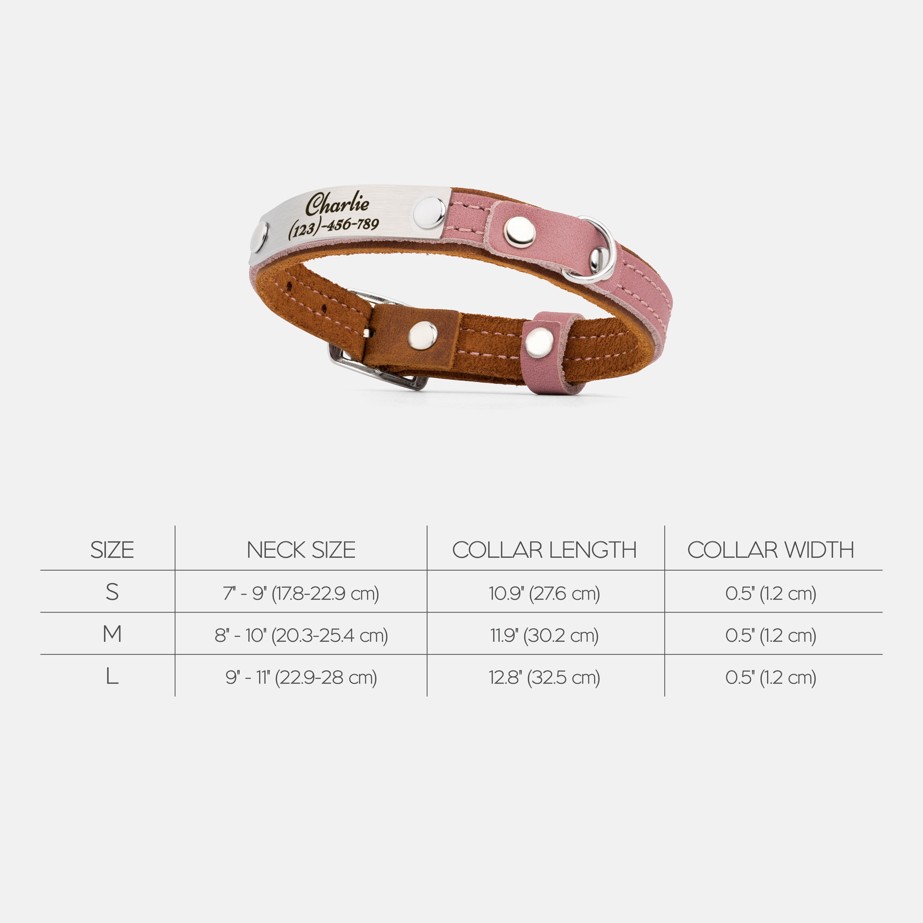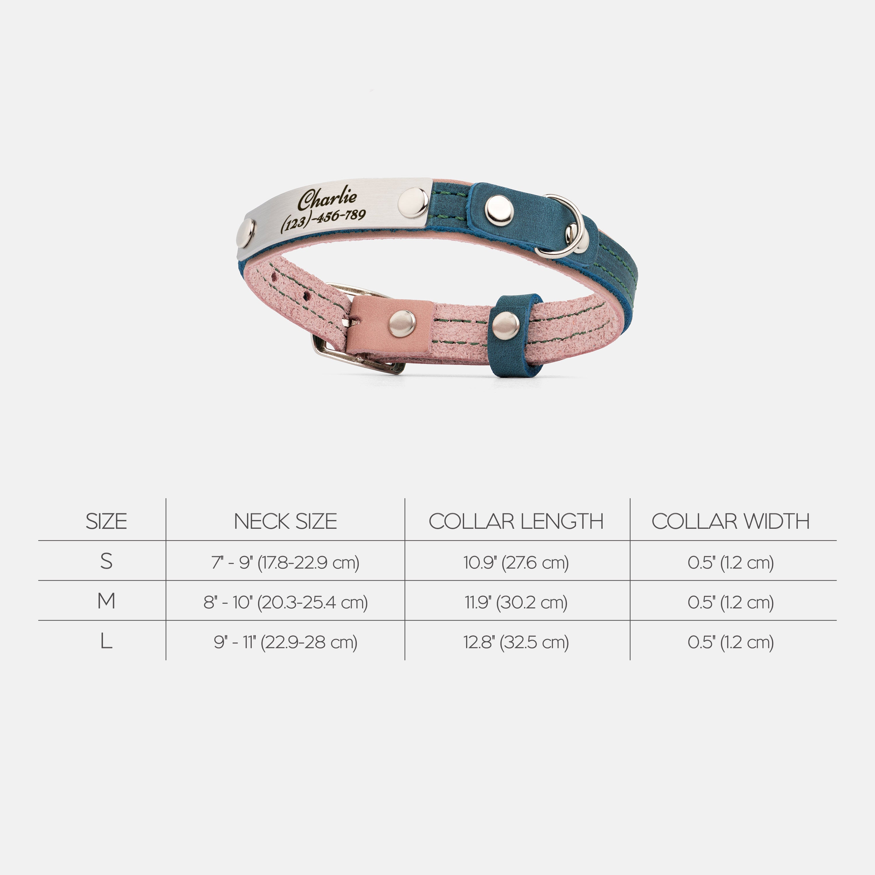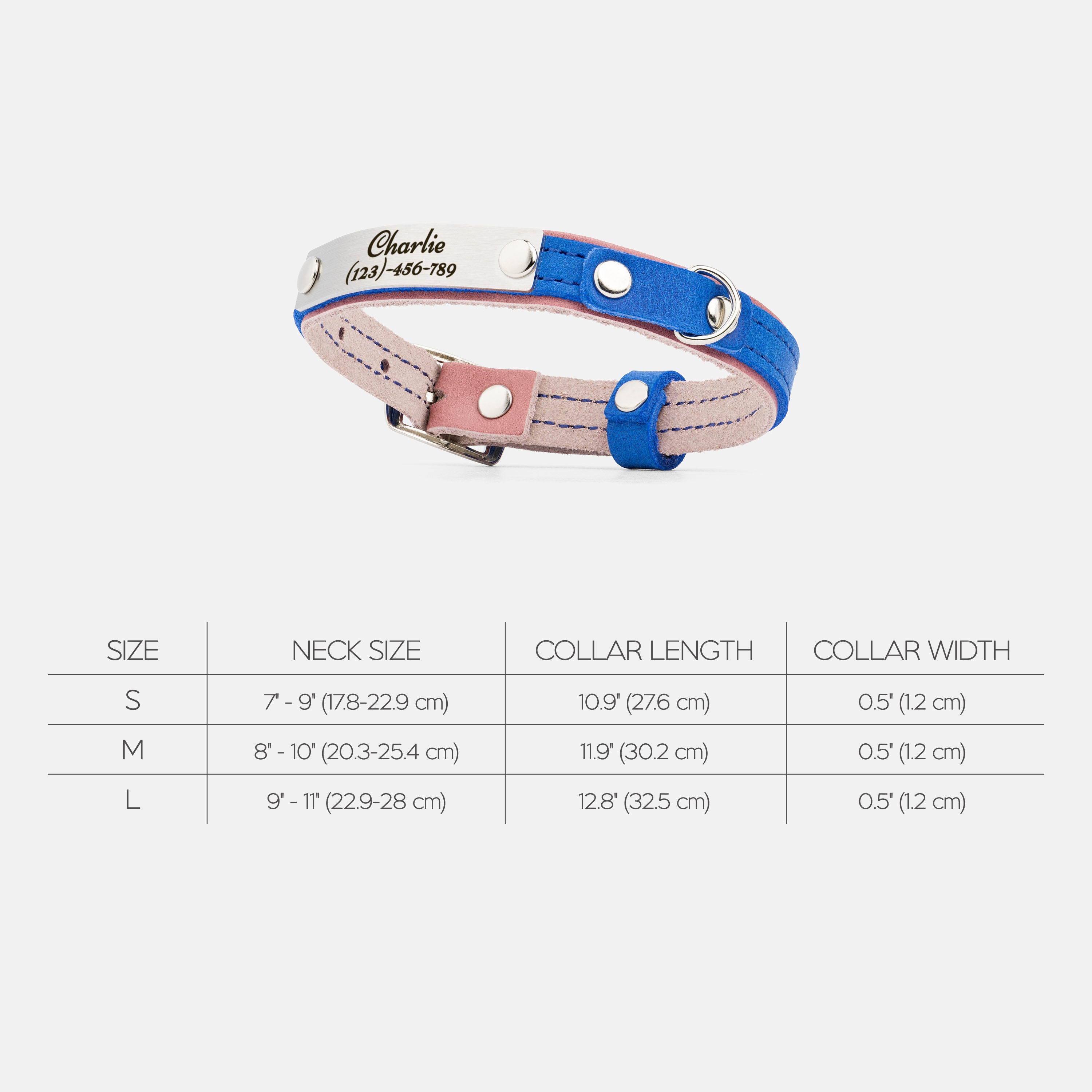 Size S: neck size: 7"-9" (17.8 - 22.9 cm), width: 0.5" (1.2 cm)
